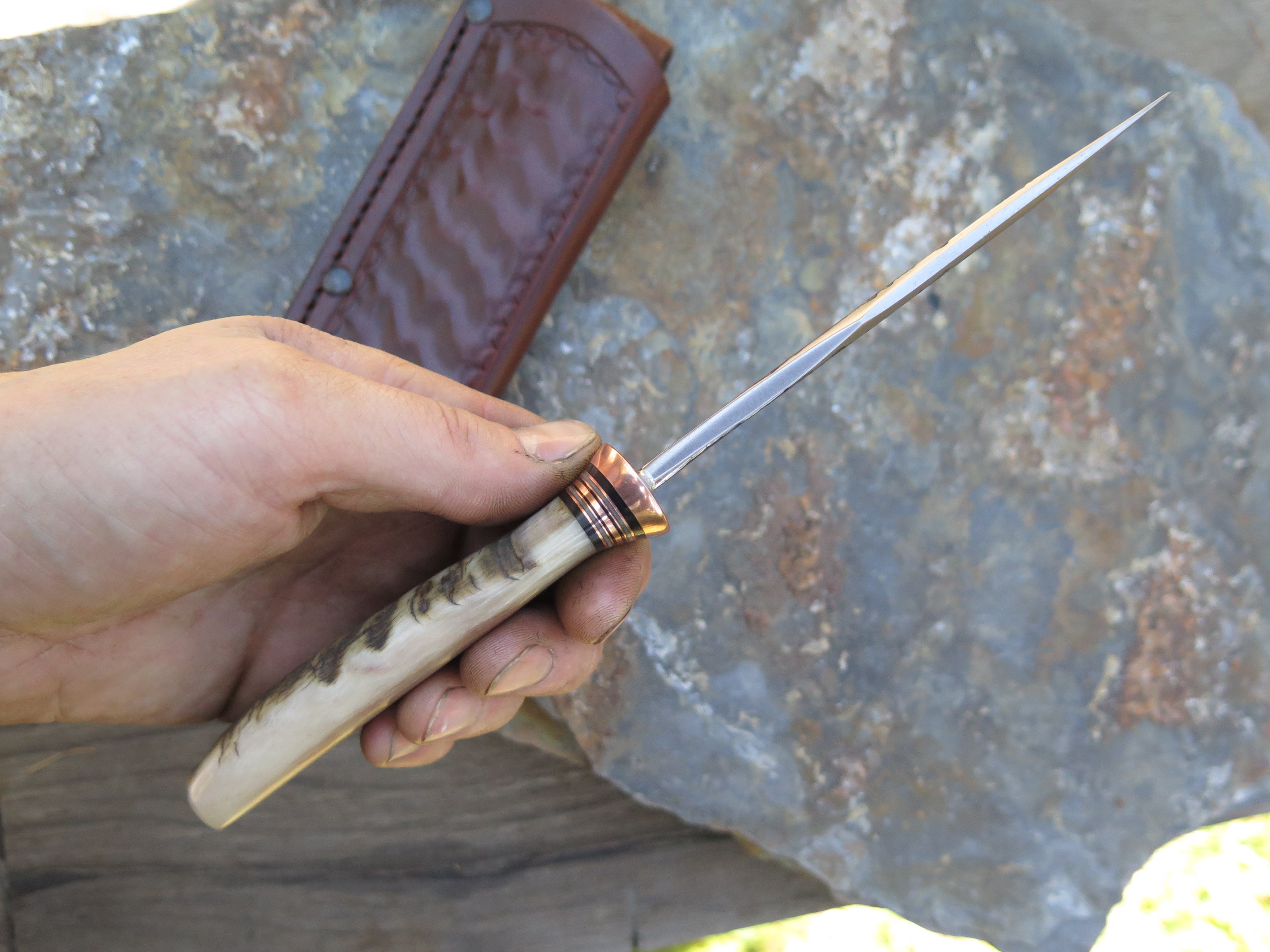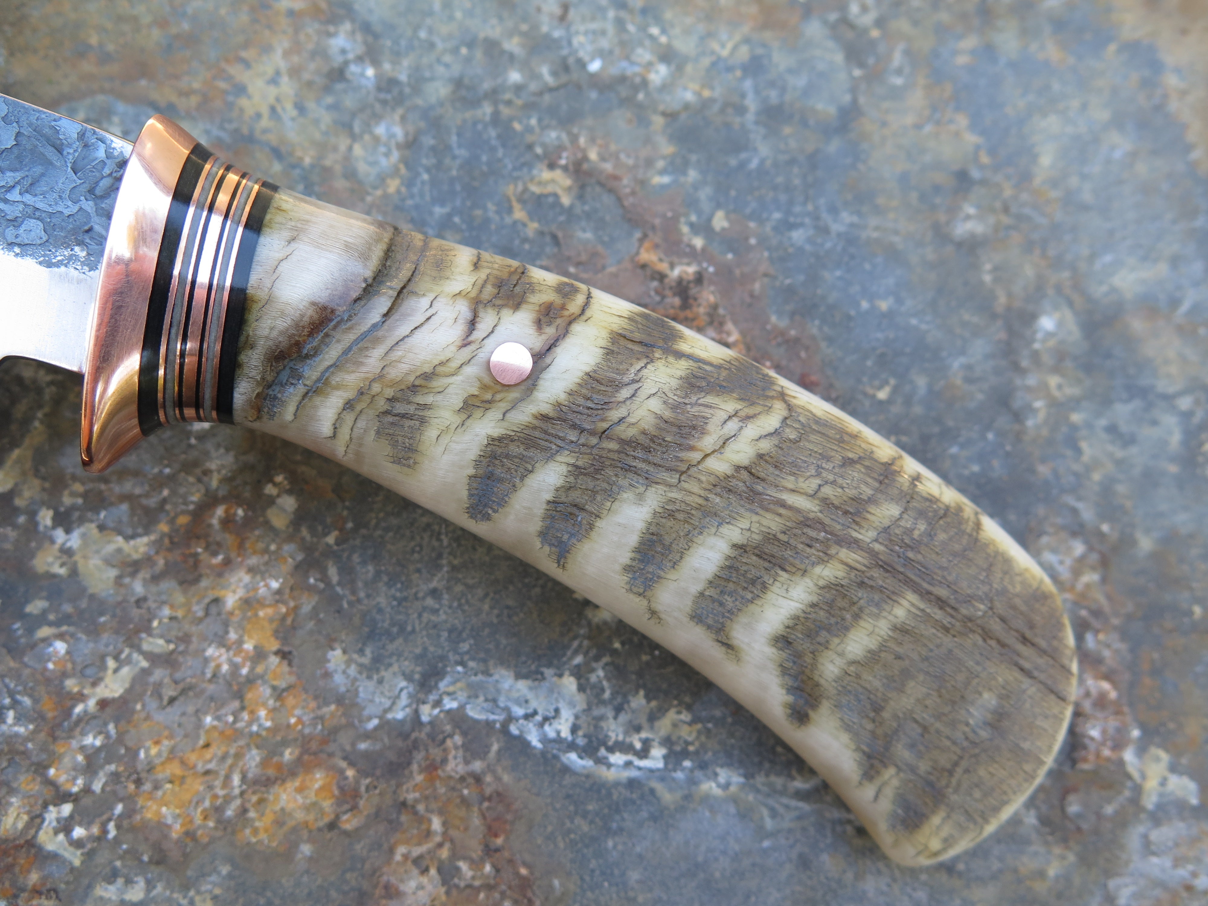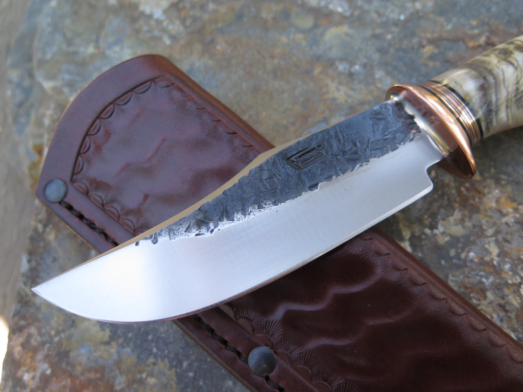 This incredible new Hunter from Behring Made© is hand forged from 3/16" thick high carbon 01 tool steel and it measures 4 3/4" from tip to guard with a razor sharp hollow grind and our hammermark finish. The copper guard is soldered in place above black, gray and copper spacers. The handle is premium Dall's sheep horn that is pinned through the tang with copper, and overall is measures 9 1/4". The sheath is a primo sheep tooled pouch and this one is guaranteed field ready.