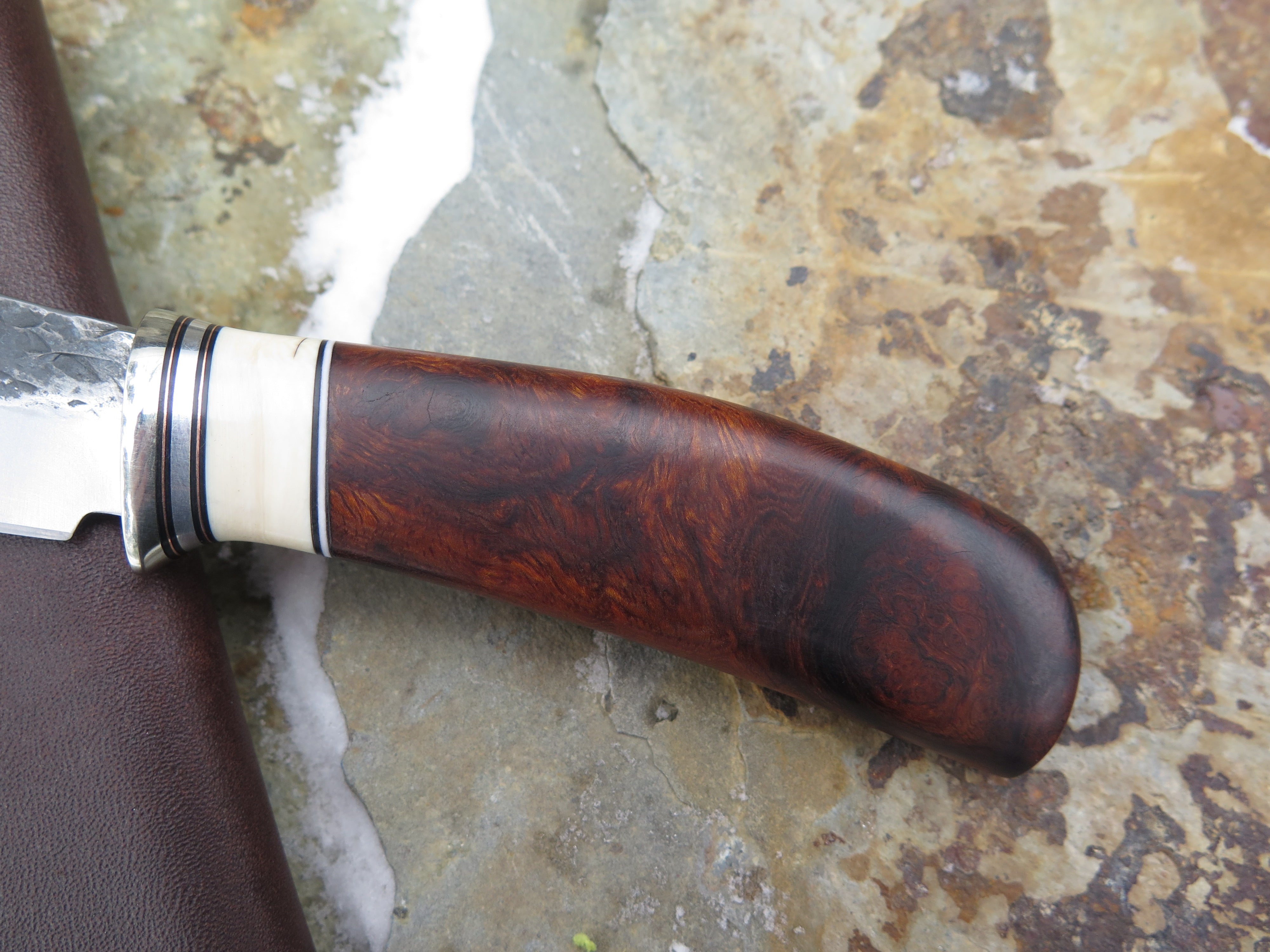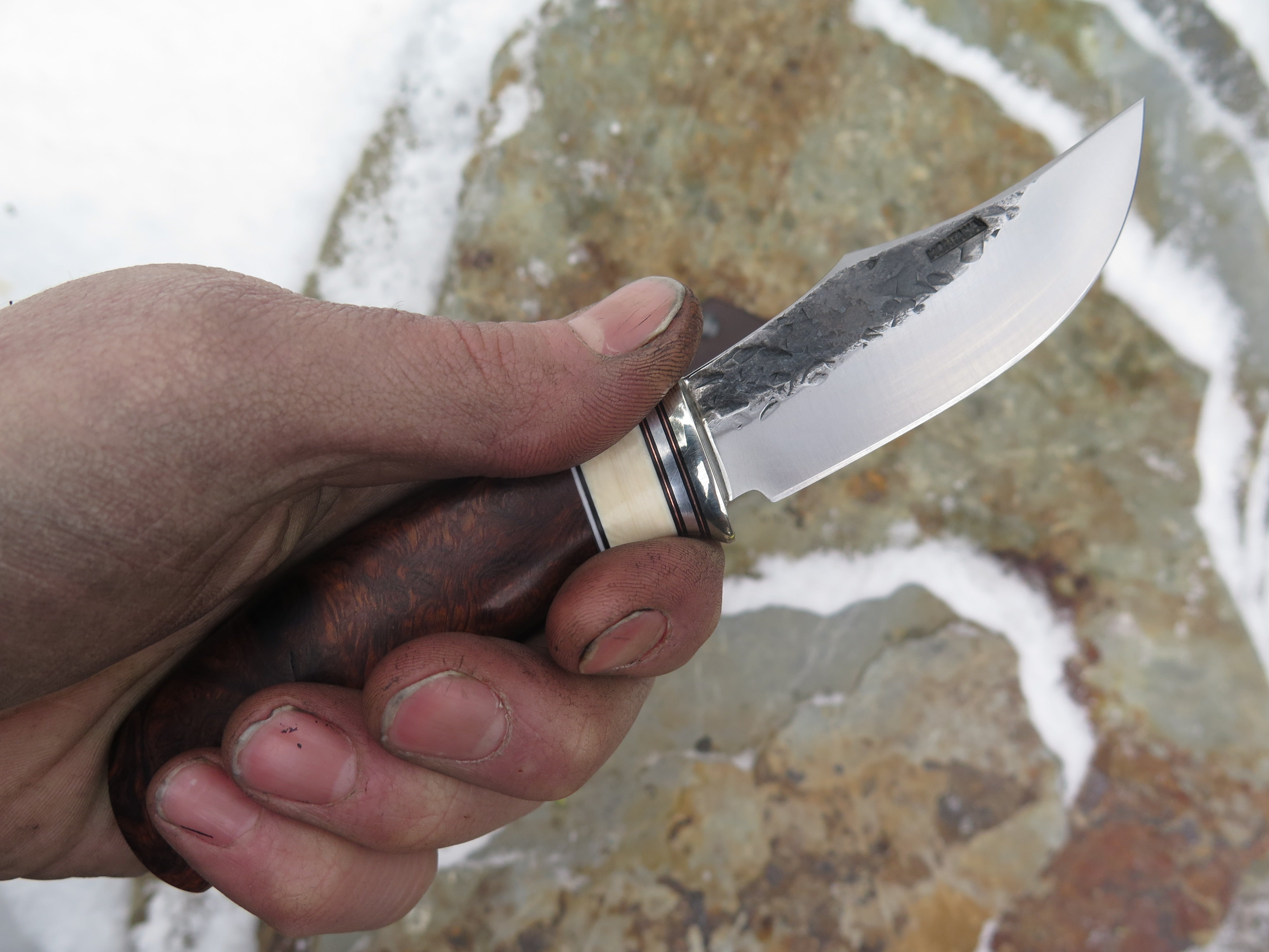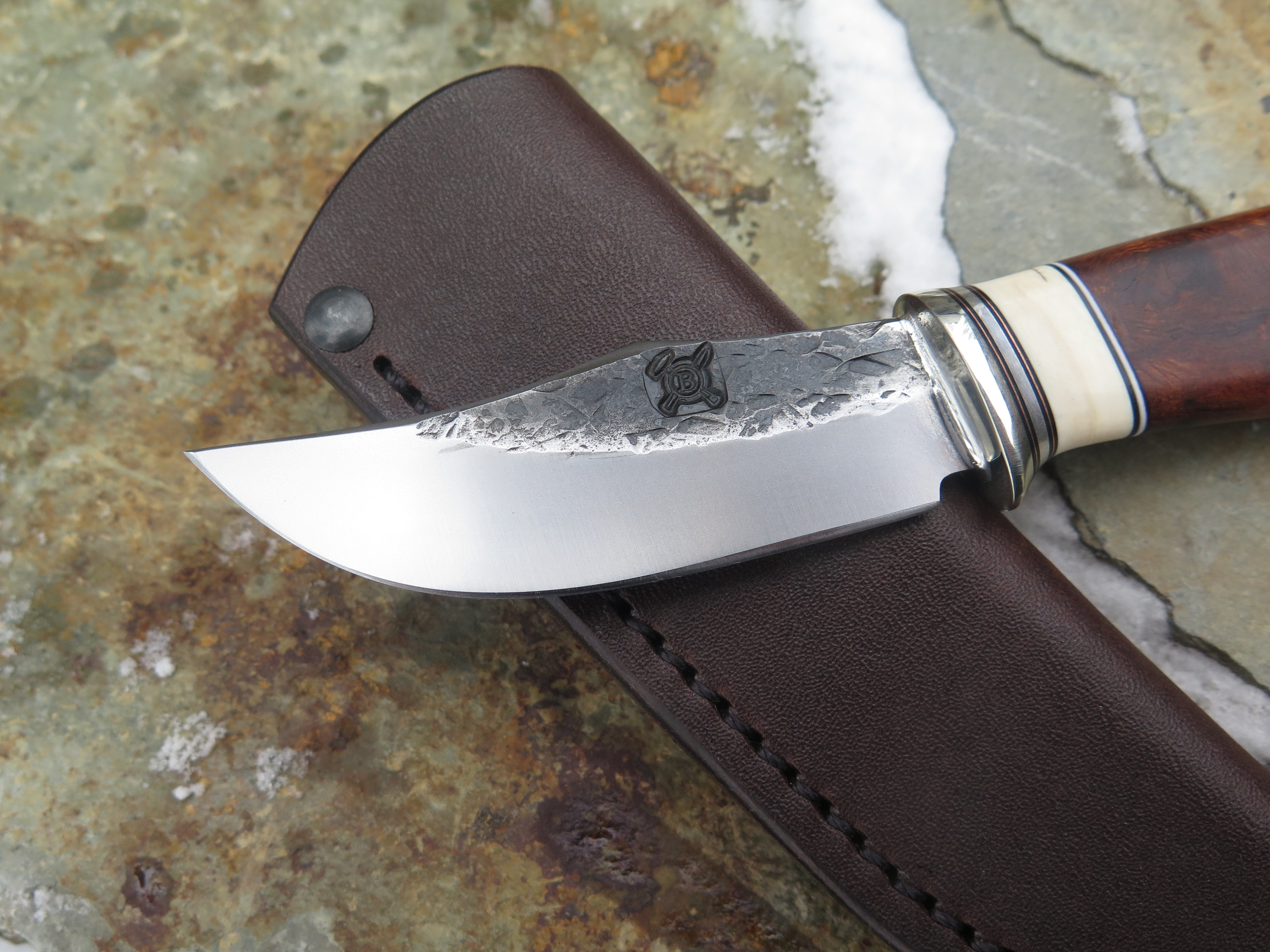 This outstanding new Clip Point from Behring Made© is hand forged from 1/8" thick high carbon 01 tool steel and it measures 3" from tip to guard with a razor sharp hollow grind and our hammermark finish. The nickel silver guard is soldered in place above black and white fiber, aluminum, copper and ancient mammoth ivory spacers as well as a premium desert ironwood handle. The overall length measures 6 7/8" and this one comes in a classic leather belt pouch sheath.