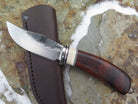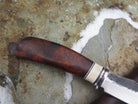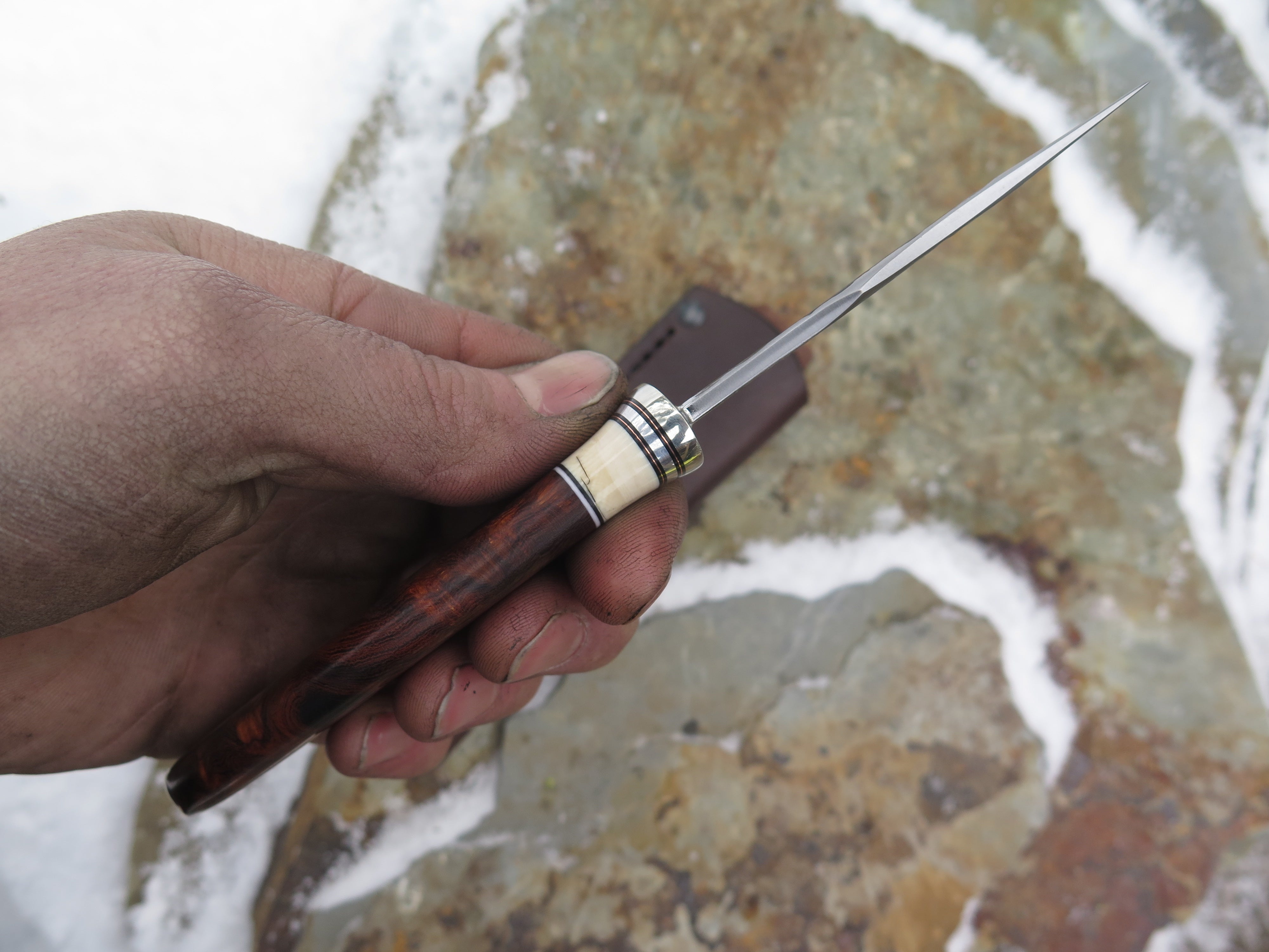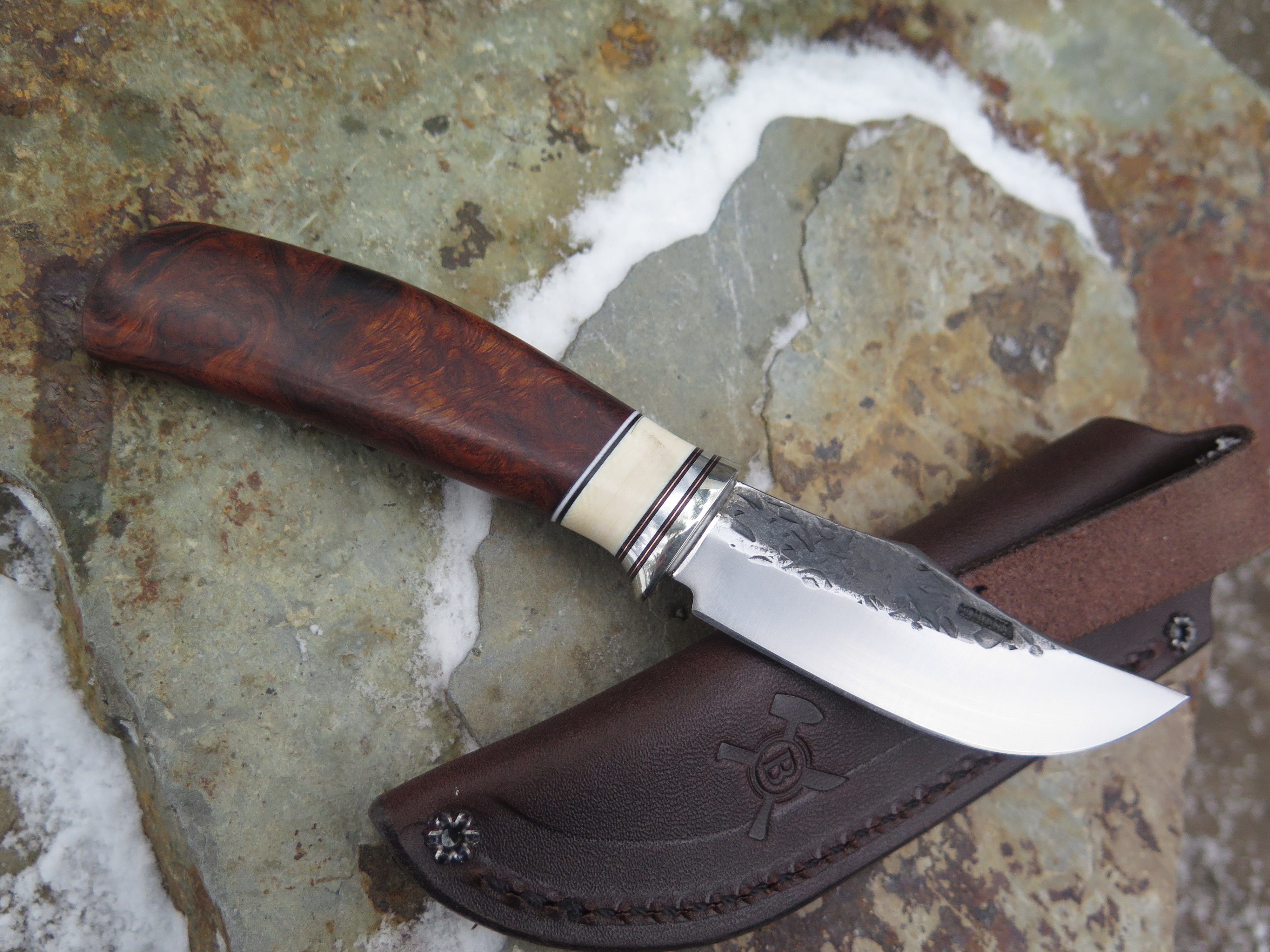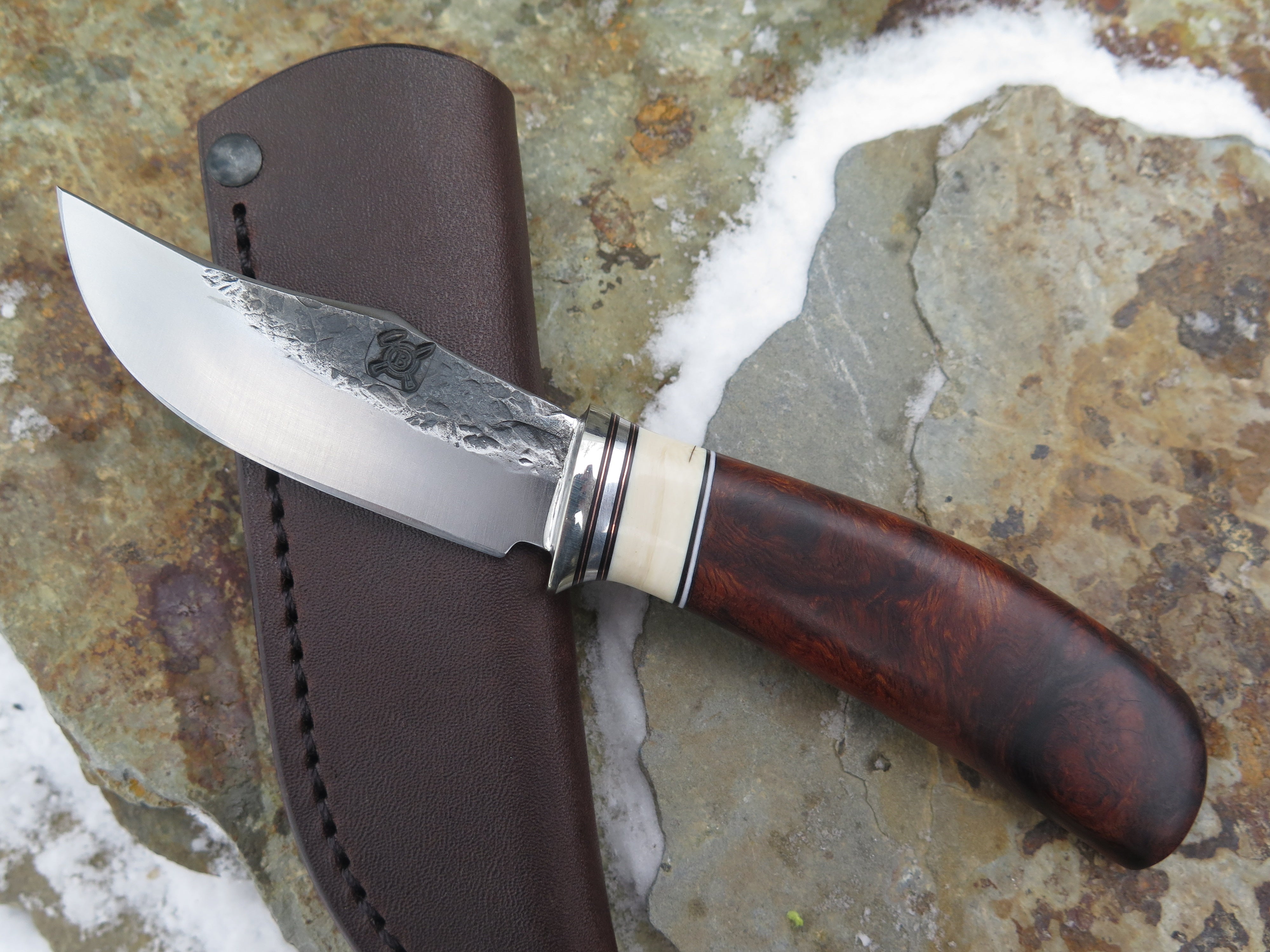This outstanding new Clip Point from Behring Made© is hand forged from 1/8" thick high carbon 01 tool steel and it measures 3" from tip to guard with a razor sharp hollow grind and our hammermark finish. The nickel silver guard is soldered in place above black and white fiber, aluminum, copper and ancient mammoth ivory spacers as well as a premium desert ironwood handle. The overall length measures 6 7/8" and this one comes in a classic leather belt pouch sheath.