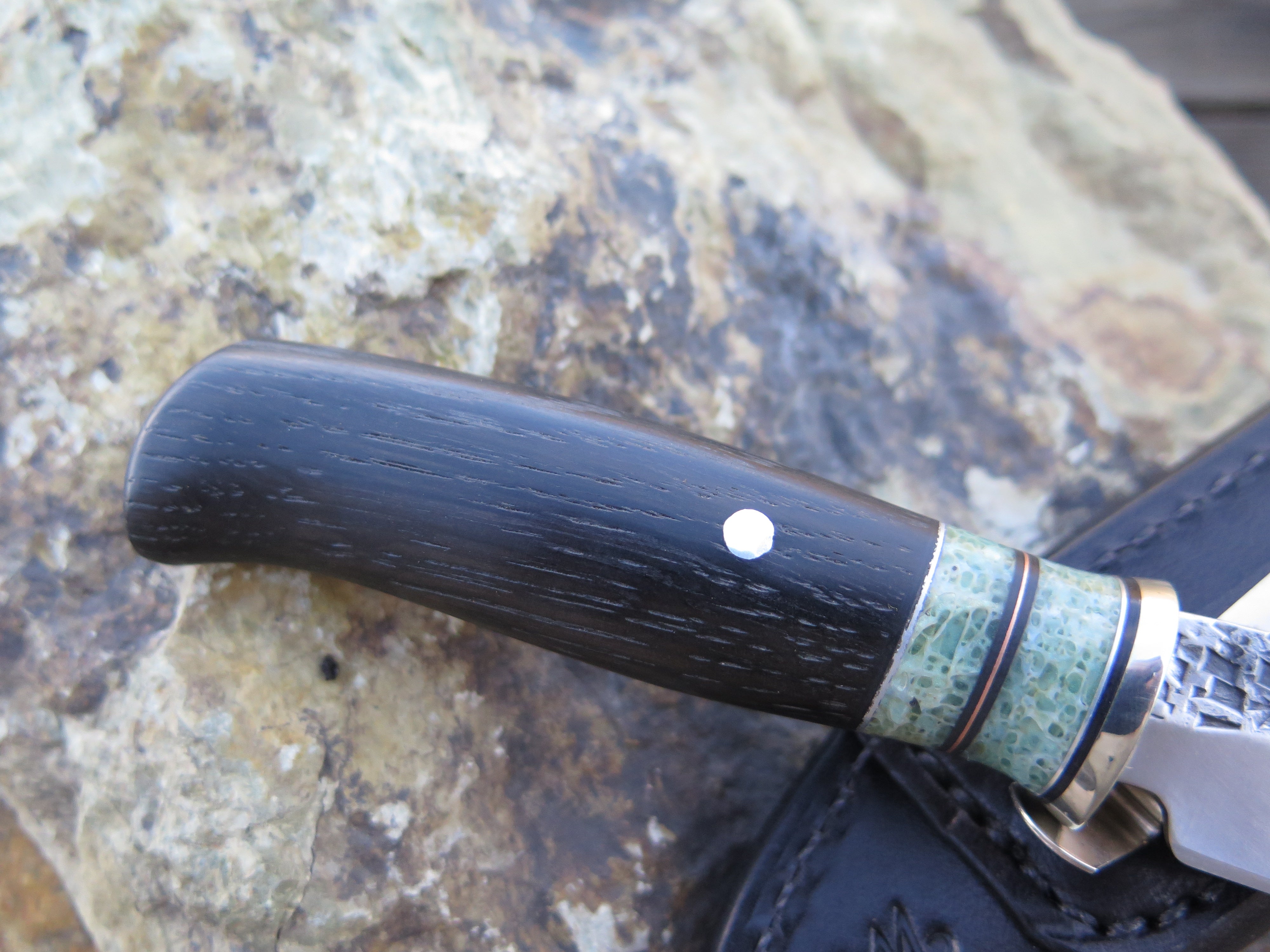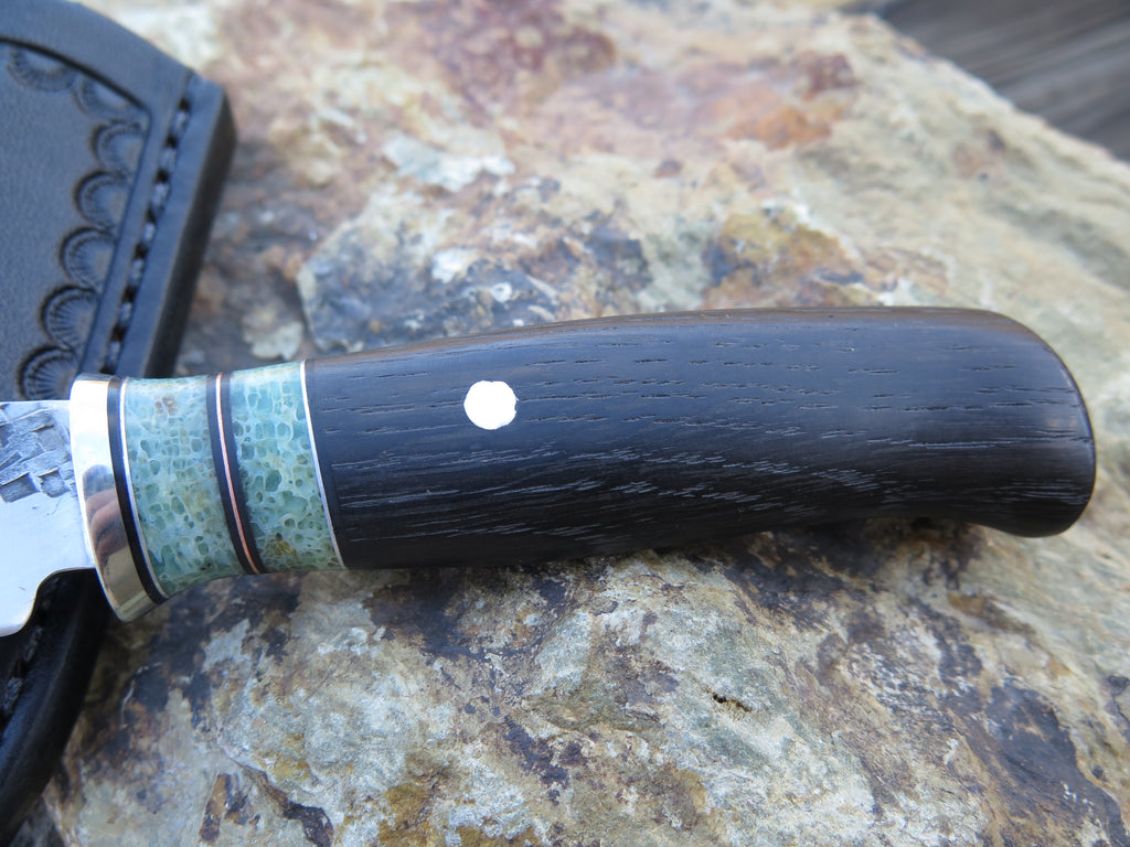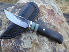This bad ass new little Pocket Knife from Behring Made™ is hand forged from 1/8" thick high carbon 01 tool steel and it measures a 3" razor sharp hollow grind with our hammermark finish. The nickel silver guard is soldered in place above black fiber, aluminum, copper and two stabilized giraffe bone spacers. The handle is made from black ebony wood and it measures 6 1/2" overall with an aluminum pin through the tang. This one also comes in a custom pocket sheath from Warlander Leather for an ultra convenient carry.