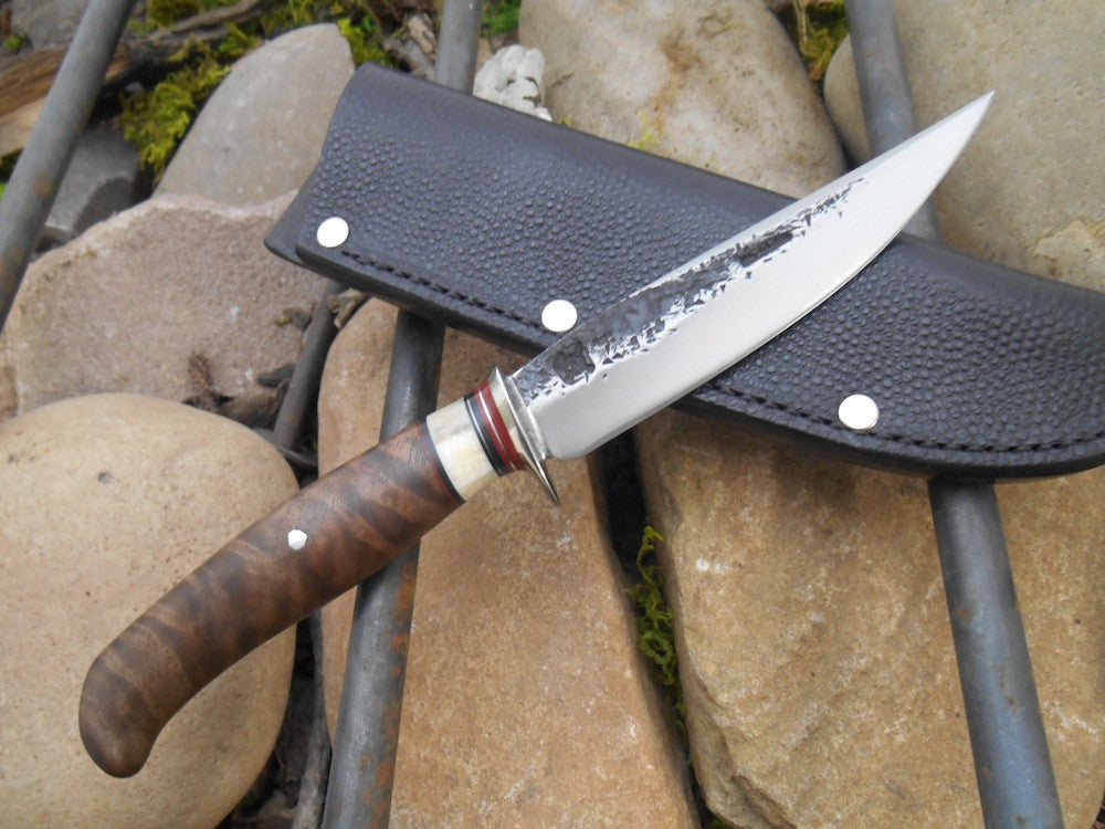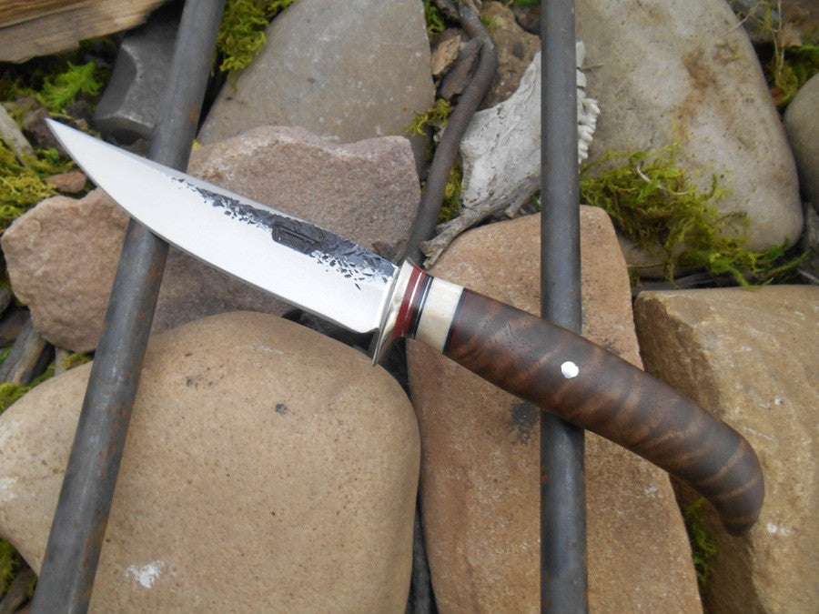 This Behring Made is a hammermark 4 1/2" hand forged high carbon steel Trout & Bird. The nickel silver guard sits on top of black, maroon, and musk ox spacers that accompany the beautiful exhibition grade walnut handle with a crows beak and aluminum pin. The overall length of this T&B measures 9 1/4" and it comes in a black pig skin pouch.