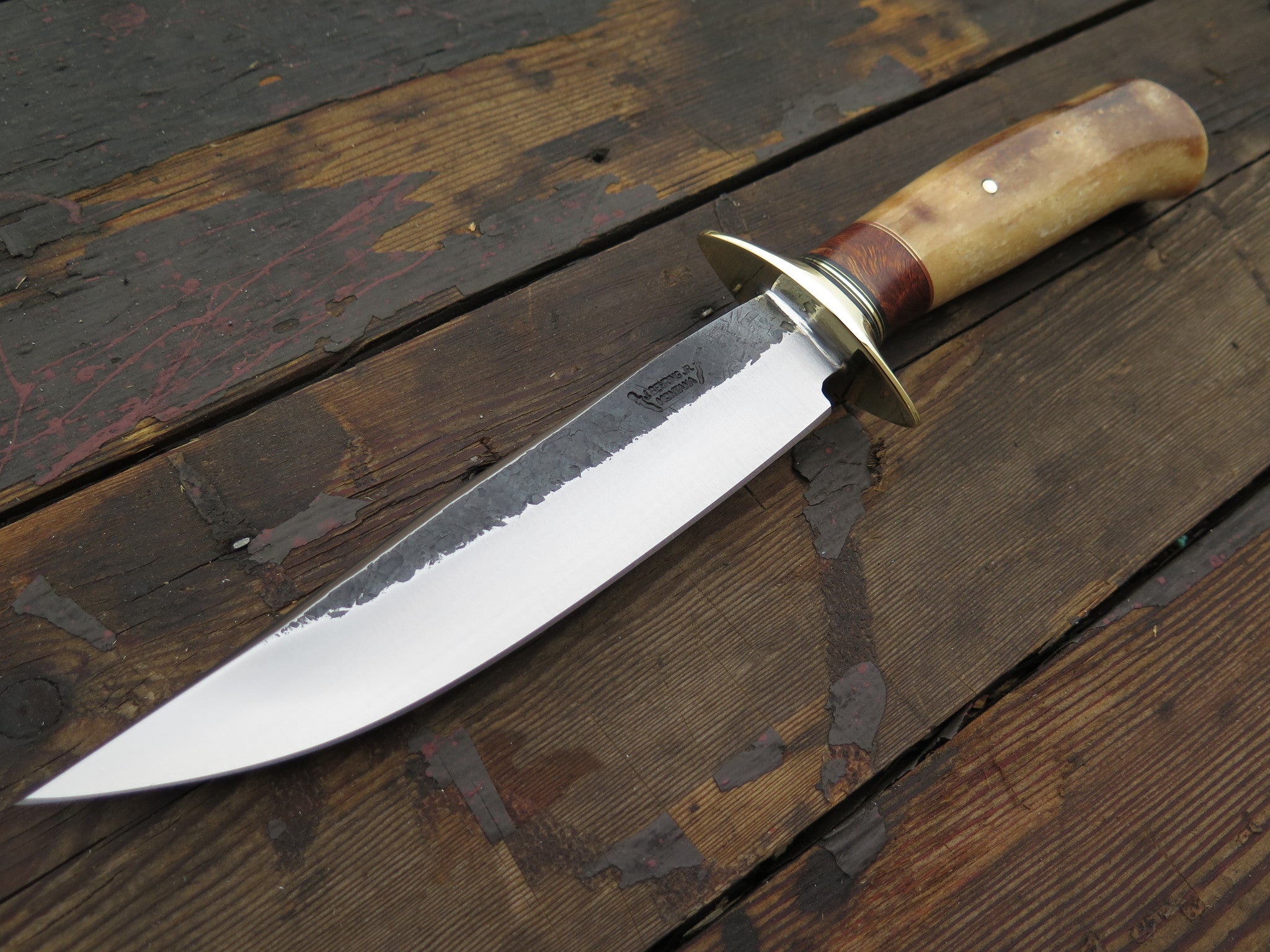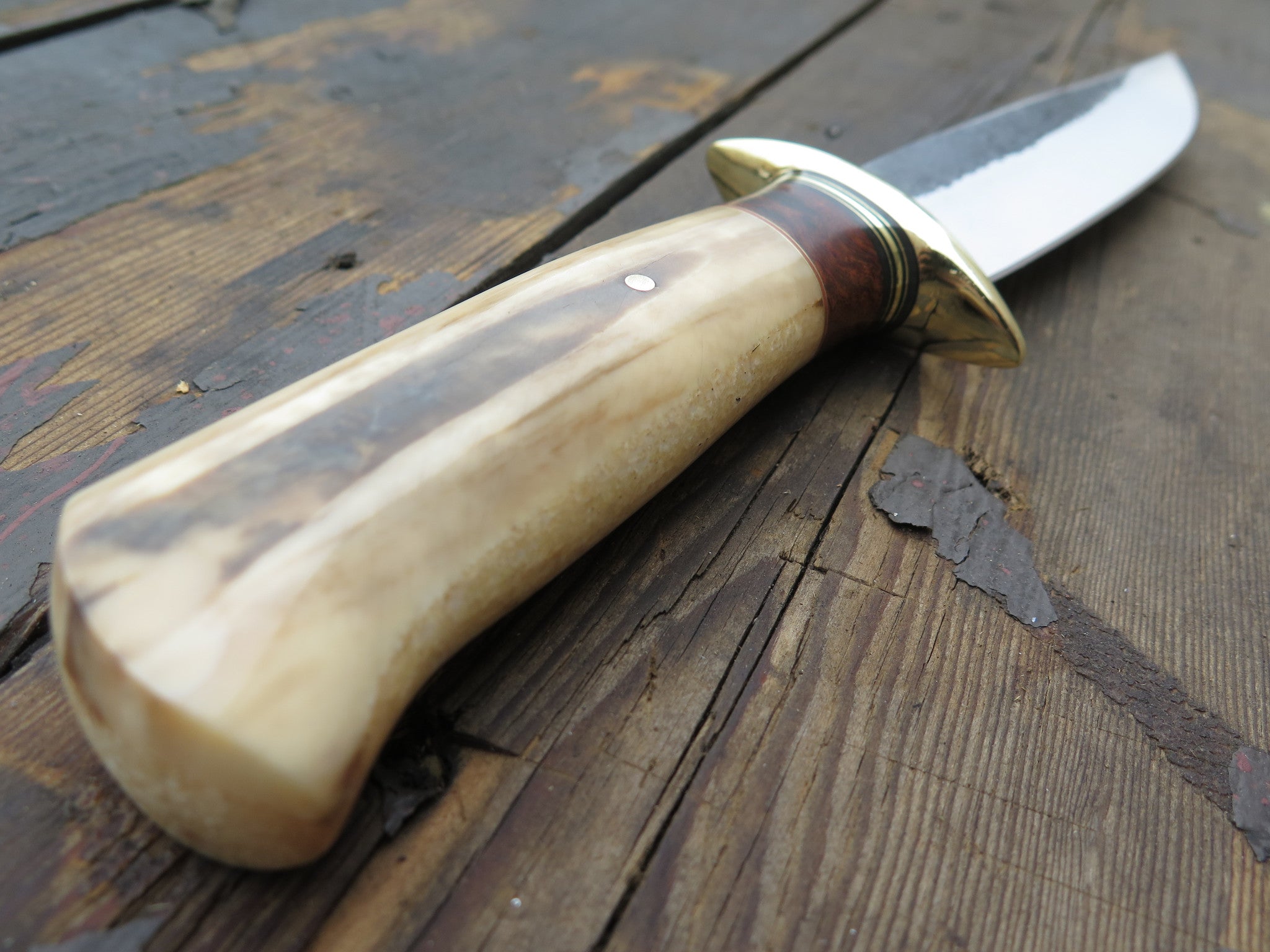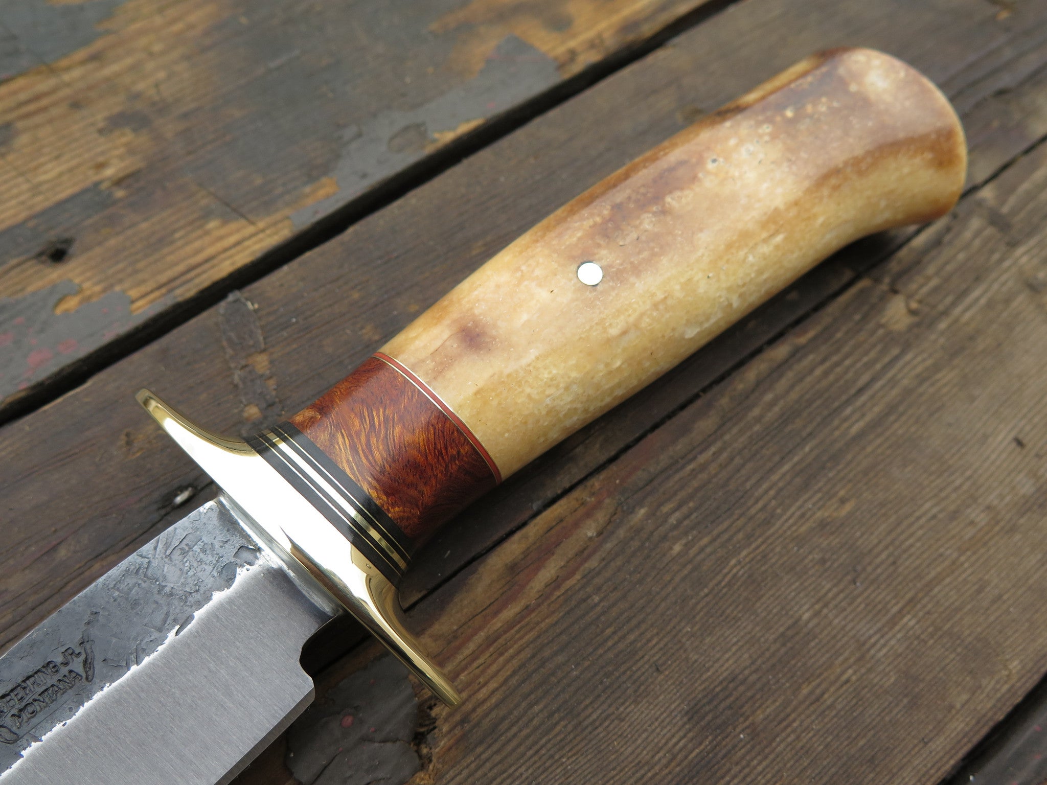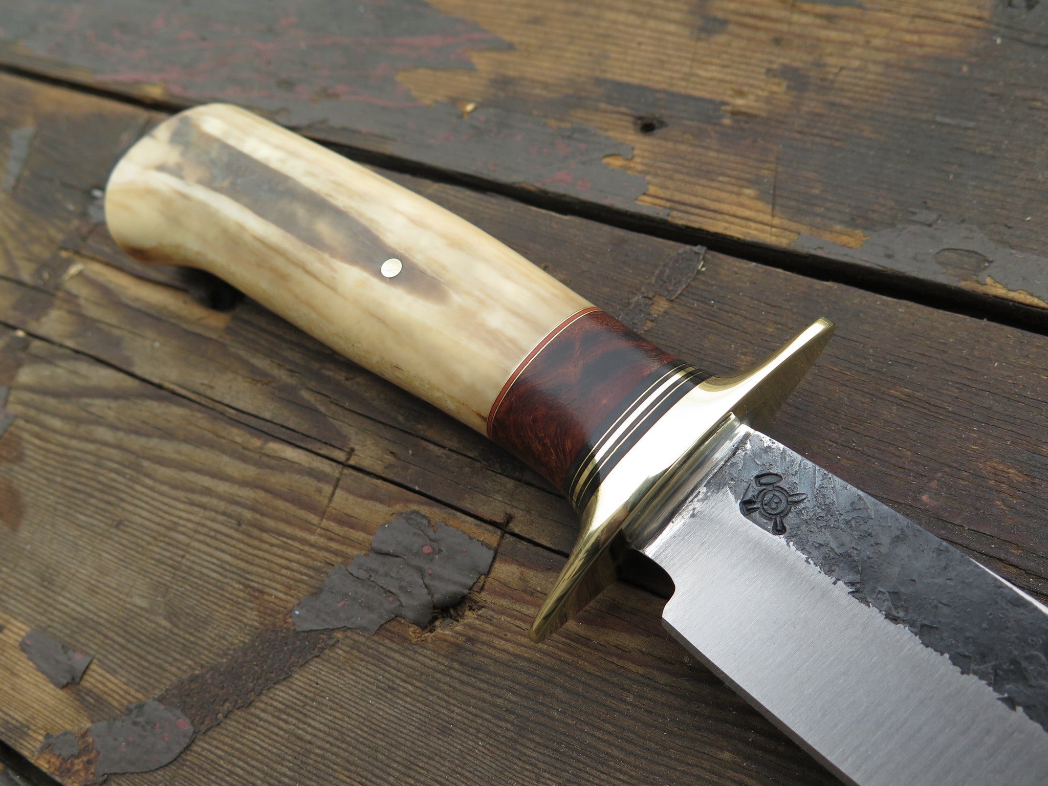 This beautiful Behring Made fighter is hand forged to 6 1/2" from tip to guard with a razor sharp hollow grind and a hammermark finish. The tall brass guard is soldered in place above black, maroon, brass, and desert ironwood spacers, as well as a premium fossil walrus ivory crow's beak handle. The overall length measures 11 1/2" and it comes in a custom exotic inlay sheath from Glacier Leather.
