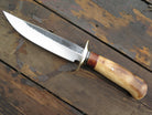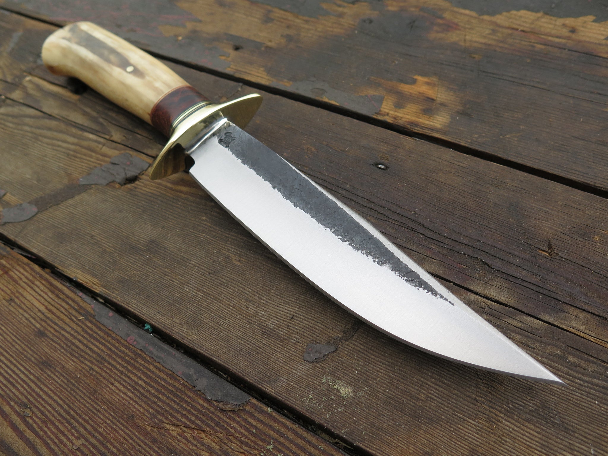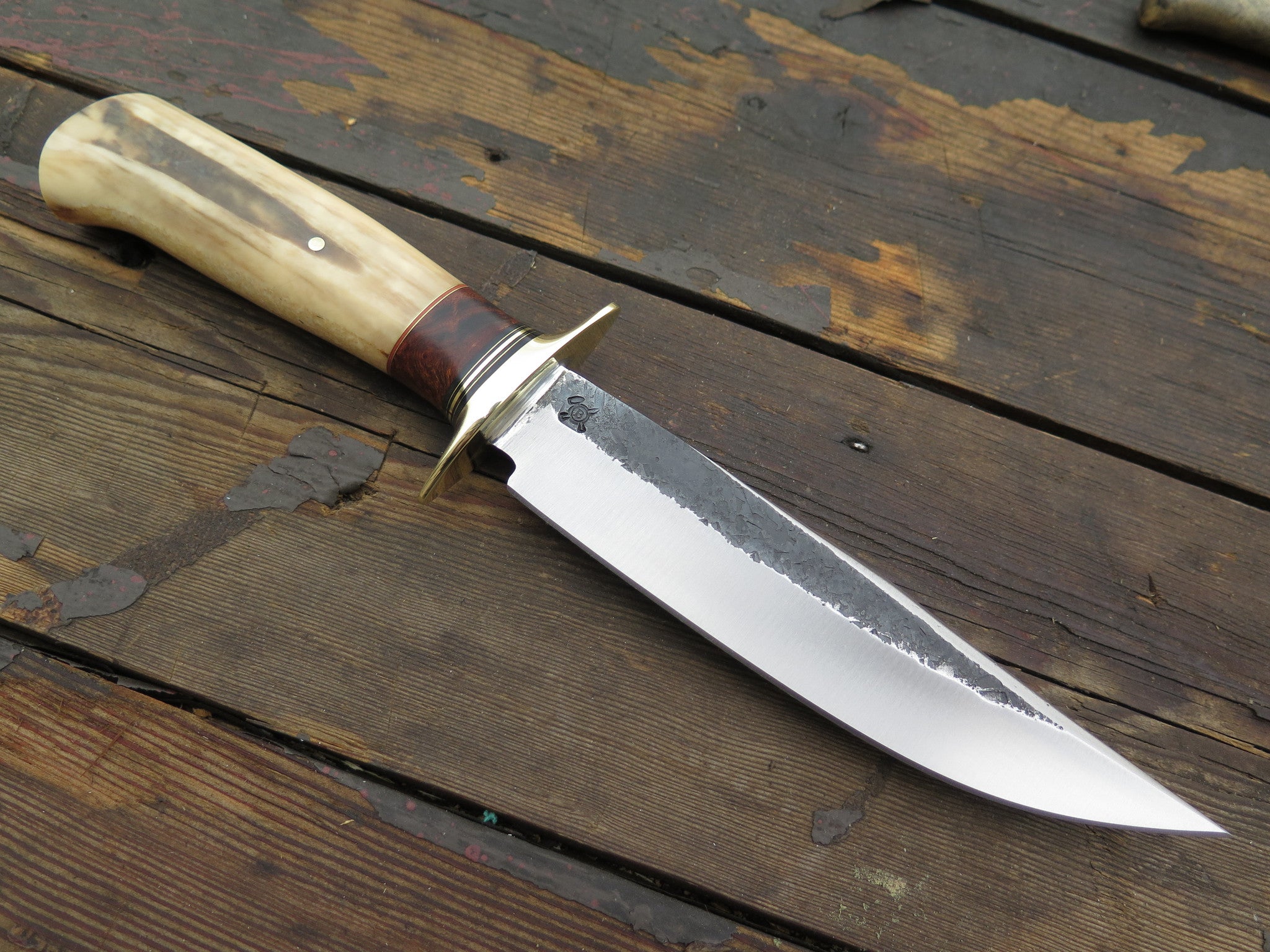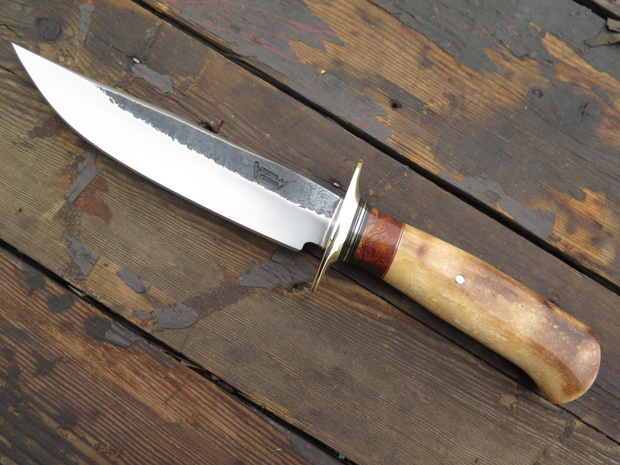 This beautiful Behring Made fighter is hand forged to 6 1/2" from tip to guard with a razor sharp hollow grind and a hammermark finish. The tall brass guard is soldered in place above black, maroon, brass, and desert ironwood spacers, as well as a premium fossil walrus ivory crow's beak handle. The overall length measures 11 1/2" and it comes in a custom exotic inlay sheath from Glacier Leather.