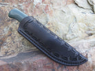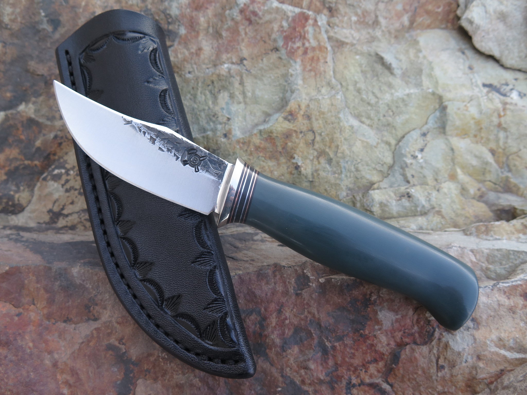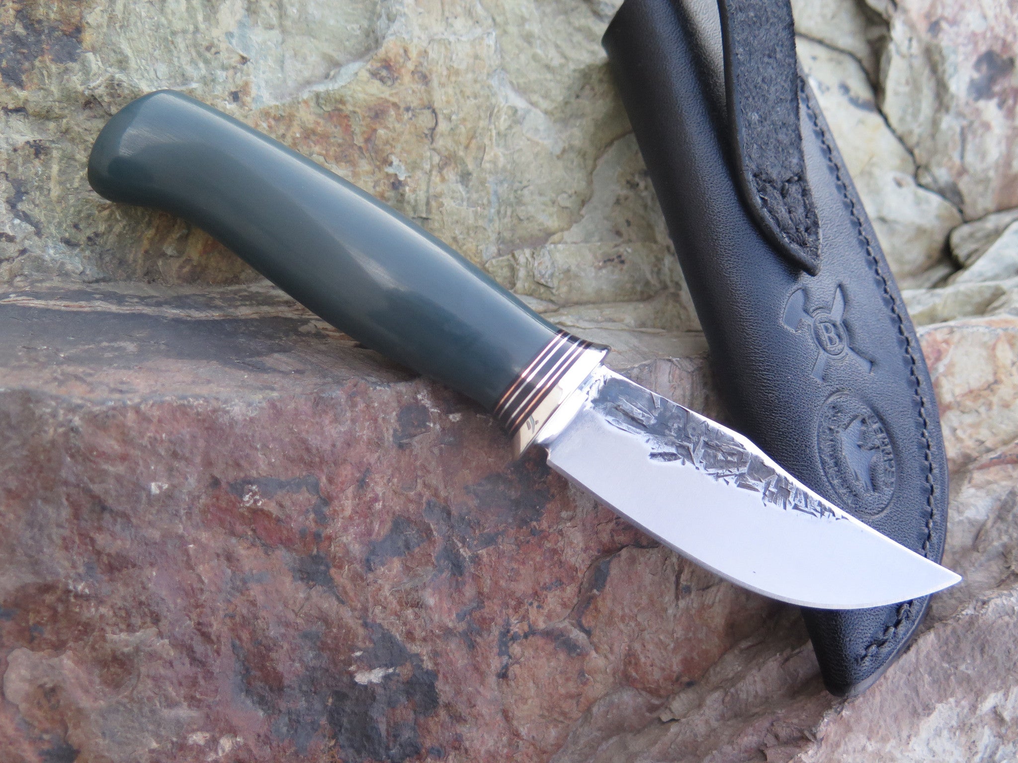It may be a mini, but ask anyone who's been around game long enough and they'll tell you it doesn't take much blade to get a whole lot of work done- this Mini Hunter being no exception. Hand forged from 1/8" thick high carbon 01 tool steel, the blade measures 2 3/4" from tip to guard with a razor sharp hollow grind and our hammermark finish. The nickel silver guard is soldered in place above black fiber, copper and aluminum spacers. The green g10 handle is shaped with James' signature crow's beak and the overall length measures 6 1/2". This one comes in a custom belt pouch sheath from Warlander Leather.