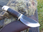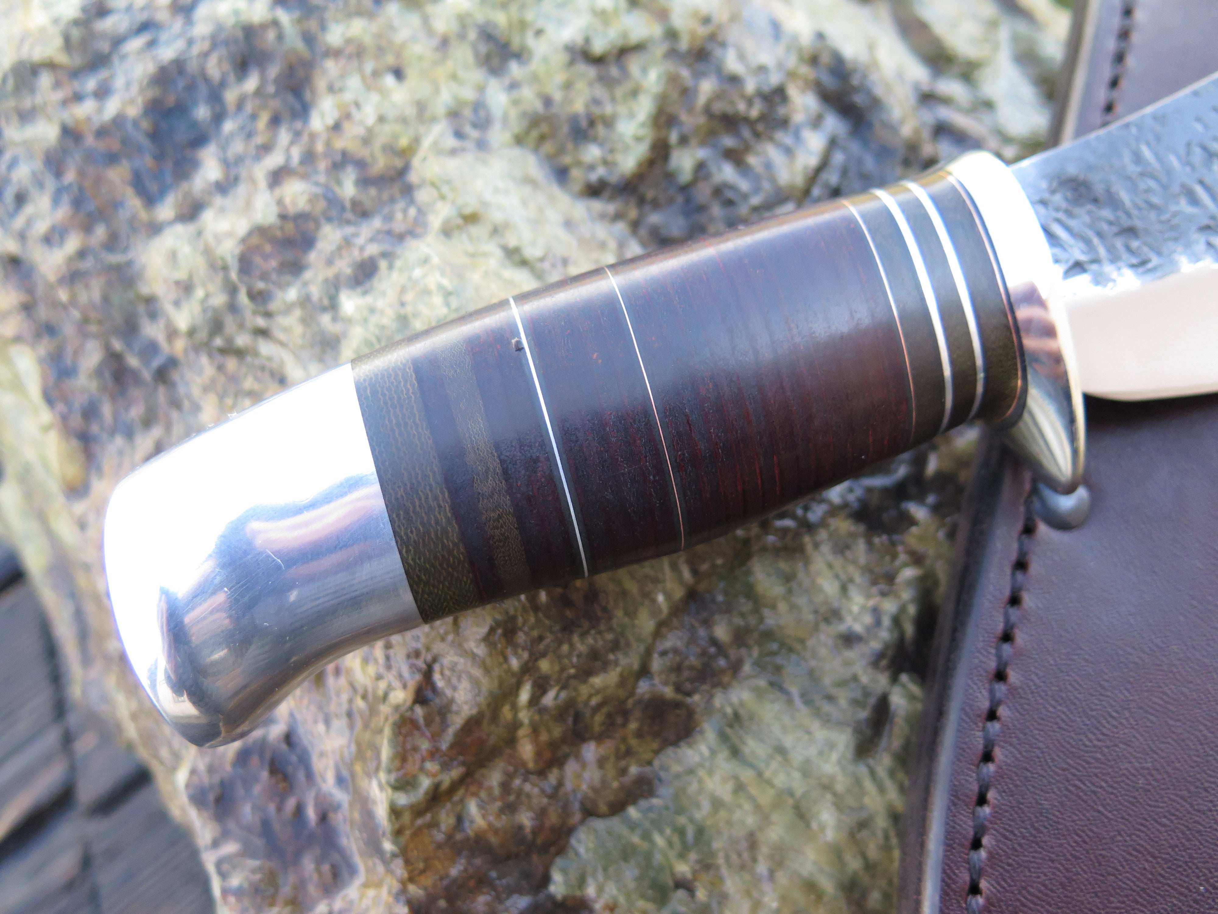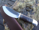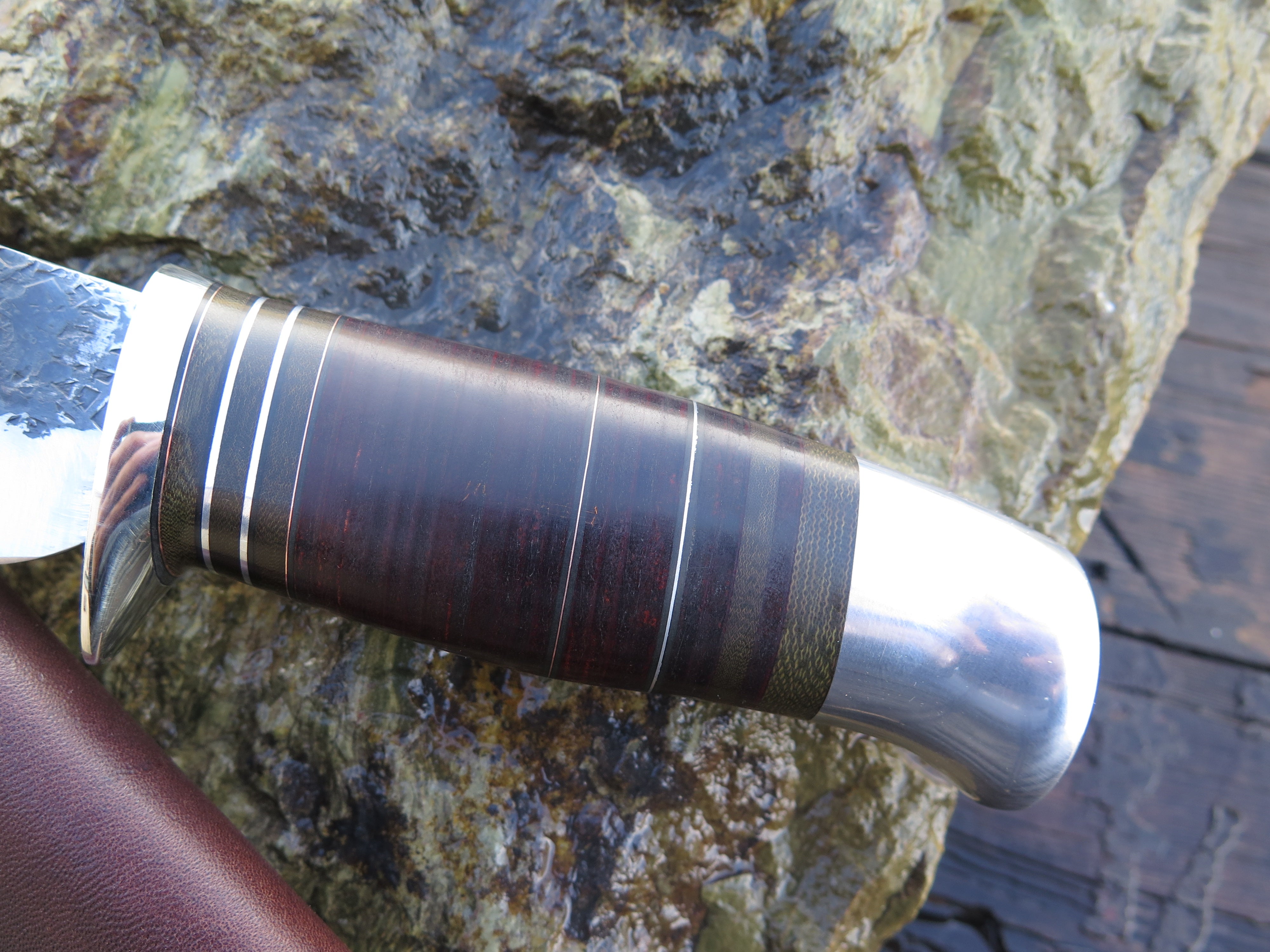This ideal Nessmuk from Behring Made© is hand forged from 3/16" thick high carbon 01 tool steel and it measures 4 1/2" from tip to guard with a razor sharp hollow grind and our hammermark finish. The nickel silver guard is soldered in place above black fiber, green micarta, copper, aluminum and horsehide leather spacers in addition to an aluminum butt that's also pinned through the tang with aluminum. The overall length measures 9" and it comes in a Warlander Leather pouch sheath.