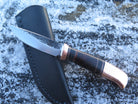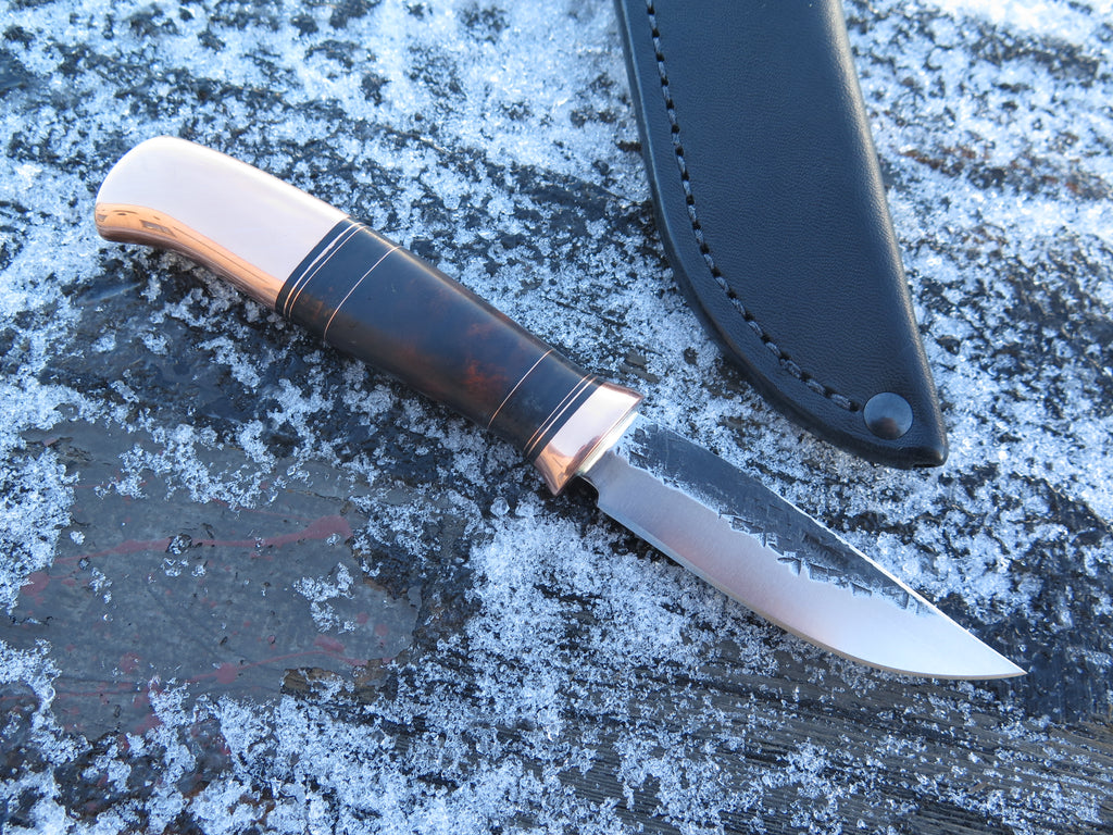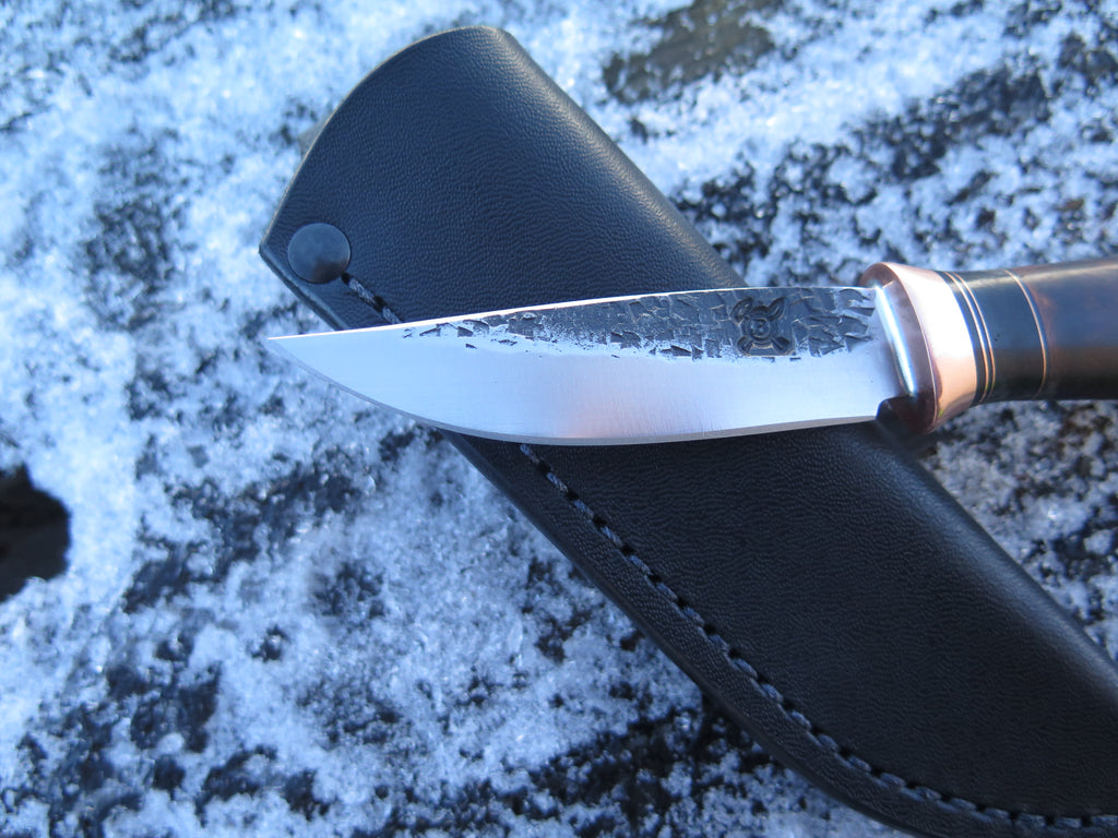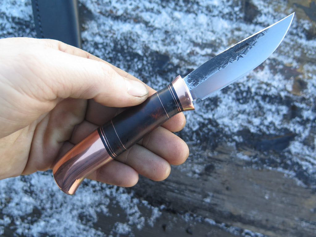 This beautiful new Pintail from Behring Made© is hand forged from 1/8" thick high carbon 01 tool steel and it measures 3" from tip to guard with a razor harp hollow grind and our hammermark finish. The copper guard is soldered in place above black fiber, copper, horsehide and premium desert ironwood burl as well as a big copper butt that's pinned through the tang with copper as well. The overall length measures 6 7/8" and it comes in a classic Warlander Leather pouch sheath.