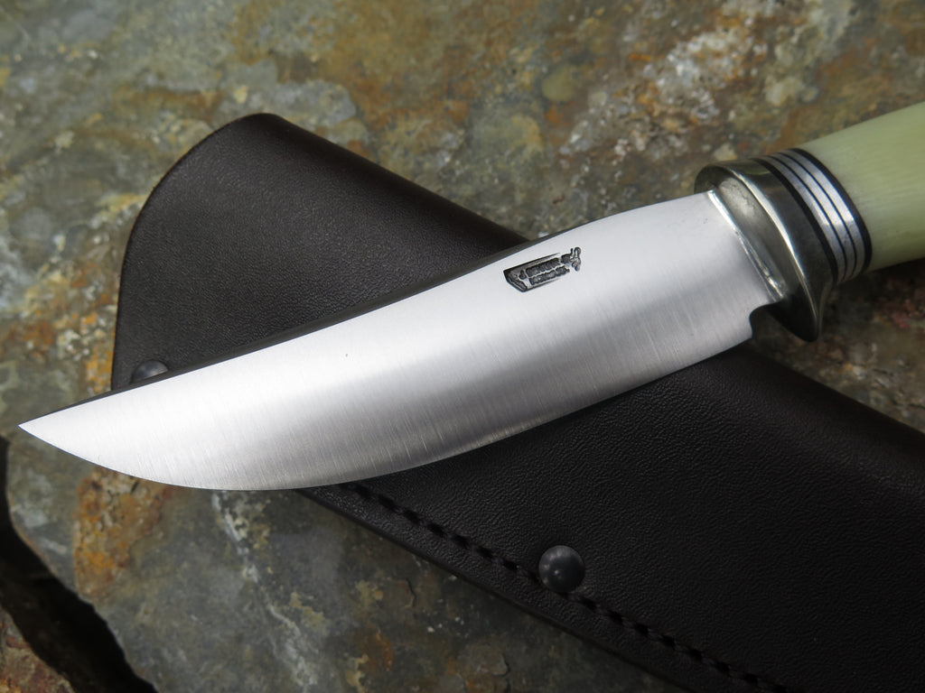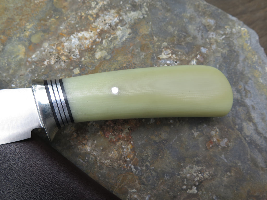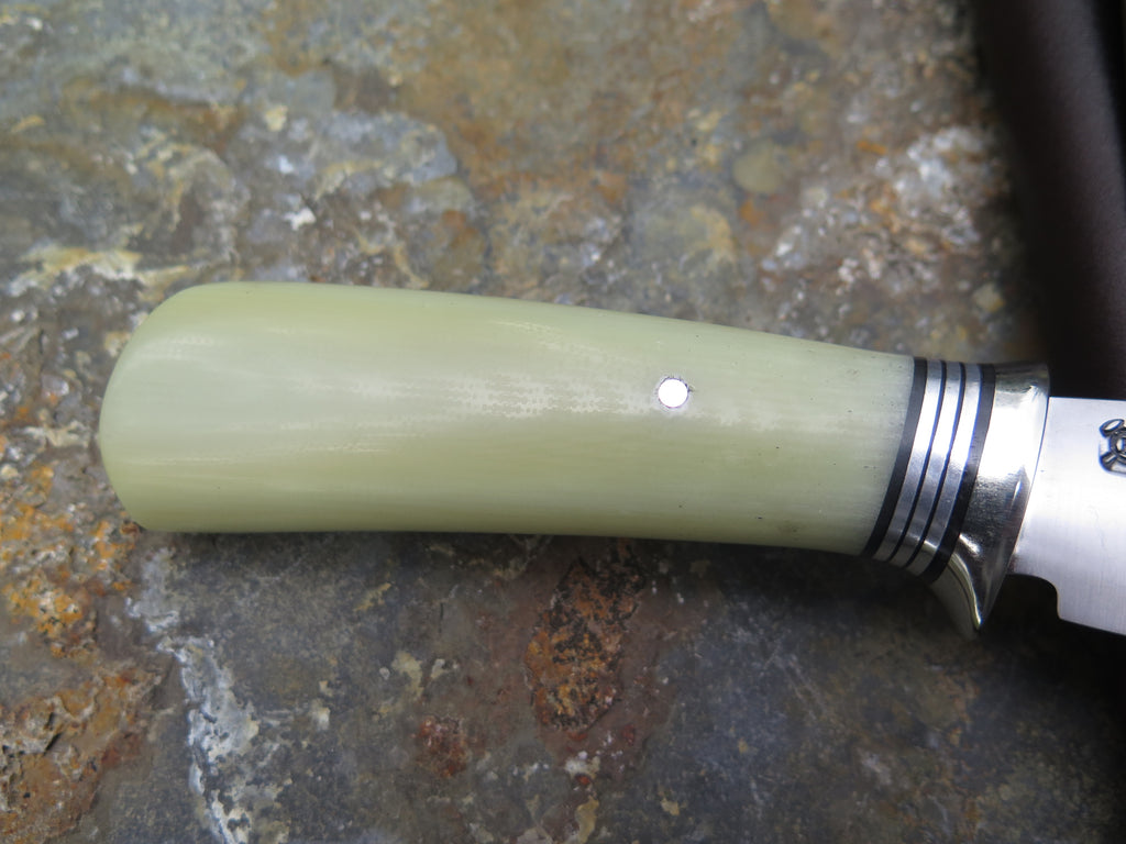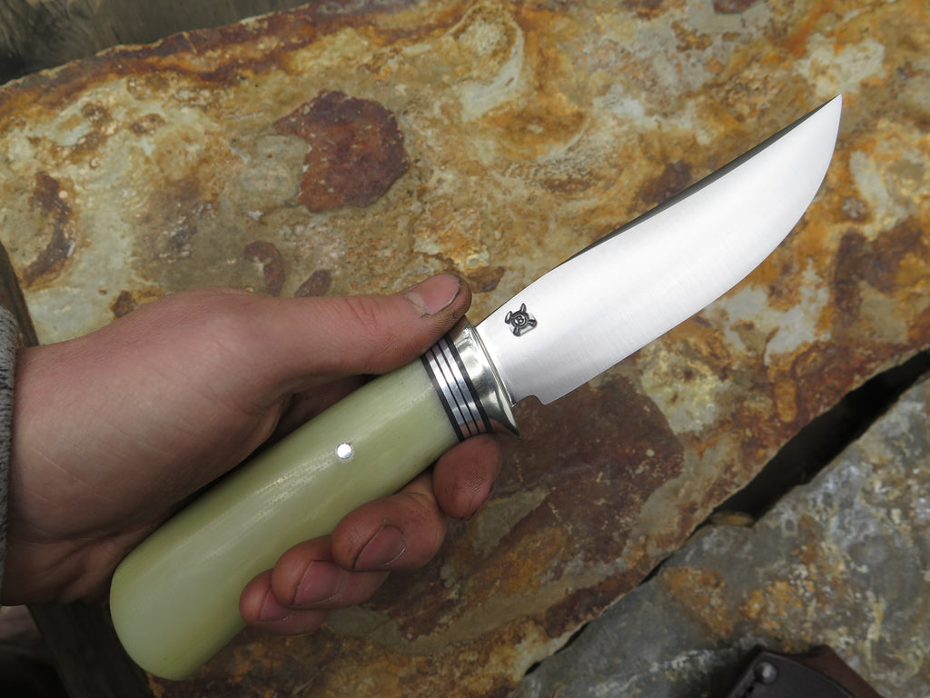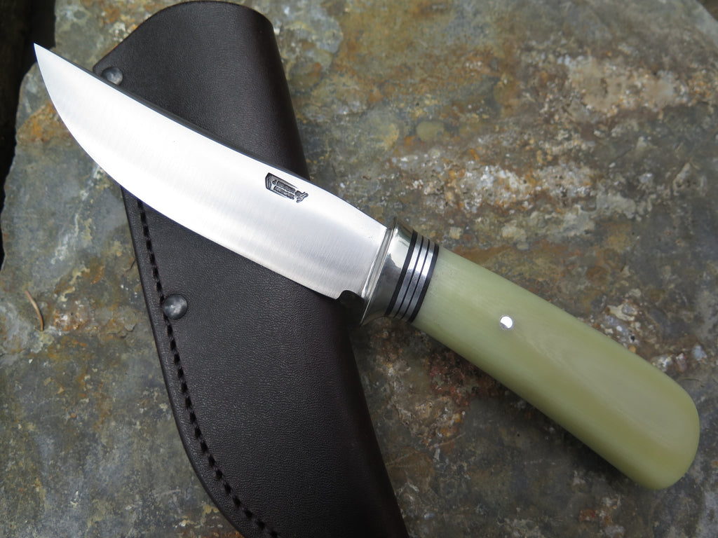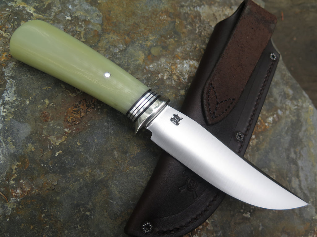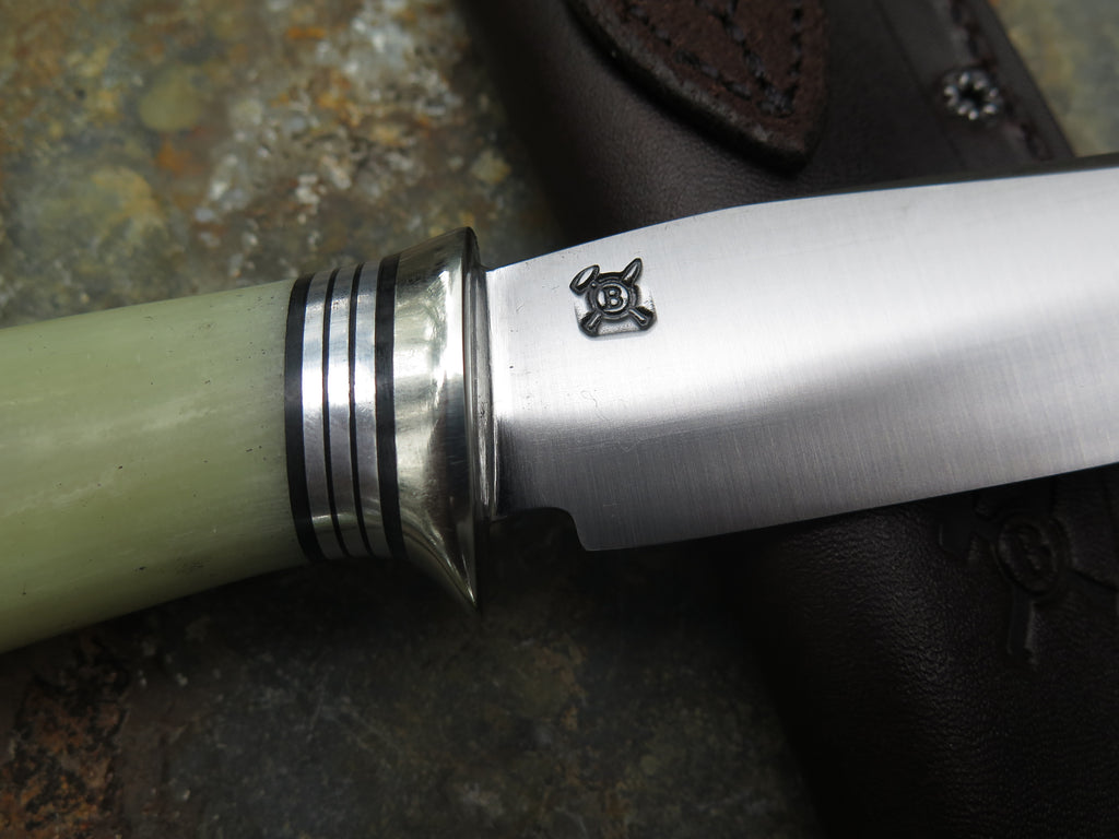 This awesome Hunter from Behring Made© is hand forged from 3/16" thick high carbon 01 tool steel and it measures 5" from tip to guard with a razor sharp convex grind. The nickel silver guards are soldered in place above black fiber and aluminum spacers that top the jade green g10 handle that is also pinned with aluminum. Overall length measures 9 1/2" and it comes in a classic pouch sheath.