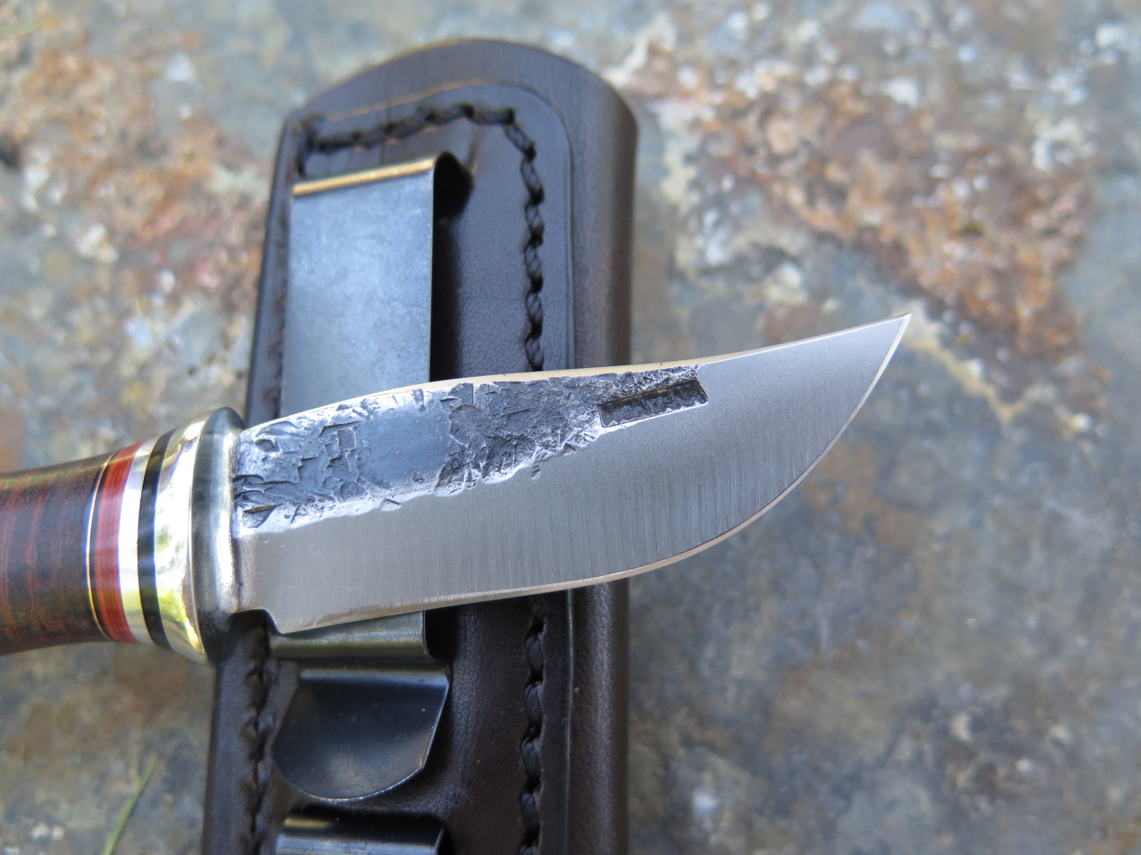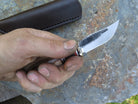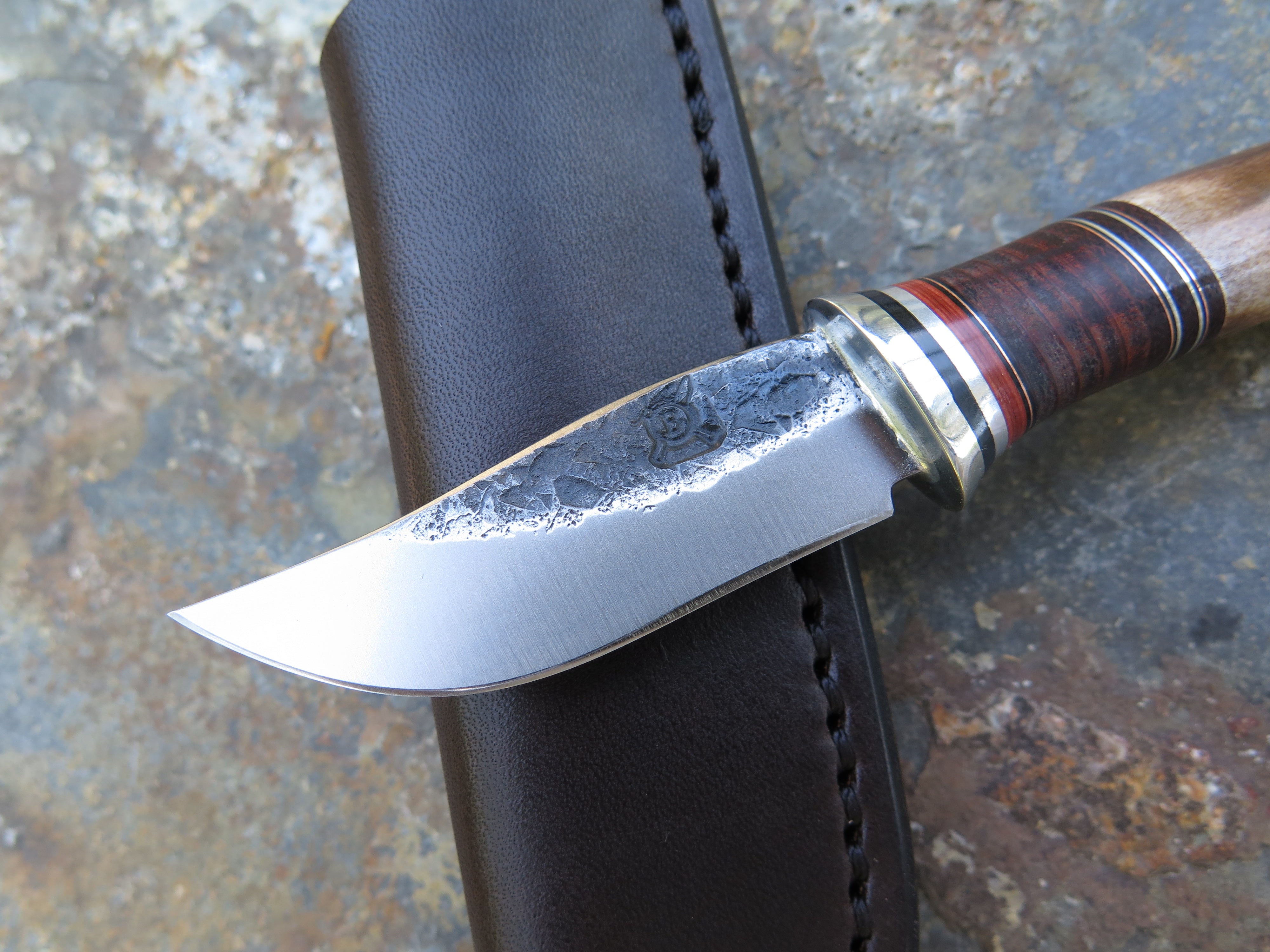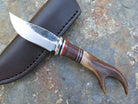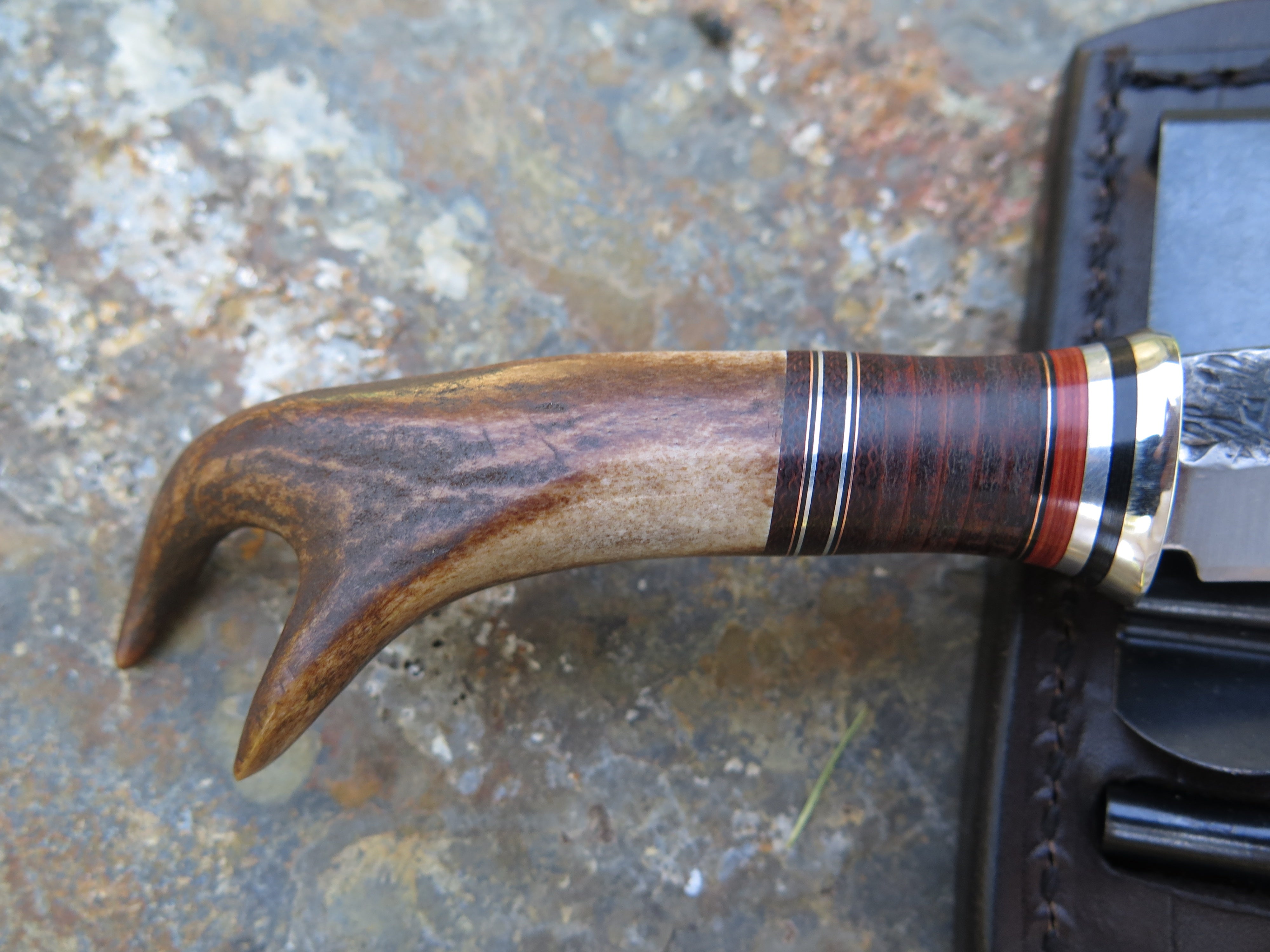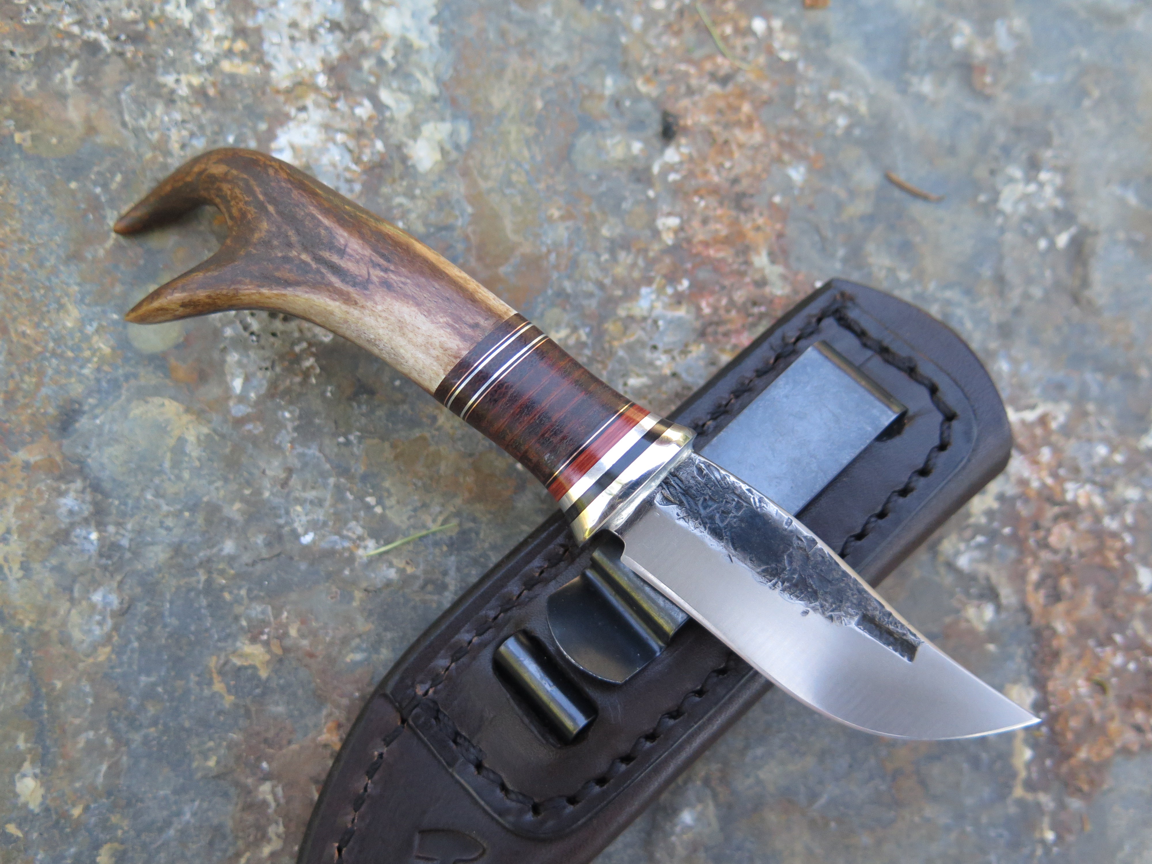 This outstanding new Pocket Knife from Behring Made© is hand forged from 1/8" thick high carbon 01 tool steel and it measures 2 1/2" from tip to guard with a razor sharp hollow grind and our hammermark finish. The nickel silver guard is soldered in place above black and maroon fiber, copper, aluminum and horsehide leather spacers as well as the beautiful mermaid tail shaped whitetail handle. The overall length measures 6" and it comes in a spring clip right-handed pocket sheath.