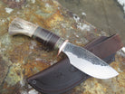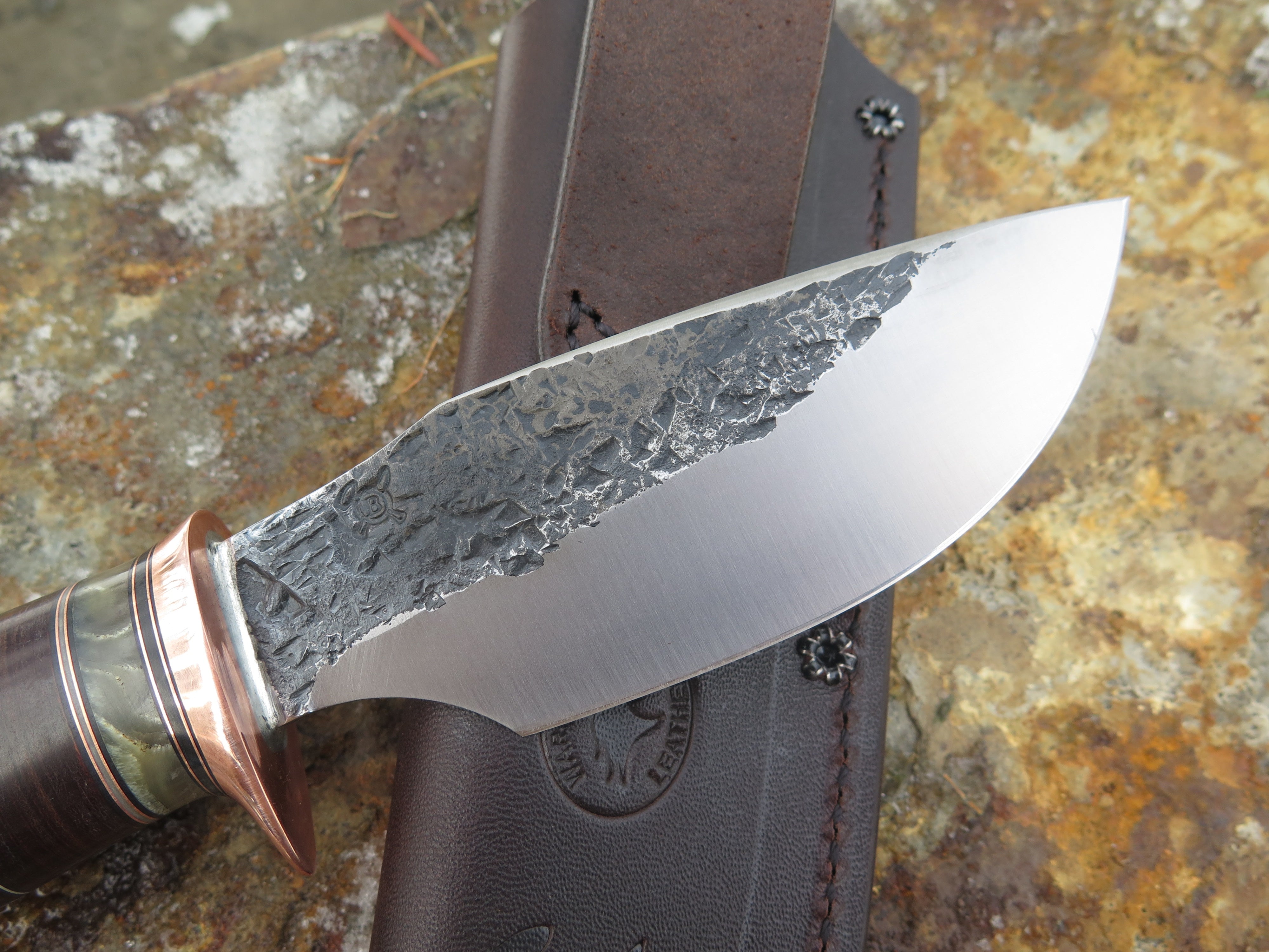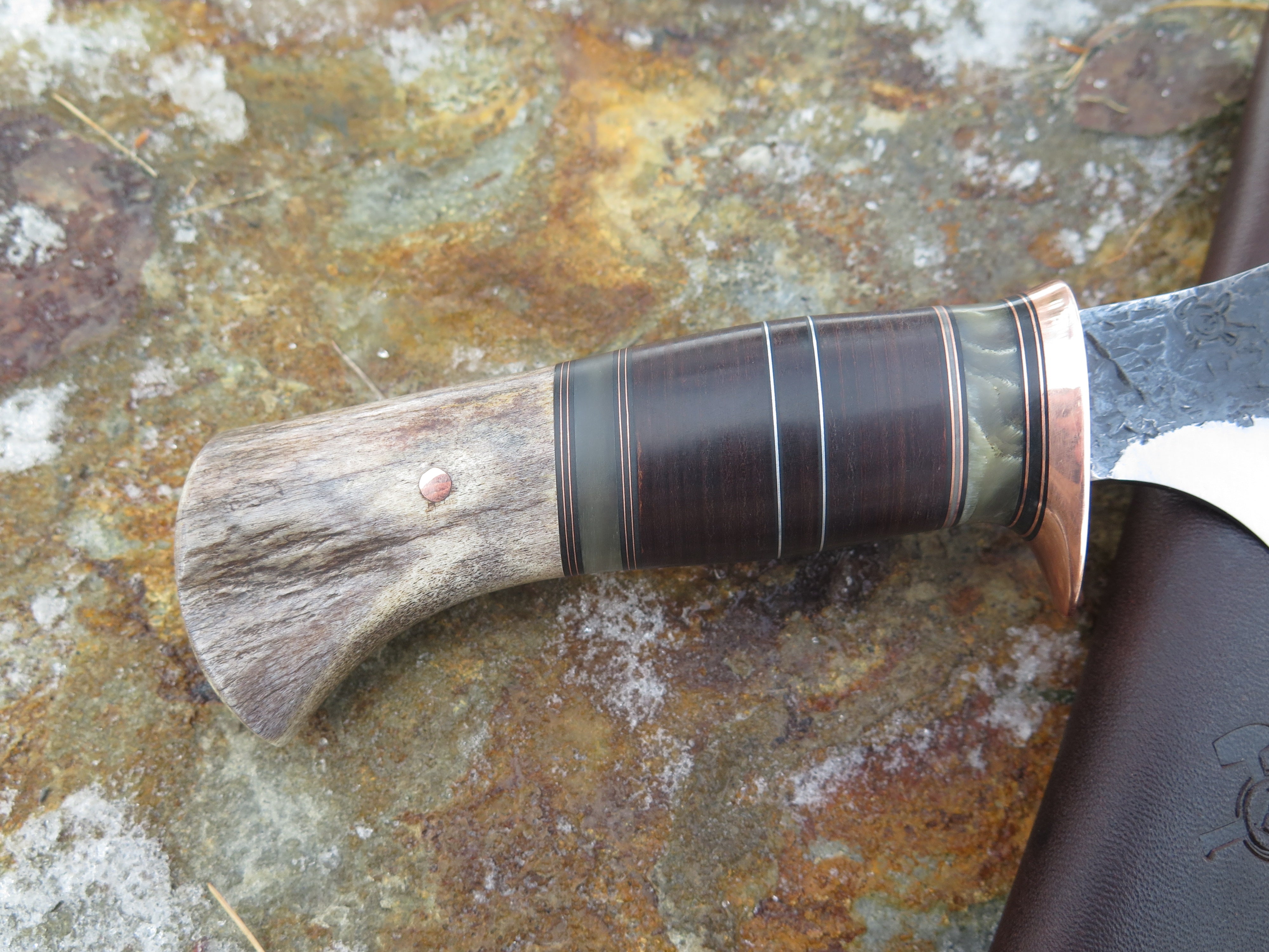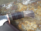 This bad ass new Alaskan is hand forged from 3/16" thick high carbon 01 tool steel and it measures 4 3/4" from tip to guard with a razor sharp hollow grind and our hammermark finish. The copper guard is soldered in place above black and gray fiber, copper, aluminum, horsehide and musk ox spacers atop a shiras moose butt that's pinned through the tang with copper. The overall length measures 9 1/8" and it comes in a classic leather belt pouch sheath, guaranteed for life.