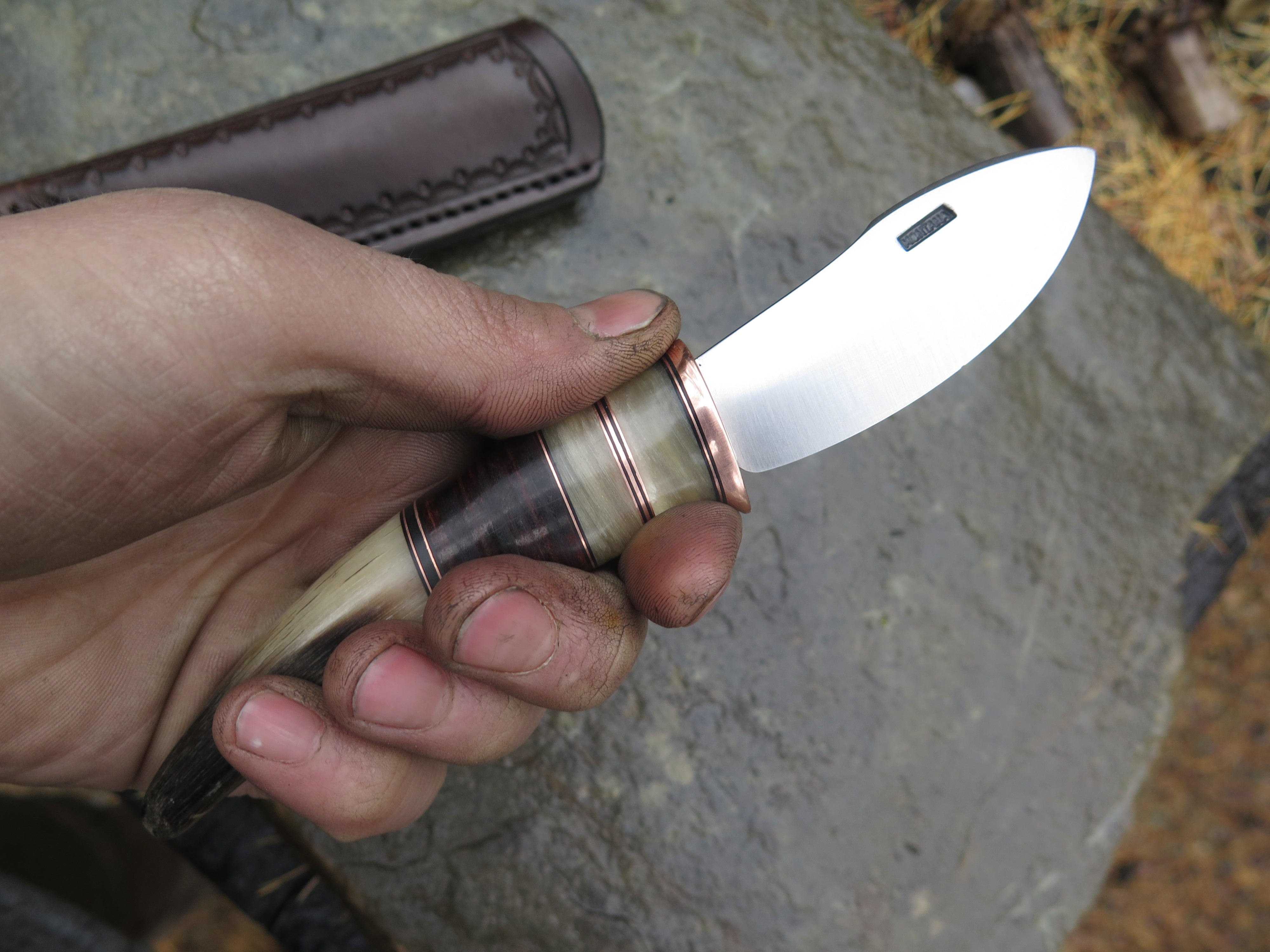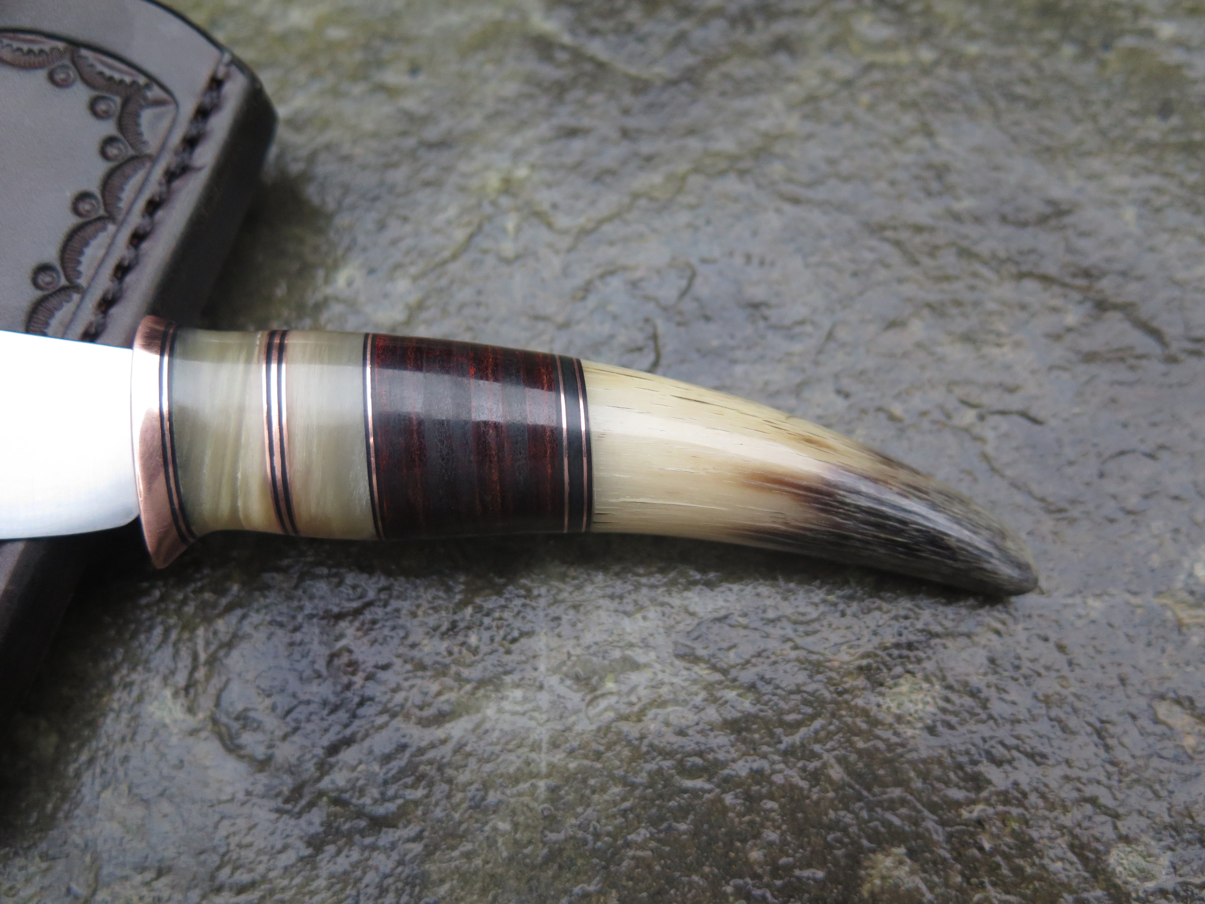 This incredible new Canoe Pocket Knife from Behring Made© is hand forged from 1/8" thick high carbon 01 tool steel and it measures 2 3/4" from tip to guard with a razor sharp convex grind. The copper guard is soldered in place above black fiber, copper, horsehide leather and two musk ox spacers which top a musk ox tine butt. Overall length measures 6 5/8" and this one comes in a sturdy clip sheath designed to ride in the right hand pocket of your britches.