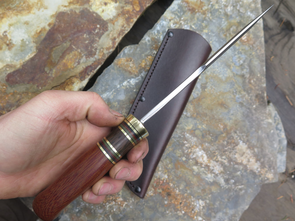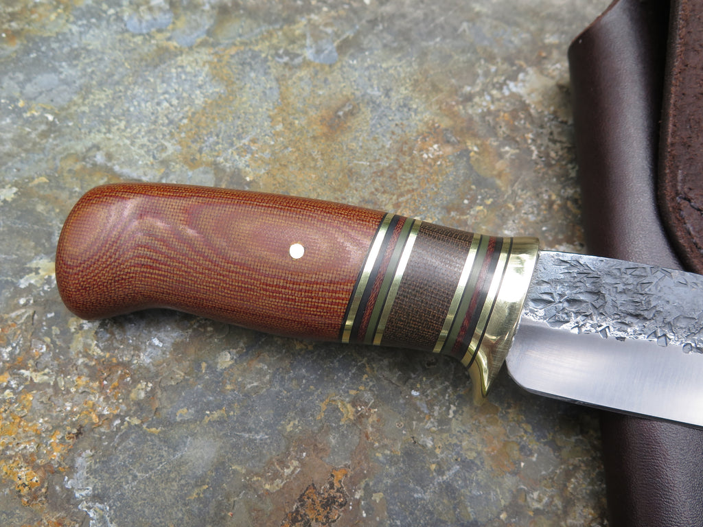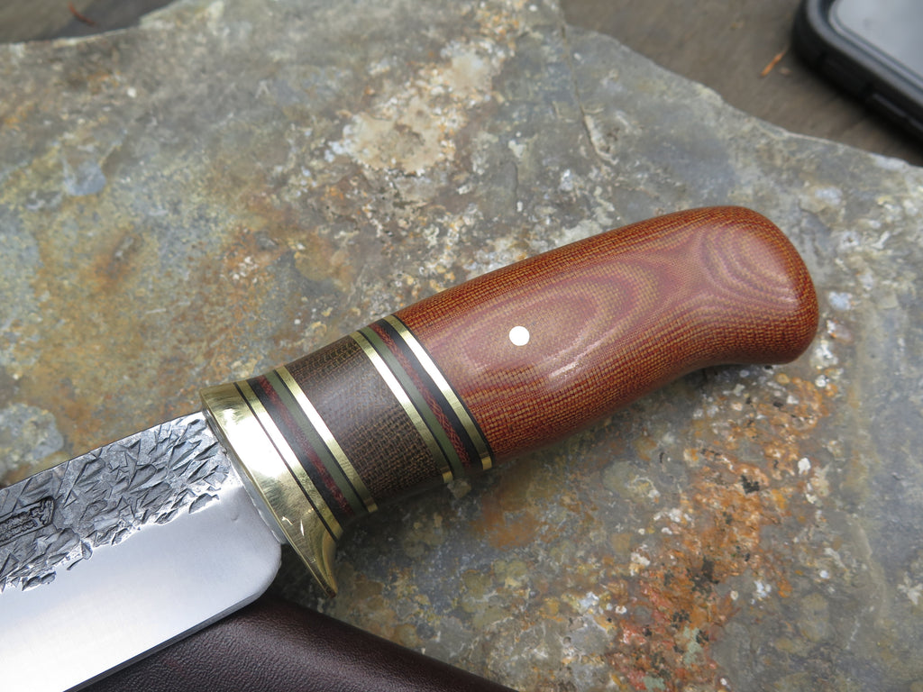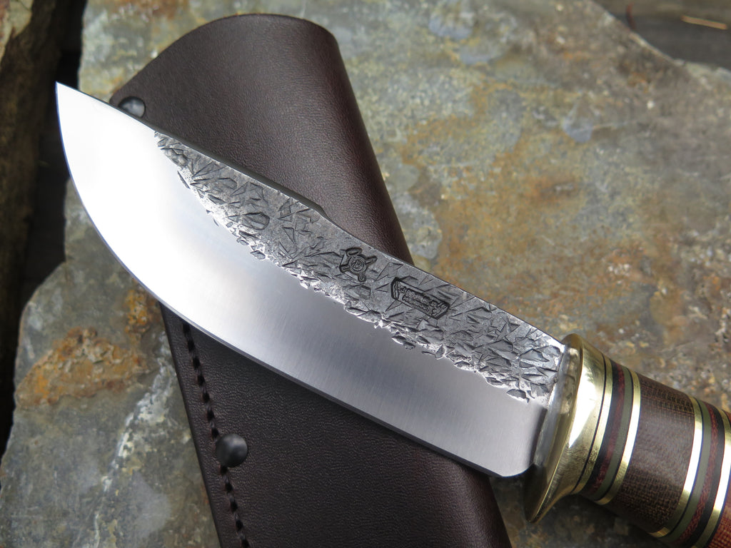 This outstanding new Woodcraft from Behring Made© is hand forged from 3/16" thick high carbon 01 tool steel and it measures 5 1/2" from tip to guard with a razor sharp hollow grind and our hammermark finish. The brass guard is soldered in place above black fiber, brass, green micarta, natural micarta and green g10 spacers as well as a natural canvas micarta that's pinned through the tang with brass. The overall length measures 10 1/4" and it comes in a classic leather belt pouch sheath.