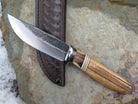 This beautiful new Behring Made© Tribute is hand forged from 1/8" thick highc carbon 01 tool steel and it measures 4 1/4" from tip to guard with a razor sharp hollow grind and our hammermark finish. The stainless guard is soldered in place above black, copper, brass, fossil walrus and ancient mammoth spacers in addition to remarkable artifact walrus ivory handle. The overall length measures just about 8 3/4" and it comes in a ripple tooled leather belt pouch sheath.