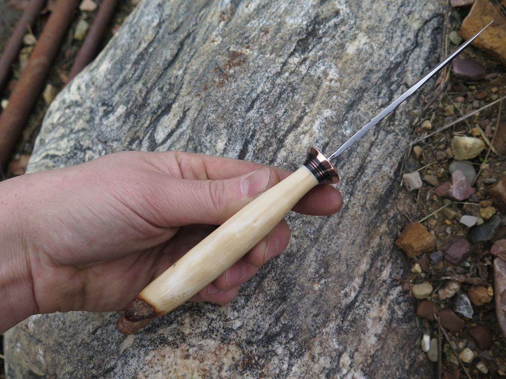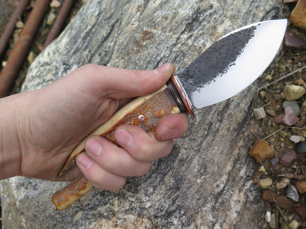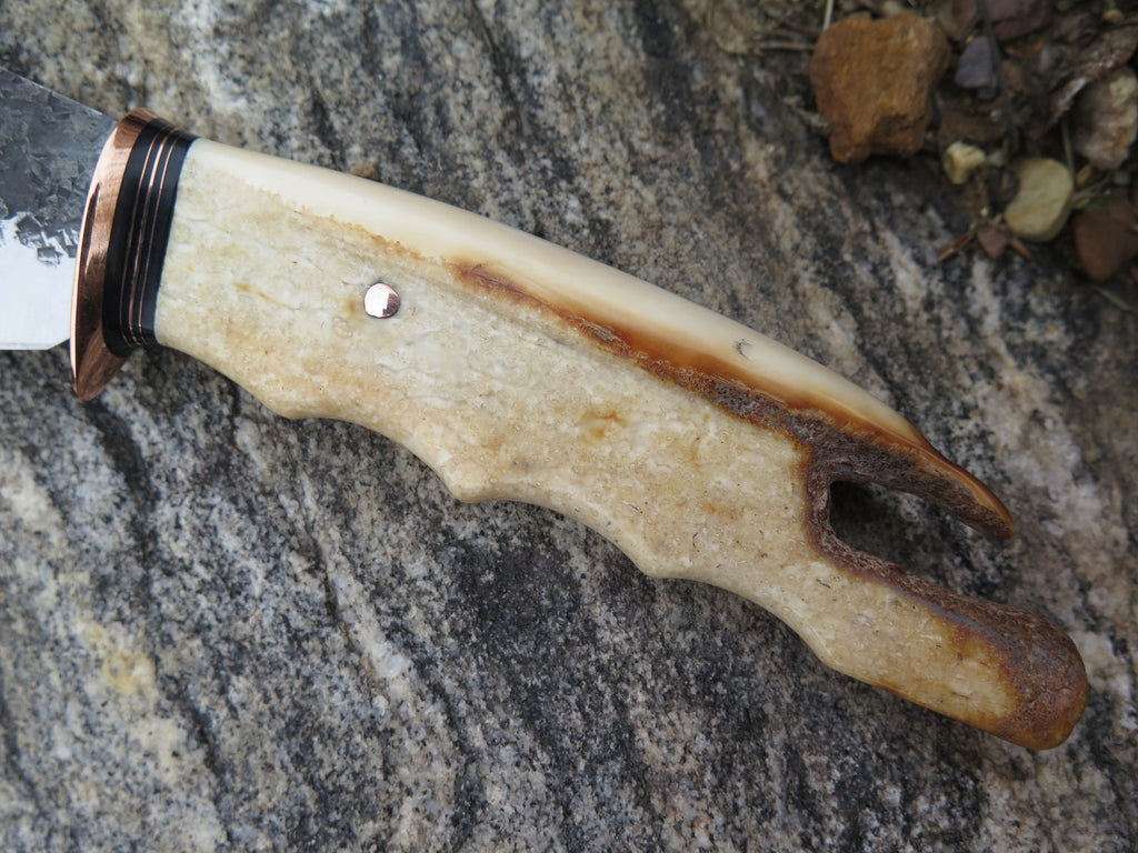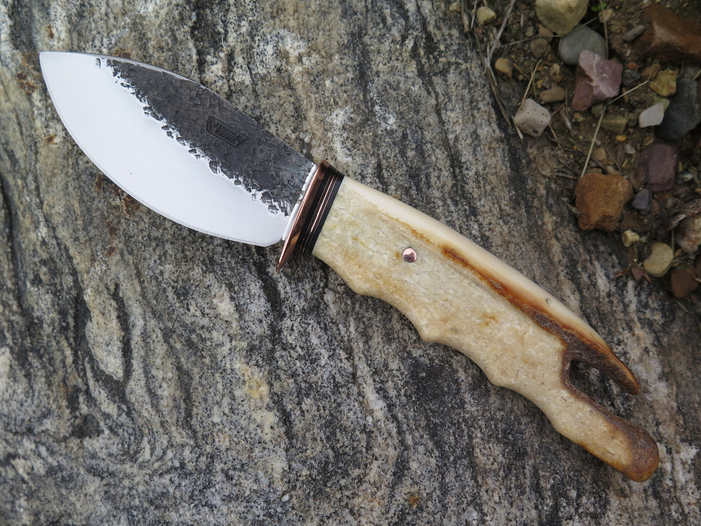 This unbelievable Nessmuk from Behring Made features an artifact walrus ivory sled runner handle with a lot of the initial carving still in place. The blade is hand forged from high carbon 01 tool steel and it measures 3 3/4" from tip to guard with a razor sharp hollow grind and a hammermark finish. The copper guard is soldered in place above black fiber and copper spacers, plus the handle with comfortable finger grips and a copper pin. The overall length measures 9" and it will come in a custom sheath from Warlander Leather. *CONTACT TO ORDER