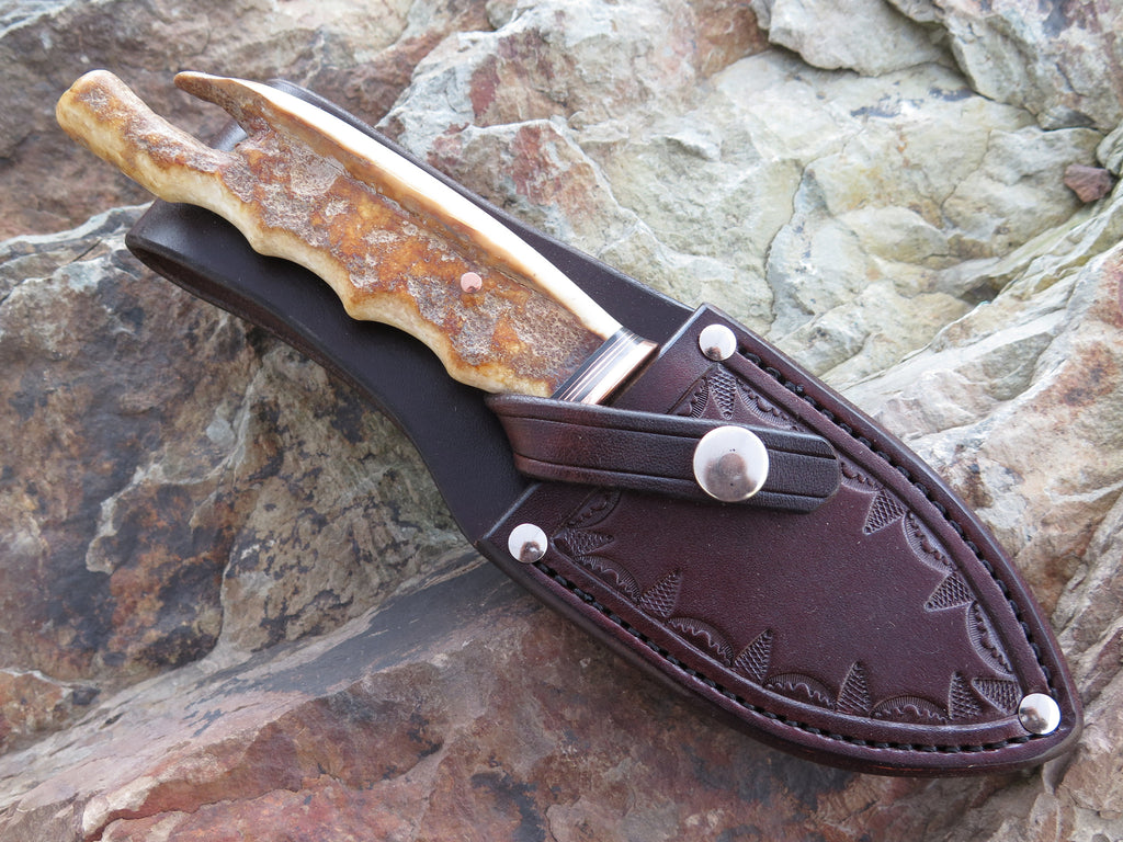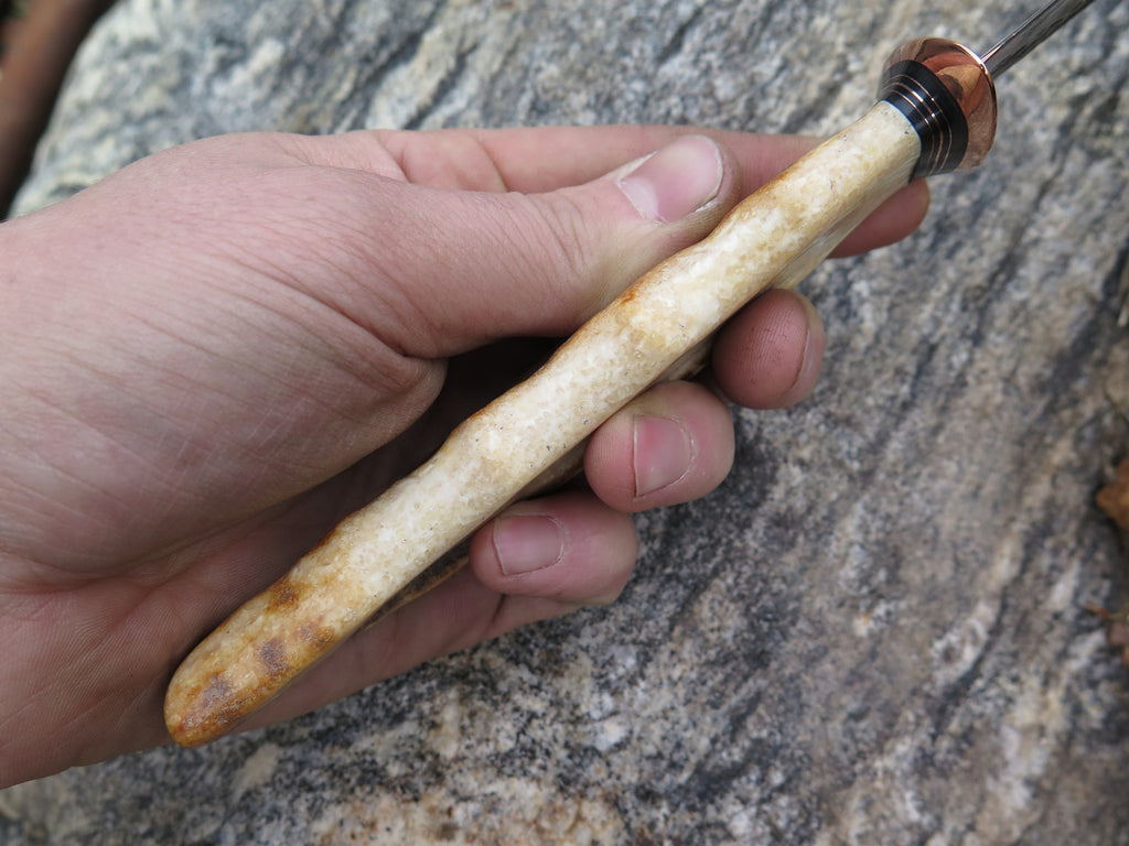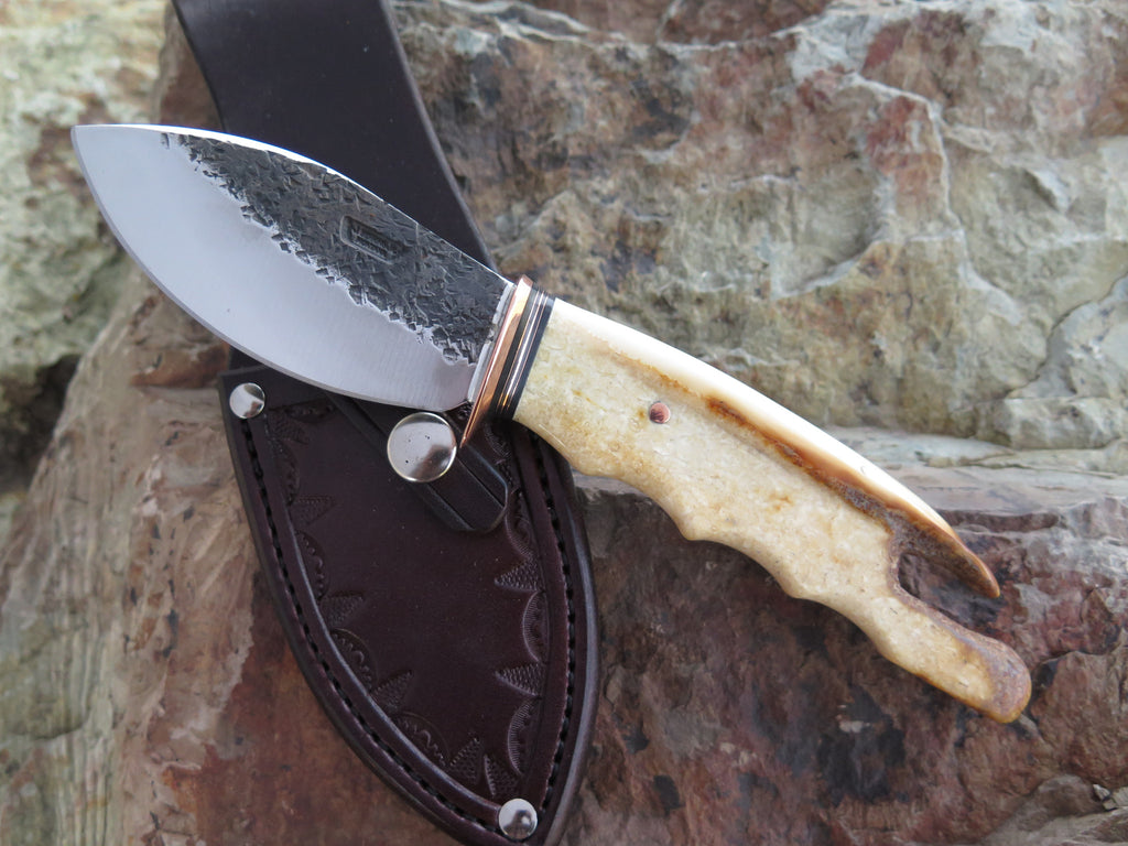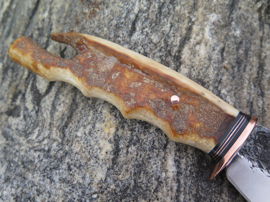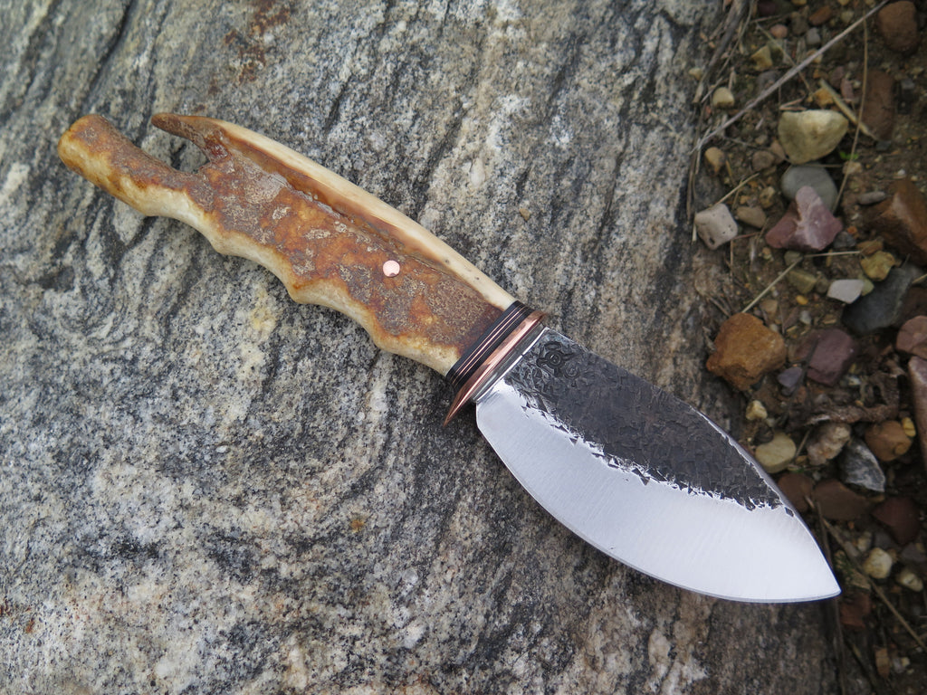 This unbelievable Nessmuk from Behring Made features an artifact walrus ivory sled runner handle with a lot of the initial carving still in place. The blade is hand forged from high carbon 01 tool steel and it measures 3 3/4" from tip to guard with a razor sharp hollow grind and a hammermark finish. The copper guard is soldered in place above black fiber and copper spacers, plus the handle with comfortable finger grips and a copper pin. The overall length measures 9" and it will come in a custom sheath from Warlander Leather. *CONTACT TO ORDER