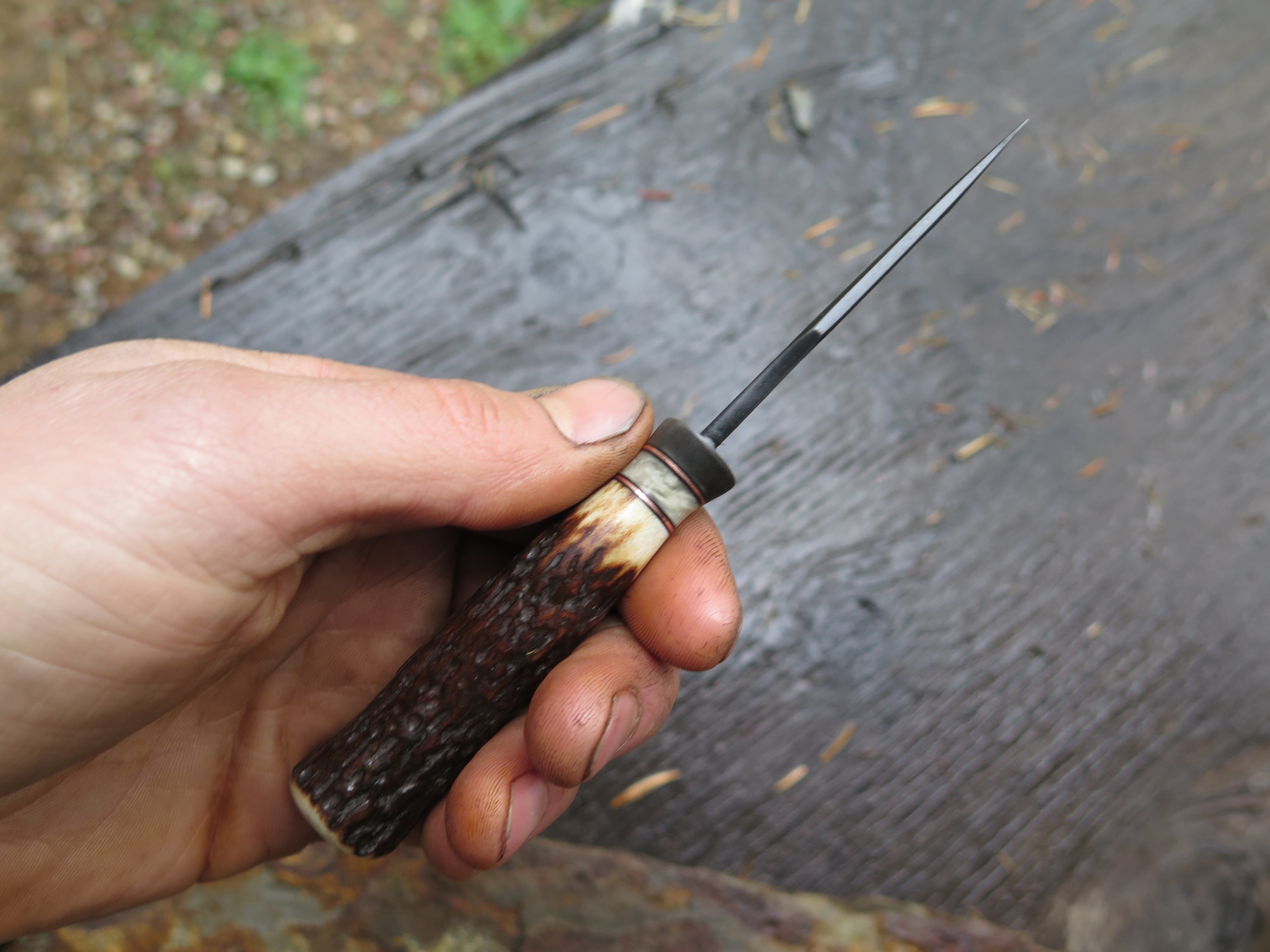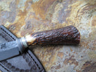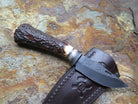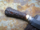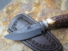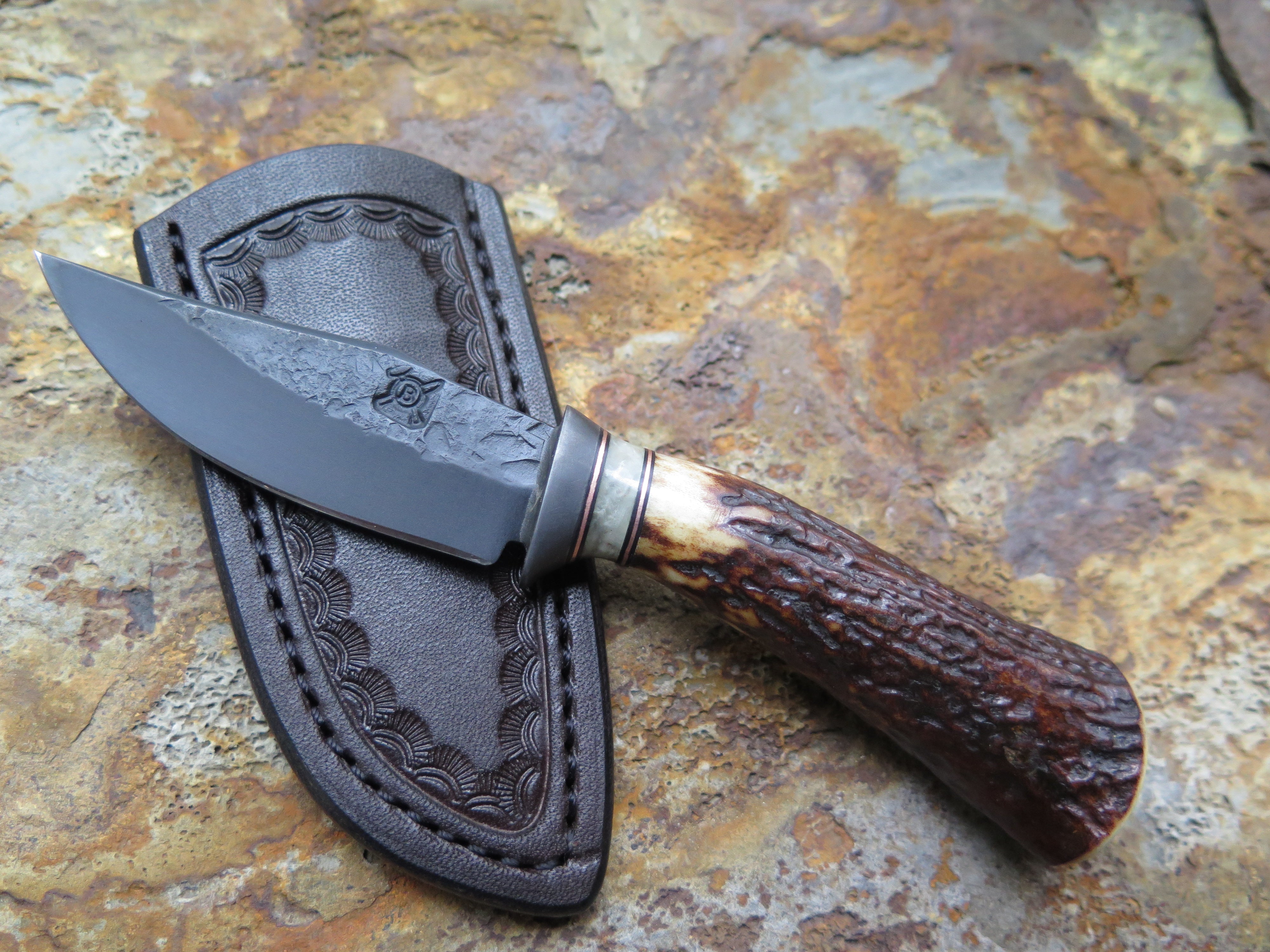 This sleek new 5th Pocket from Behring Made© is hand forged from 1/8" thick high carbon 01 tool steel and it measures 2 3/4" from tip to guard with a razor sharp hollow grind, hammermarks and our forced patina blued finish. The blued steel guard is soldered in place above black fiber, copper and musk ox boss spacers. The axis stag handle flexes a beautiful texture and natural coloration, and overall it measures 5 7/8". The leather sleeve makes it a convenient carry in any pocket, too!