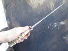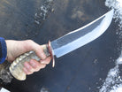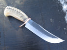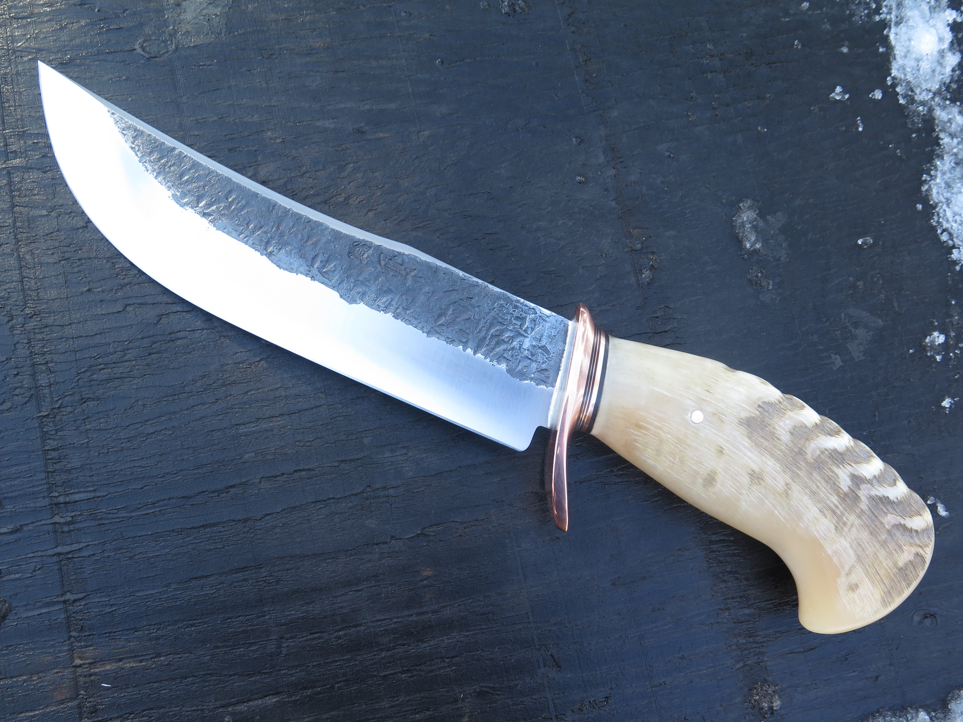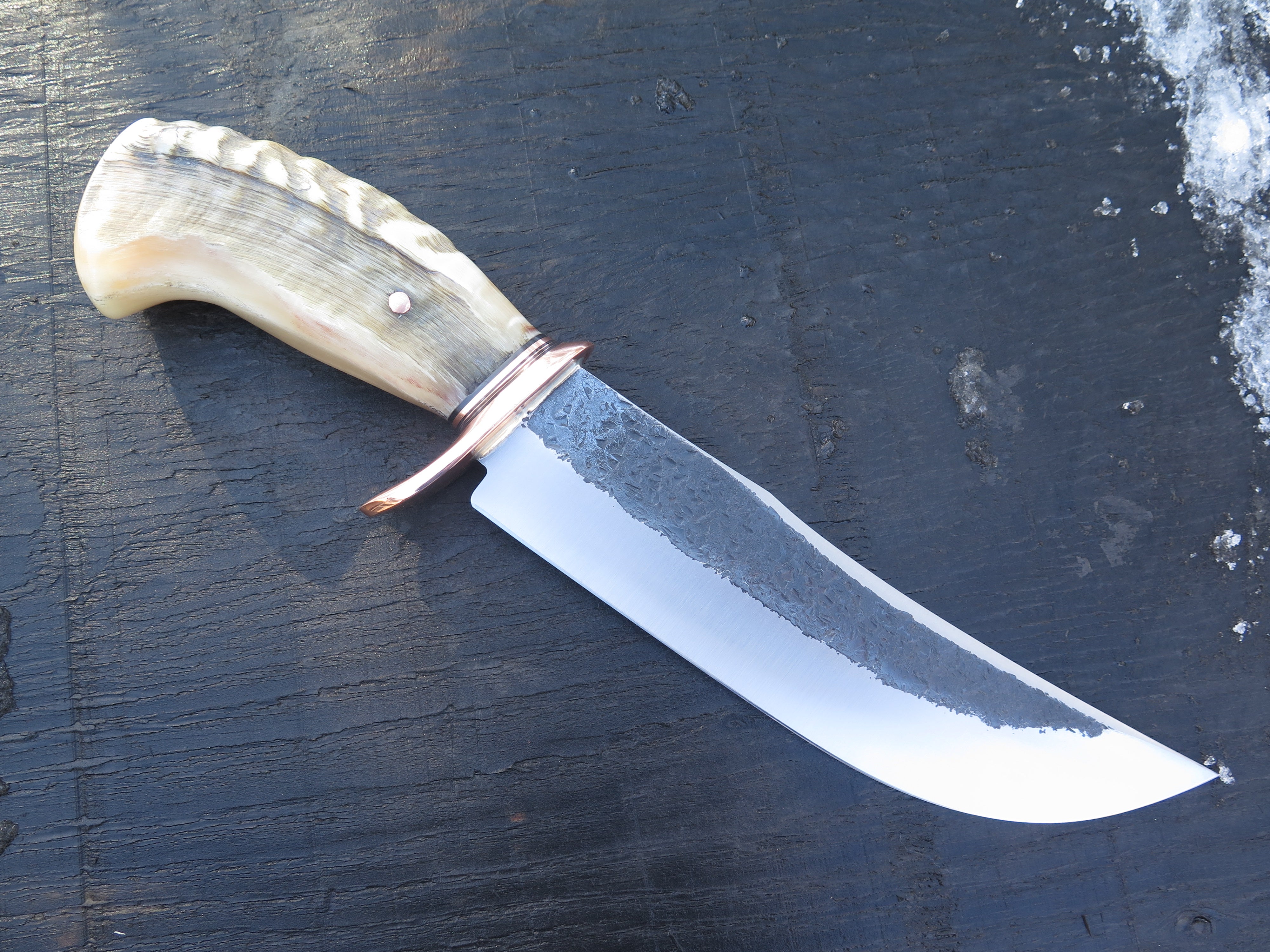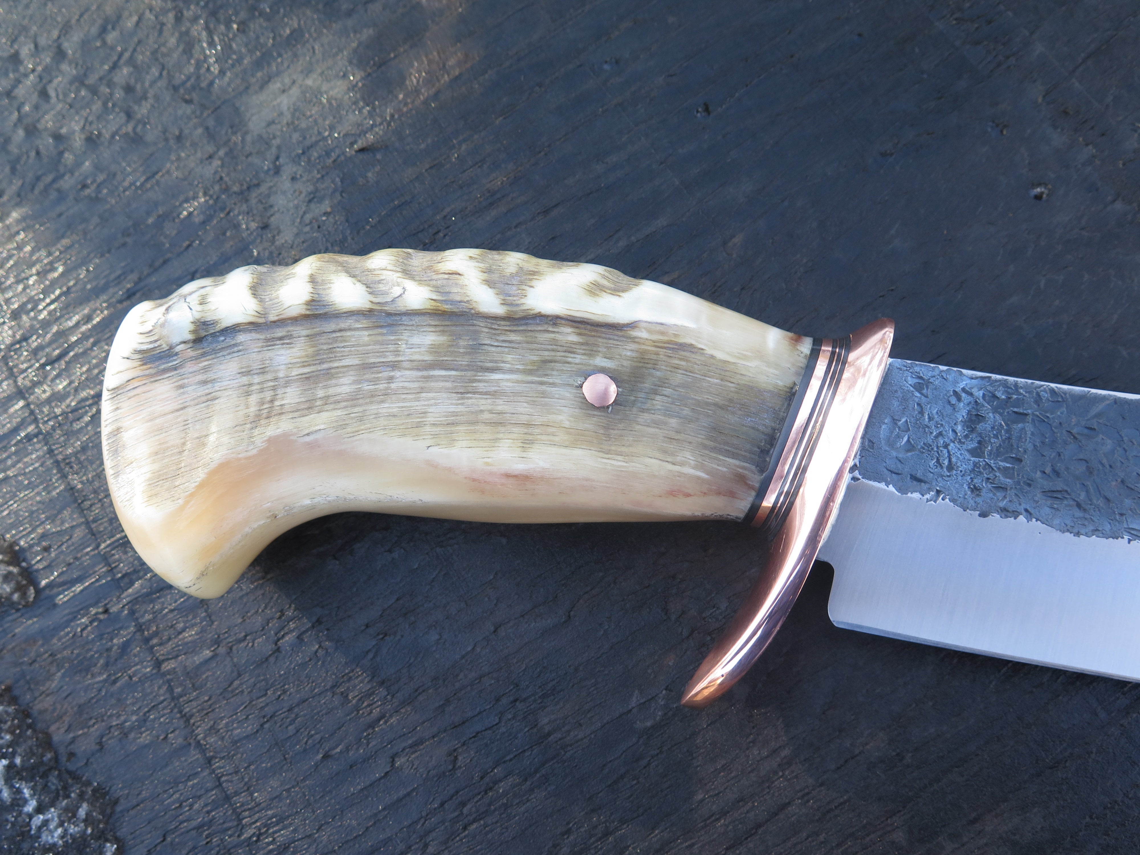 This beastly new Camp Knife from Behring Made© is hand forged from 1/4" thick high carbon 01 tool steel and it measures 9" from tip to guard with a razor sharp hollow grind and our hammermark finish. The forged copper half-s guard is soldered in place above black fiber and copper spacers atop an outstanding handle made from a Dall sheep horn curl with that lovable texture on both sides- plus we pinned it through the tang with copper for a durable construction we guarantee for life. A knife this big needs custom leather, so it's off to Warlander and will be tooled to compliment the handle.