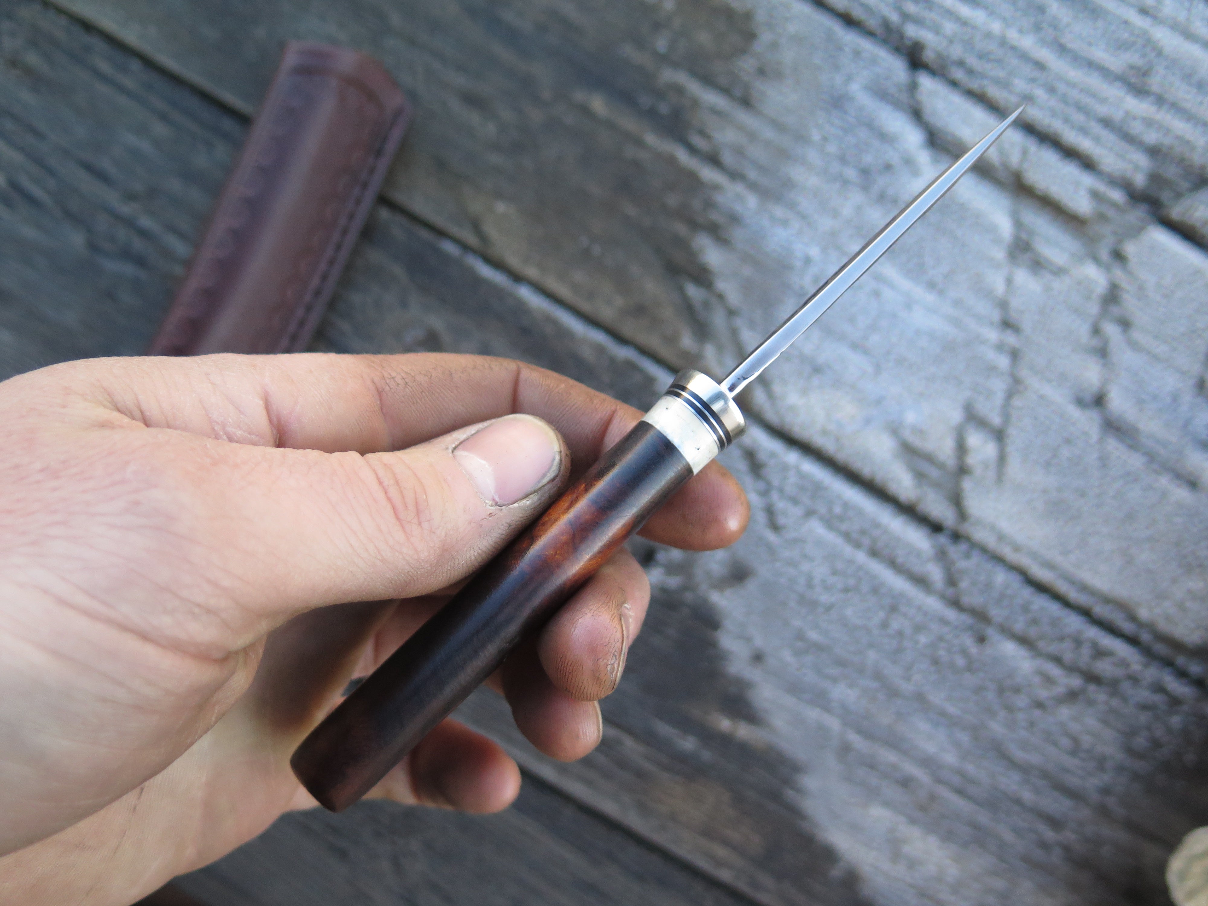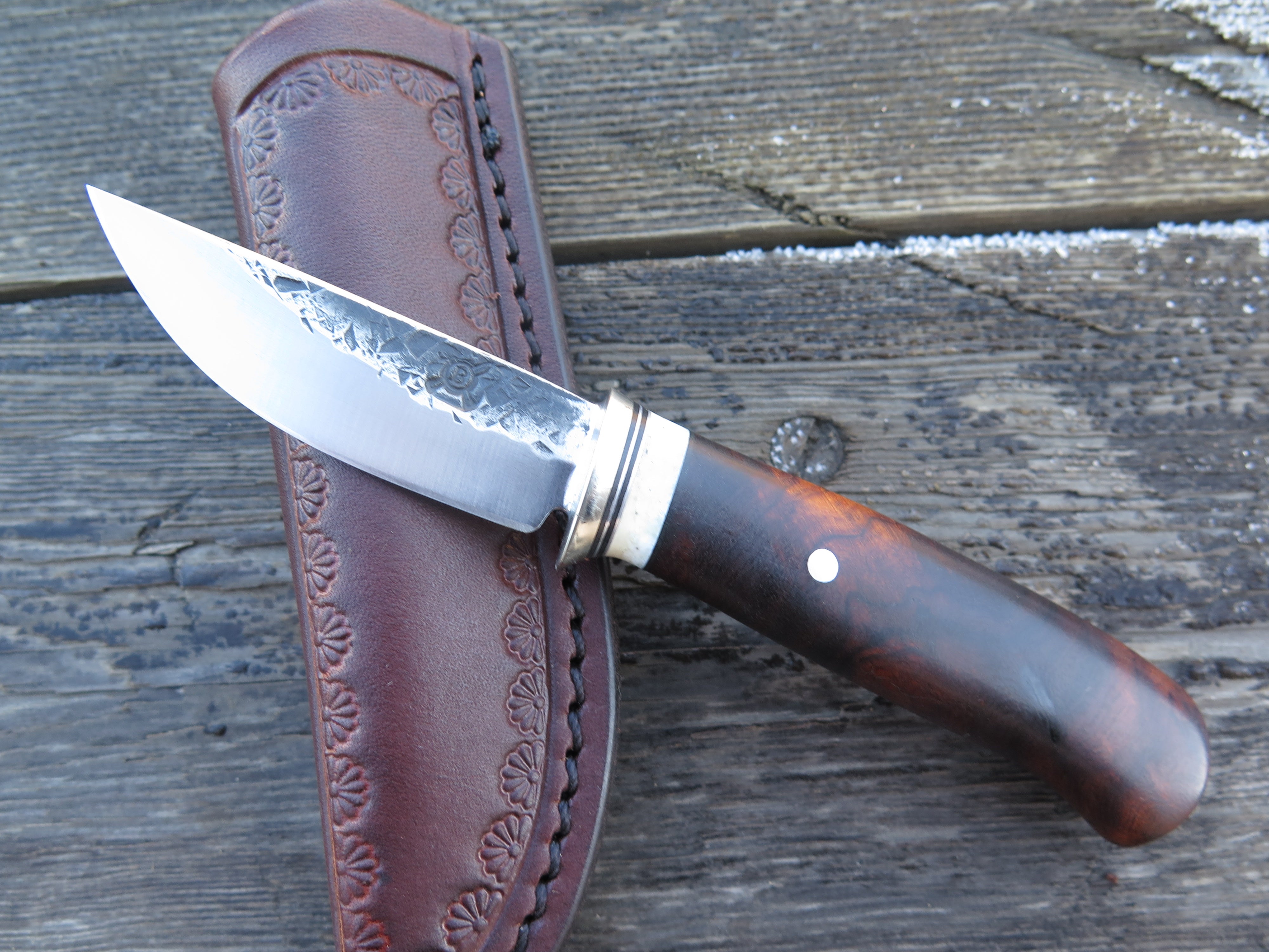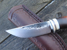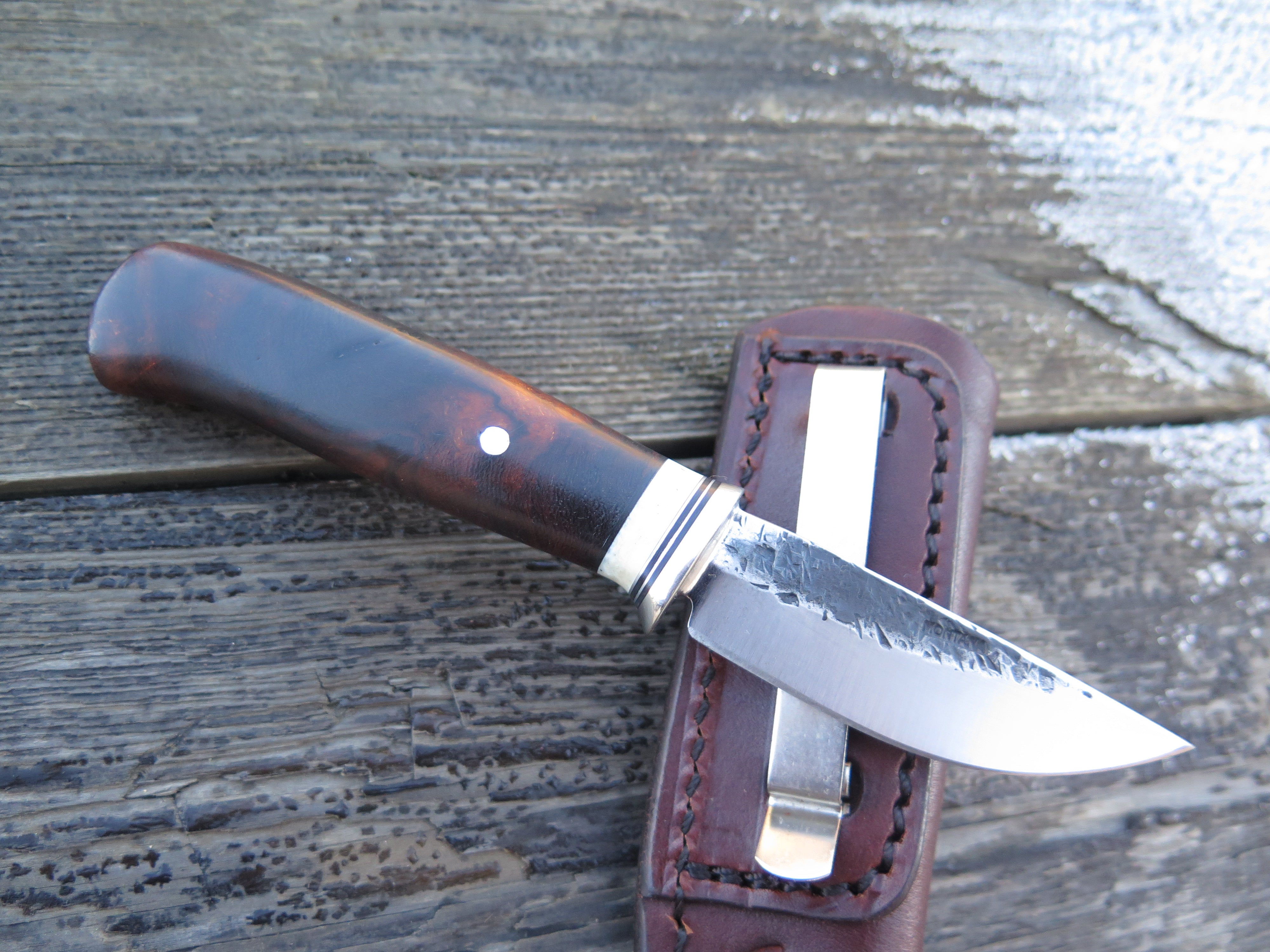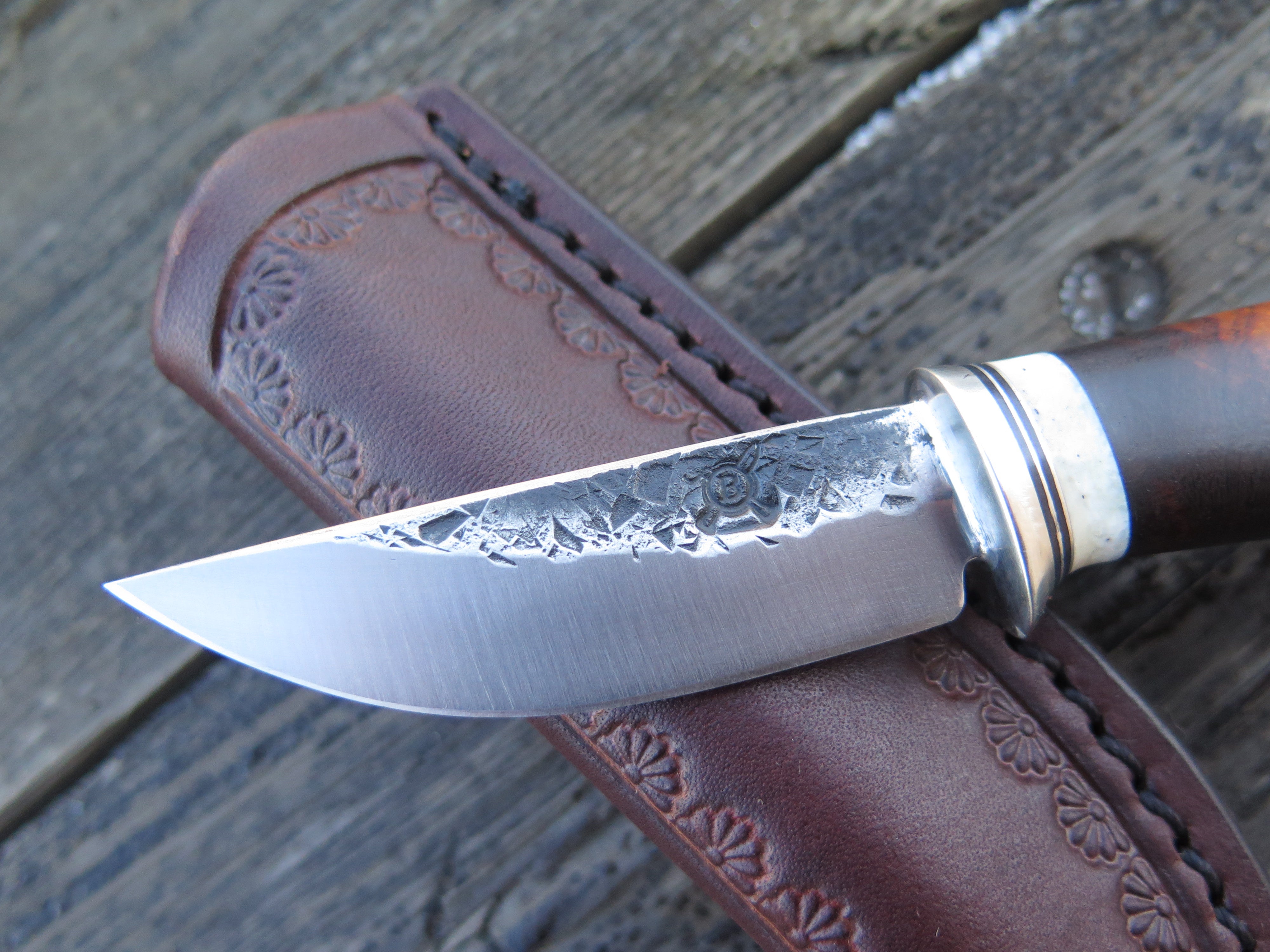 This incredible new Pocket Knife from Behring Made© is hand forged from 1/8" thick high carbon 01 tool steel and it measures 2 1/2" from tip to guard with a razor sharp hollow grind and our hammermark finish. The nickel silver guard is soldered in place above black fiber, aluminum and premium fossil walrus ivory that is a wonderful contrast to the desert ironwood burl handle. The overall length measures 6 1/4" and it comes in the shown Warlander Leather pocket sheath.