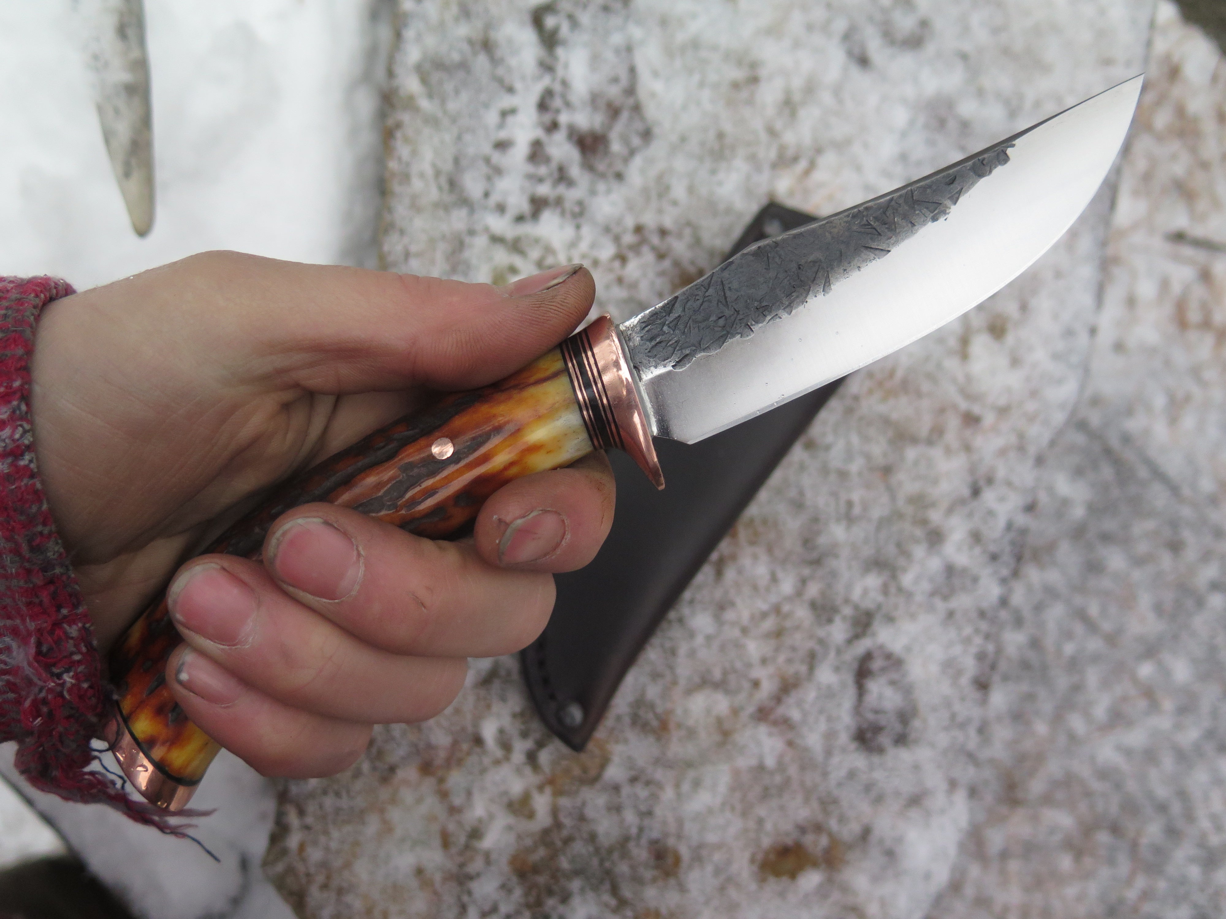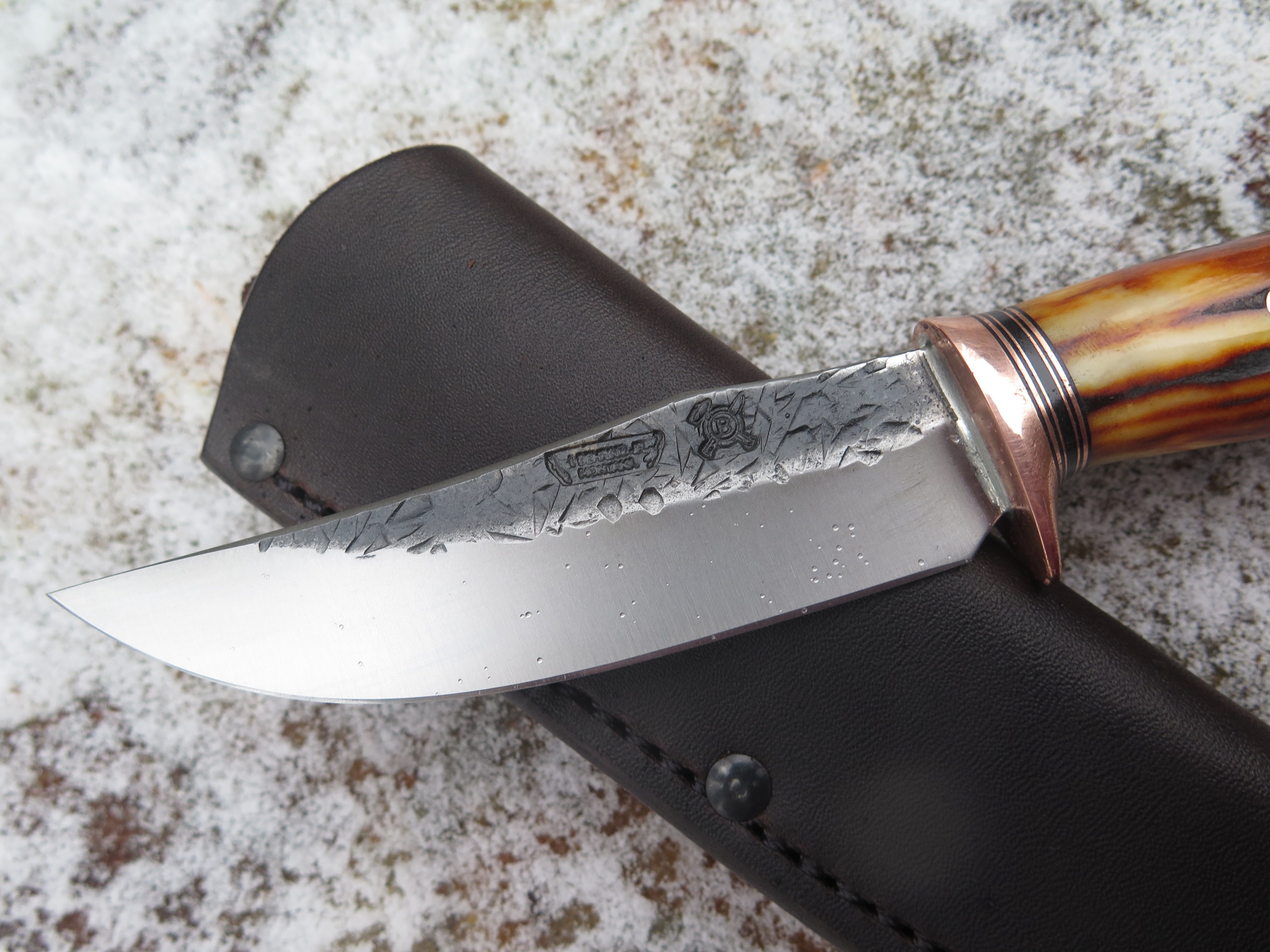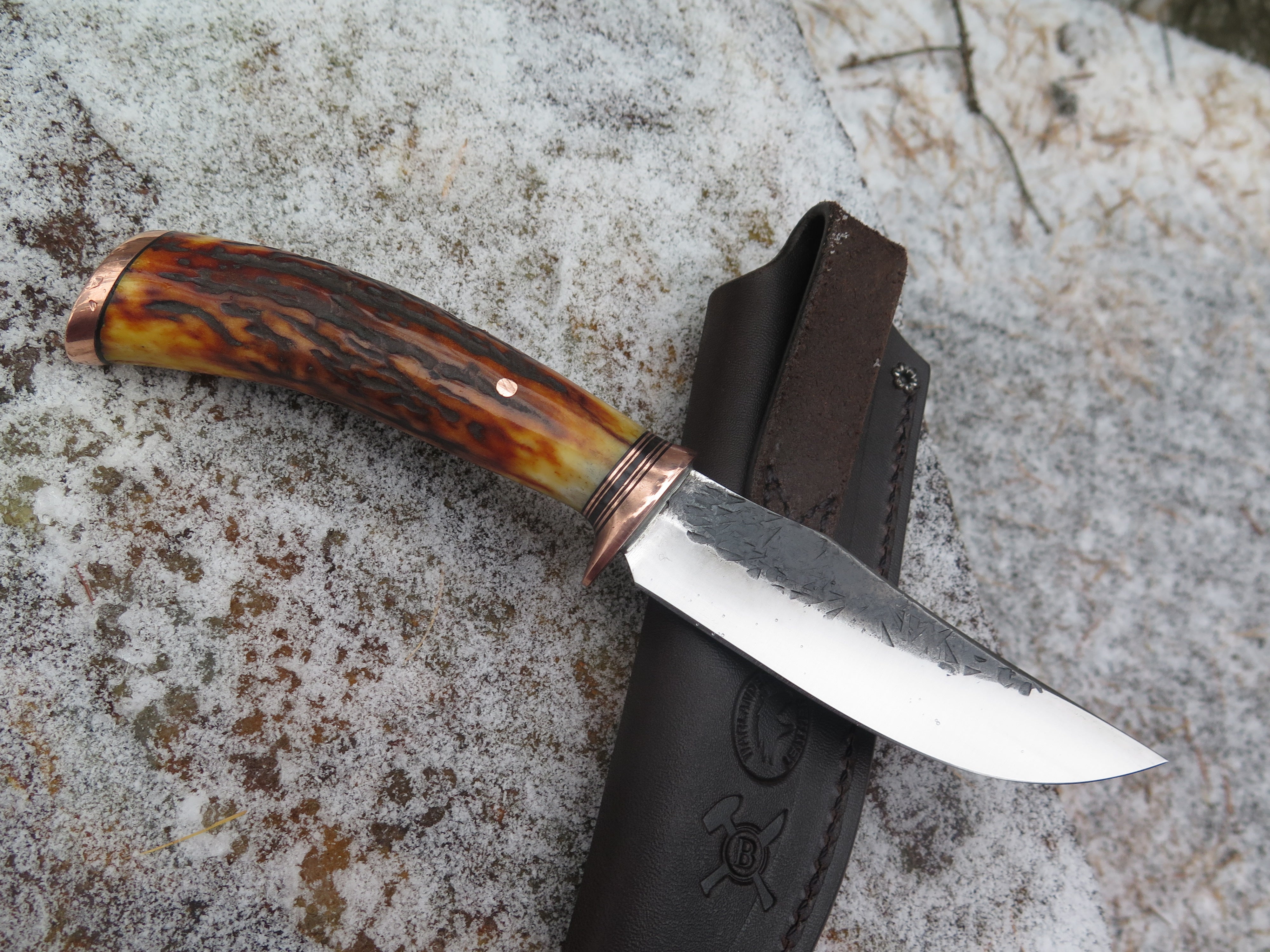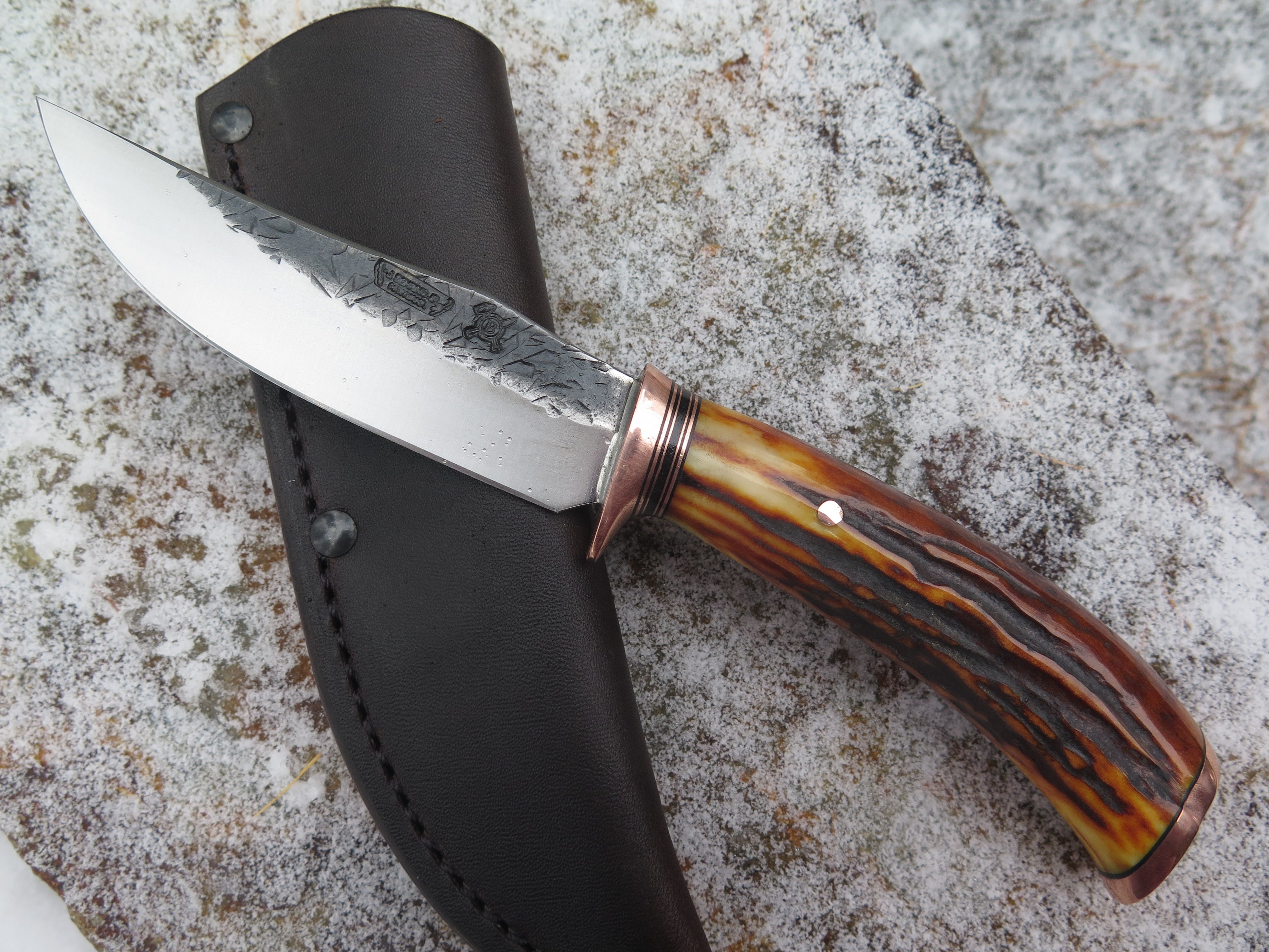 This beautiful Behring Made© Clip Point is hand forged from 1/8" thick high carbon 01 tool steel and it measures 4 1/2" from tip to guard with a razor sharp hollow grind and our hammermark finish. The copper guard is soldered in place above black fiber and copper spacers as well as a premium sambar stag handle that's both pinned and capped with copper too. Overall length measures 8 3/4" and this one comes in a classic leather belt pouch sheath.