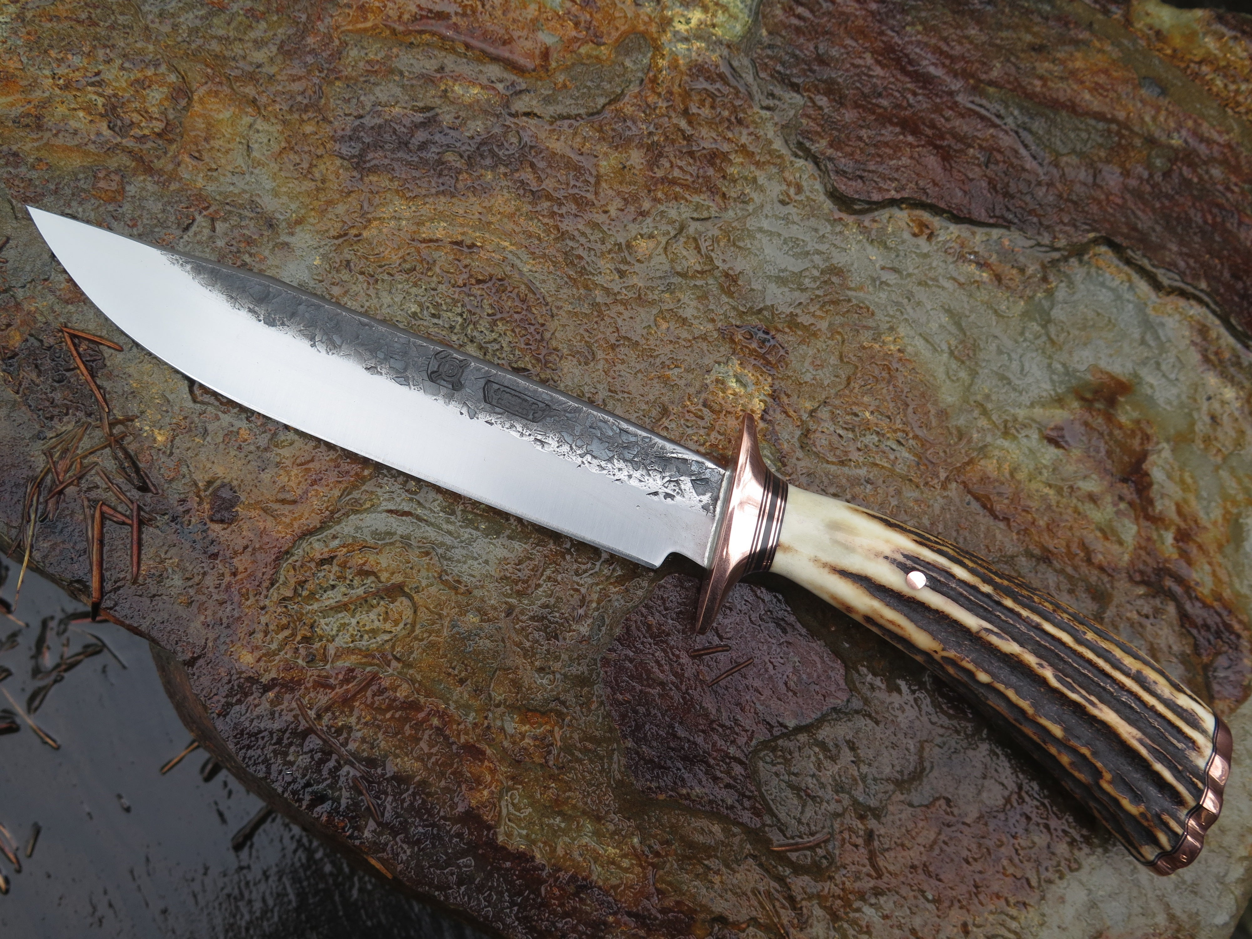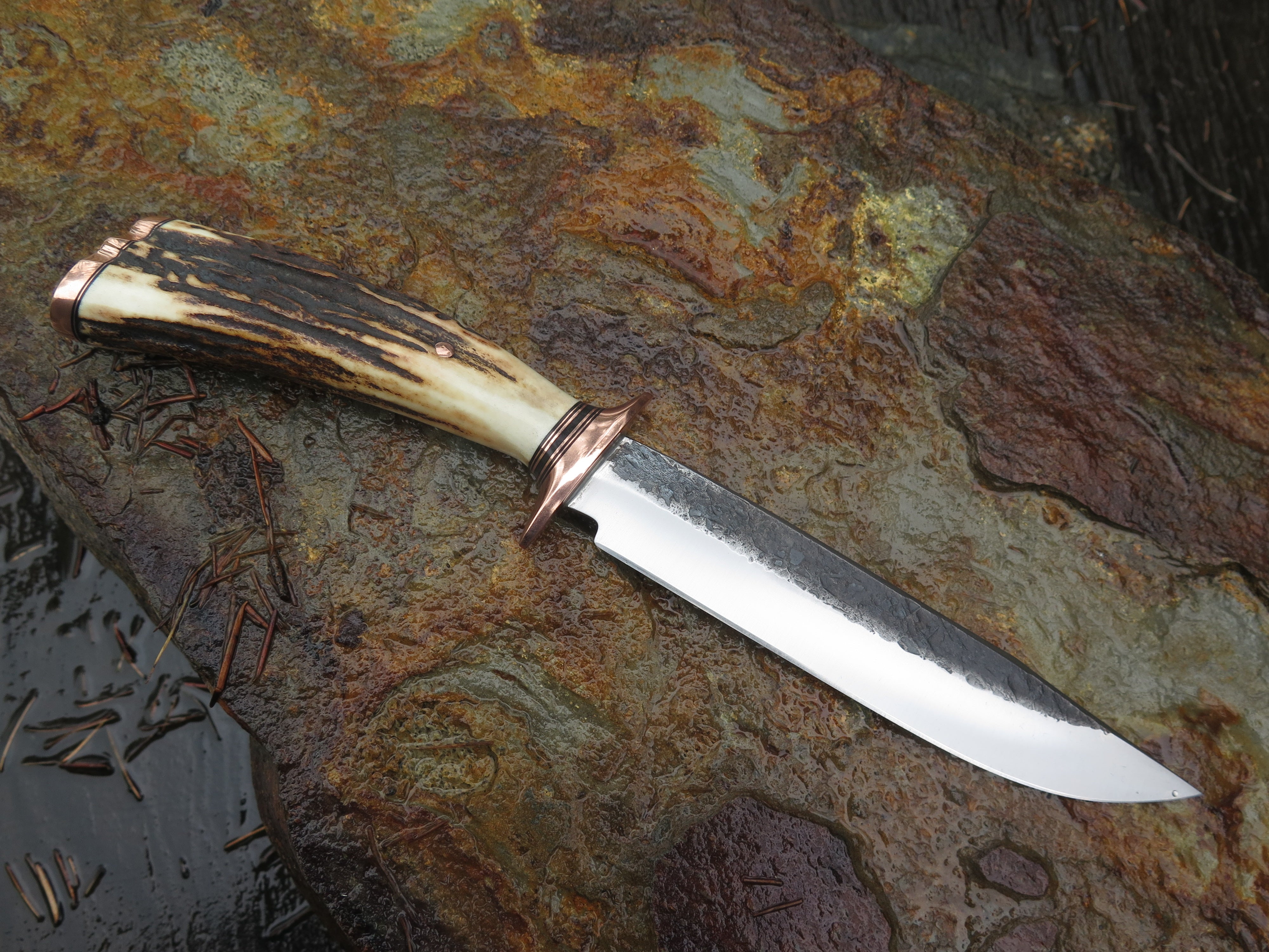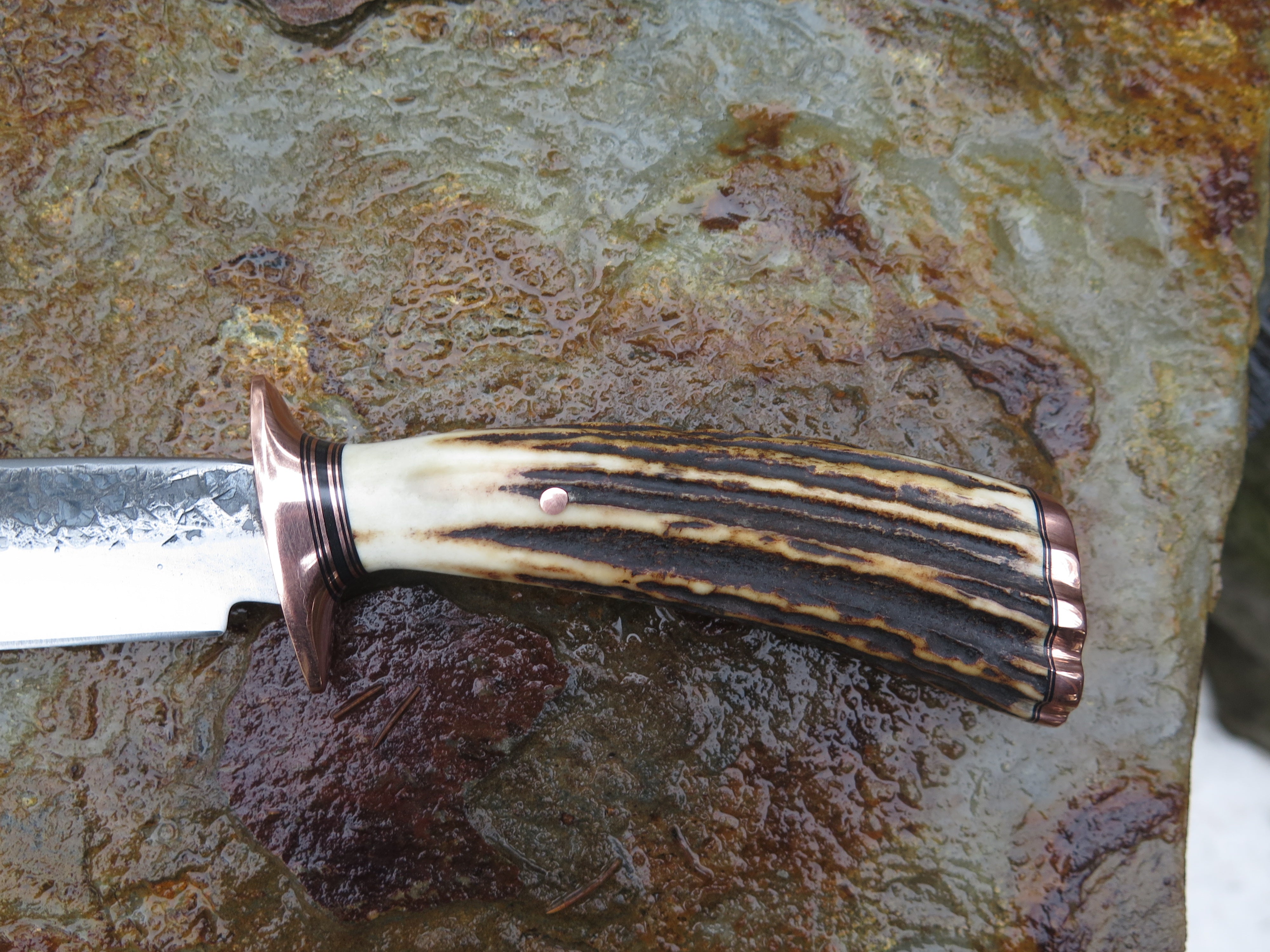 This beautiful new Behring Made© Field Knife is hand forged from 3/16" thick high carbon 01 tool steel and it measures 6 1/4" from tip to guard with a razor sharp hollow grind and our hammermark finish. The copper guard is soldered in place above black fiber and copper spacers with a premium sambar stag handle that's both pinned and capped with copper. The overall length measures 10 3/4" and it will come in a custom sheath.