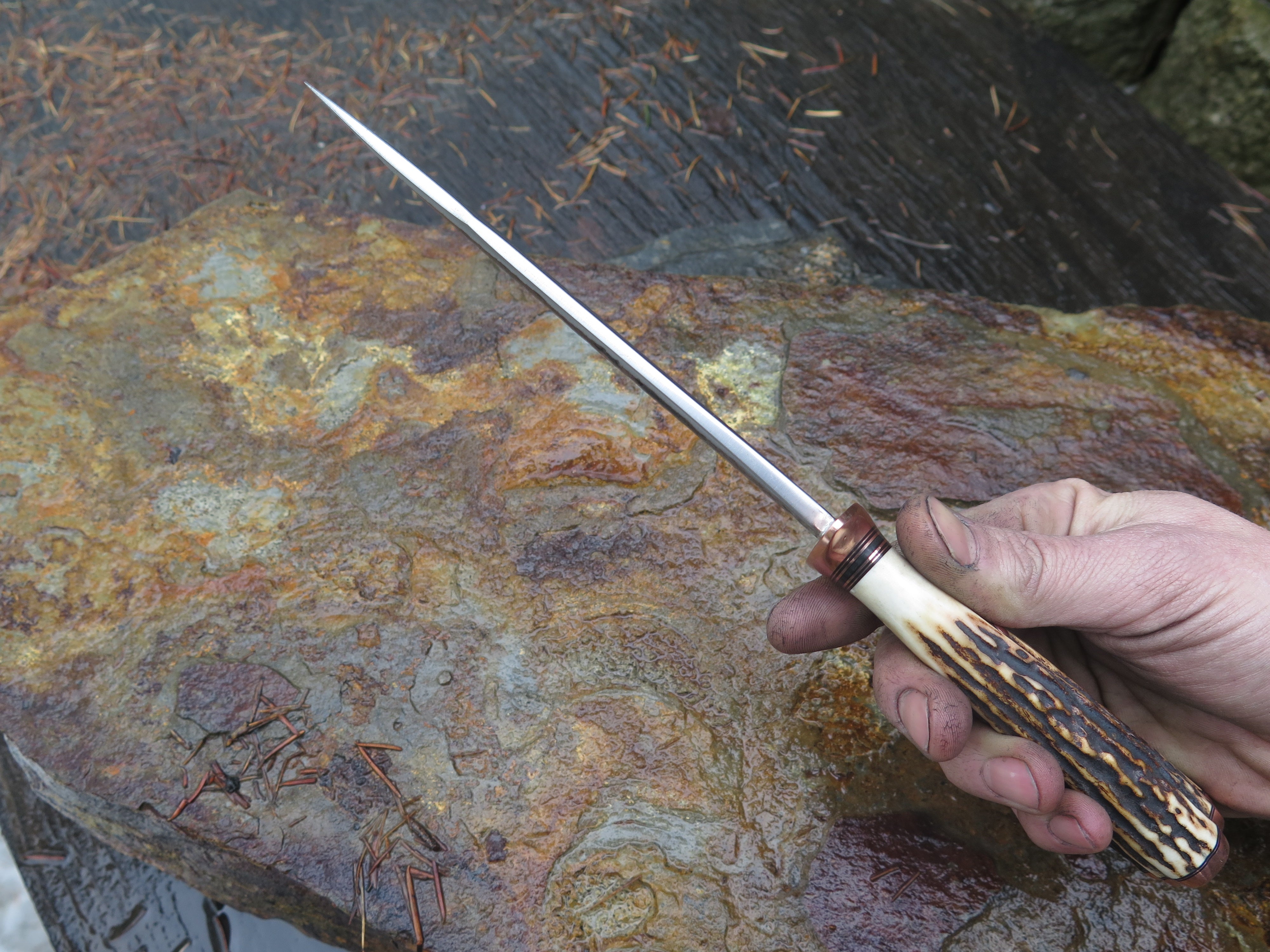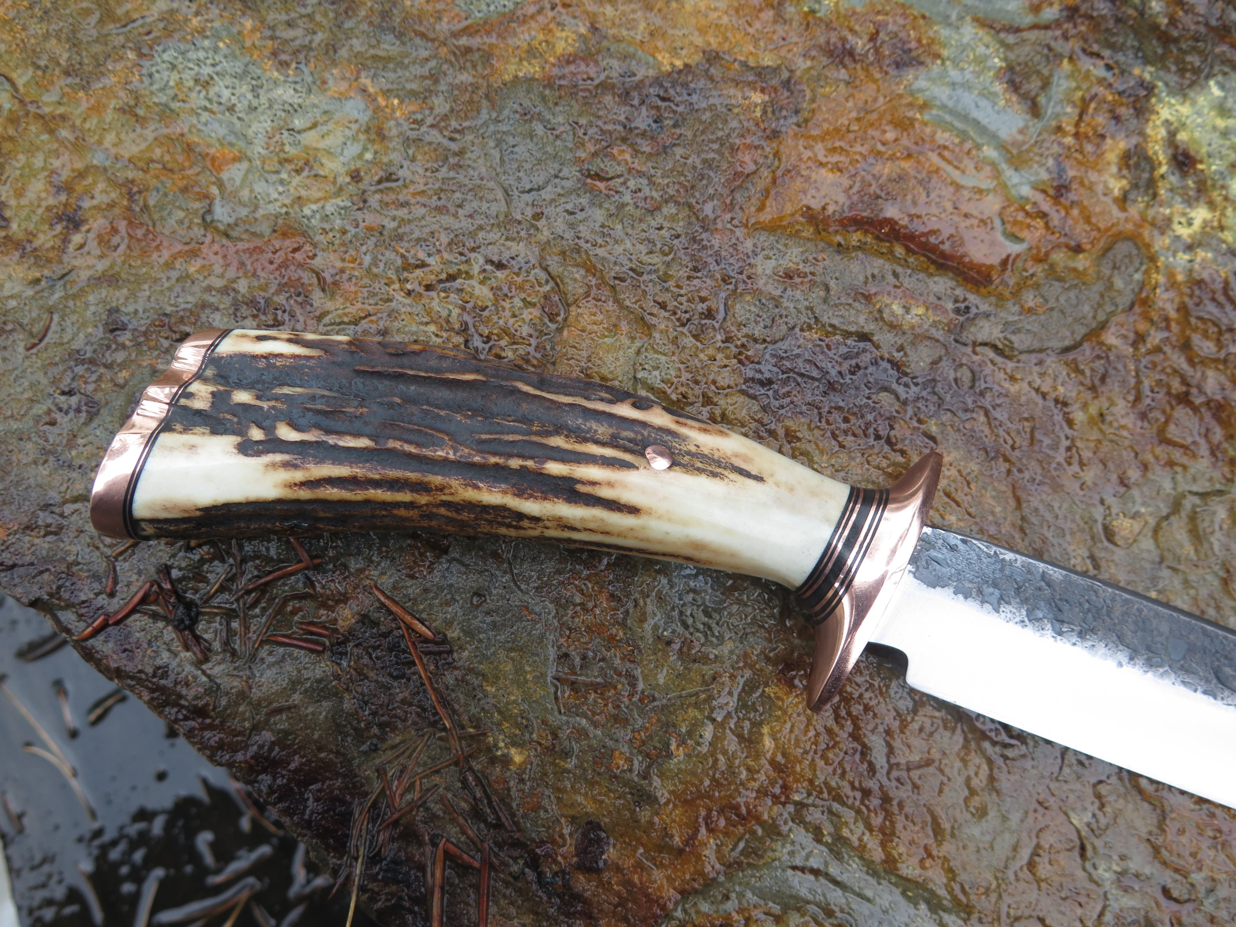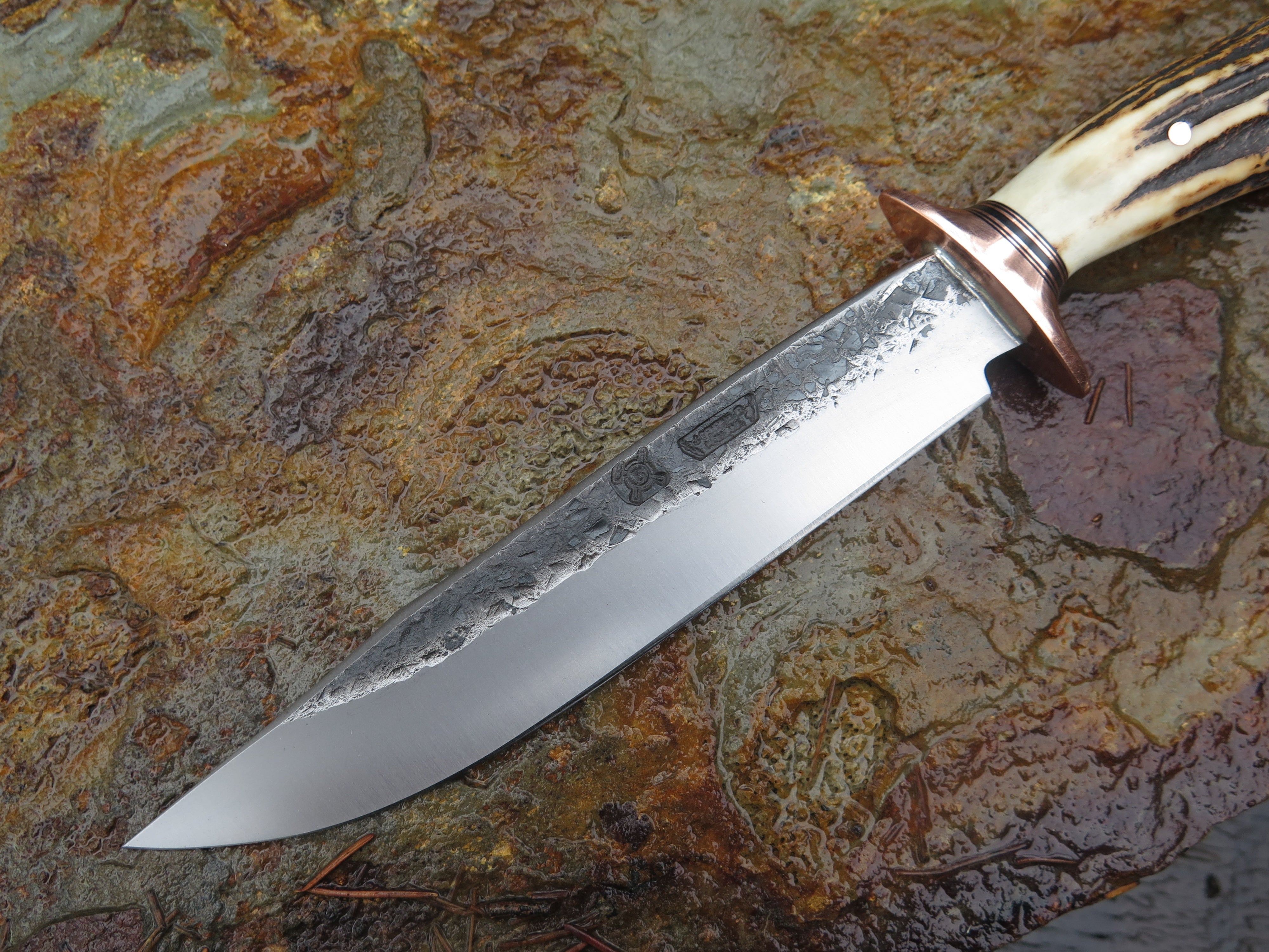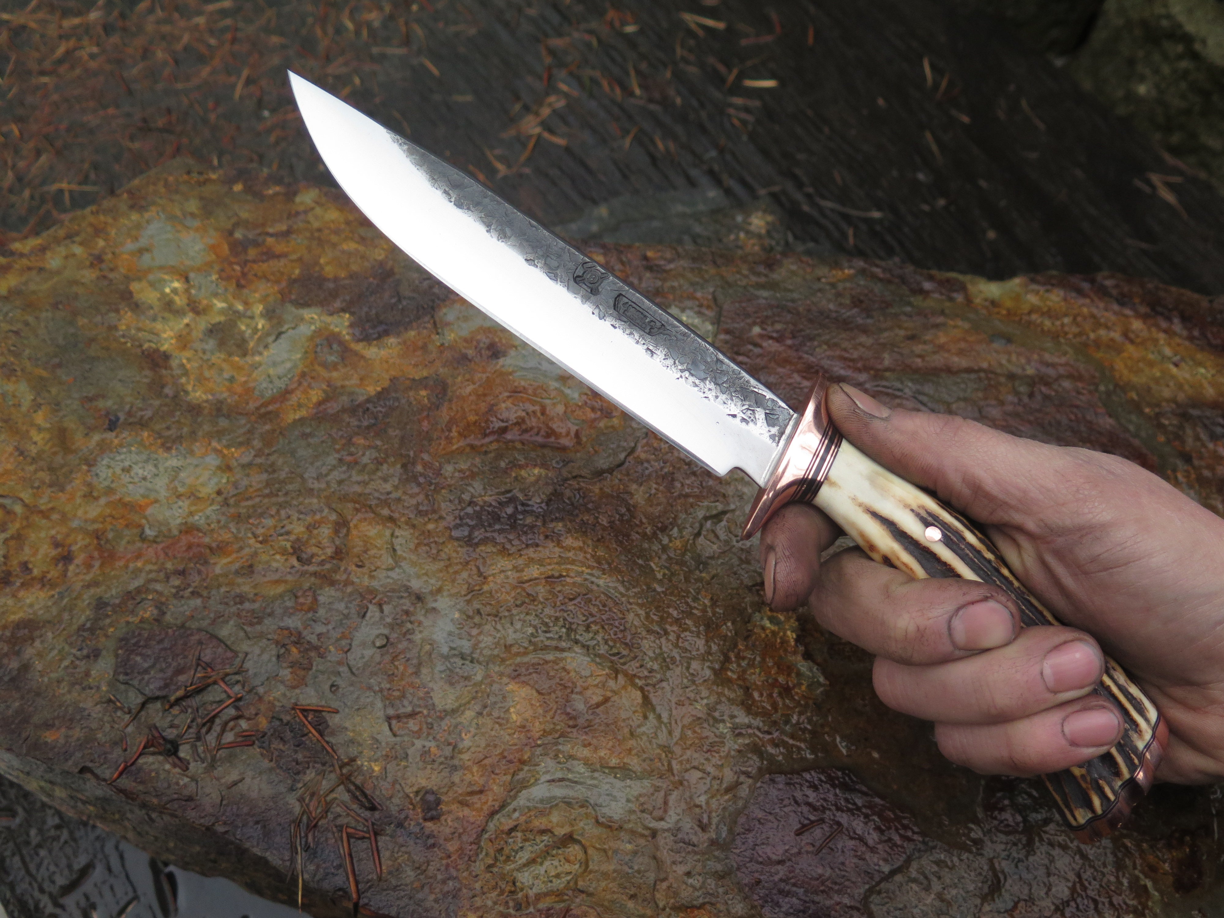 This beautiful new Behring Made© Field Knife is hand forged from 3/16" thick high carbon 01 tool steel and it measures 6 1/4" from tip to guard with a razor sharp hollow grind and our hammermark finish. The copper guard is soldered in place above black fiber and copper spacers with a premium sambar stag handle that's both pinned and capped with copper. The overall length measures 10 3/4" and it will come in a custom sheath.