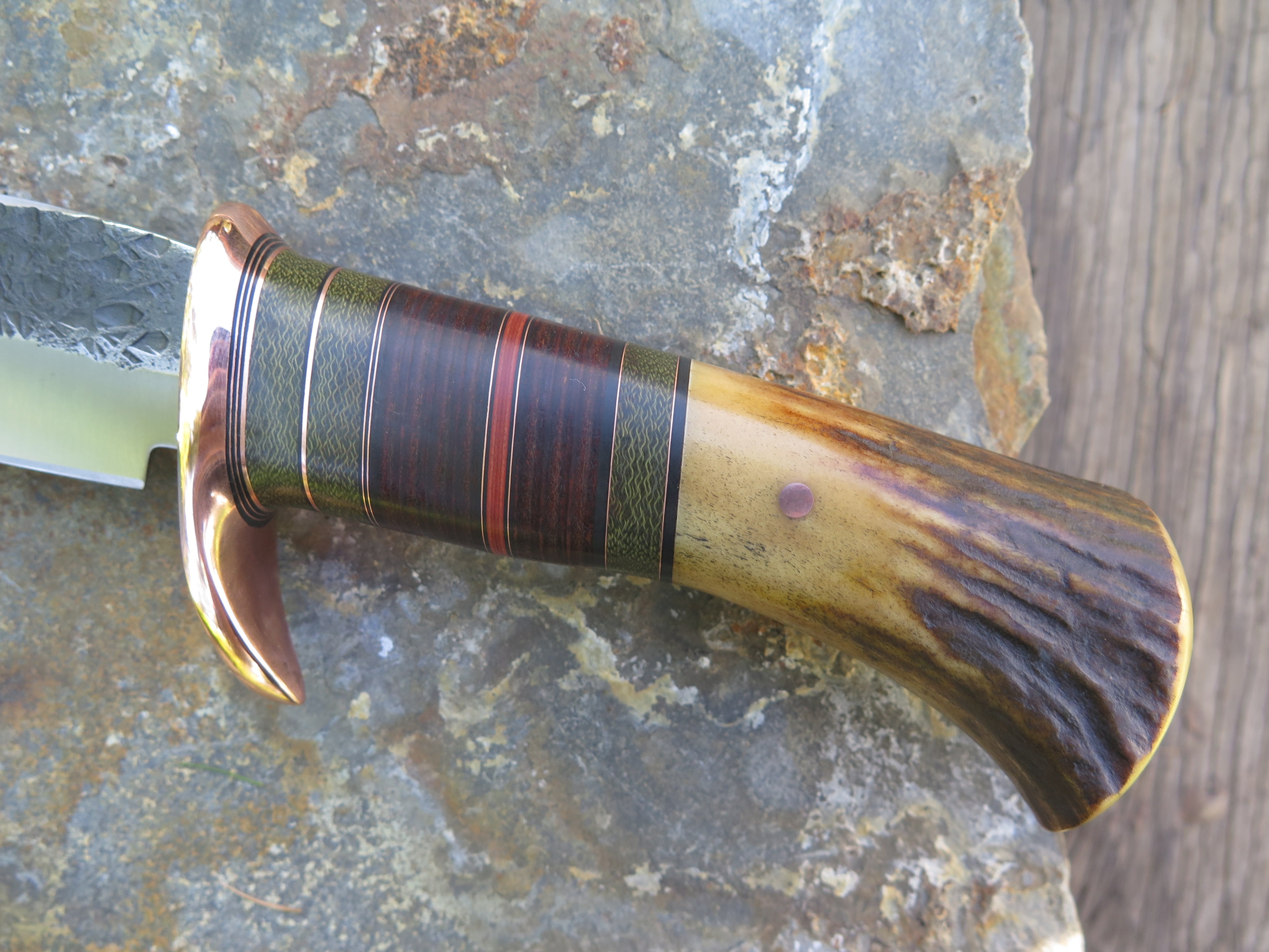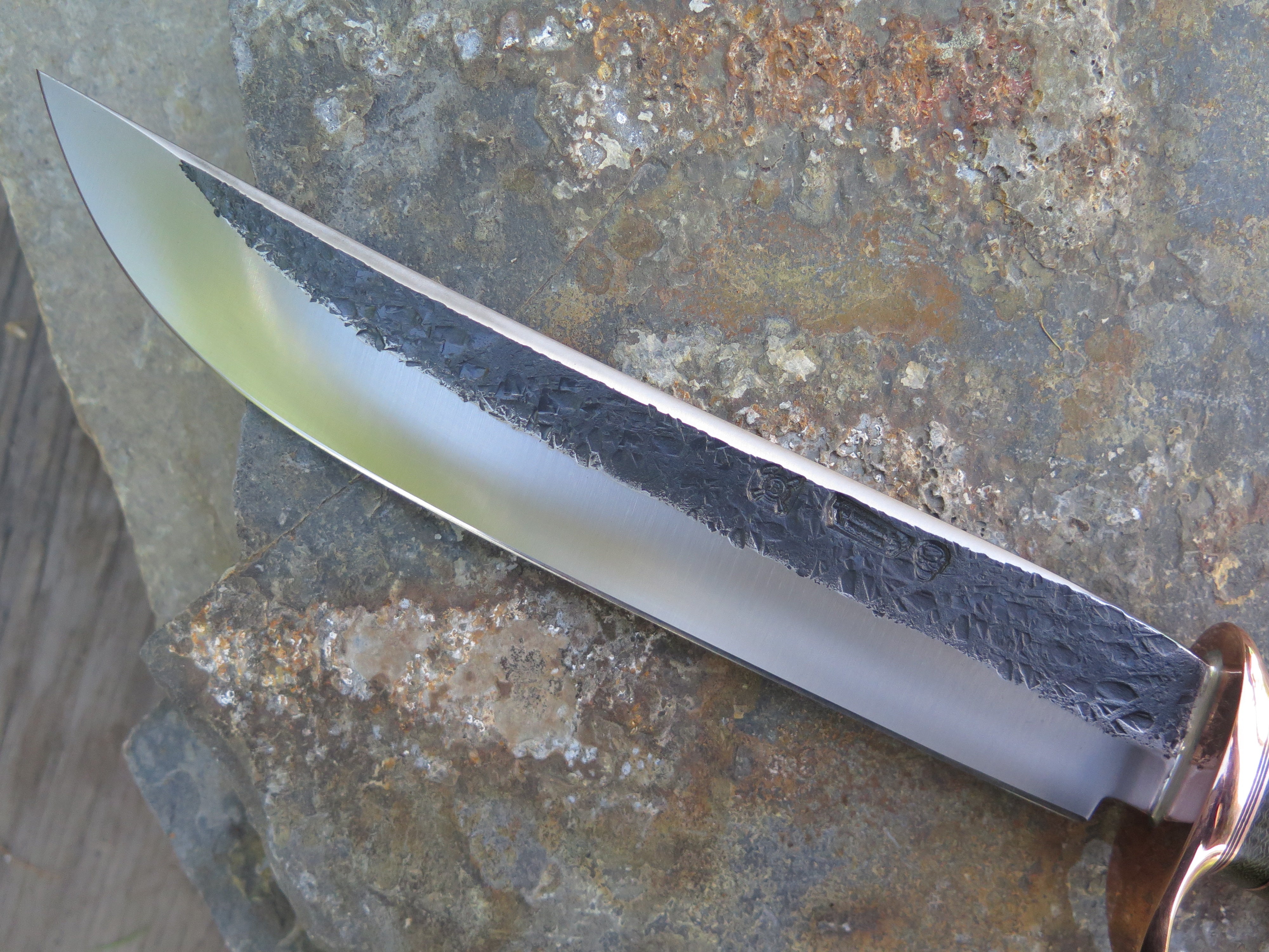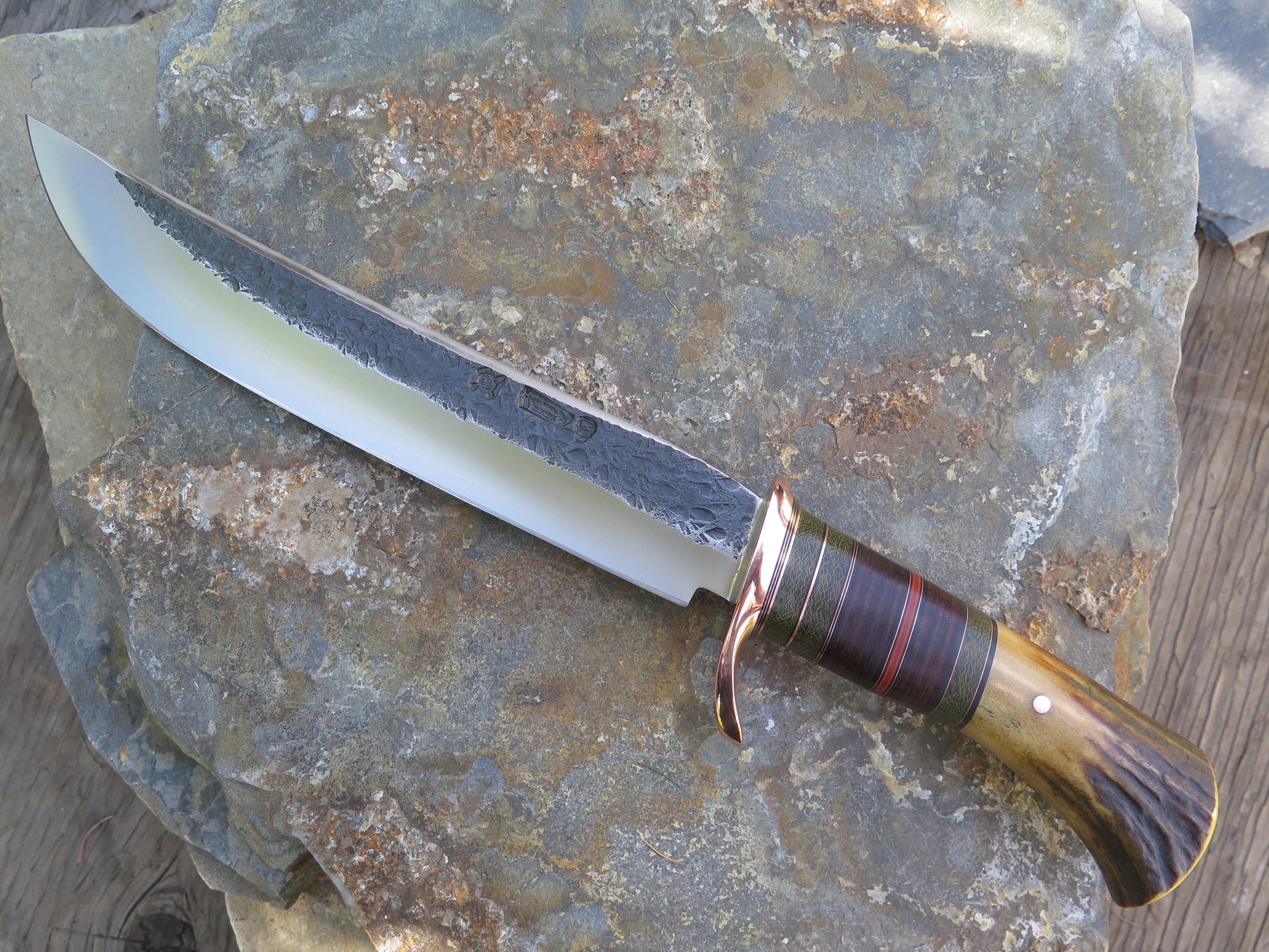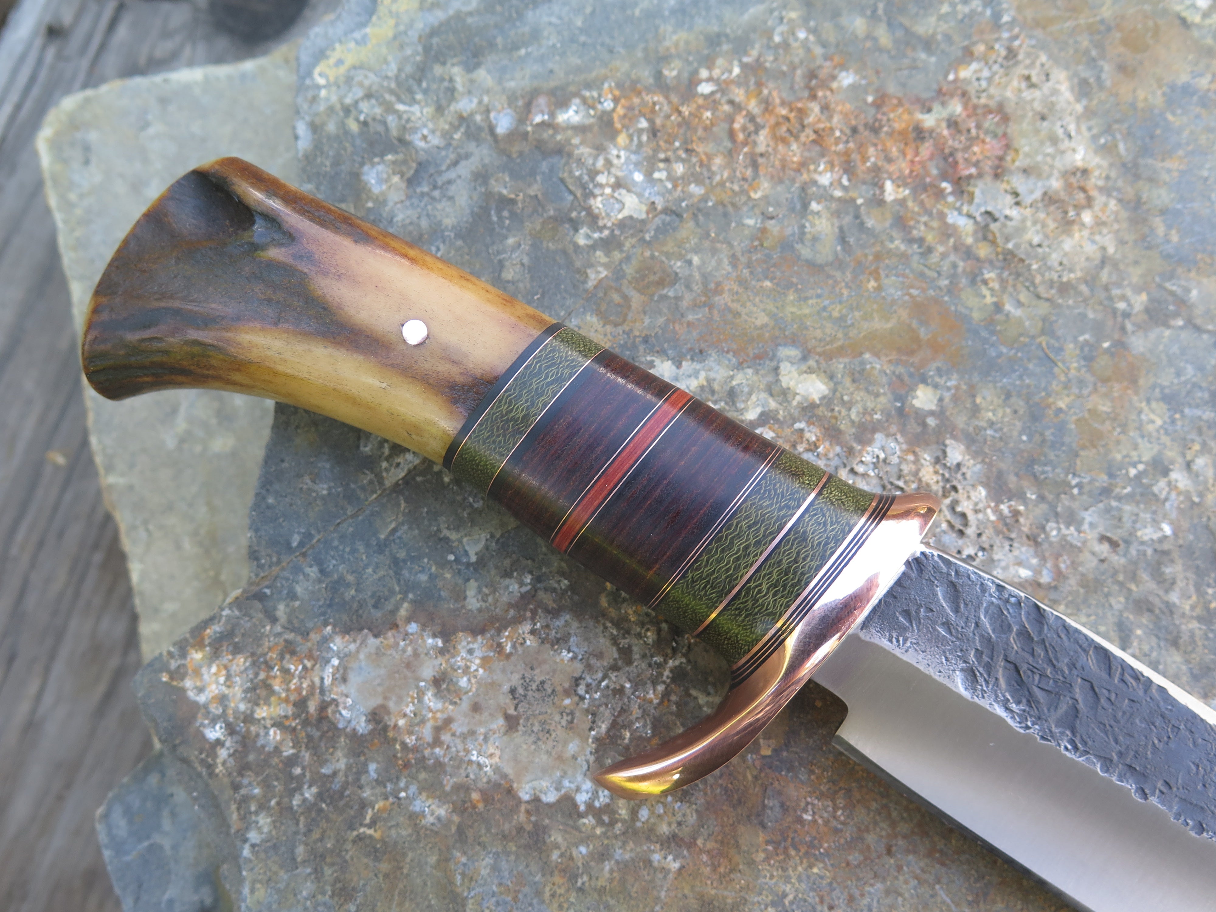 This beastly new Field Knife from Behring Made© is hand forged from 13/64" thick 5160 spring steel and it measures 9" from tip to guard with a razor sharp hollow grind and our hammemark finish. The forged copper half-S guard is soldered in place above black and maroon fiber, green micarta, copper and horsehide leather spacers as well as a premium sambar stag butt that's pinned through the tang with copper. The overall length measures 14" and it will come in a custom sheath from Rowe's Leather.