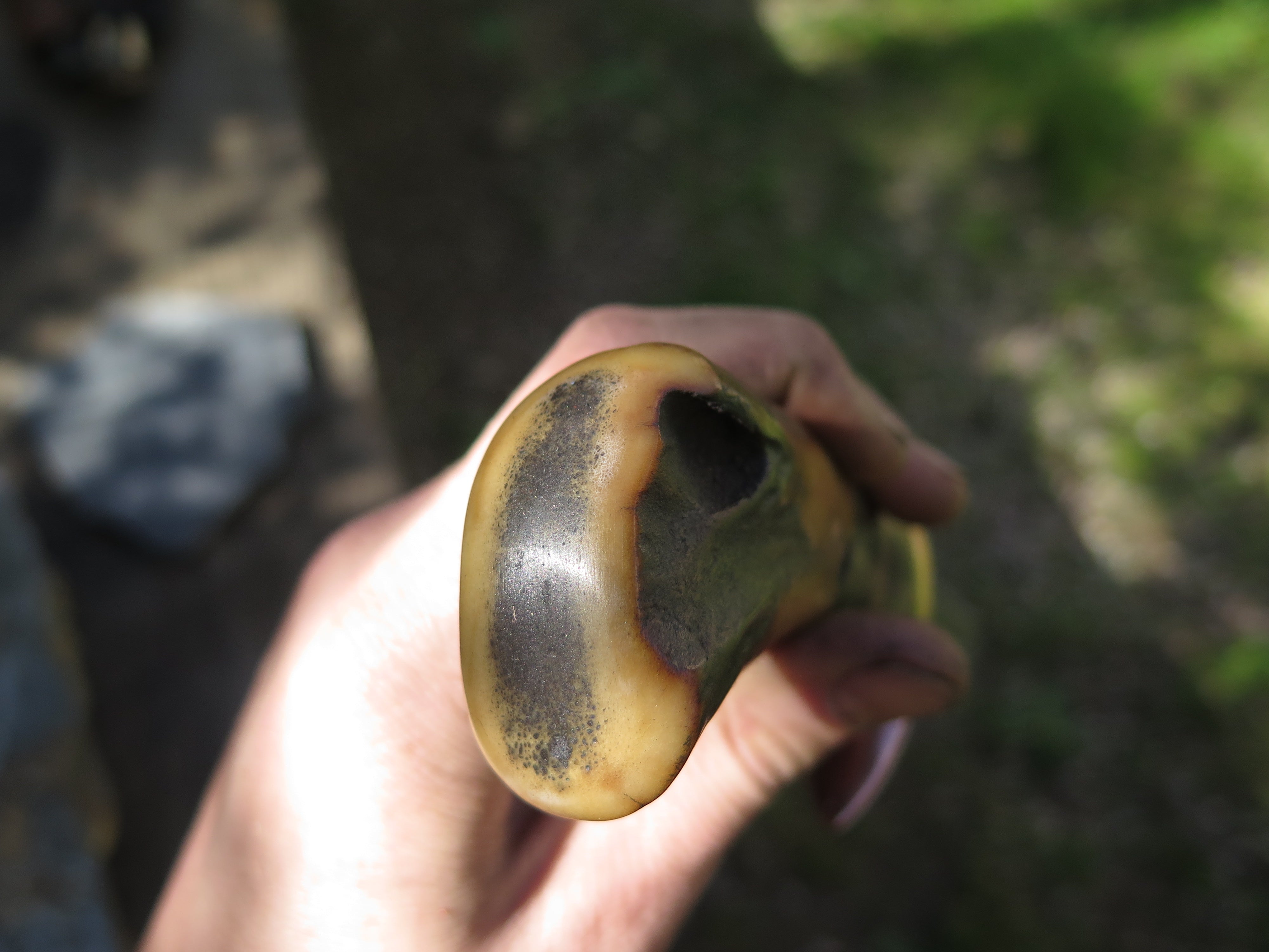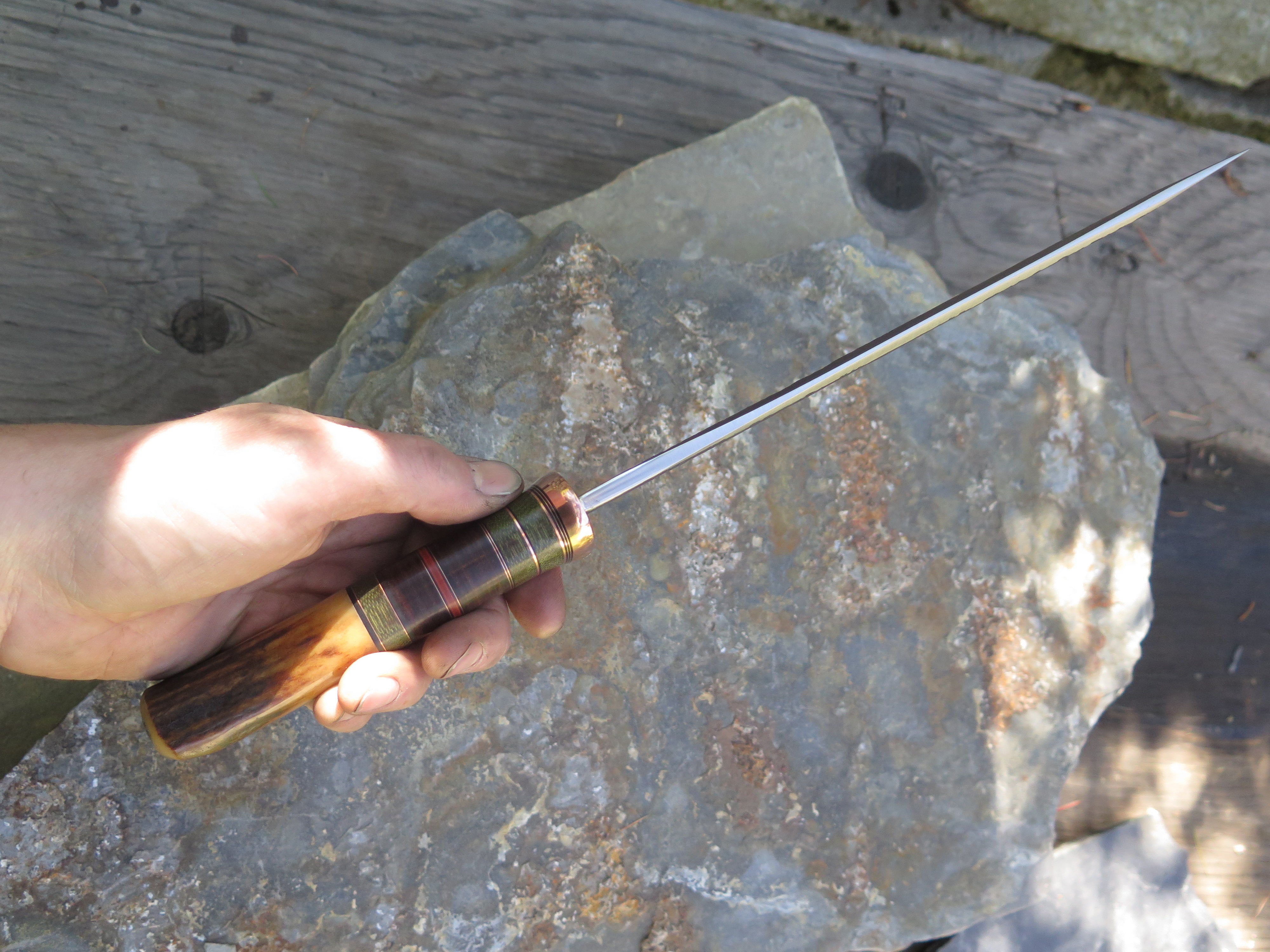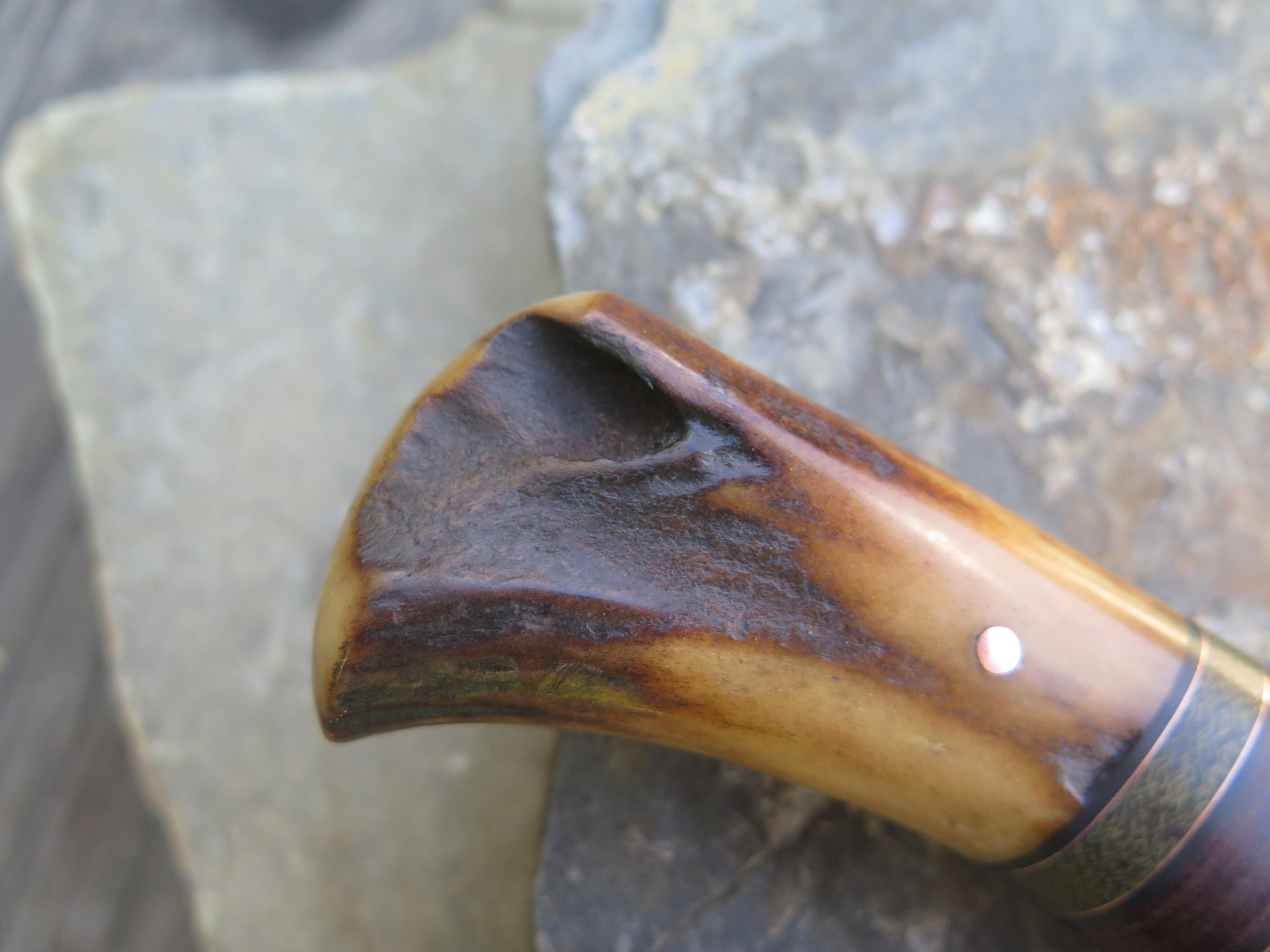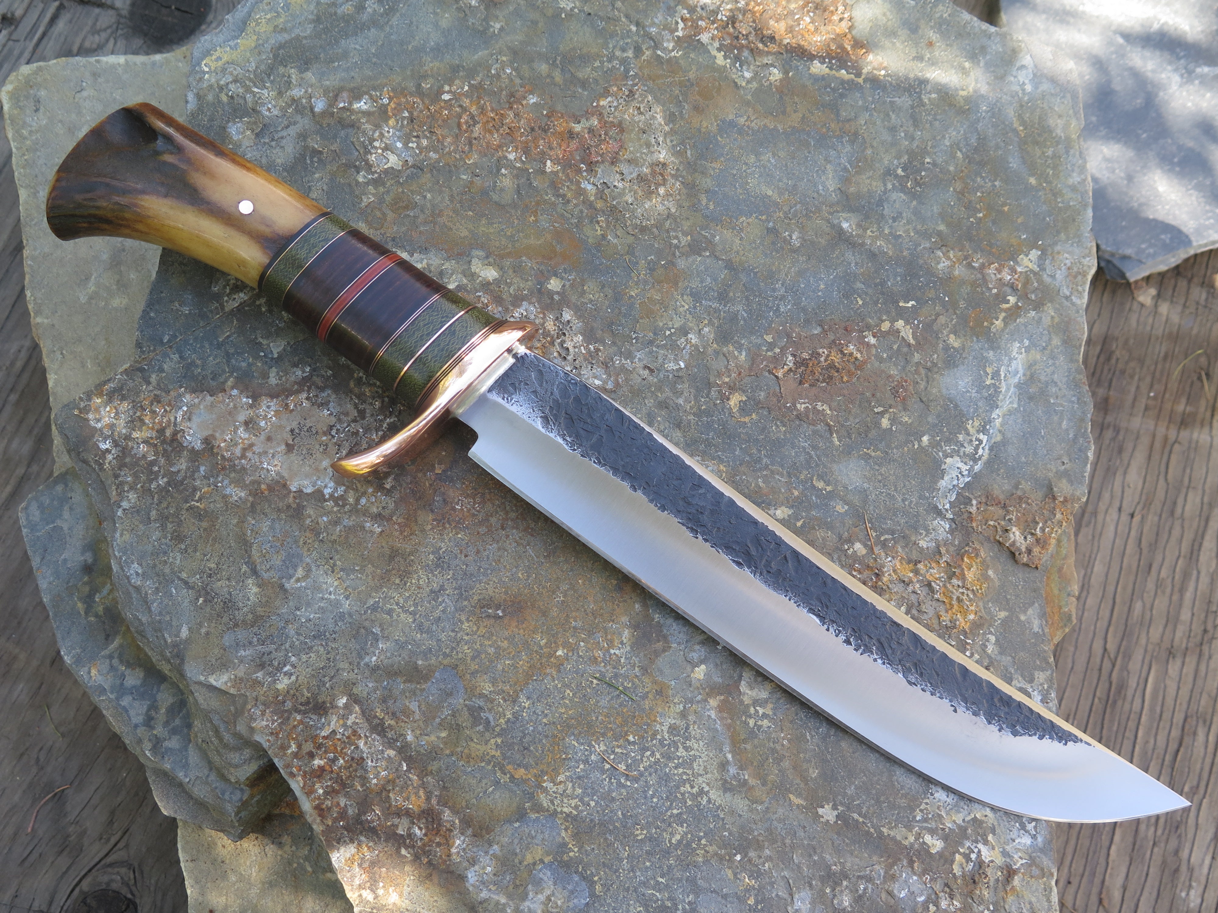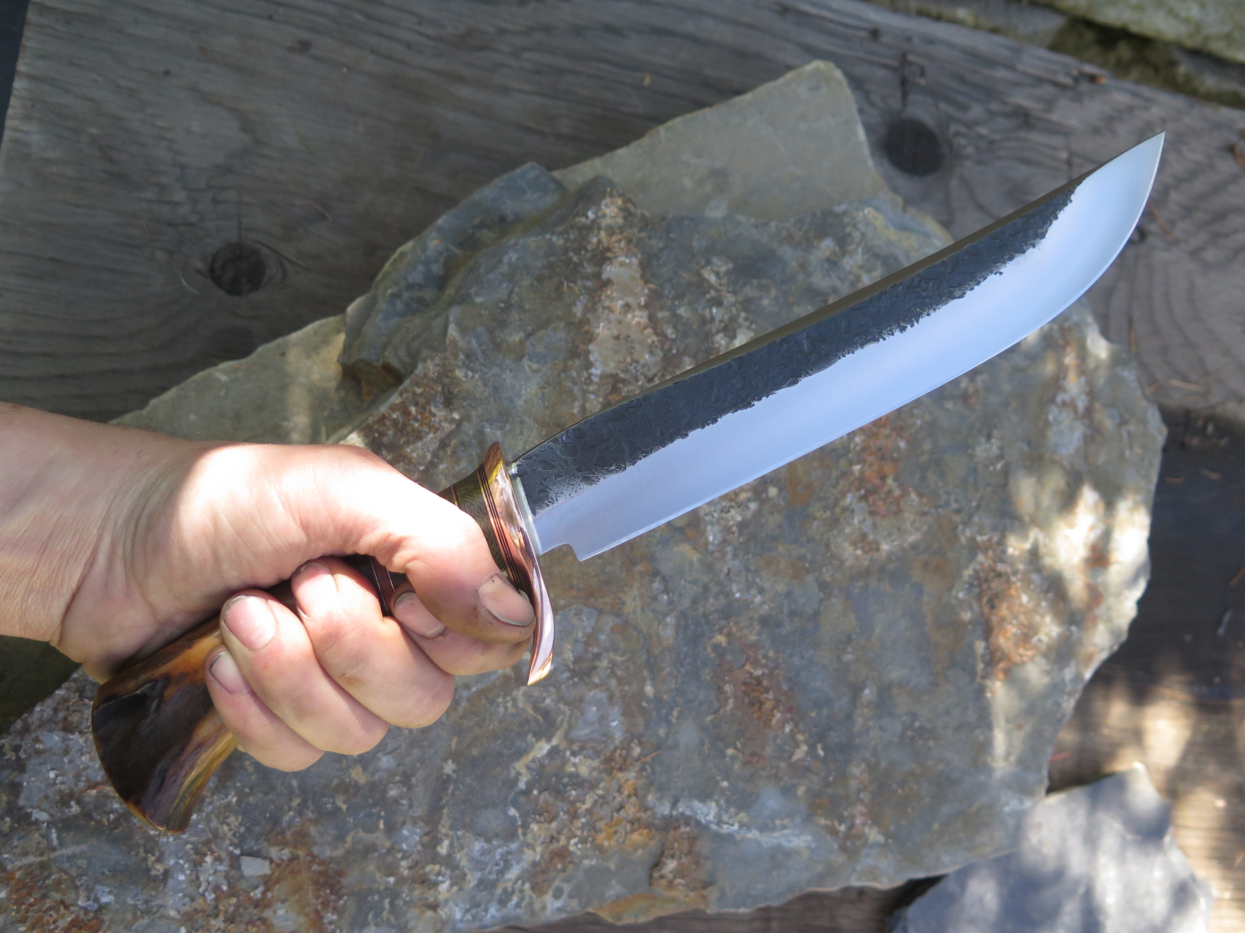 This beastly new Field Knife from Behring Made© is hand forged from 13/64" thick 5160 spring steel and it measures 9" from tip to guard with a razor sharp hollow grind and our hammemark finish. The forged copper half-S guard is soldered in place above black and maroon fiber, green micarta, copper and horsehide leather spacers as well as a premium sambar stag butt that's pinned through the tang with copper. The overall length measures 14" and it will come in a custom sheath from Rowe's Leather.