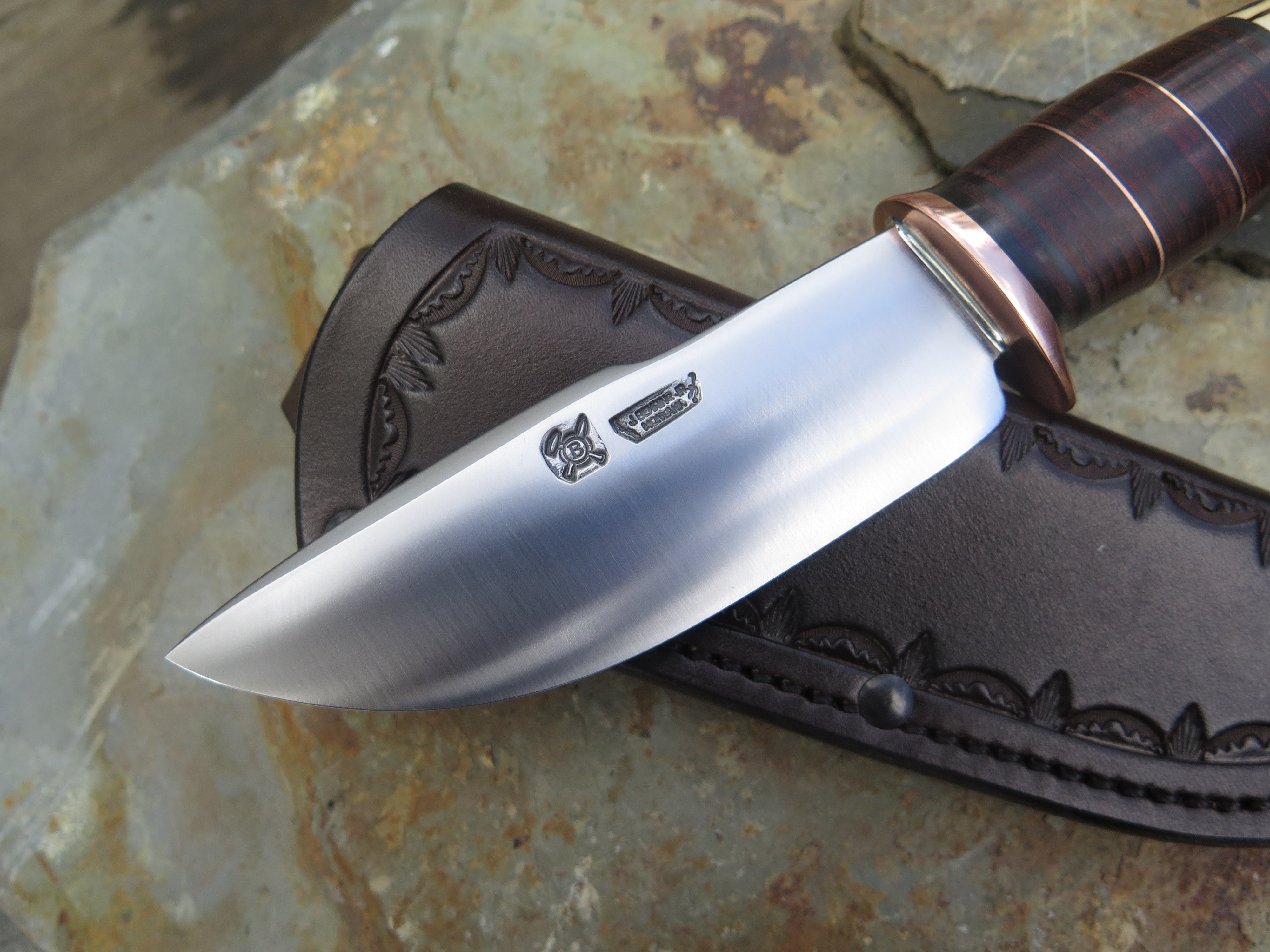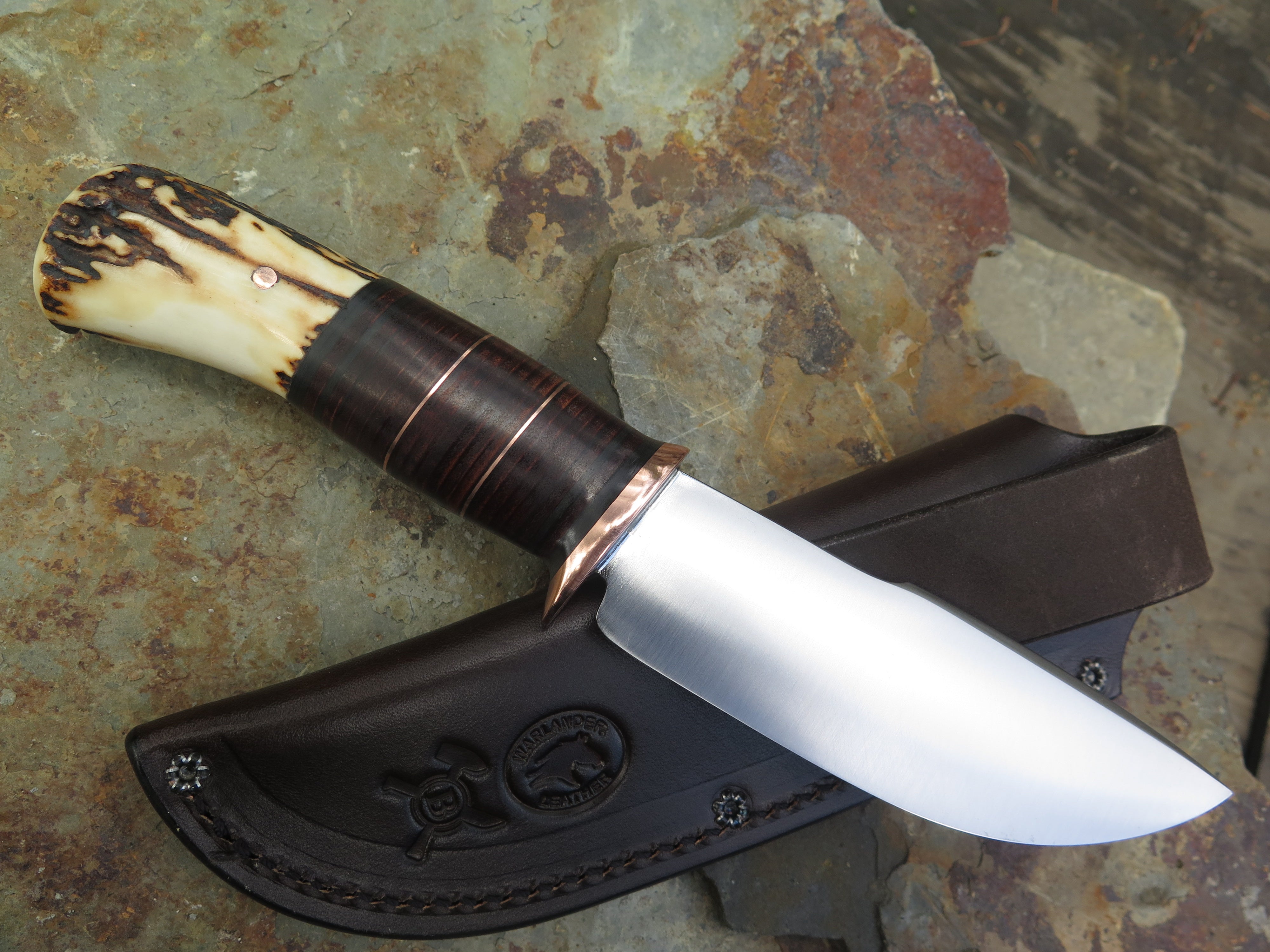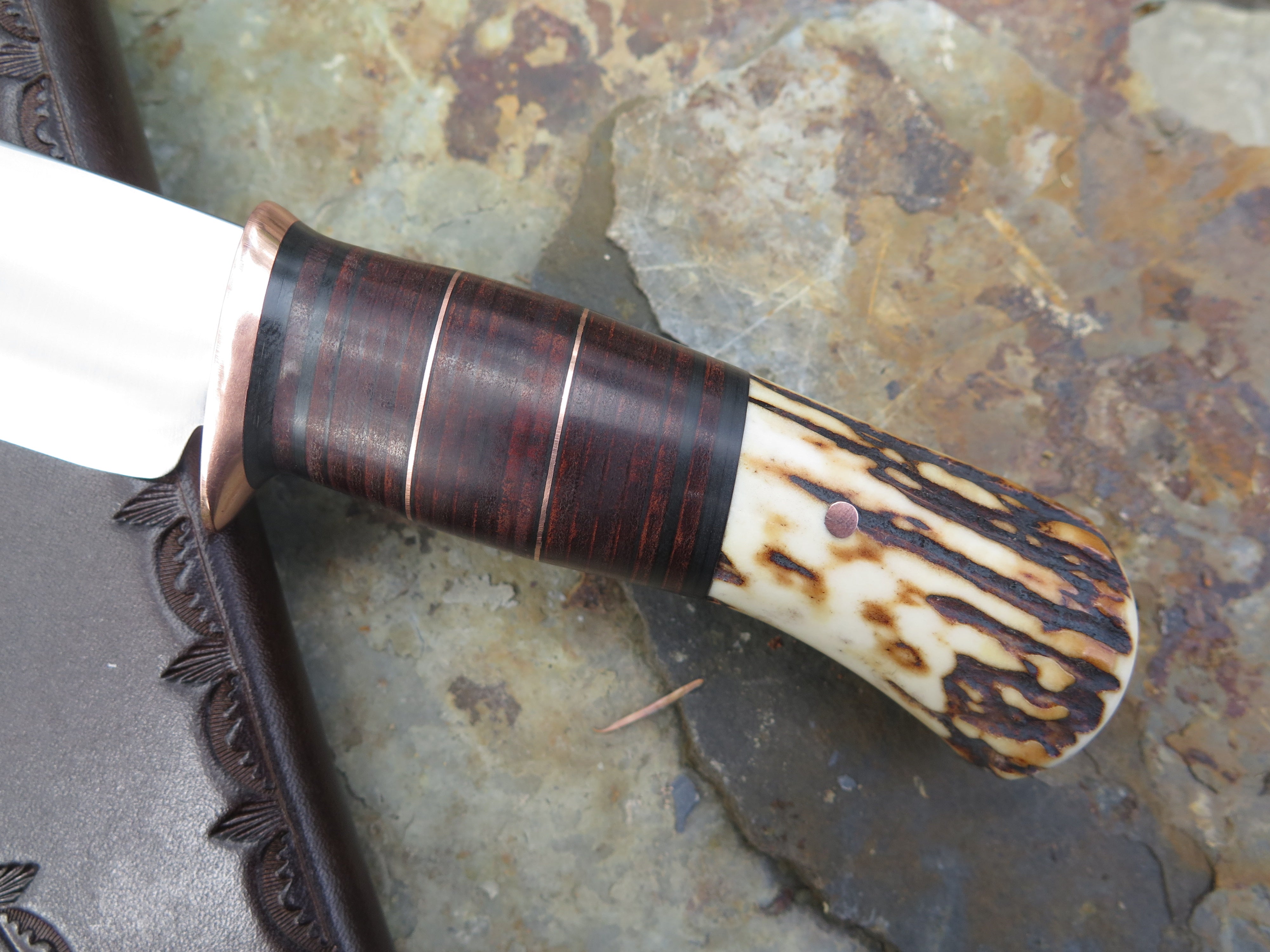 This beautiful new Behring Made© Woocraft is hand forged from 3/16" thick high carbon 01 tool steel and it measures 4 3/4" from tip to guard with a razor sharp convex grind. The copper guard is soldered in place above black fiber, copper and horsehide leather spacers as well as a premium sambar stag butt that's pinned through the tang with copper. The overall length measures 9 3/8" and it comes in a classic leather belt pouch sheath.