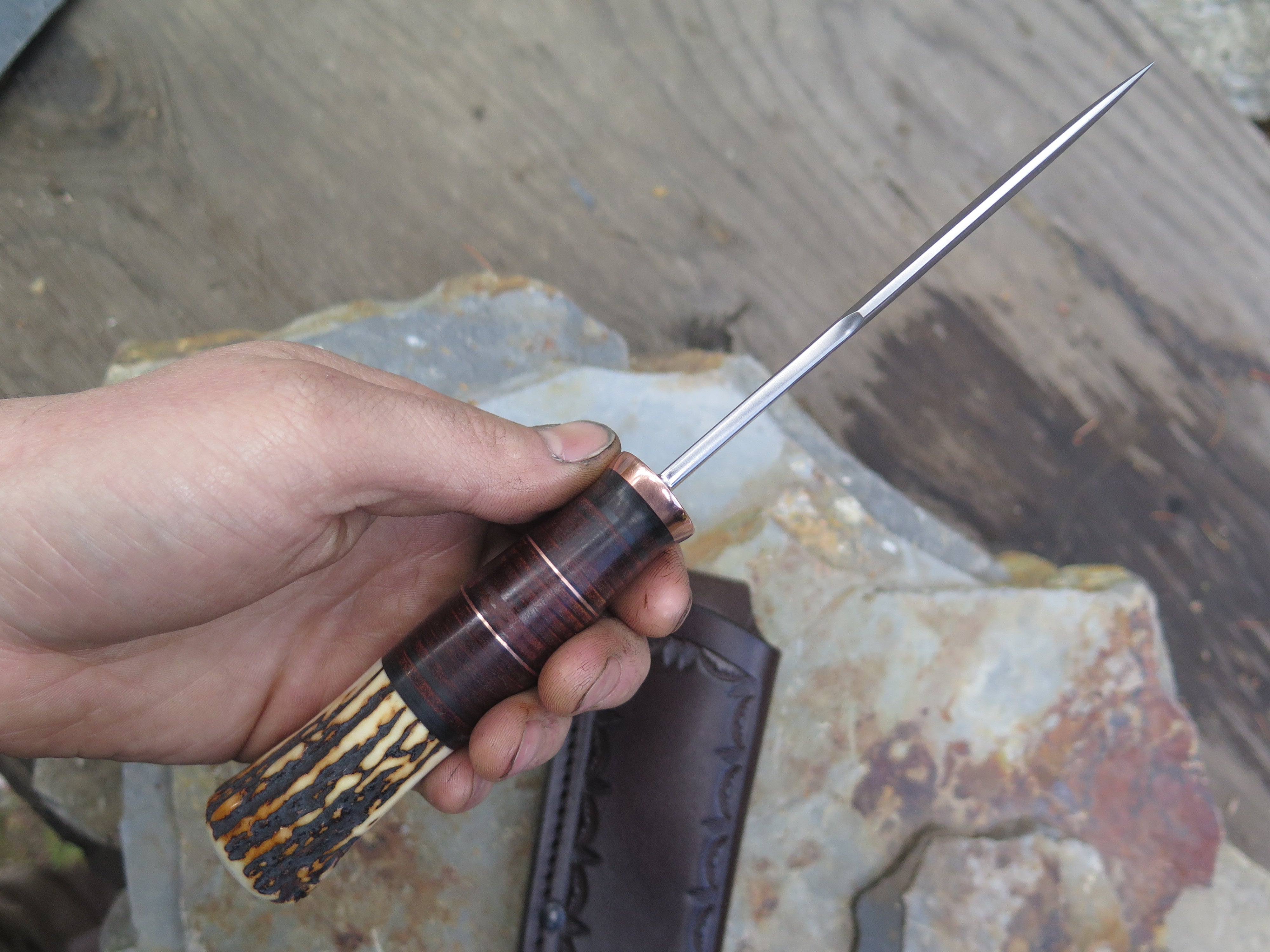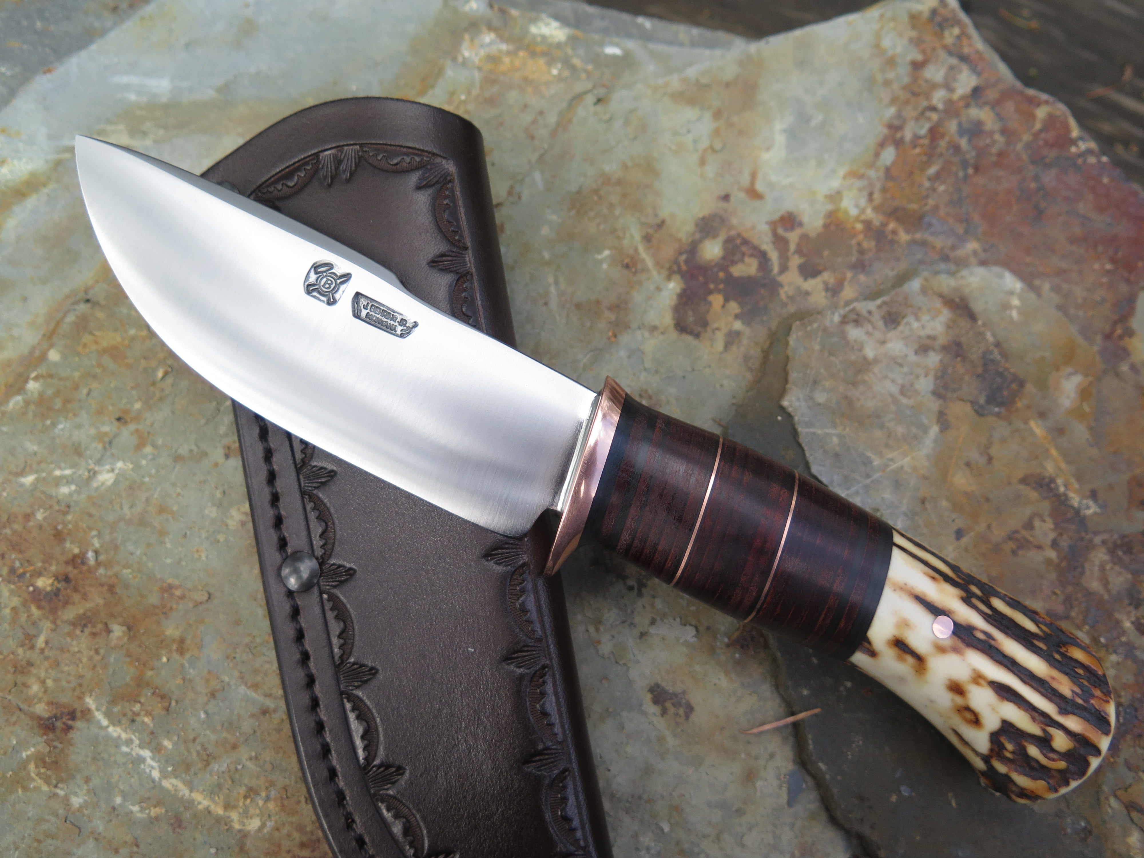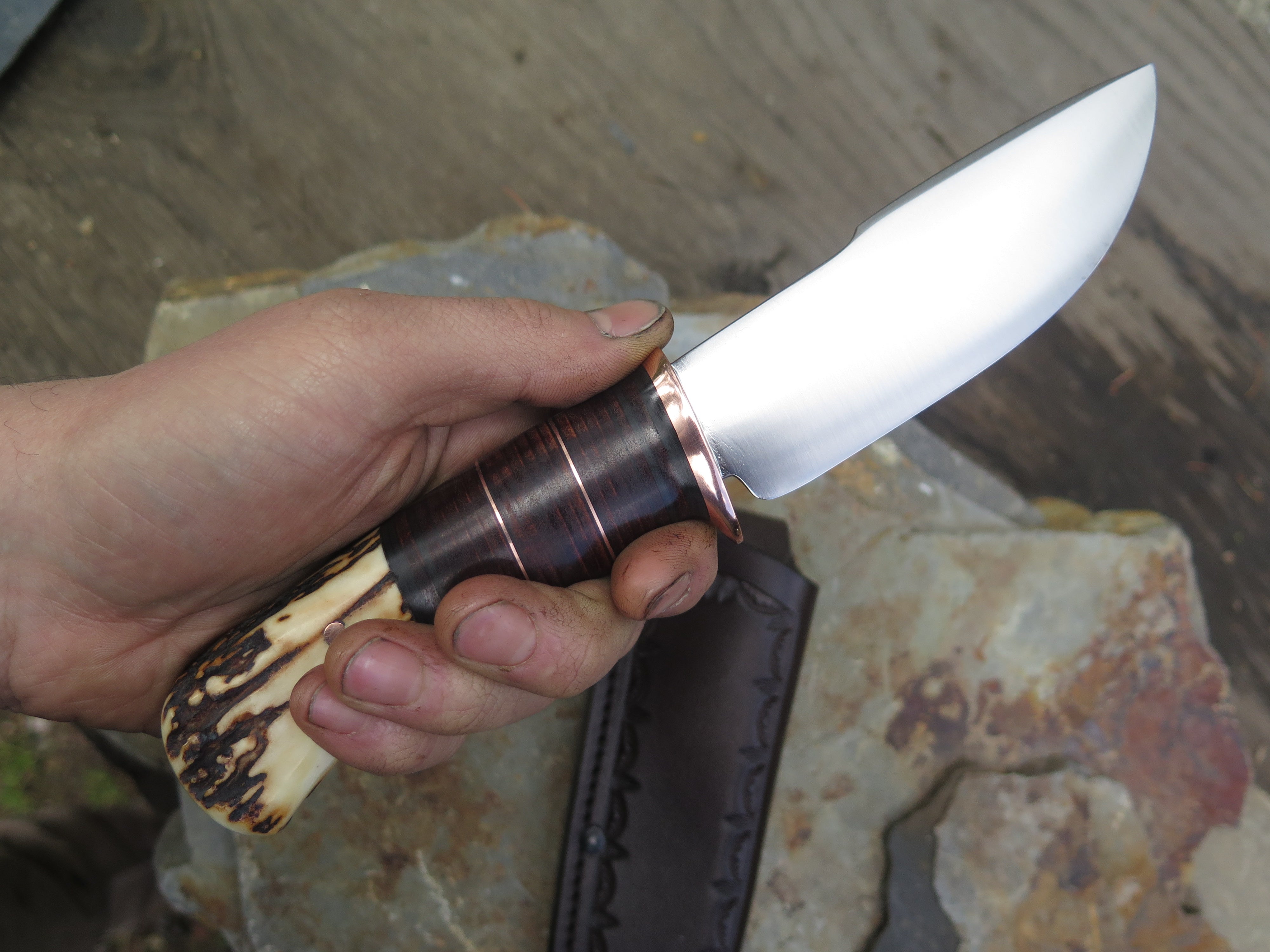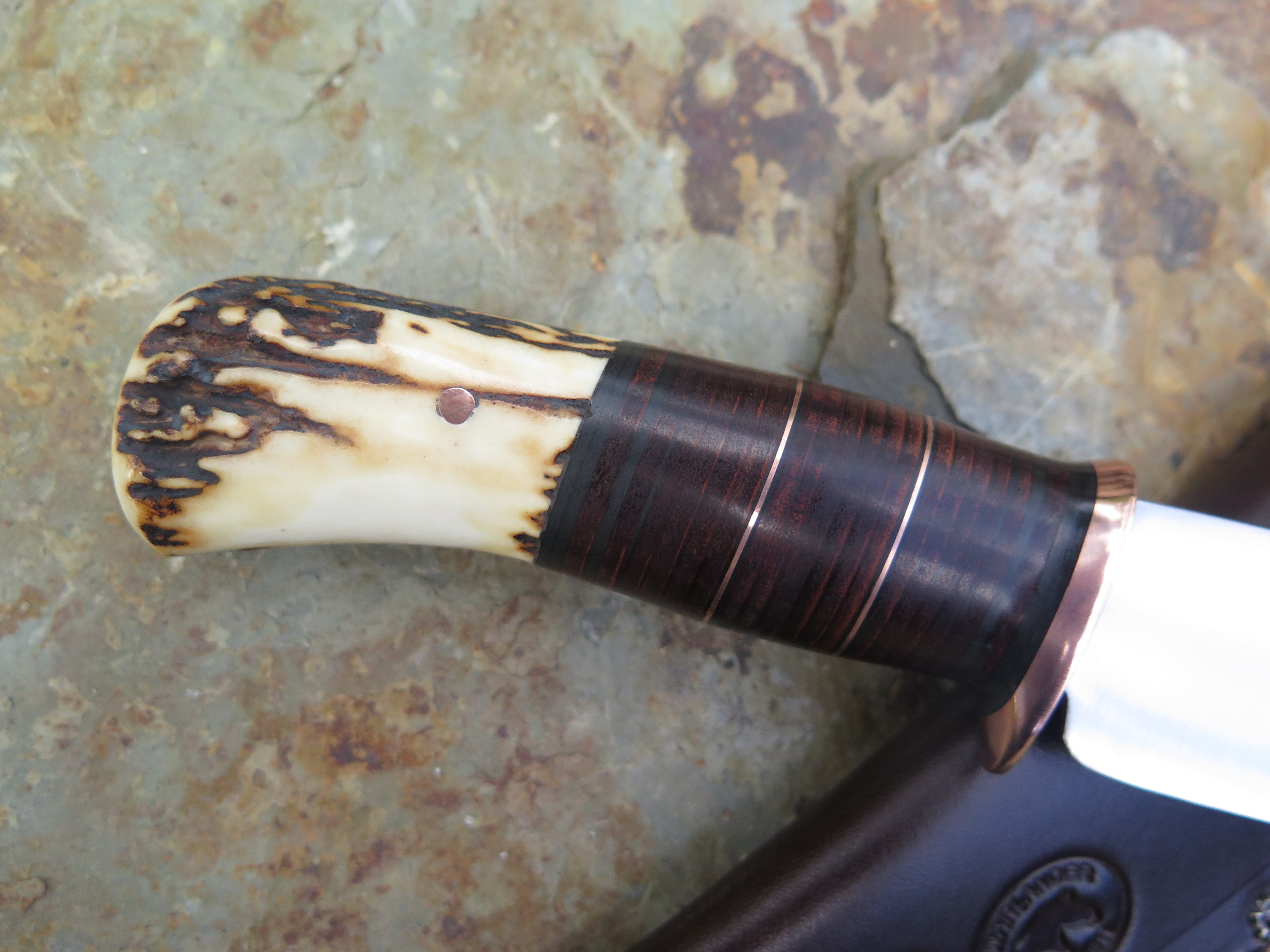 This beautiful new Behring Made© Woocraft is hand forged from 3/16" thick high carbon 01 tool steel and it measures 4 3/4" from tip to guard with a razor sharp convex grind. The copper guard is soldered in place above black fiber, copper and horsehide leather spacers as well as a premium sambar stag butt that's pinned through the tang with copper. The overall length measures 9 3/8" and it comes in a classic leather belt pouch sheath.