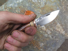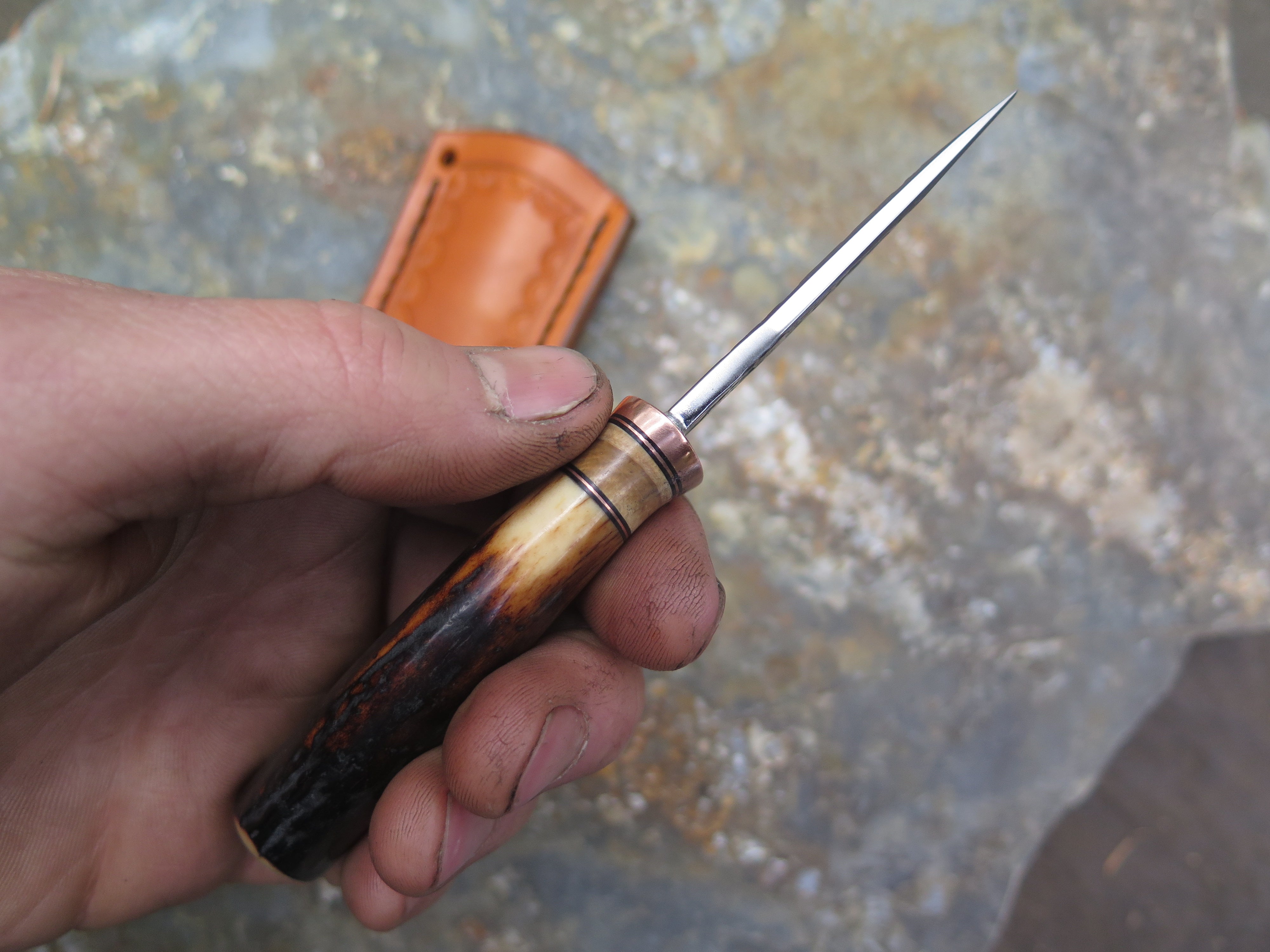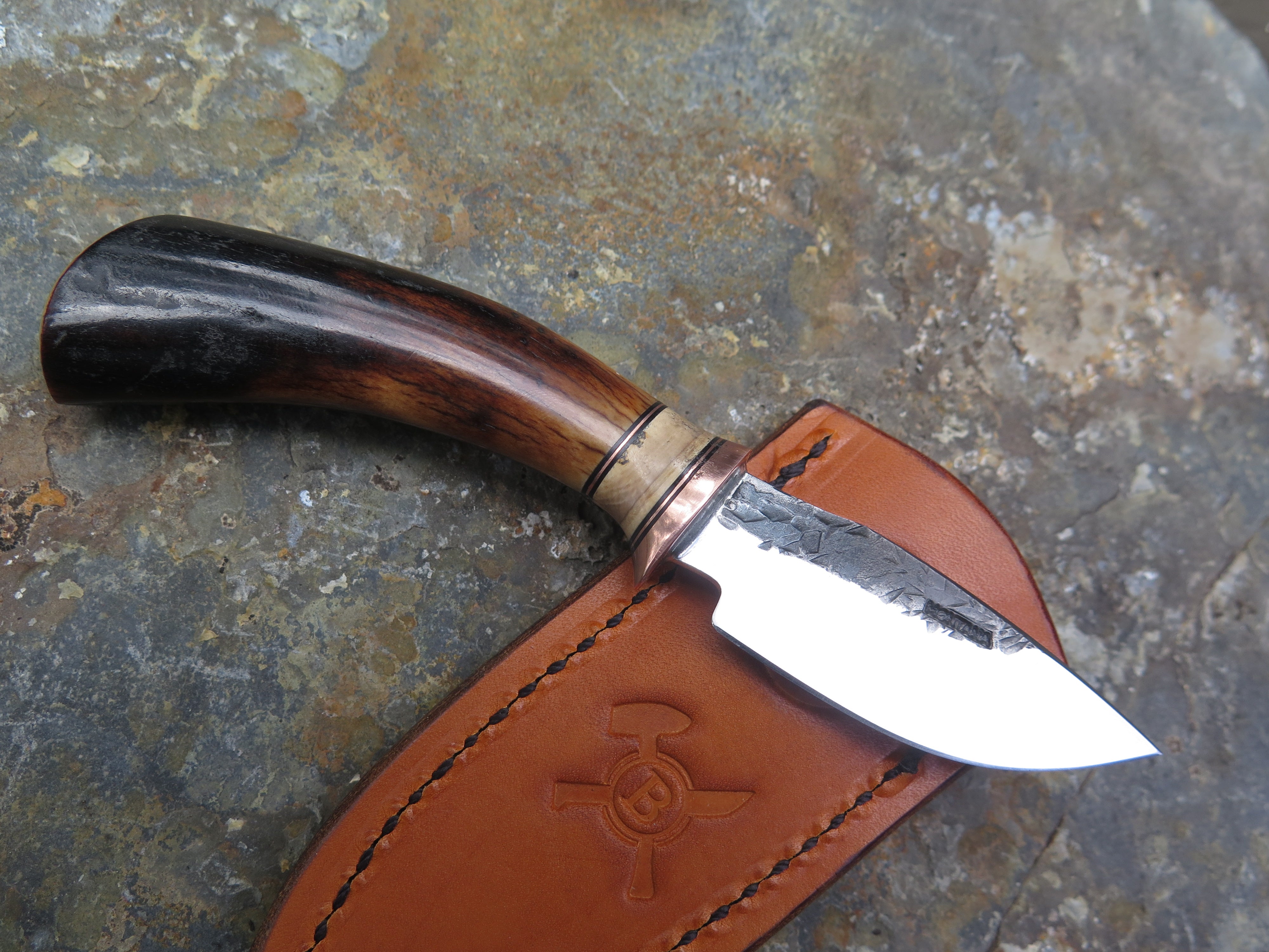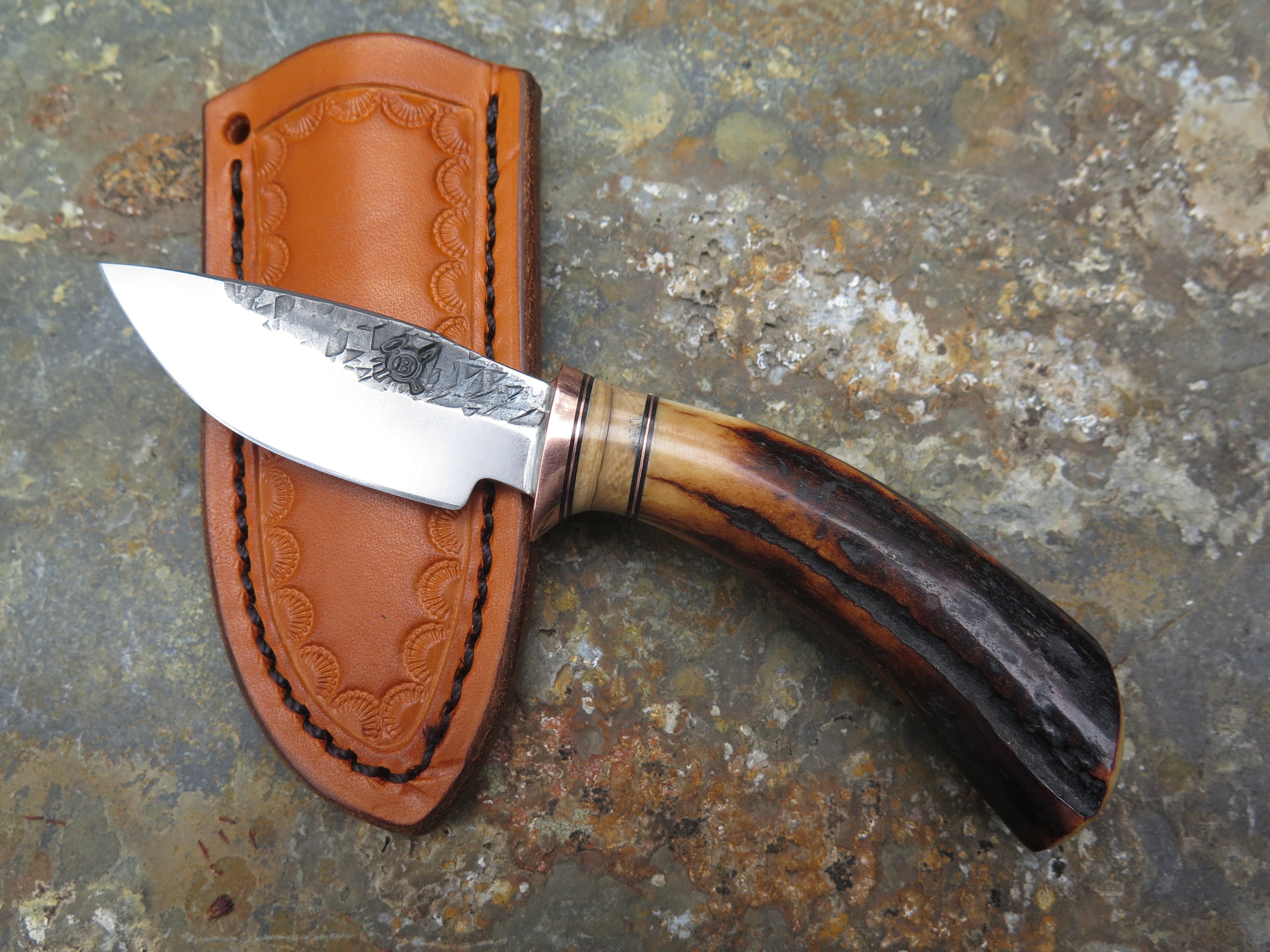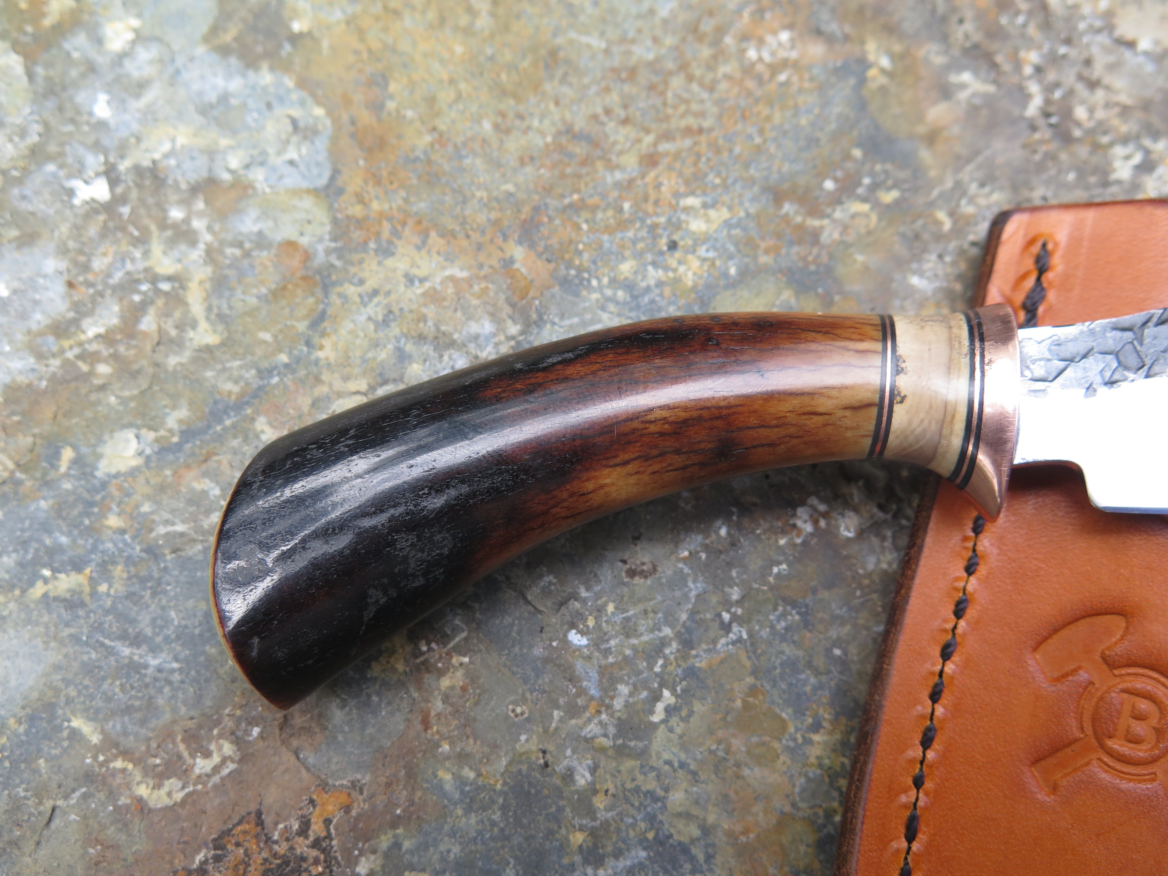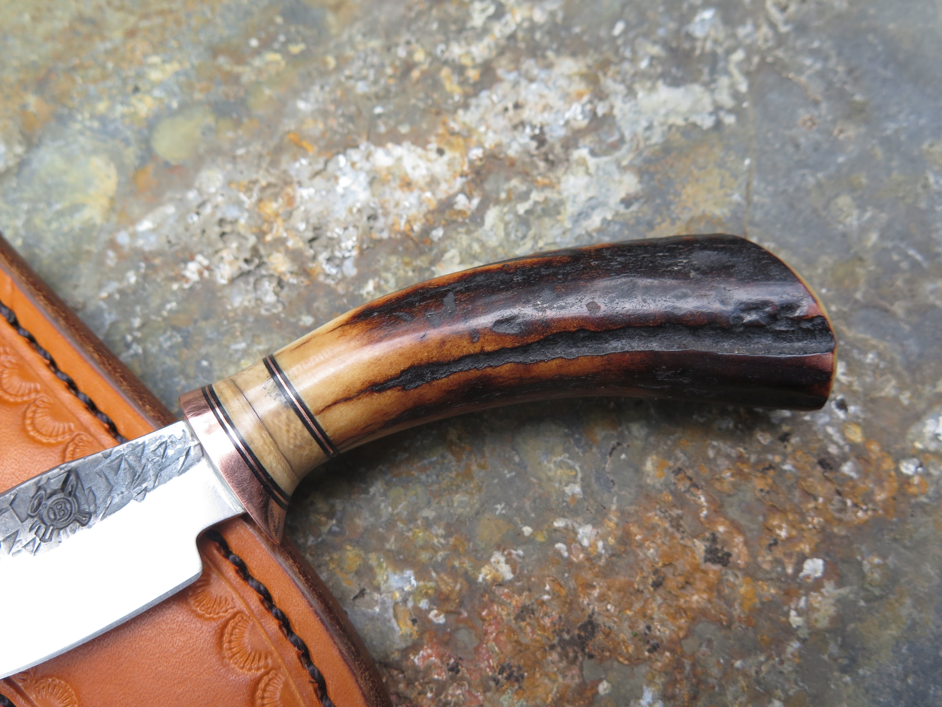 This stunning new 5th Pocket Alaskan from Behring Made© is hand forged from 1/8" thick high carbon 01 tool steel and it measures 2 1/2" from tip to guard with a razor sharp hollow grind and our hammermark finish. The copper guard is soldered in place above black fiber, copper and mammoth ivory spacers in addition to the premium sambar stag handle. The overall length measures 5 3/8" and it comes in a simple leather sleeve for an easy carry in the pocket.