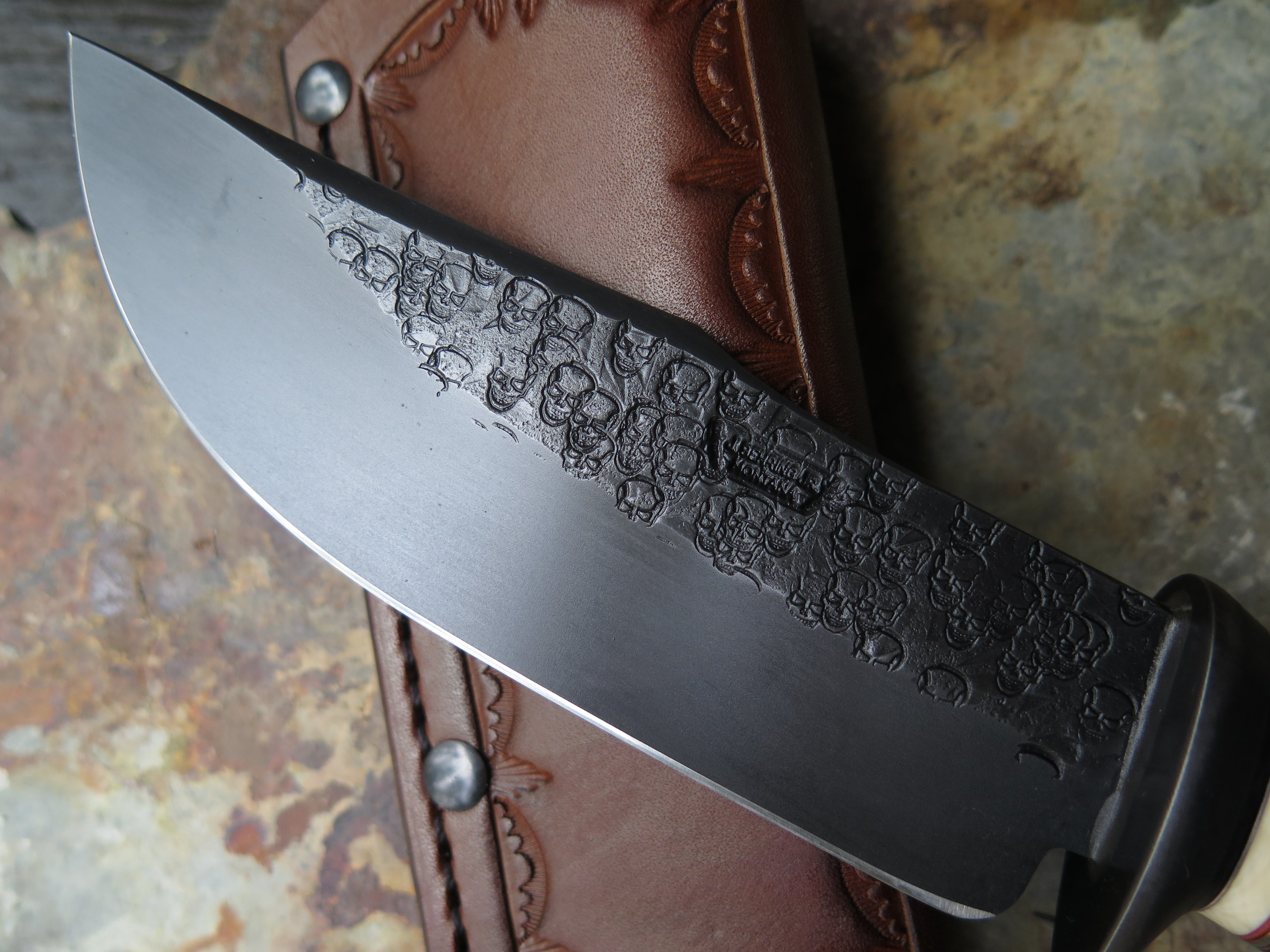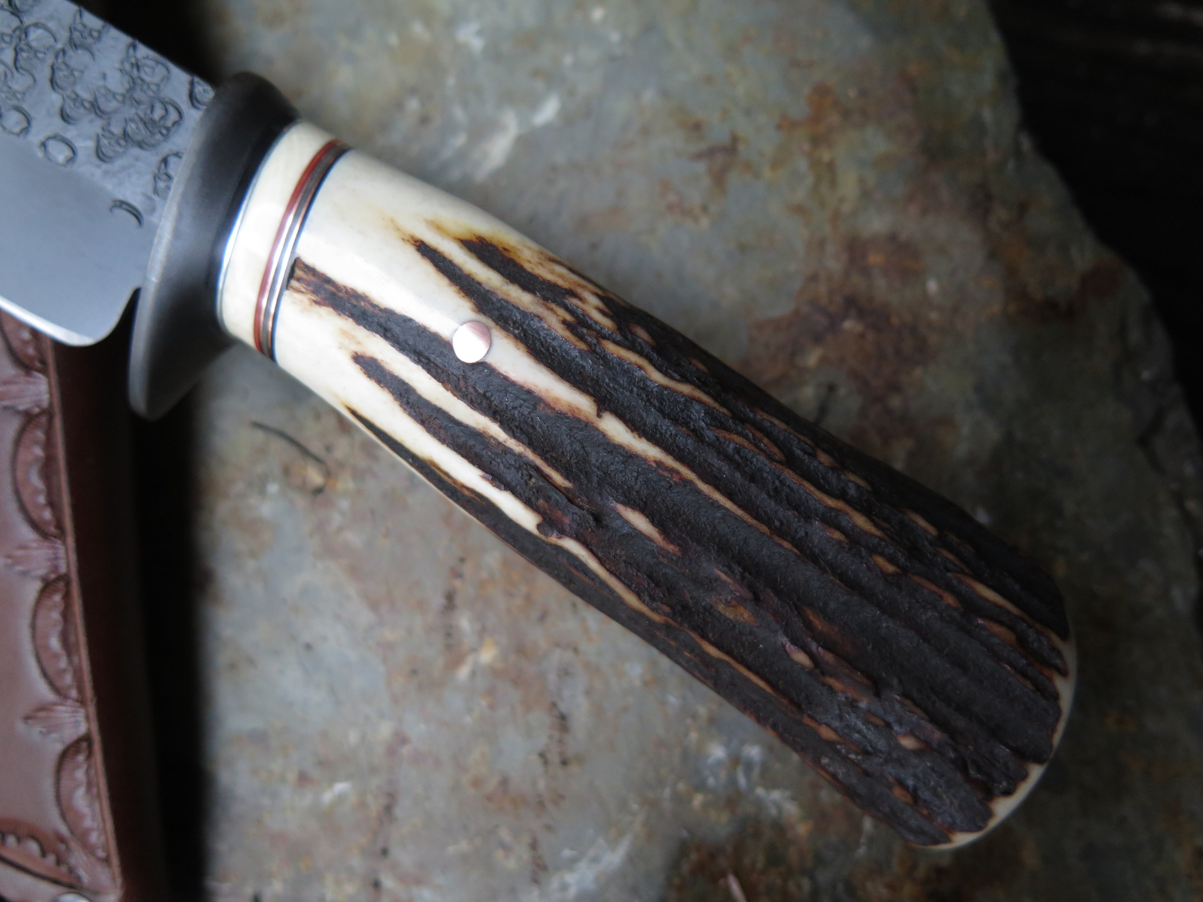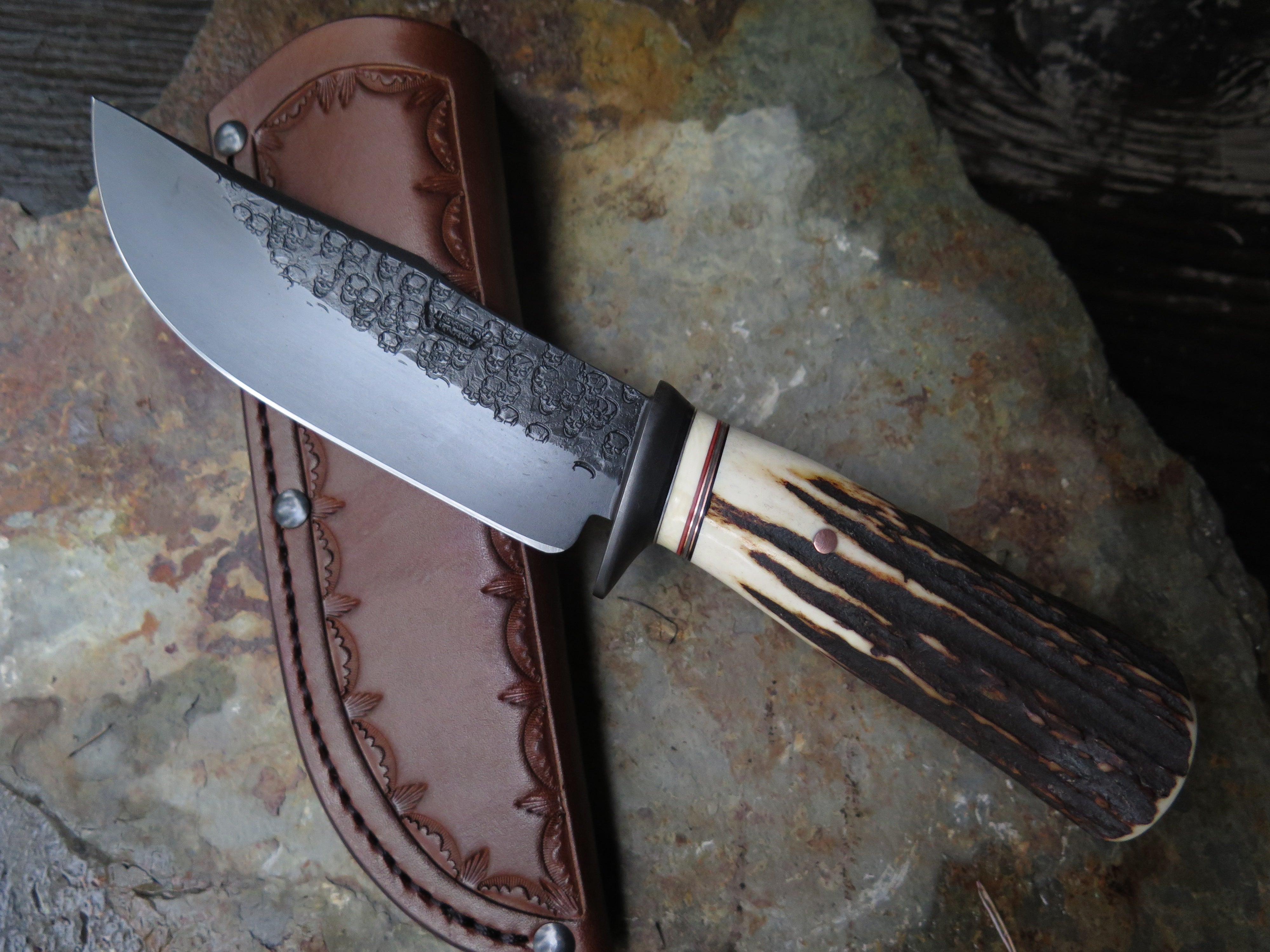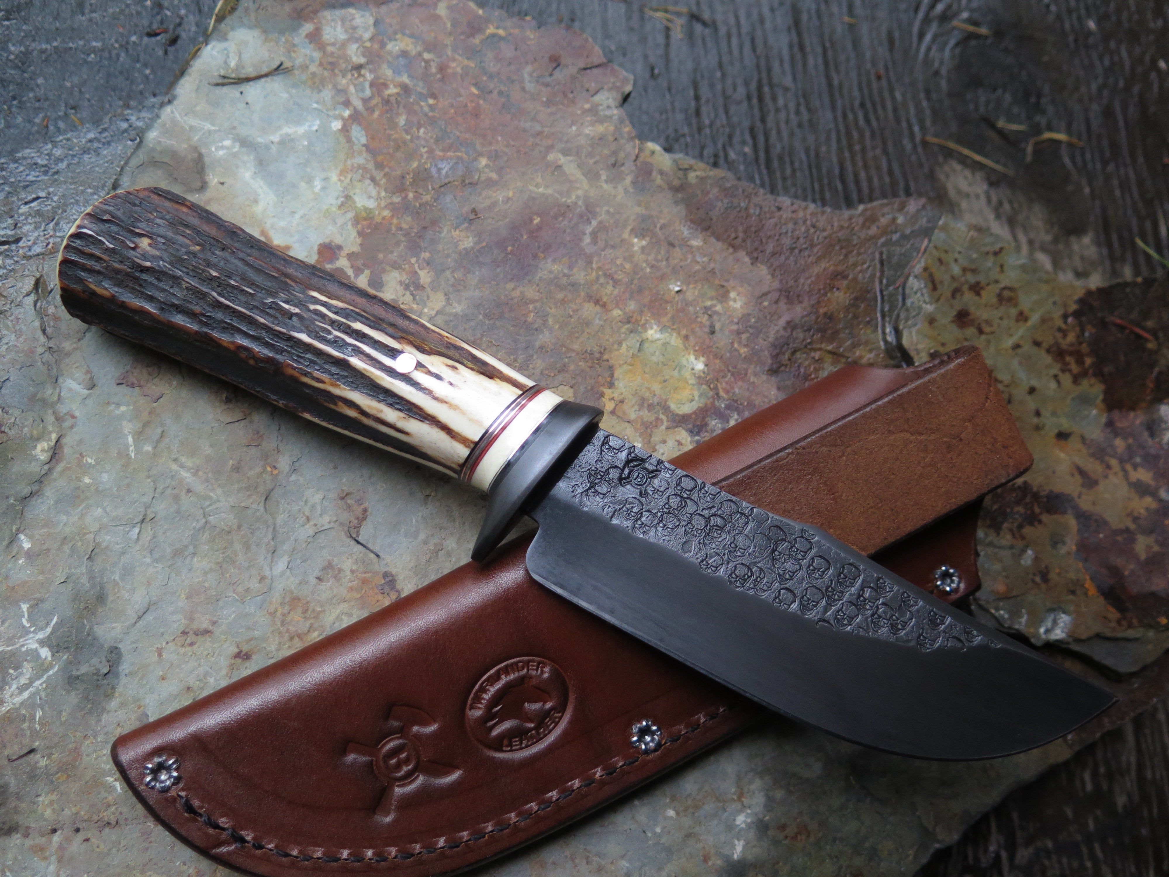This beastly new Hunter from Behring Made© is a real bad boy! The blade is hand forged from 3/16" thick high carbon 01 tool steel and it measures 5" from tip to guard with a razor sharp hollow grind and our unique ghost skull hammered finish. The blued steel guard is soldered in place above black, gray, maroon and ancient mammoth ivory spacers as well as a premium sambar stag handle that is pinned through the tang with copper. The overall length measures 9 5/8" and it comes in a basketweave tooled pouch.