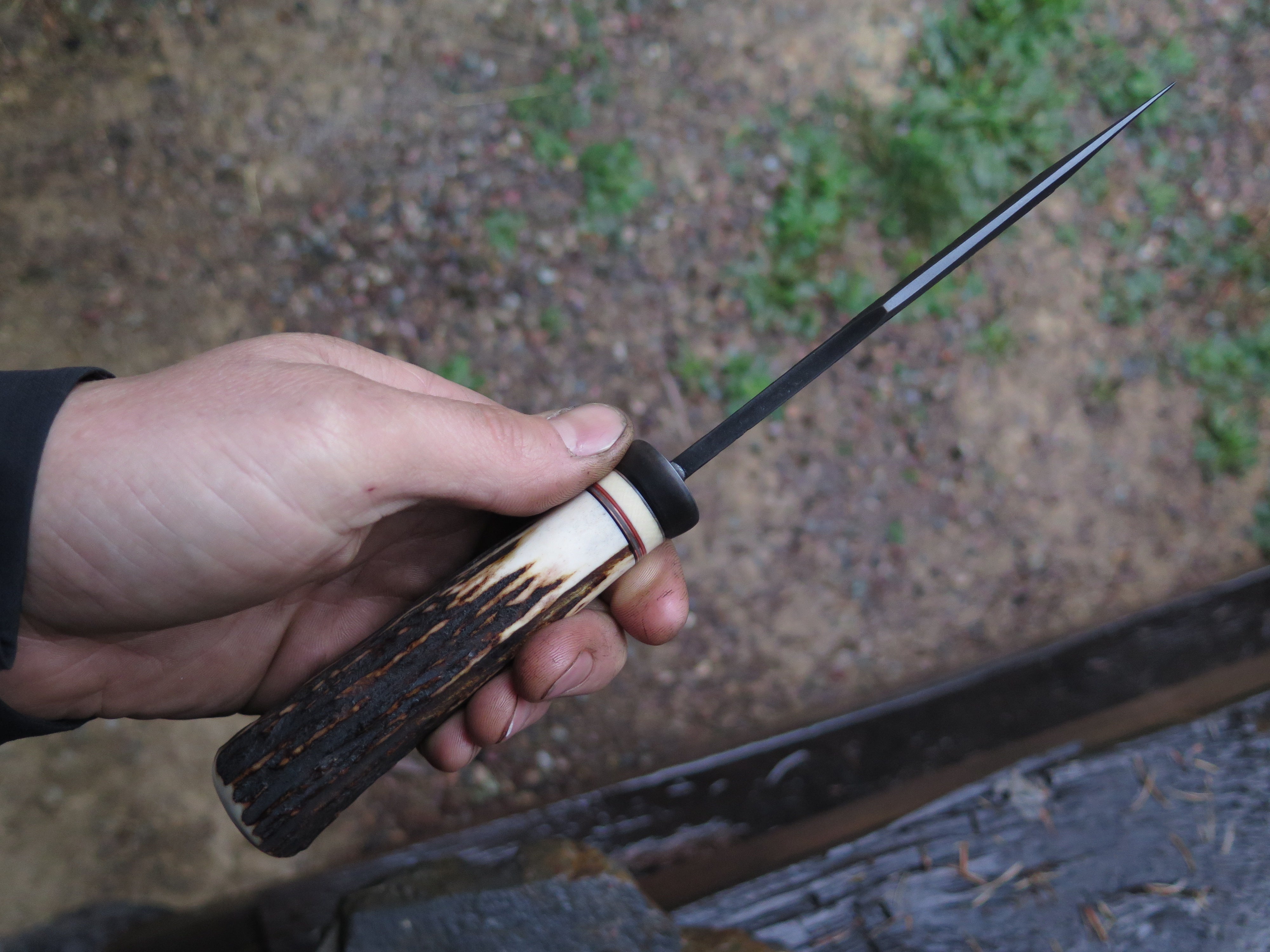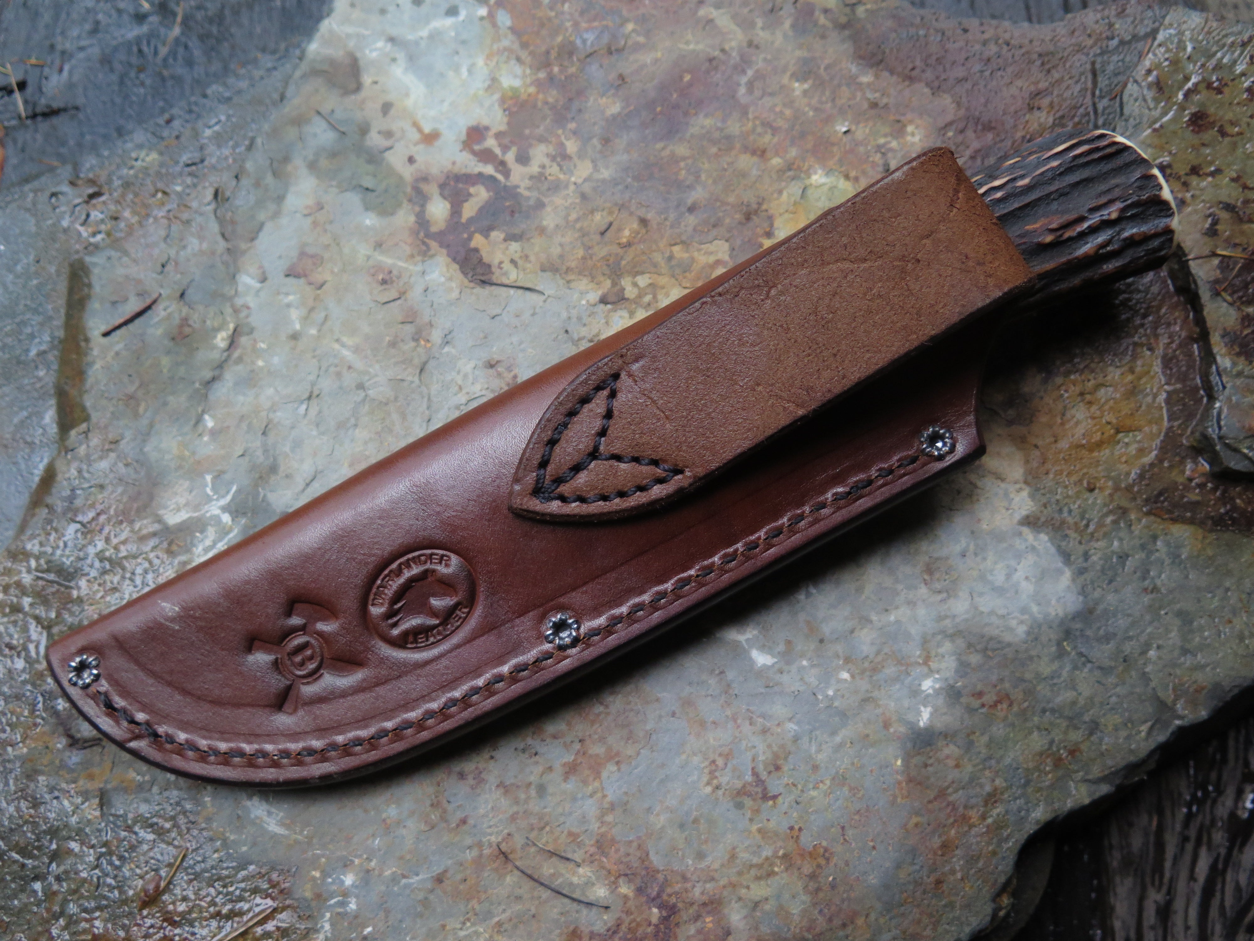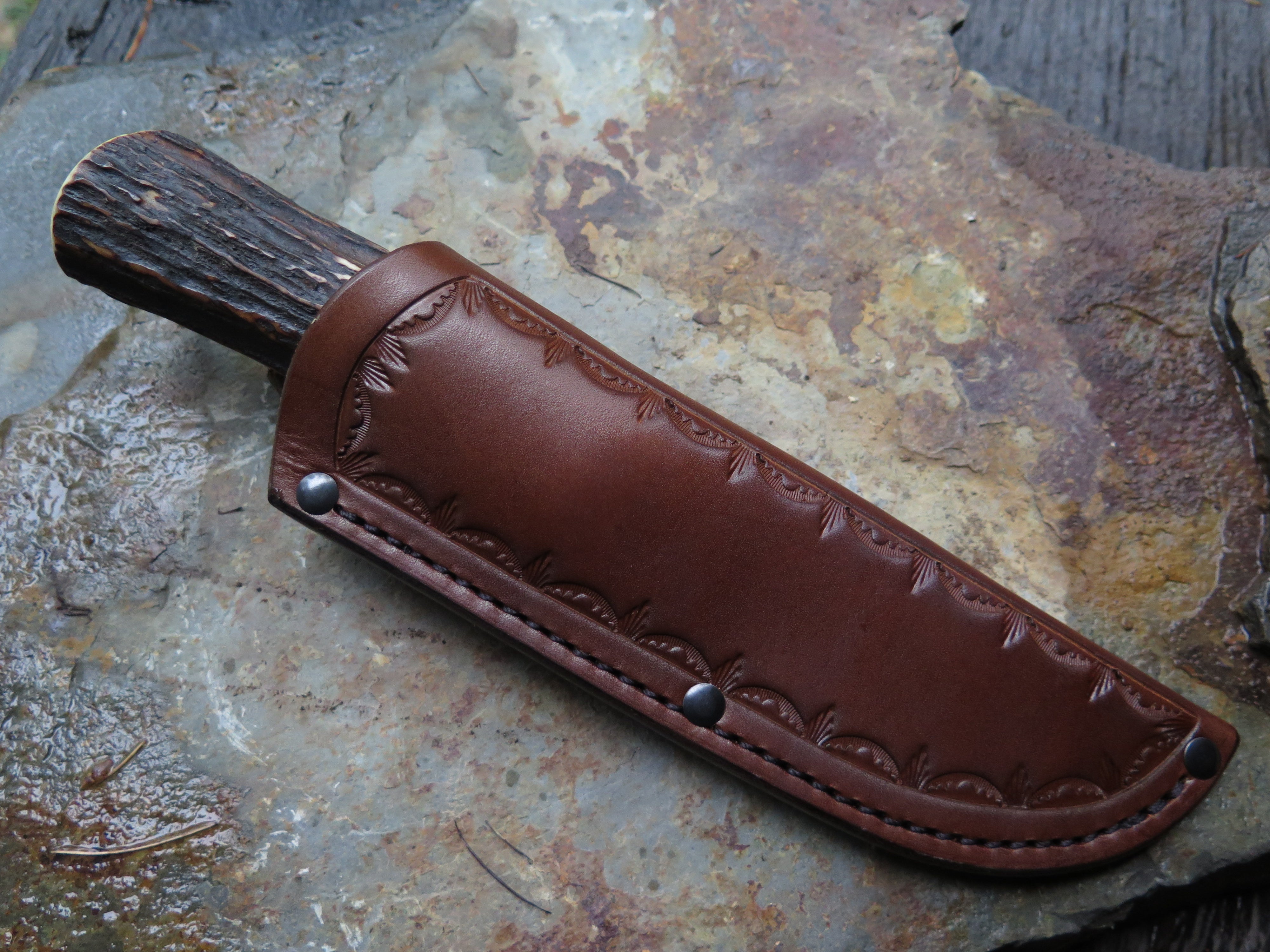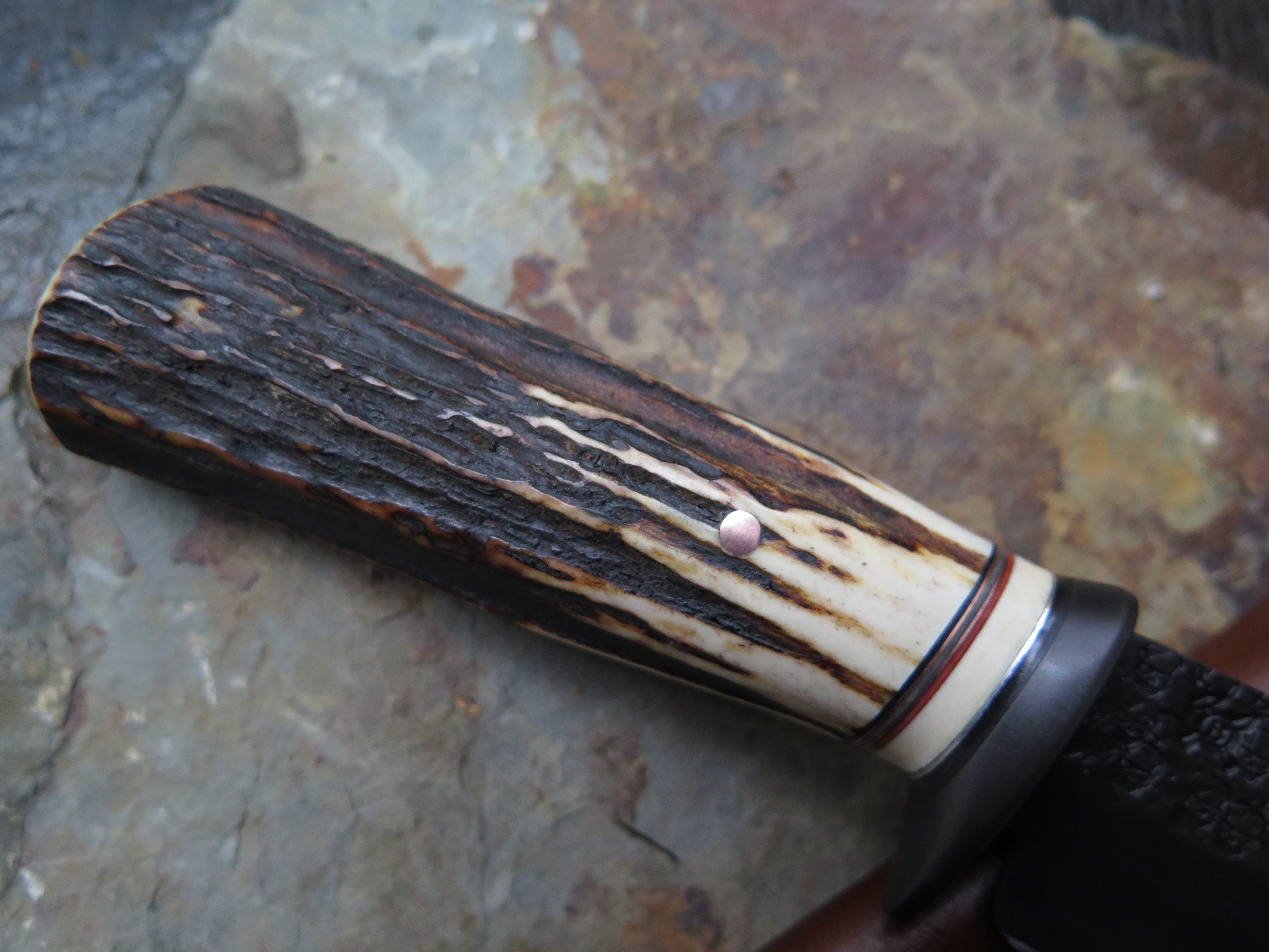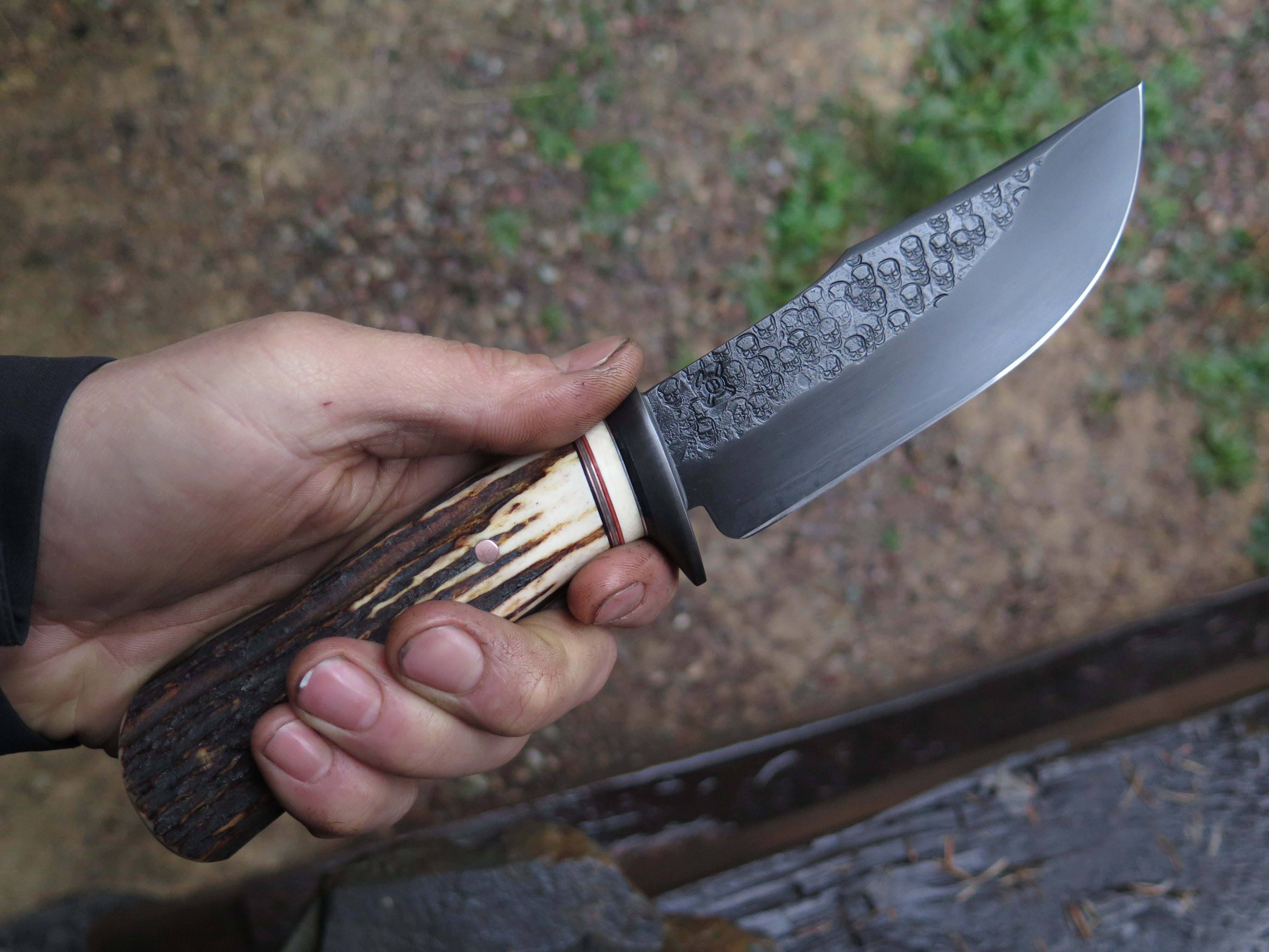 This beastly new Hunter from Behring Made© is a real bad boy! The blade is hand forged from 3/16" thick high carbon 01 tool steel and it measures 5" from tip to guard with a razor sharp hollow grind and our unique ghost skull hammered finish. The blued steel guard is soldered in place above black, gray, maroon and ancient mammoth ivory spacers as well as a premium sambar stag handle that is pinned through the tang with copper. The overall length measures 9 5/8" and it comes in a basketweave tooled pouch.