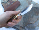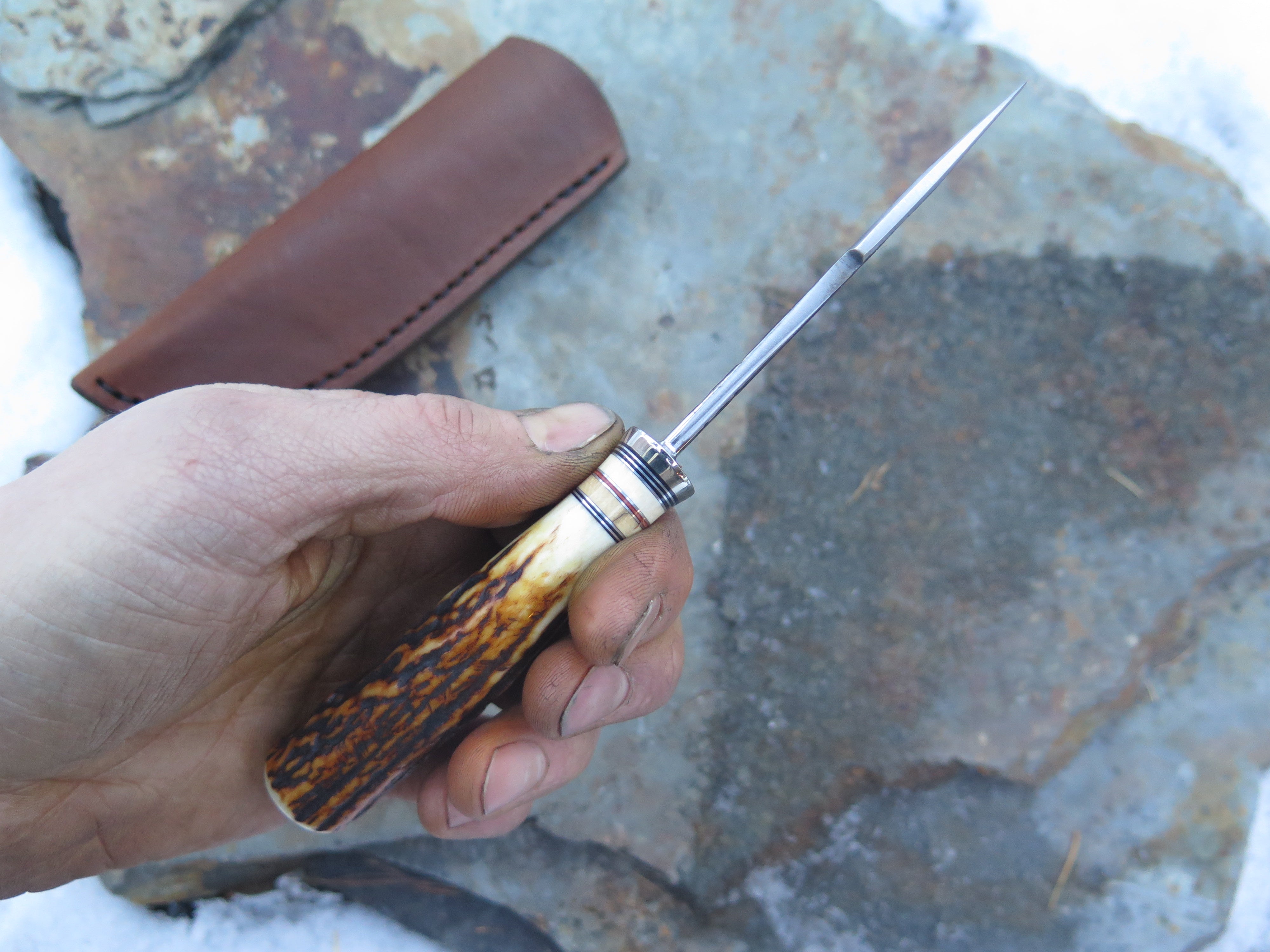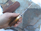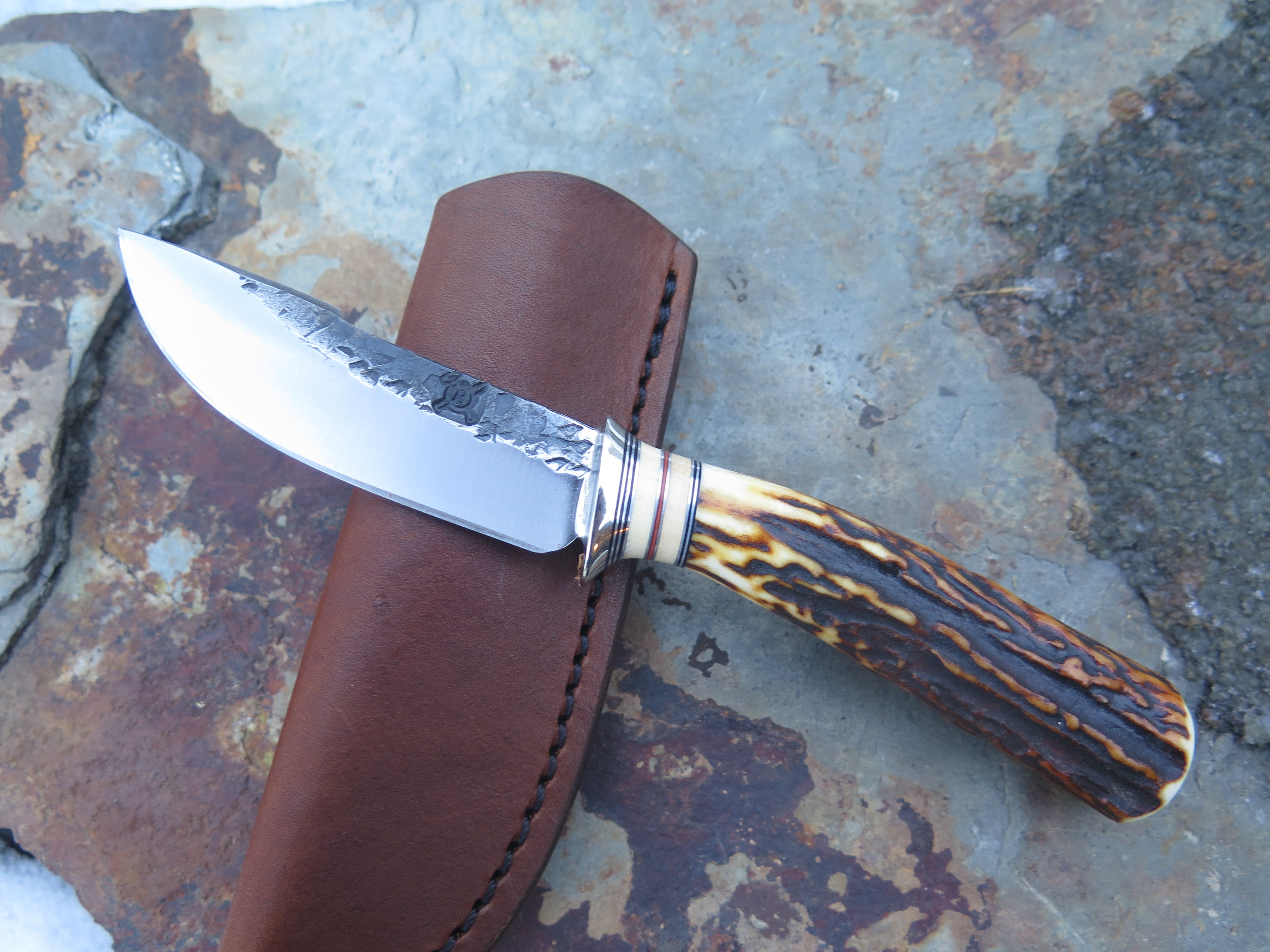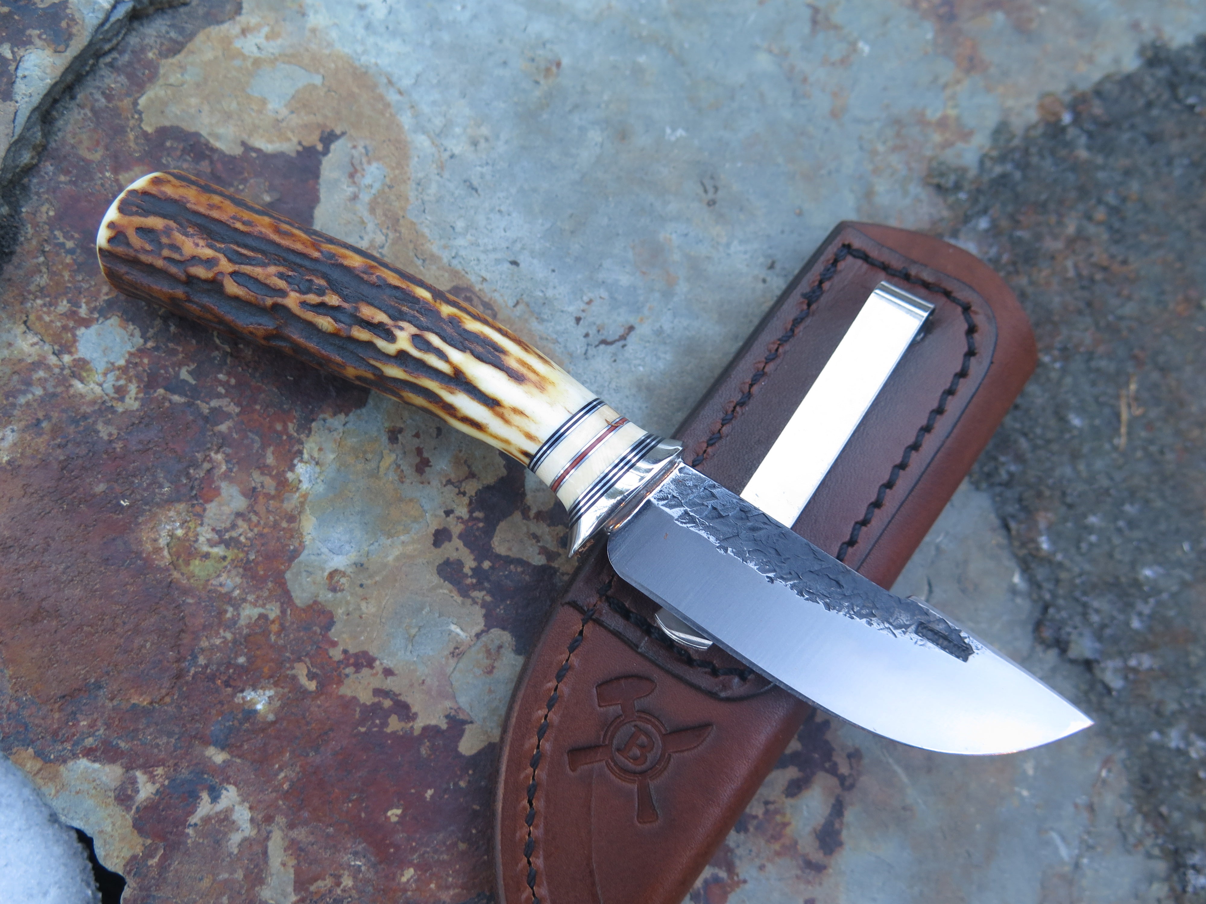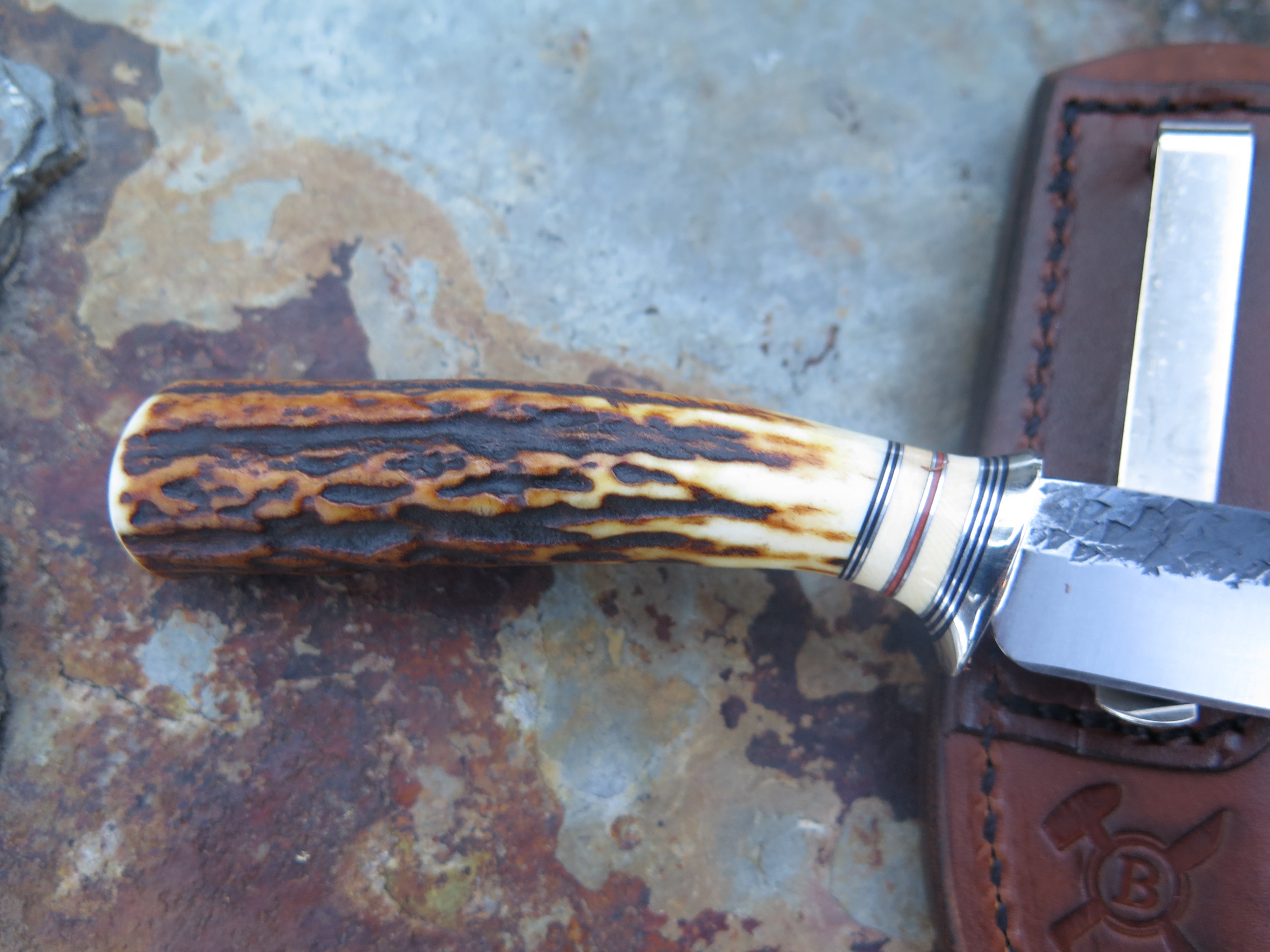 This beautiful new Woodcraft style Pocket Knife from Behring Made© is hand forged from 1/8” thick high carbon 01 tool steel and it measures 3“ from tip to guard with a razor sharp hollow grind and our hammermark finish. The nickel silver guard is soldered in place above black, maroon, aluminum and ancient mammoth ivory spacers with a premium sambar stag handle. The overall length measures 6 3/4“ and it comes in a spring clip leather sheath from Warlander Leather.