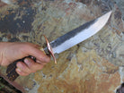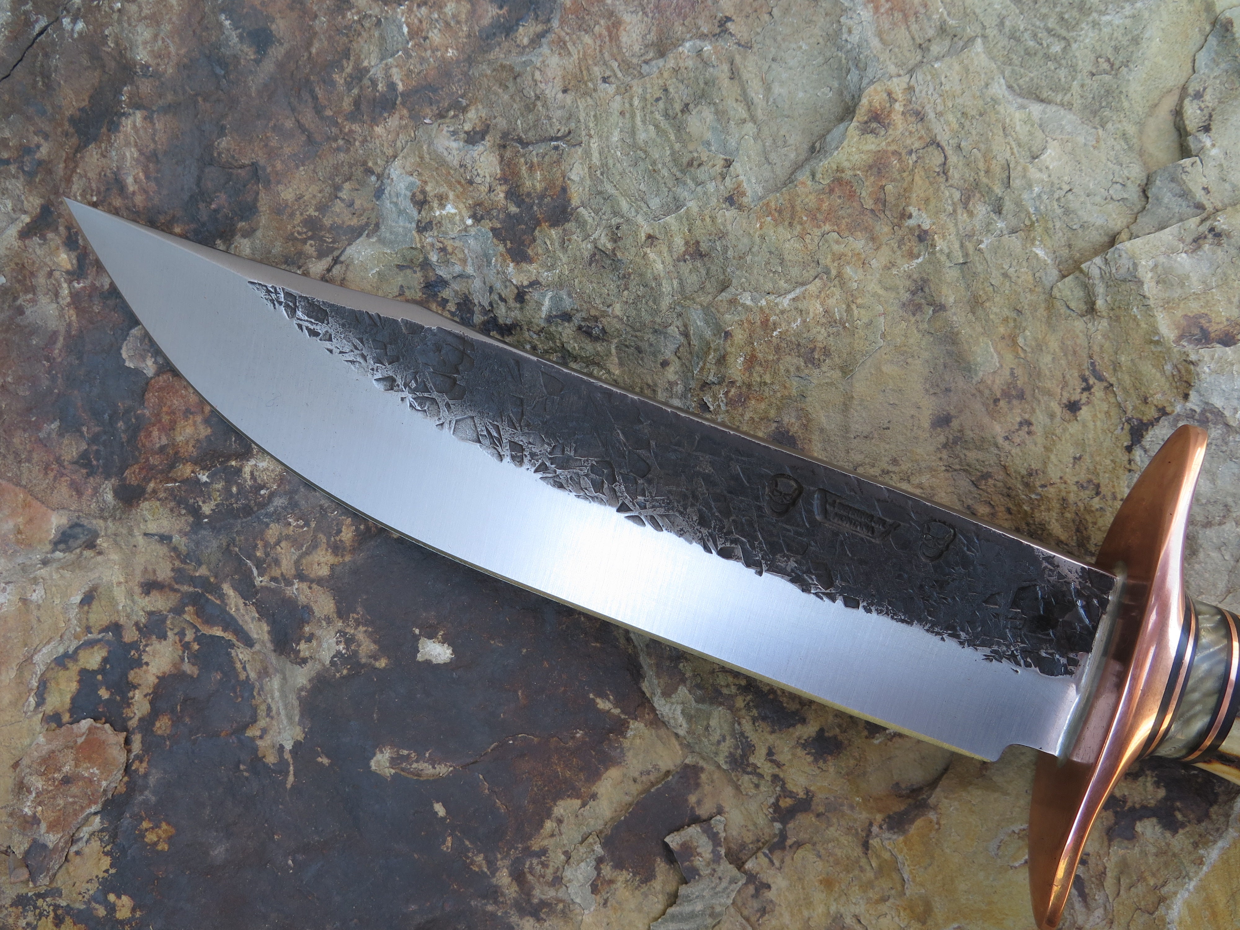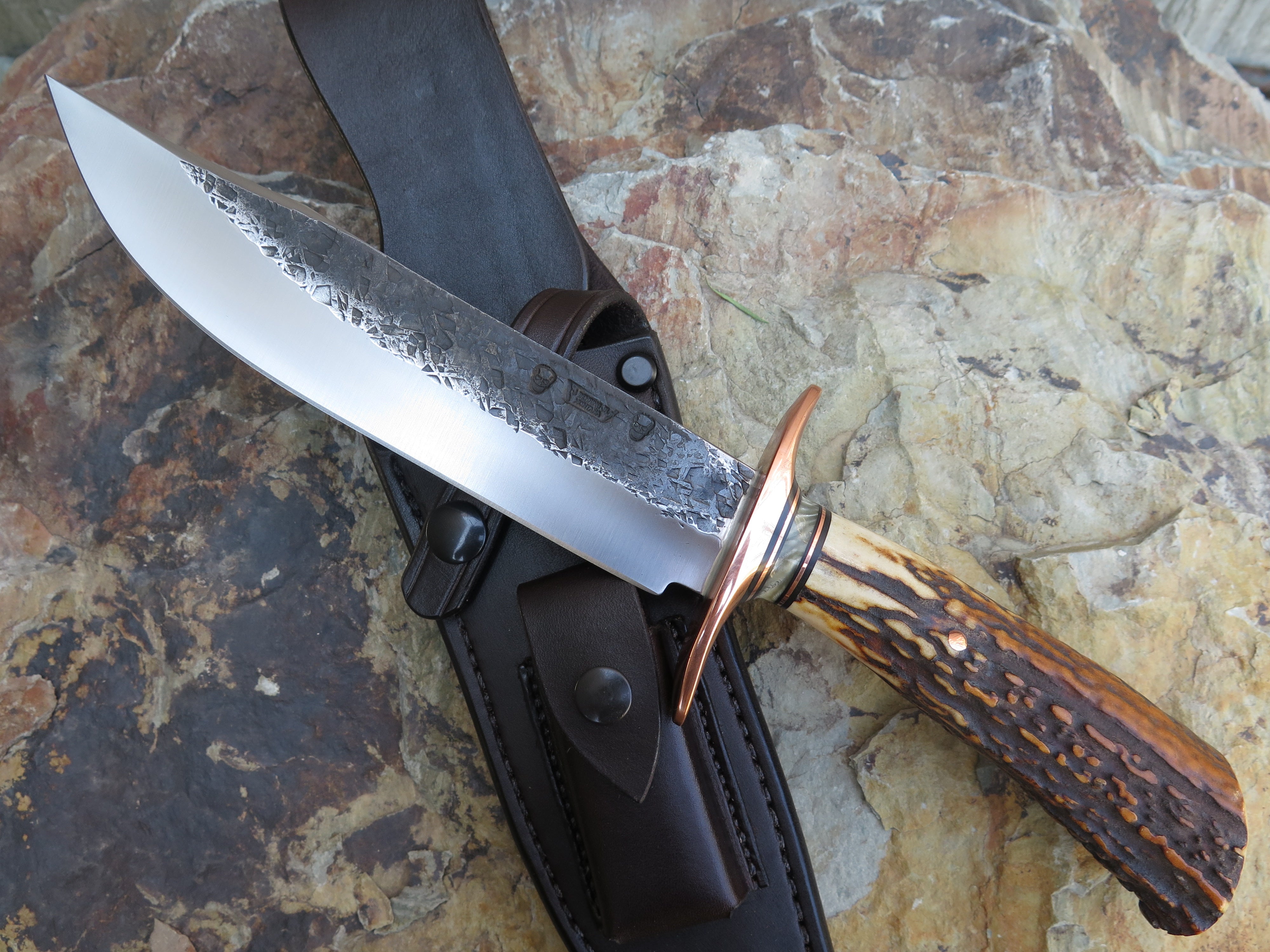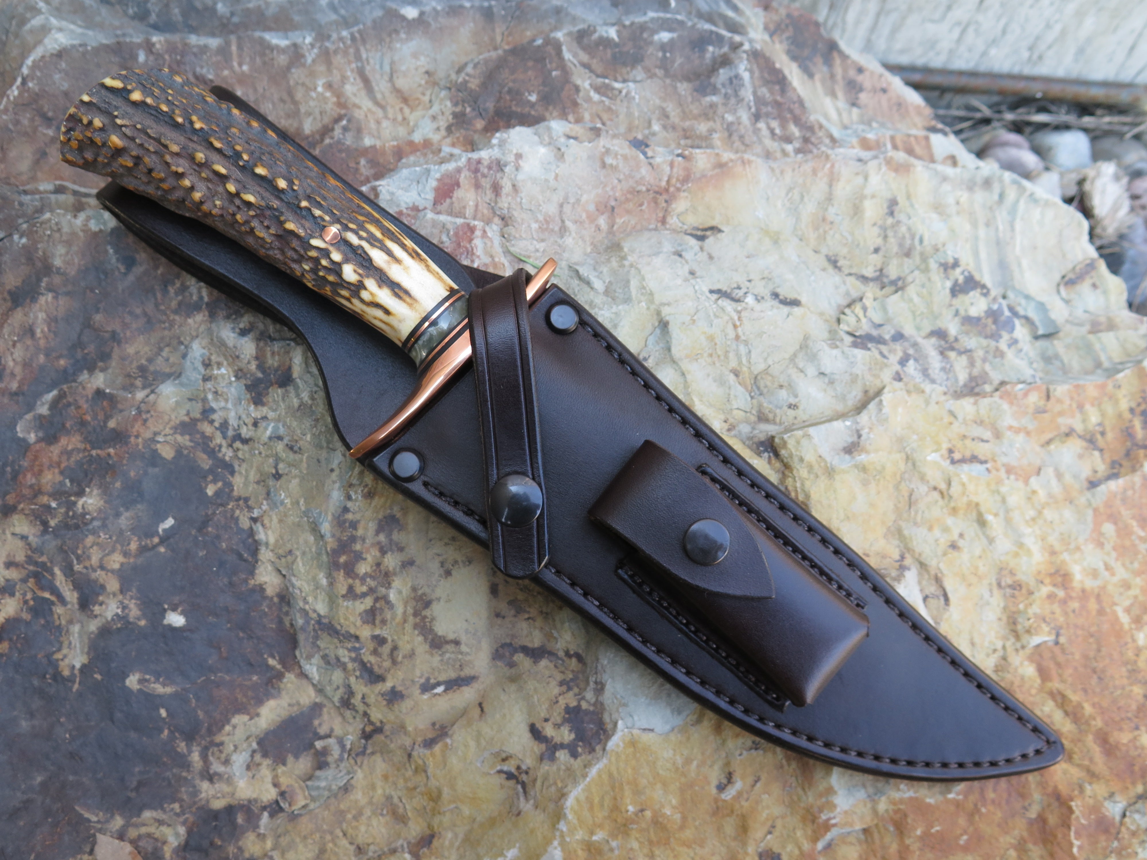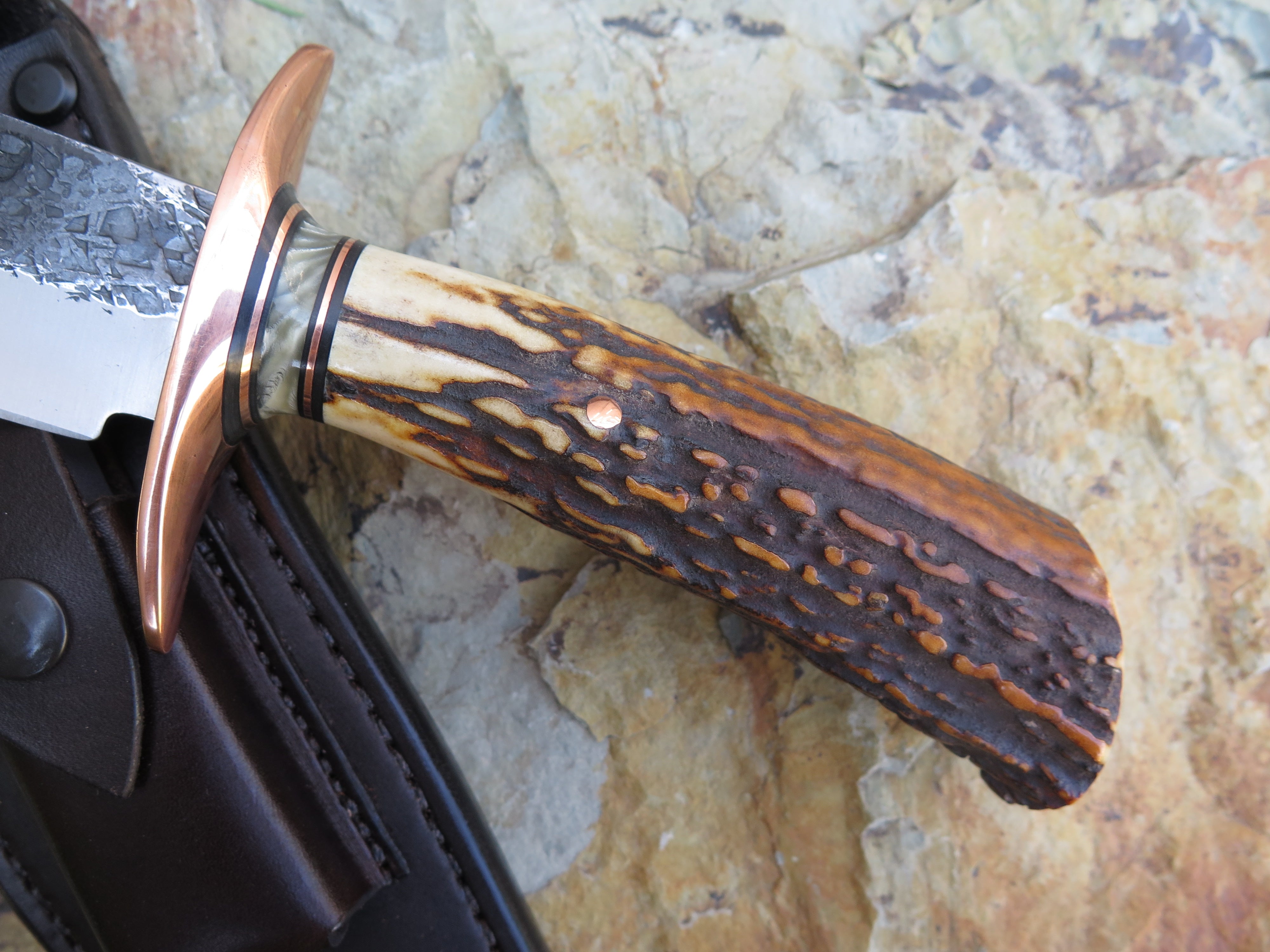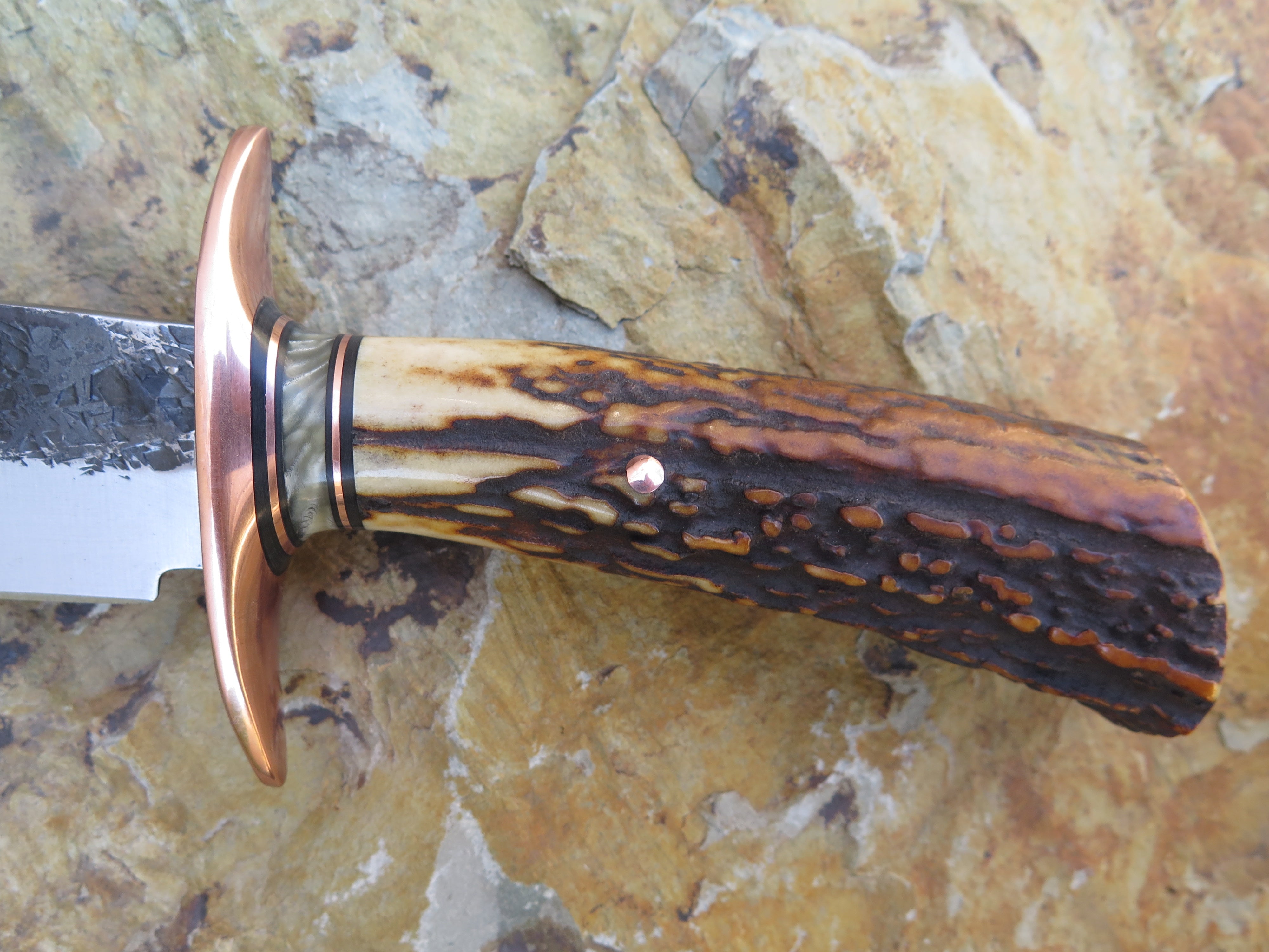 This bad ass new Fighter from Behring Made™ is hand forged from 1/4" thick high carbon 01 tool steel and it measures 7 1/2" from tip to guard with a razor sharp hollow grind and our hammermark finish. The tall copper guard is soldered in place above black fiber, copper and musk ox boss spacers which pay a remarkable compliment to the premium sambar stag handle that's also pinned with copper. The overall length measures 12 3/4" and it comes in a custom Warlander Leather sheath.