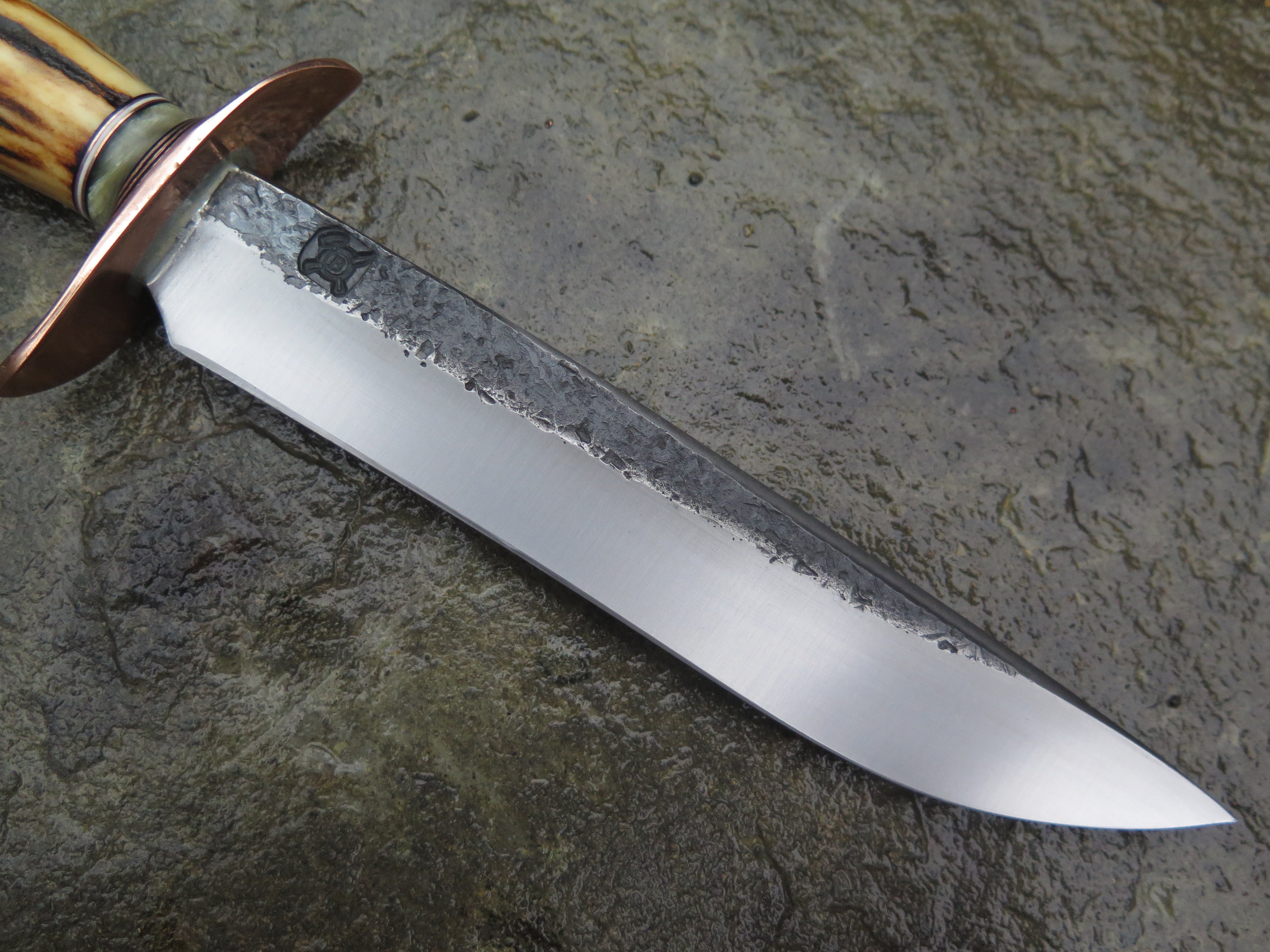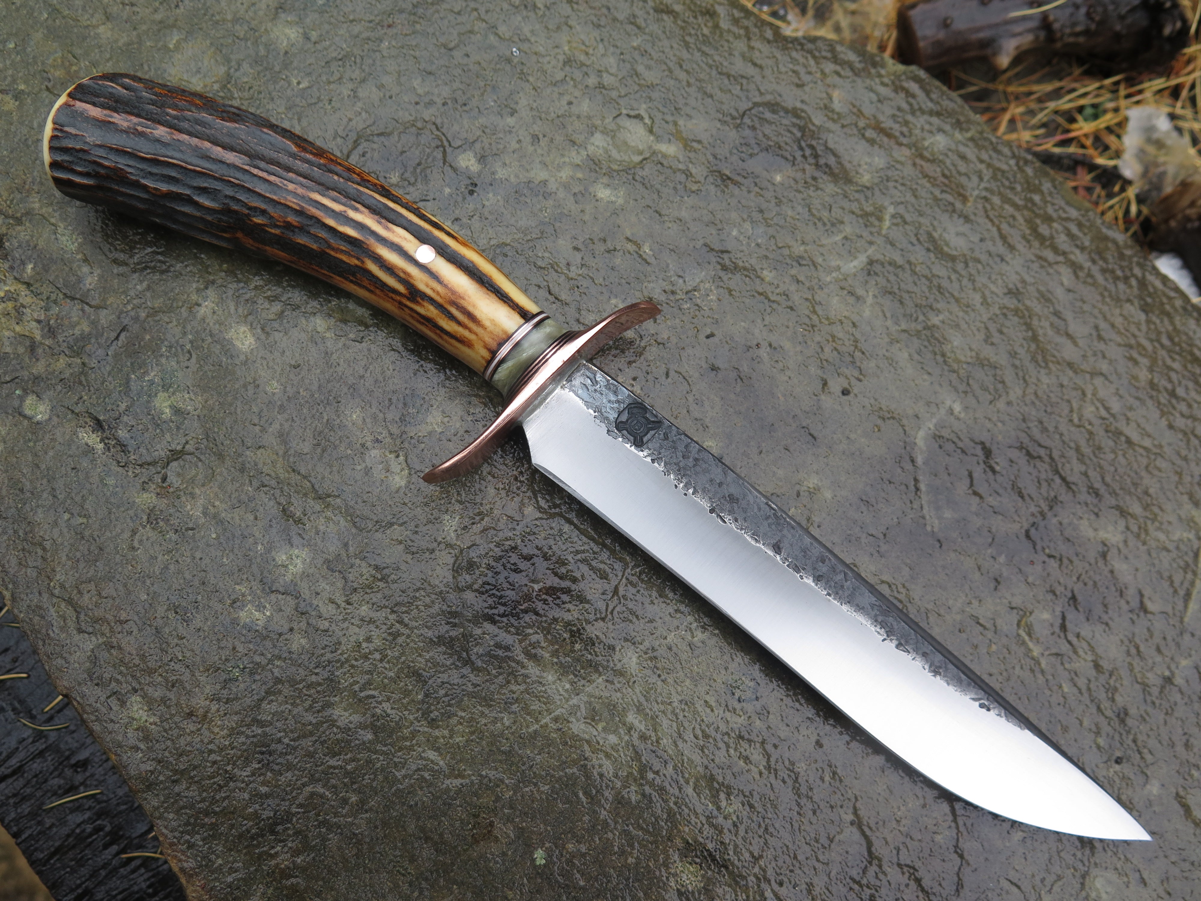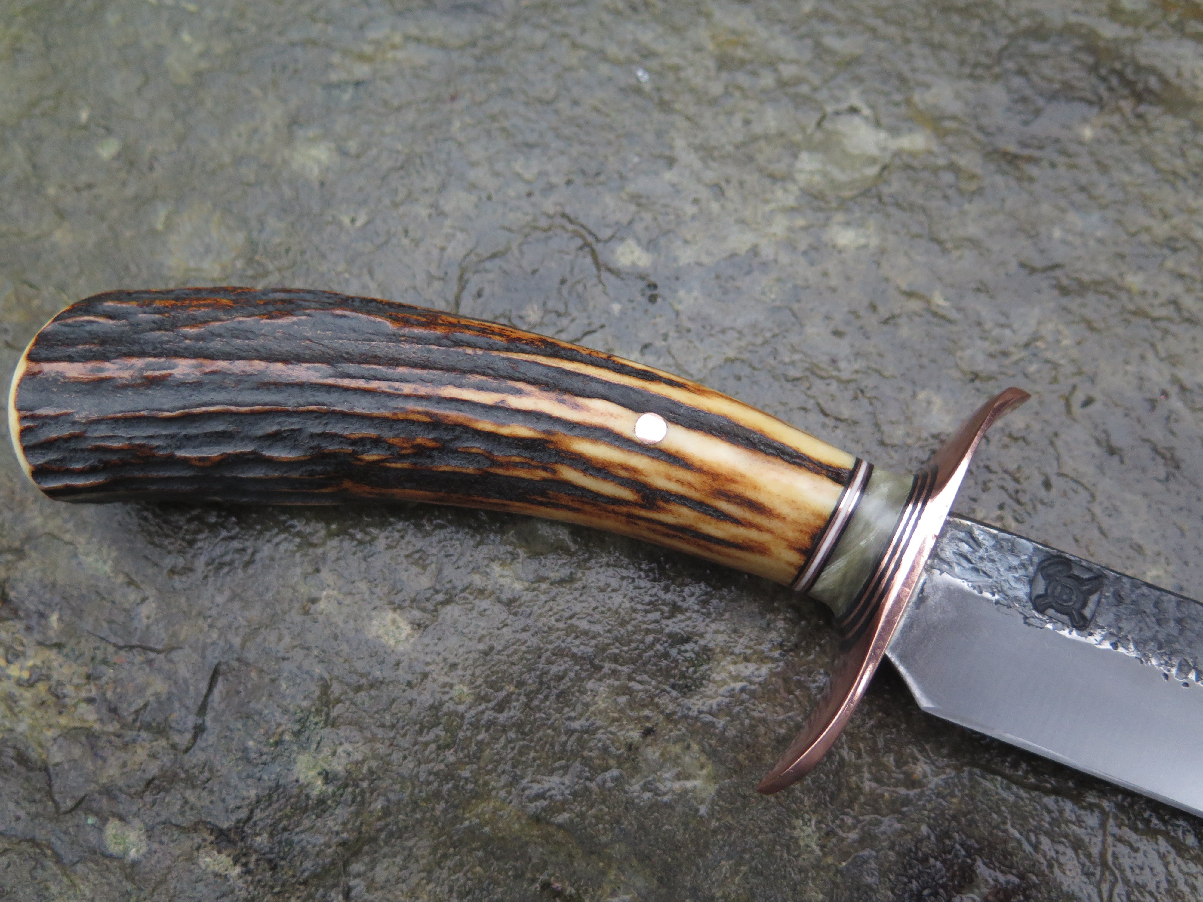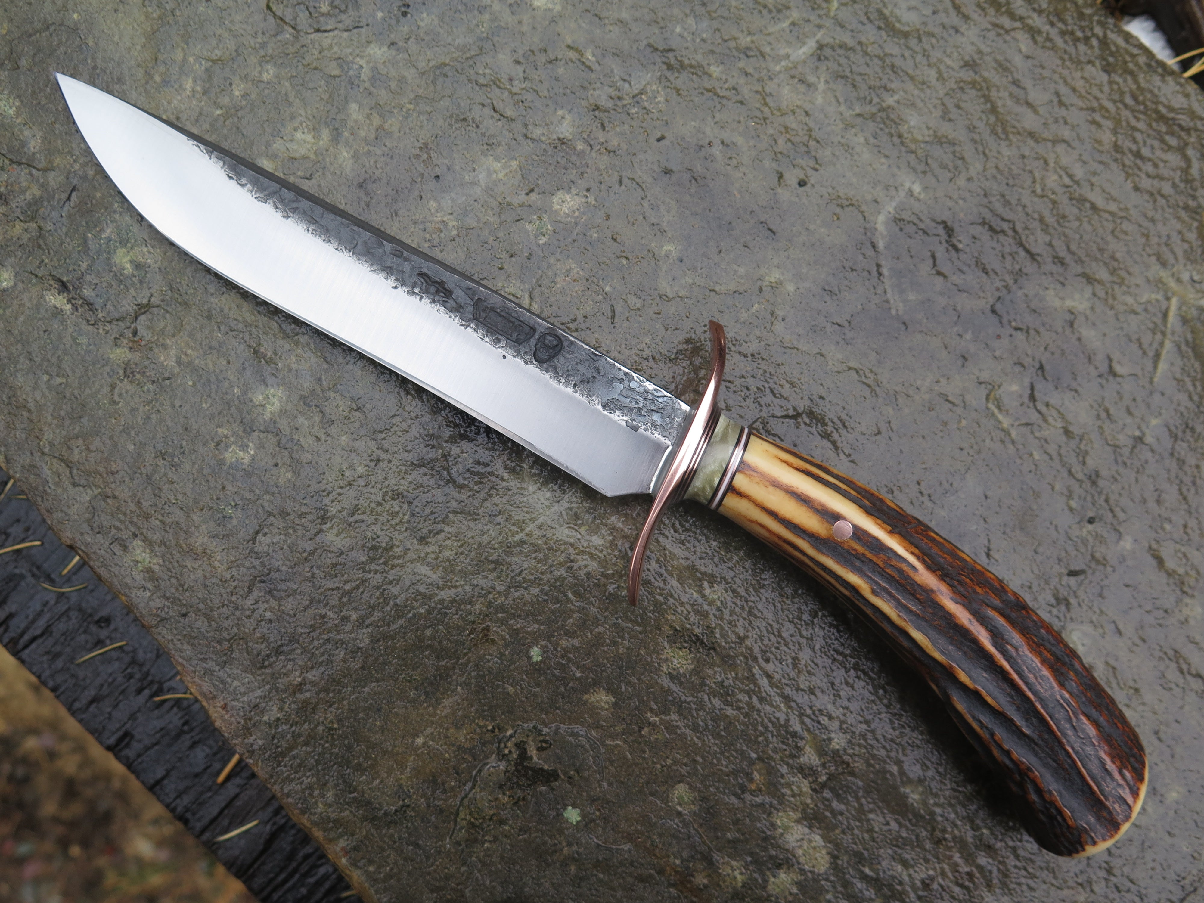 This bad ass new Field Knife from Behring Made© is hand forged from 3/16" thick high carbon 01 tool steel and it measures 6 1/2" from tip to guard with a razor sharp hollow grind and our hammermark finish. The forged copper s-guard is soldered in place above black and white fiber, copper and musk ox boss spacers. The premium sambar stag handle is pinned through the tang with copper and overall length measures out to 11".