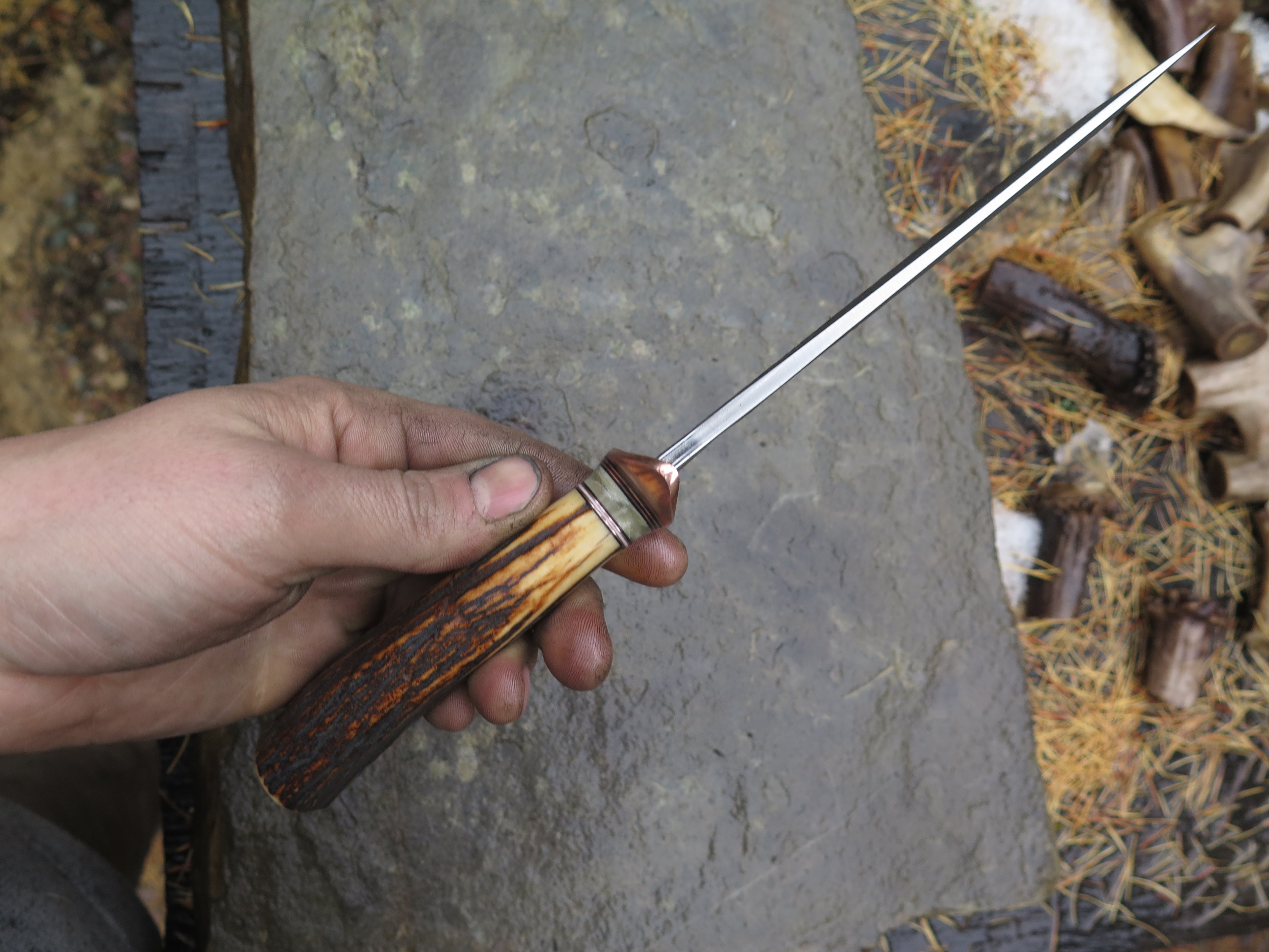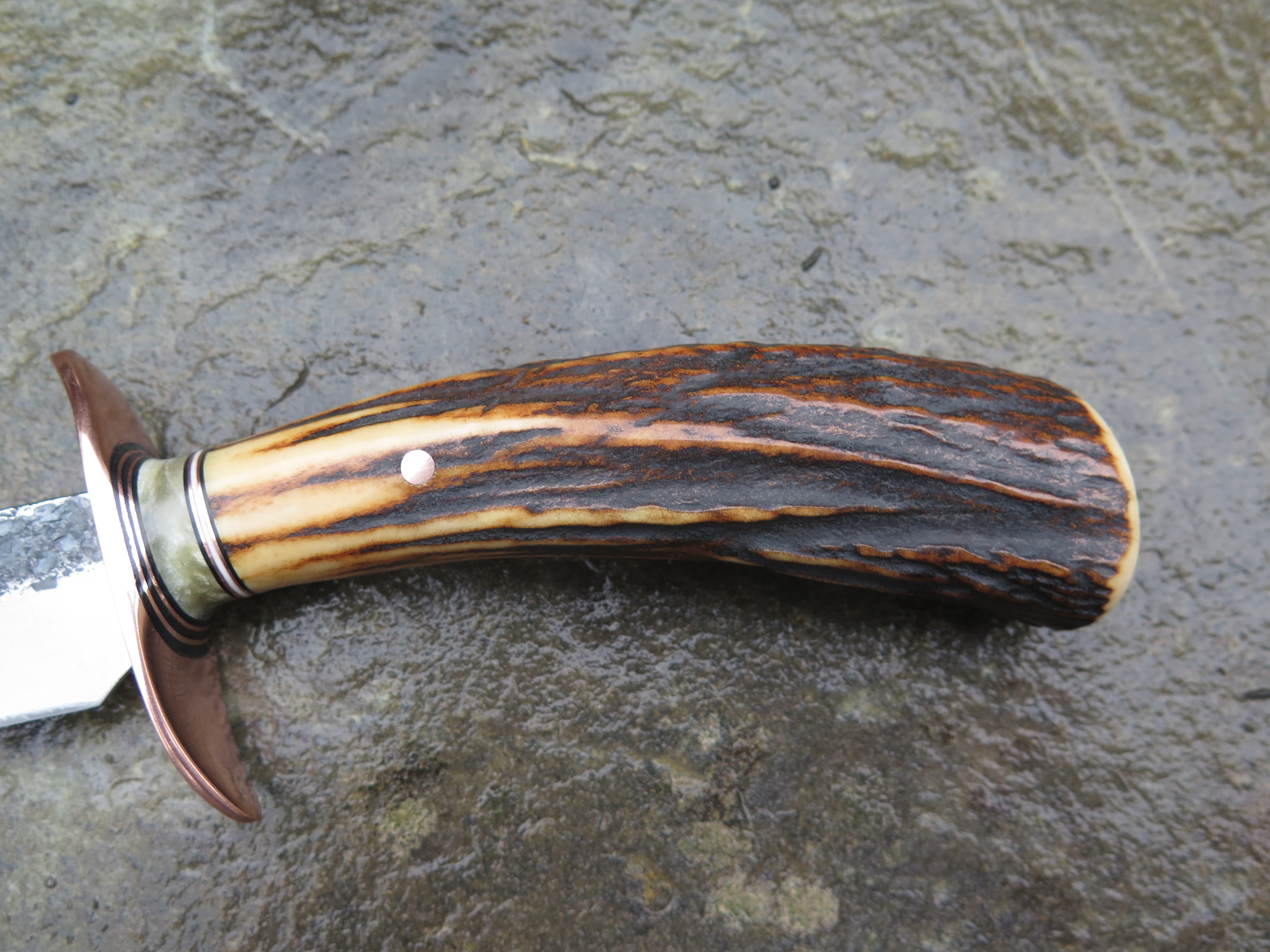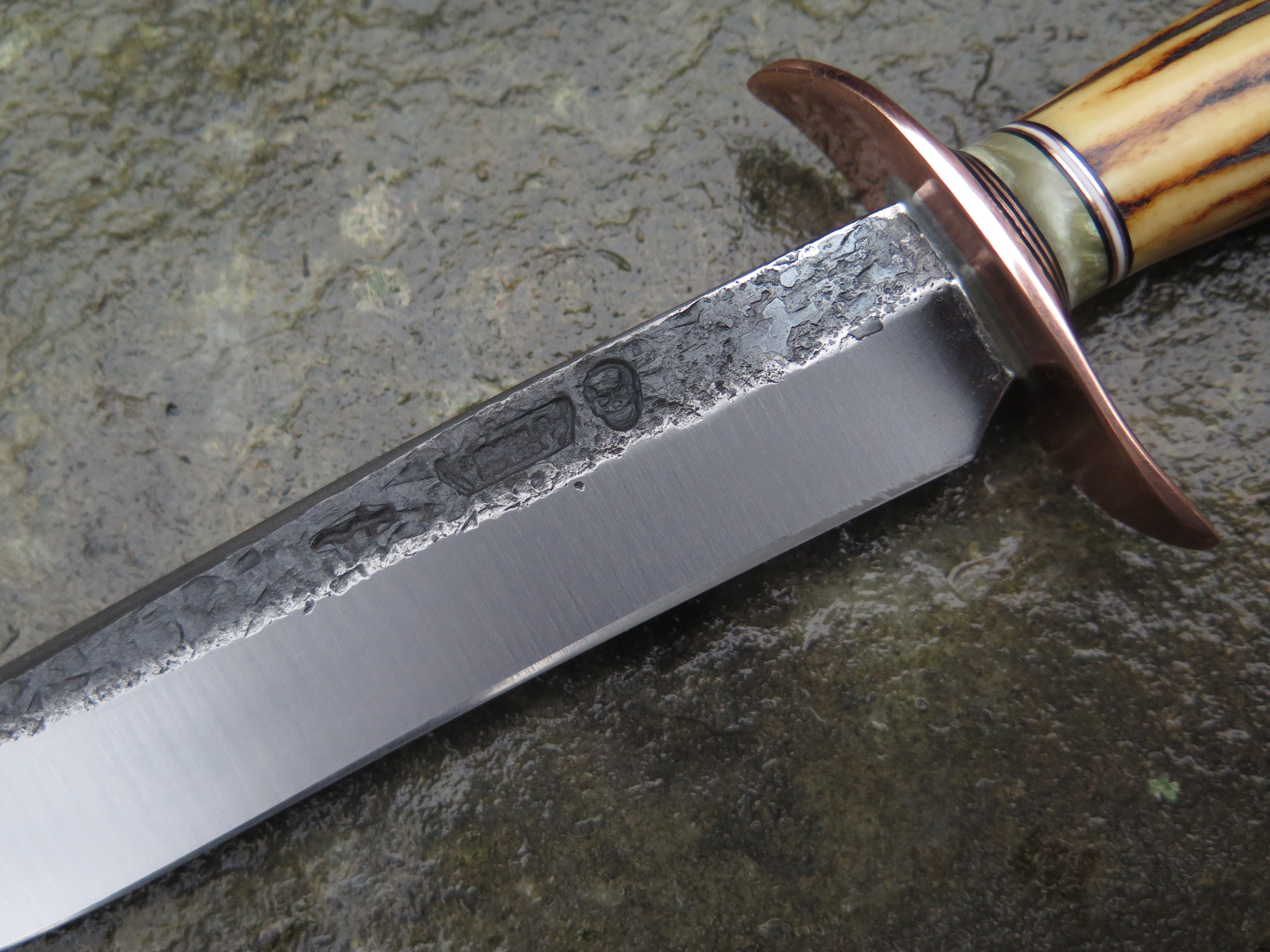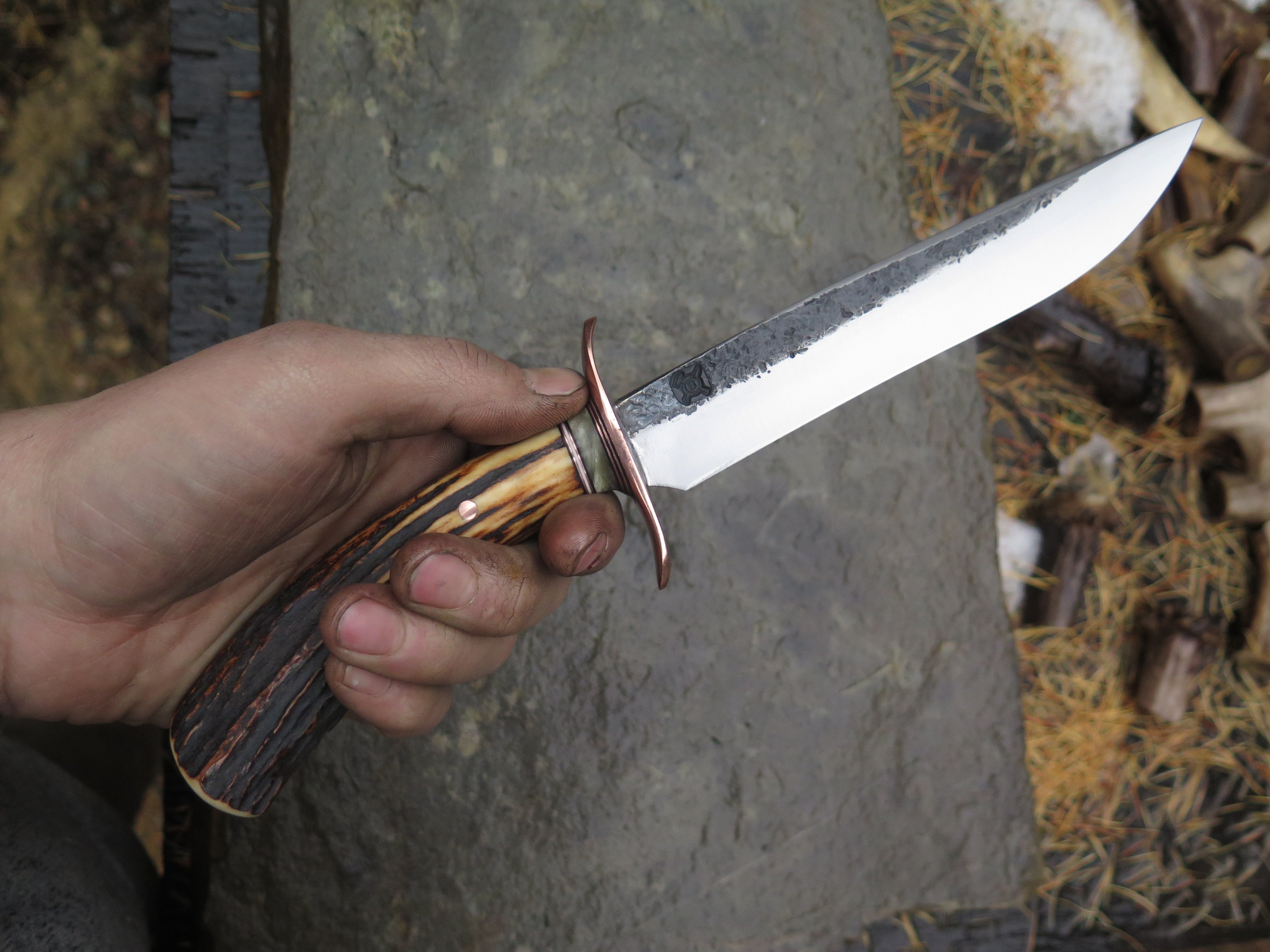 This bad ass new Field Knife from Behring Made© is hand forged from 3/16" thick high carbon 01 tool steel and it measures 6 1/2" from tip to guard with a razor sharp hollow grind and our hammermark finish. The forged copper s-guard is soldered in place above black and white fiber, copper and musk ox boss spacers. The premium sambar stag handle is pinned through the tang with copper and overall length measures out to 11".