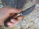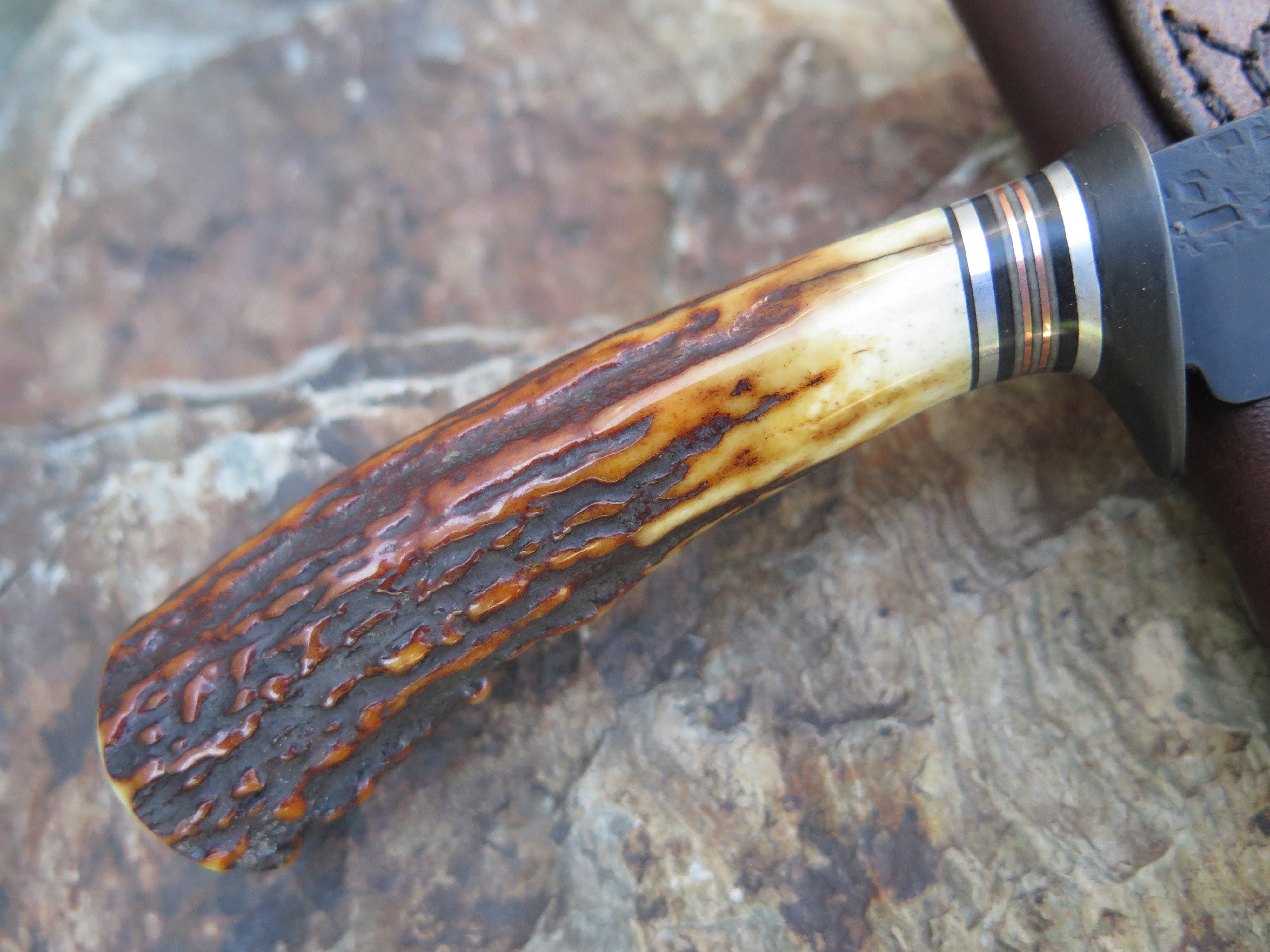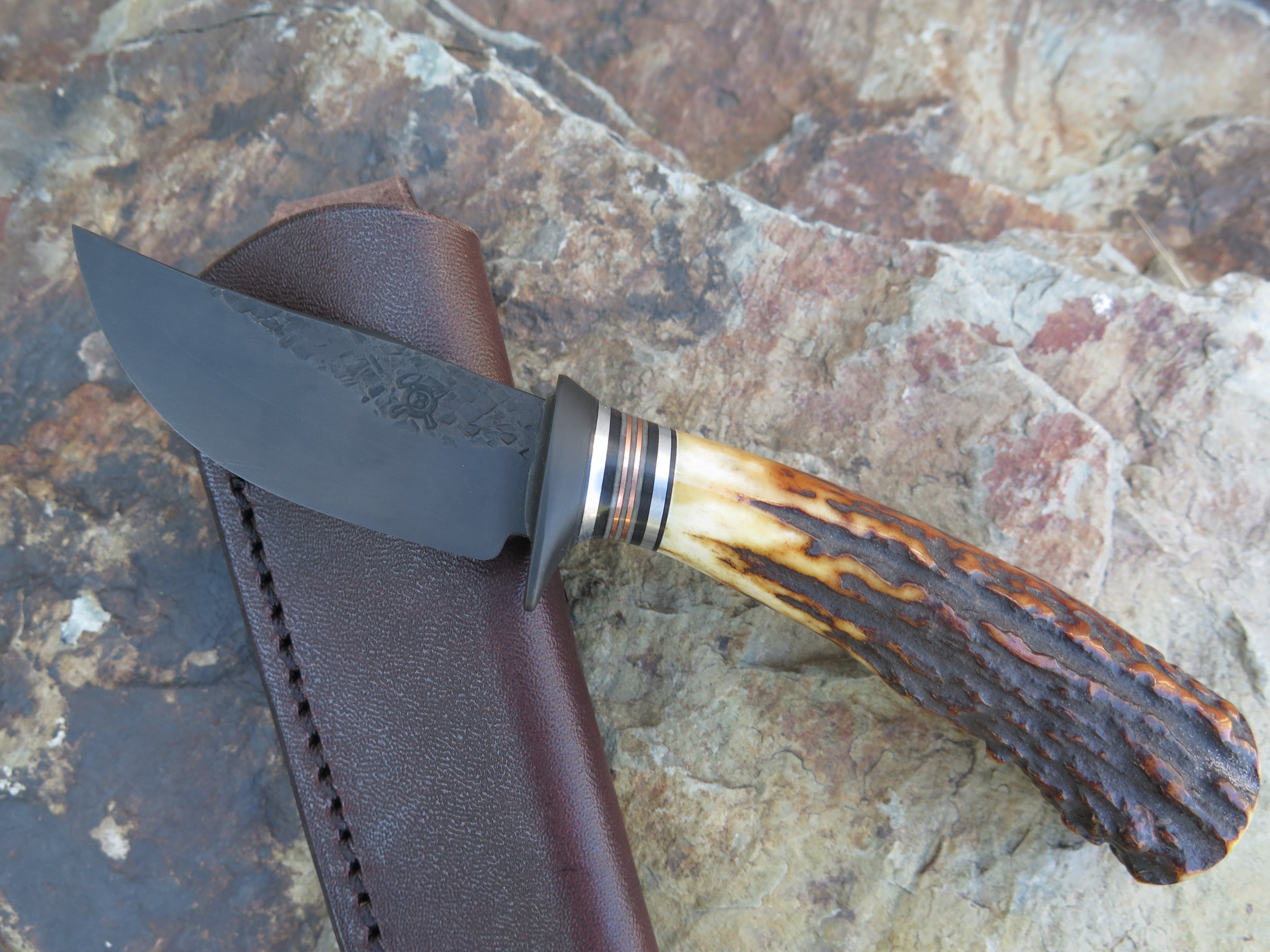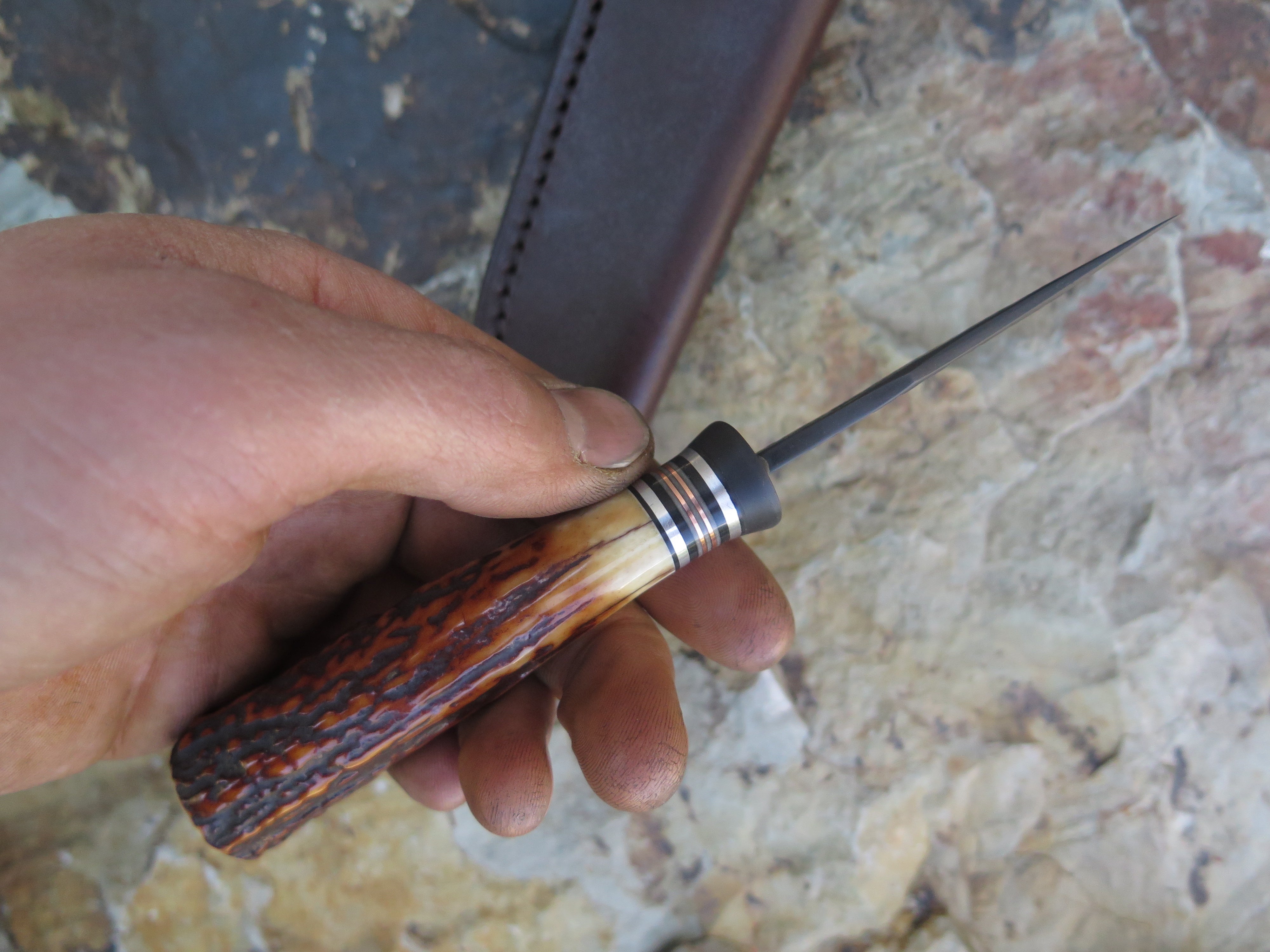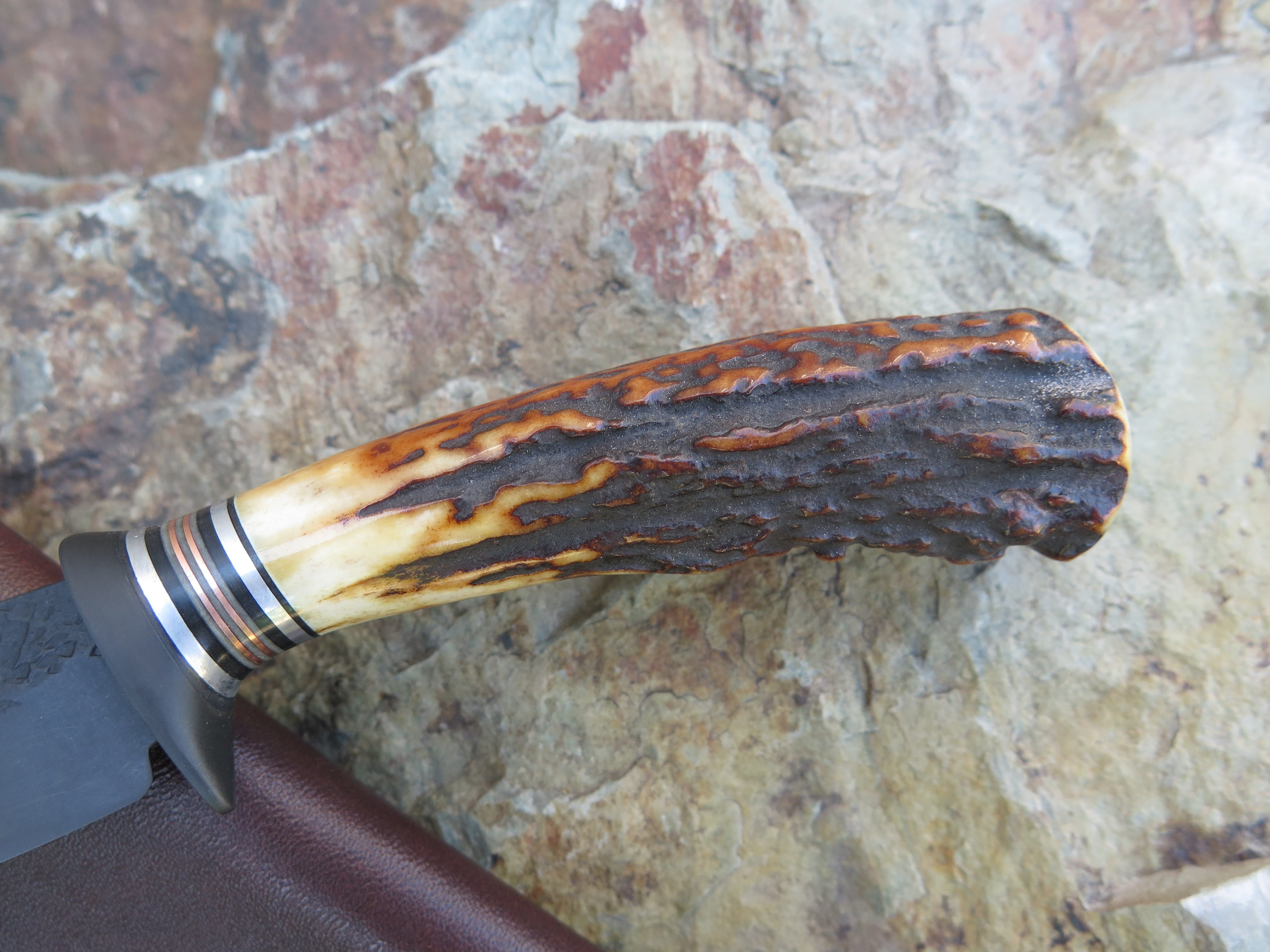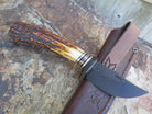 This bad ass new Sharptail from Behring Made© is hand forged from 1/8" thick high carbon 01 tool steel and it measures 2 3/4" from tip to guard with a razor sharp hollow grind, hammermarks and our forced patina blued finish. The blued steel guard is soldered in place above black fiber, copper and aluminum spacers as well as a premium sambar stag handle with a perfect texture and color tone. The overall length measures just over 6 1/2" and it come sin a