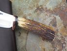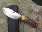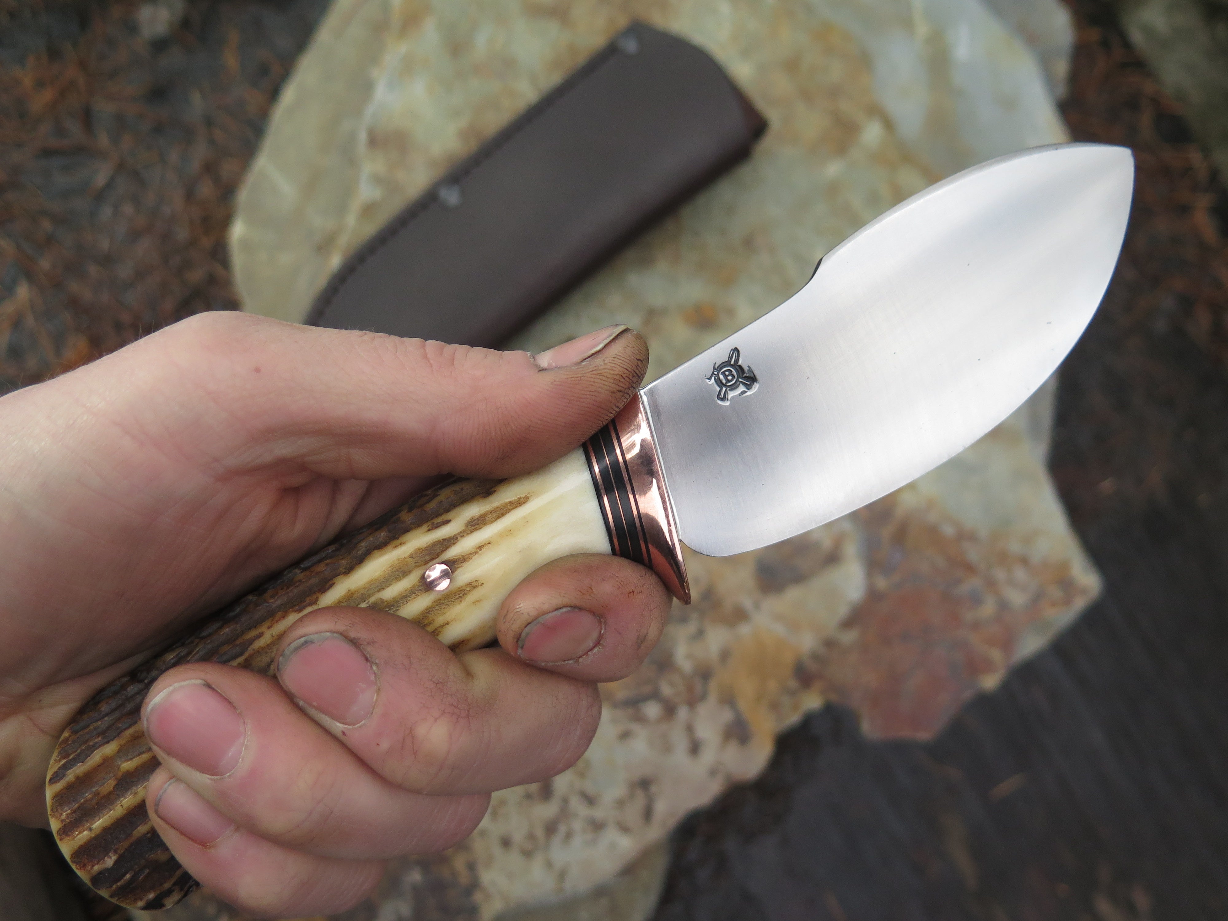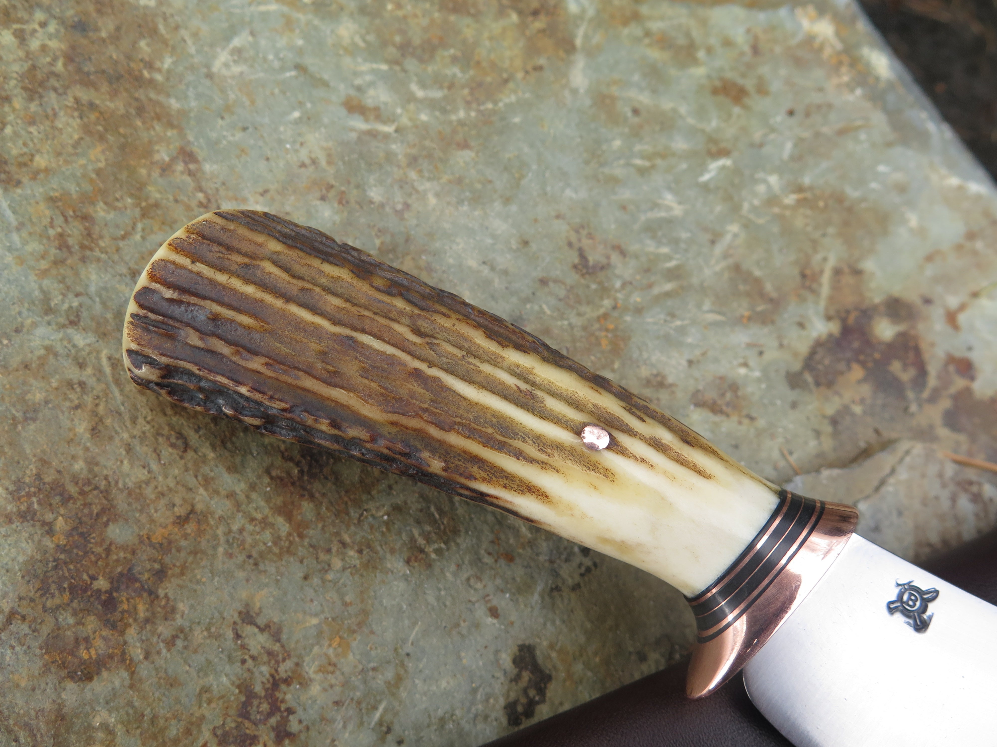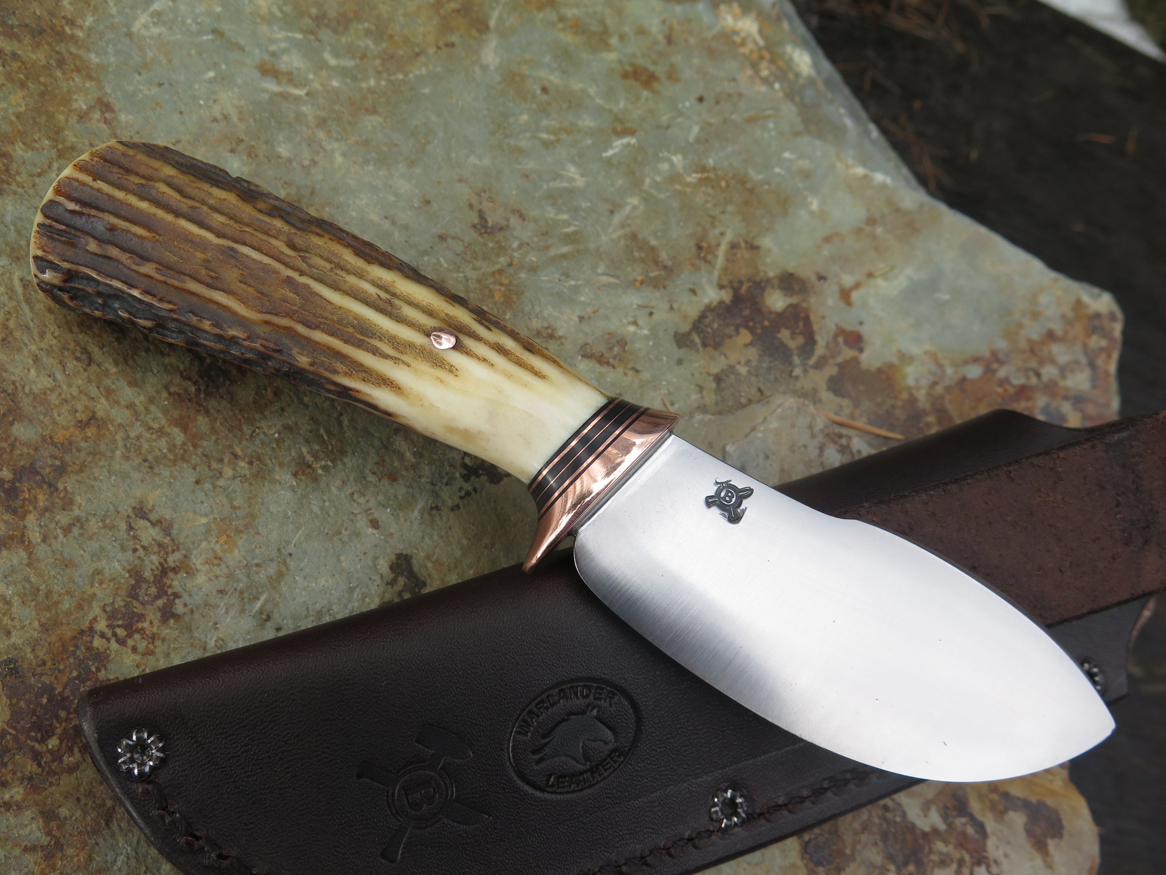 This instant classic from Behring Made© is the Canoe Knife. It's hand forged from 3/16" thick high carbon 01 tool steel and it measures 4" from tip to guard with a razor sharp true convex grind. The copper guard is soldered in place above a clean stack of black fiber and copper spacers with a premium sambar stag handle that's pinned through the tang with copper. The overall length measures 8 1/8" and it comes in a leather belt pouch sheath.