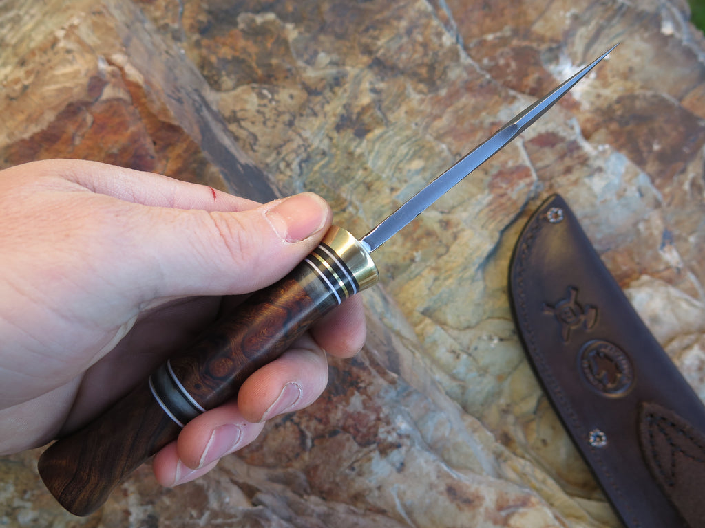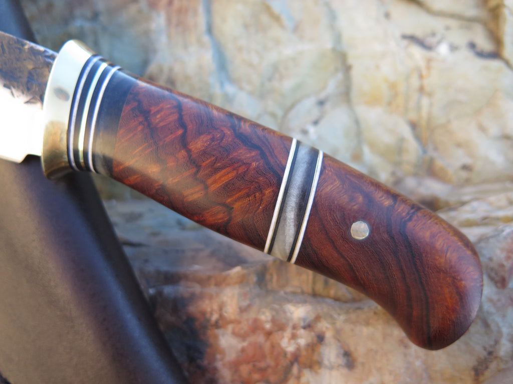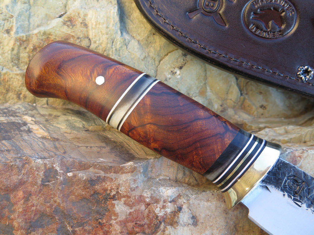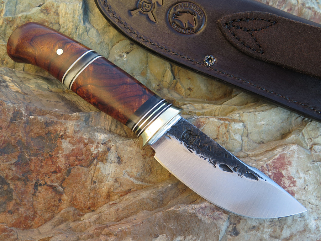 This beautiful new Woodcraft from Behring Made™ is hand forged from 3/16" thick high carbon 01 tool steel and it measures 3 1/2" from tip to guard with a razor sharp hollow grind and a hammermark finish. The brass guard is soldered in place above black and white fiber with brass and two Dall sheep horn spacers with incredible figure. The two-piece handle is constructed with premium desert ironwood burl, plus it's pinned through the tang with brass for a rock solid construction that we guarantee for life. The overall length measures 7 7/8" and it comes in pouch sheath from Warlander Leather.