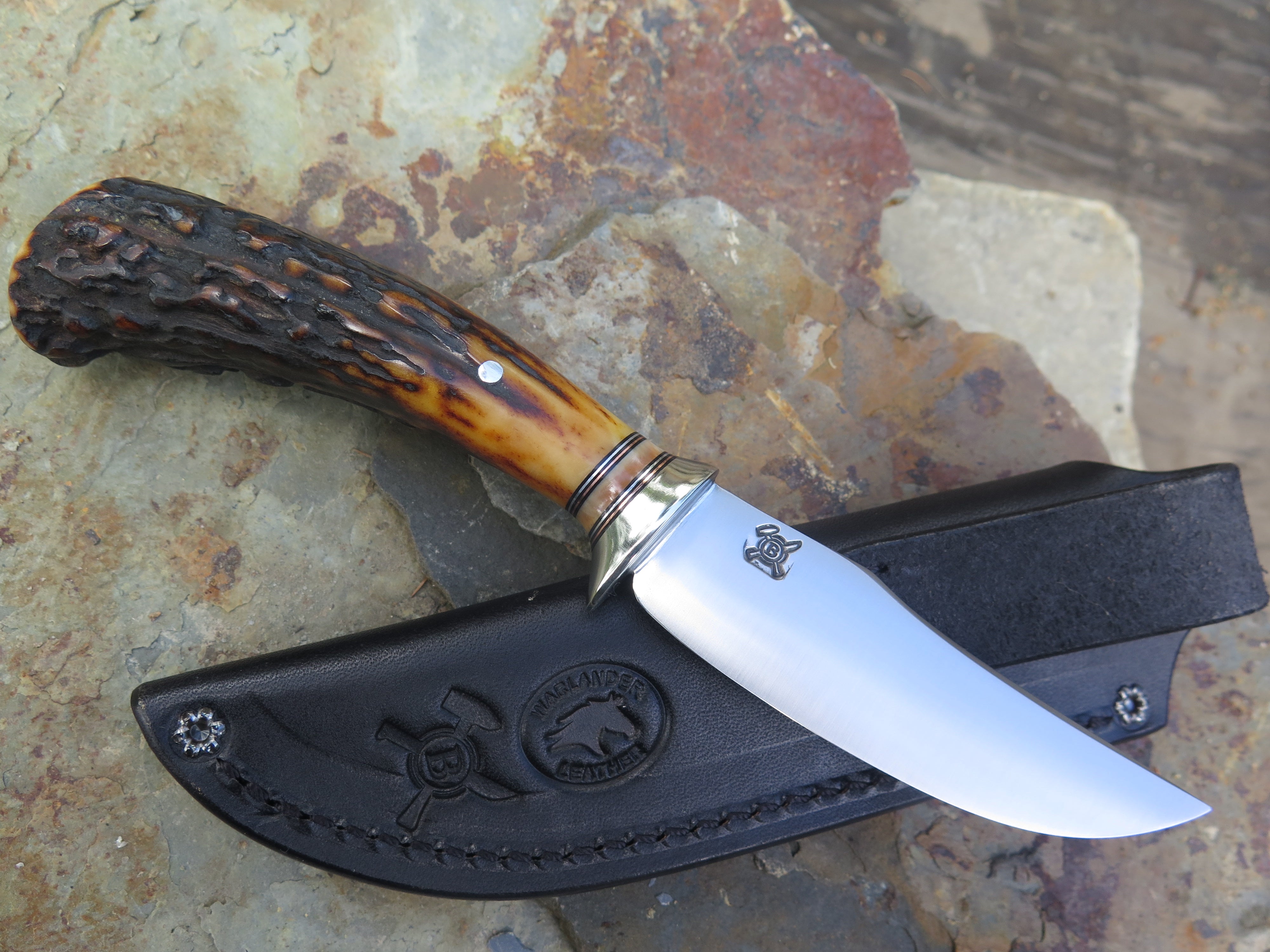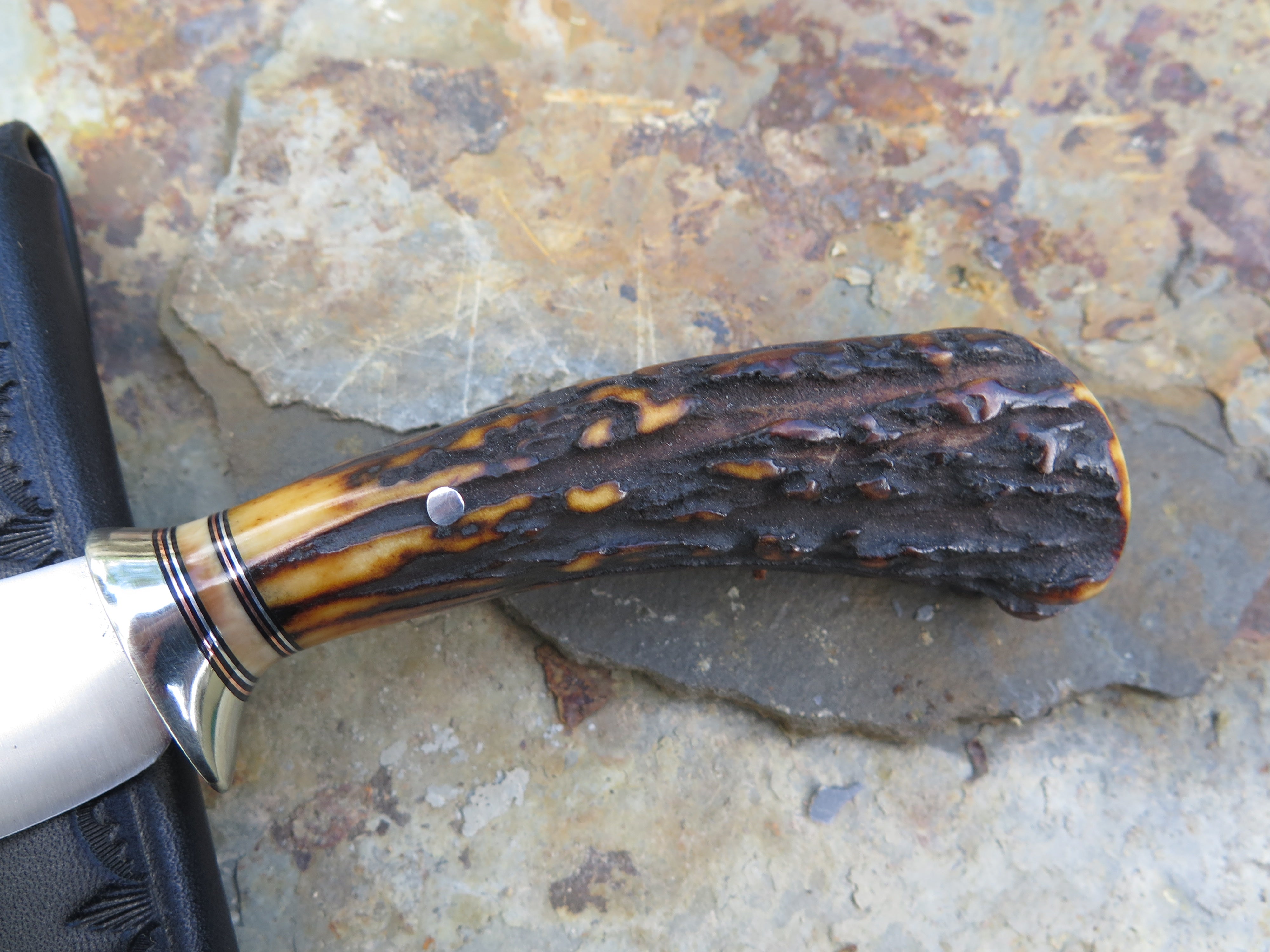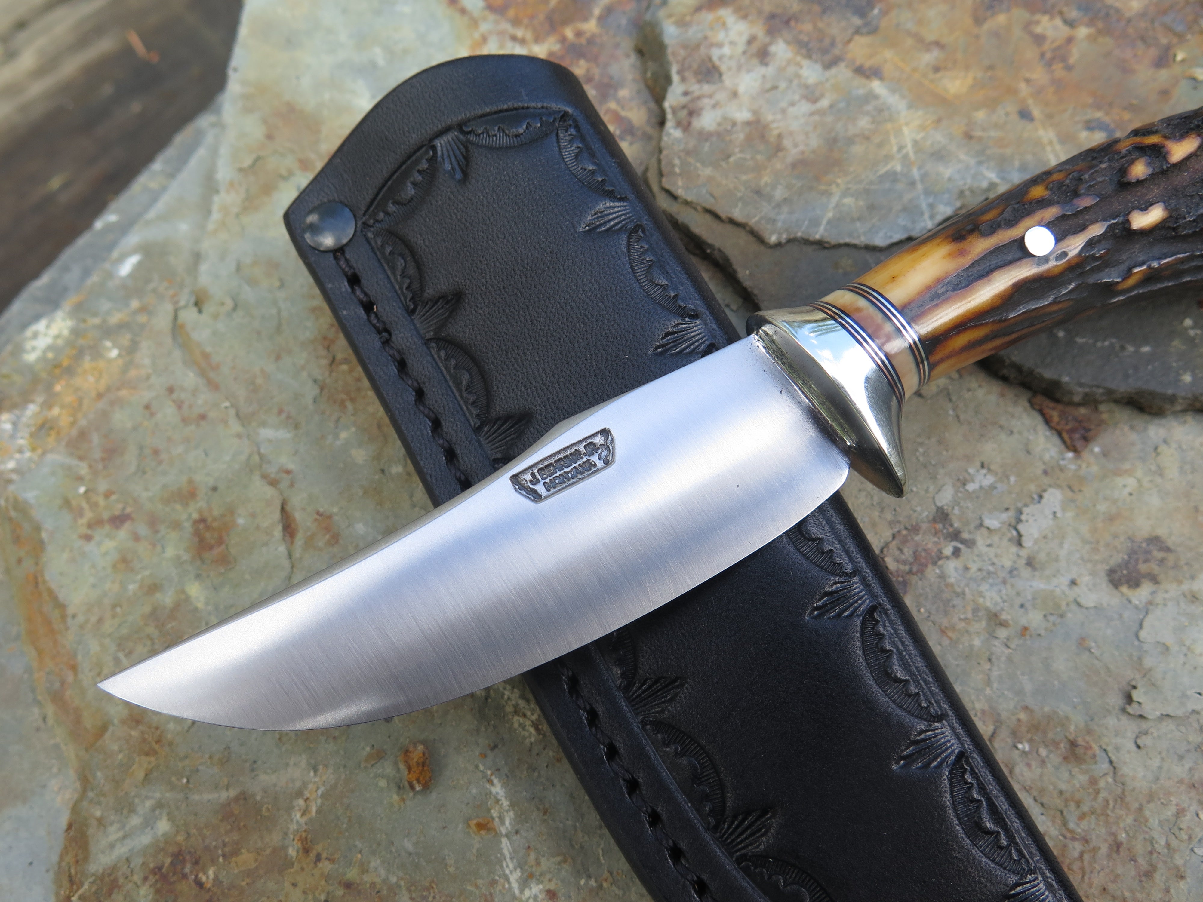 This outstanding new Clip Point from Behring Made© is hand forged from 1/8" thick high carbon 01 tool steel and it measures 3 1/2" from tip to guard with a razor sharp convex grind. The nickel silver guard is soldered in place above black fiber, copper, aluminum and fossil walrus ivory spacers as well as a beautiful sambar stag handle with an aggressive texture that stag-lovers go nuts for. The aluminum pin runs through the tang, overall length measures 7 7/8" and we've got it fit in a tooled belt pouch sheath. Nice!