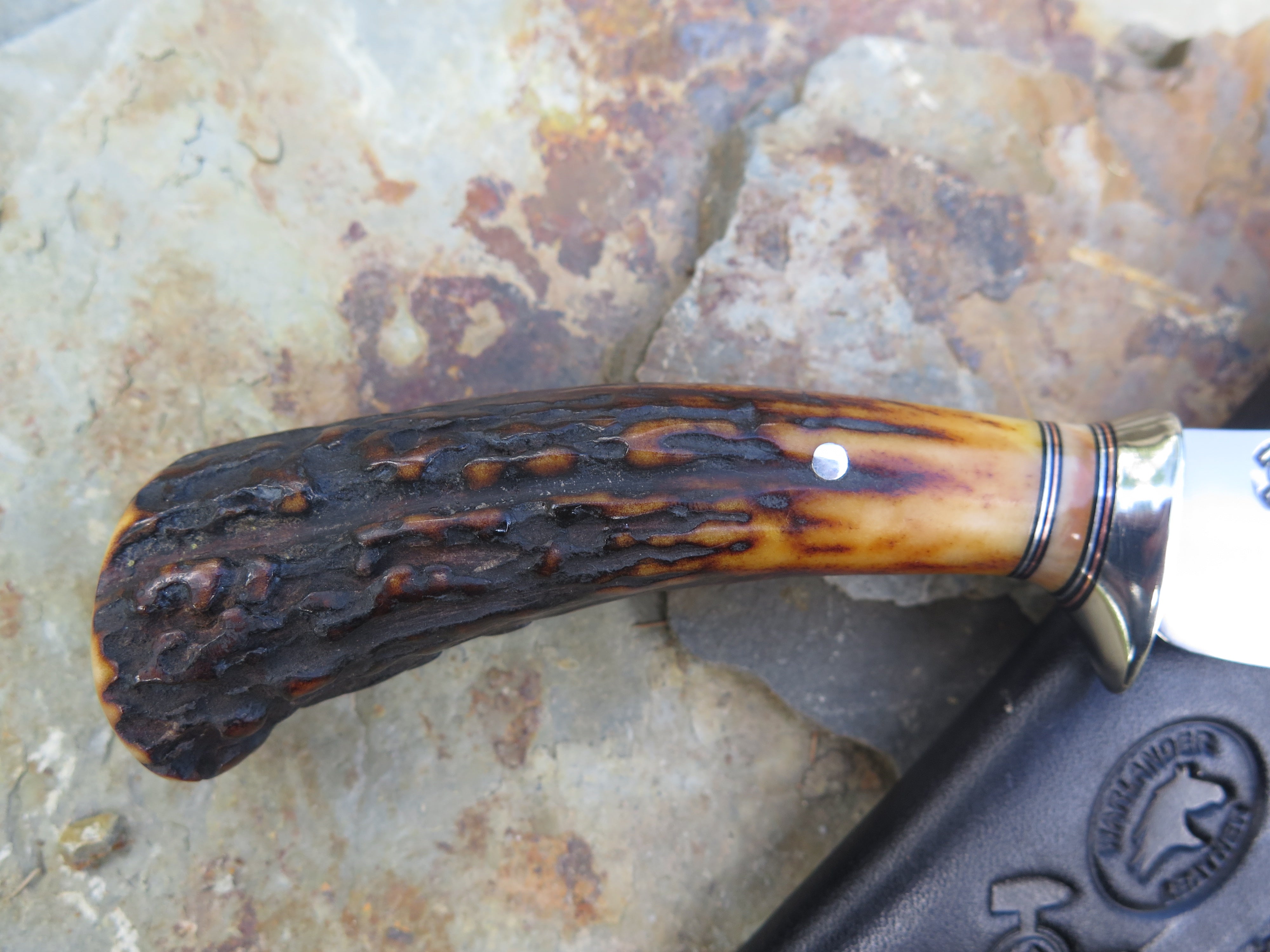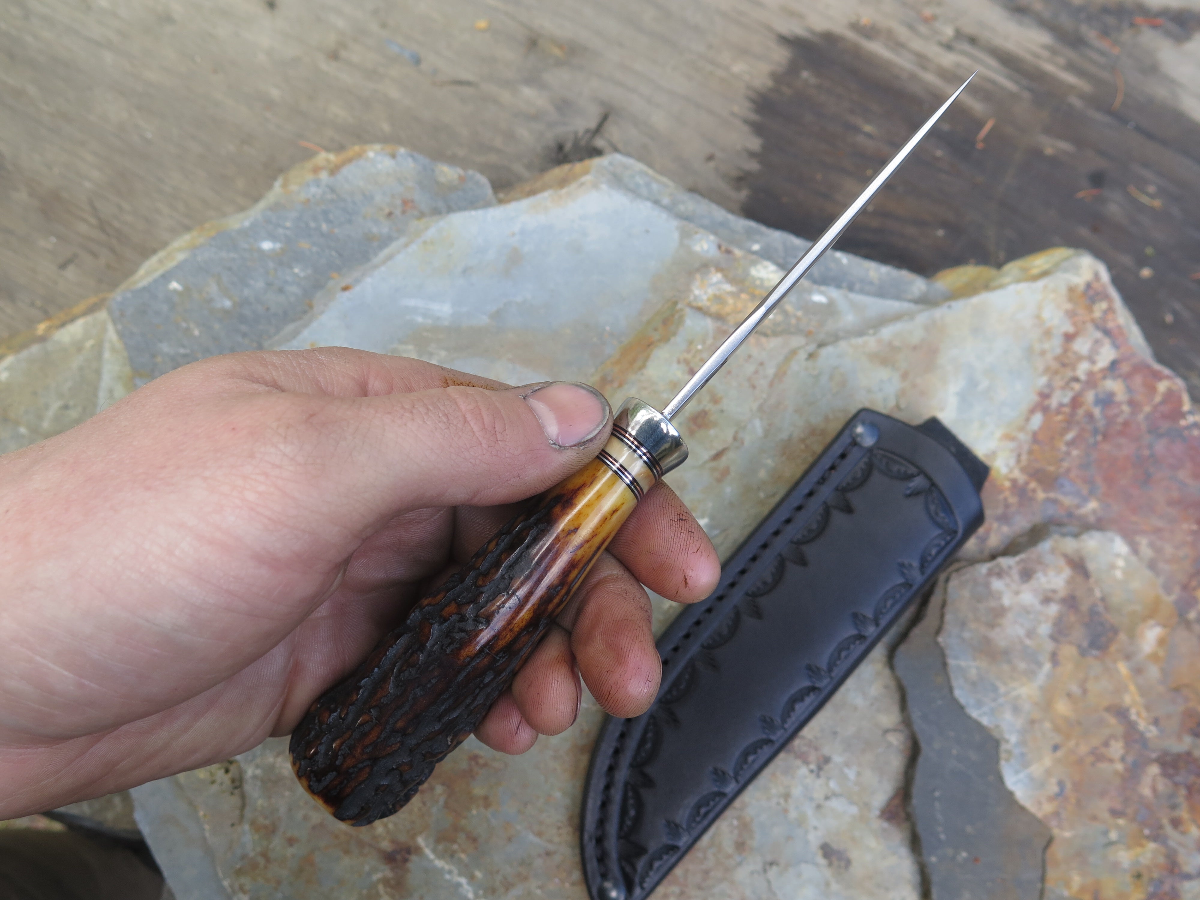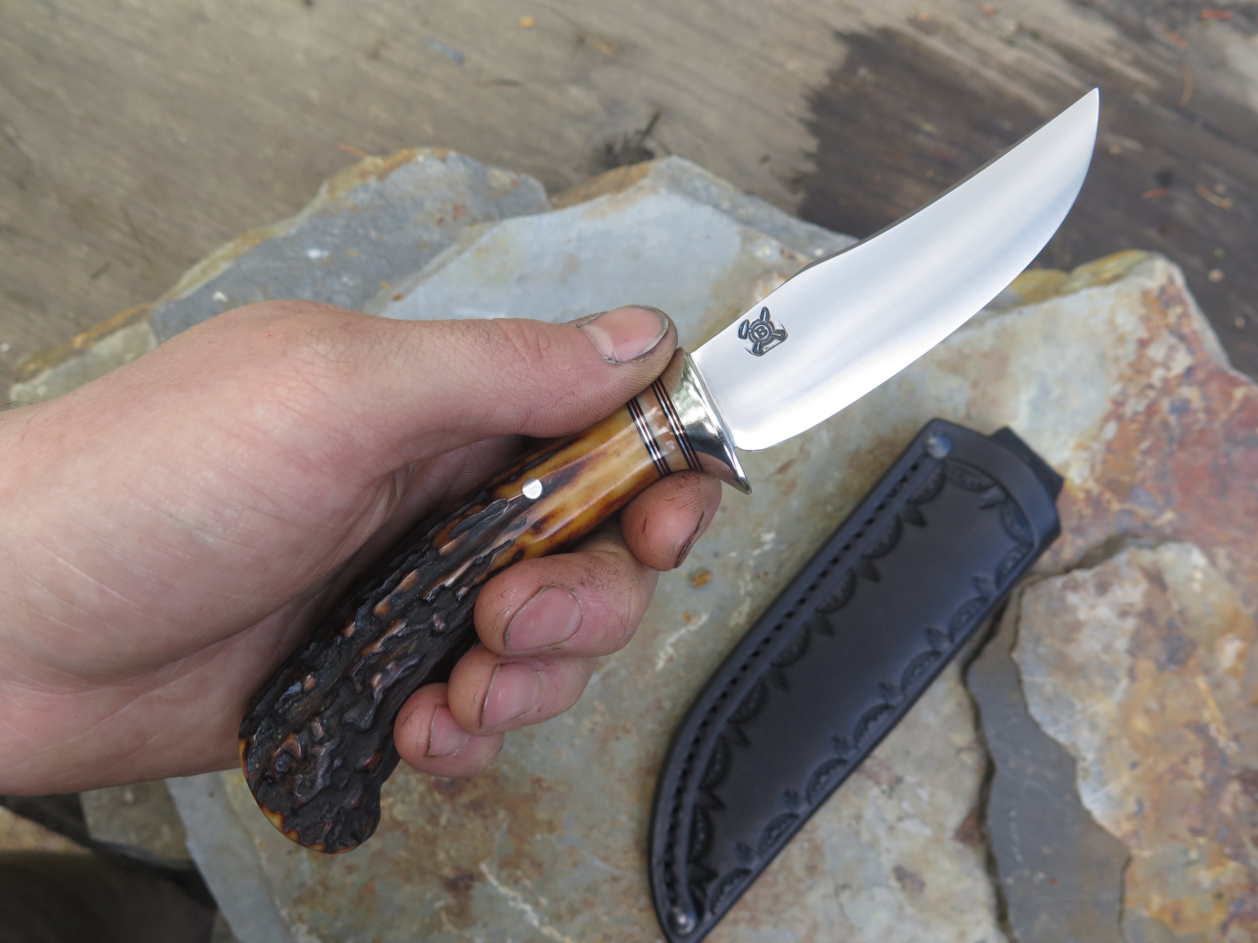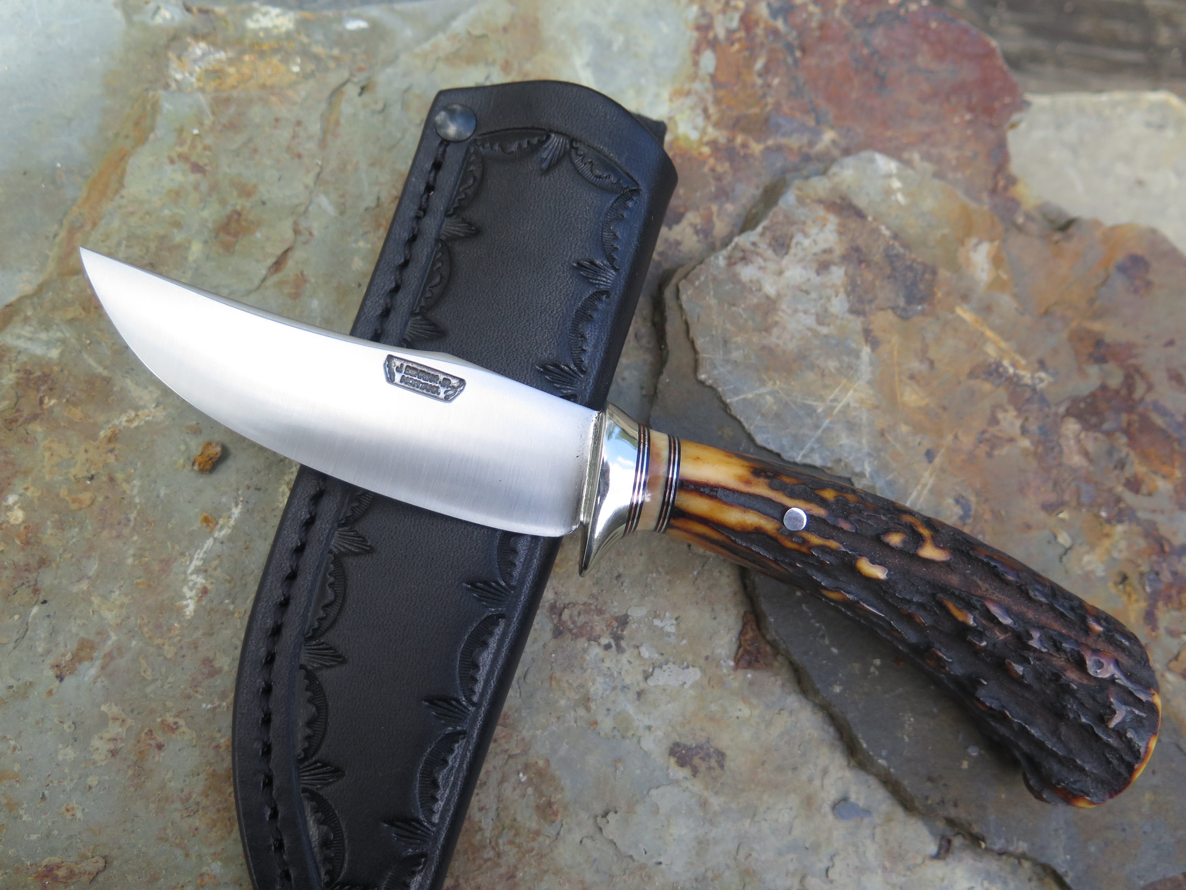 This outstanding new Clip Point from Behring Made© is hand forged from 1/8" thick high carbon 01 tool steel and it measures 3 1/2" from tip to guard with a razor sharp convex grind. The nickel silver guard is soldered in place above black fiber, copper, aluminum and fossil walrus ivory spacers as well as a beautiful sambar stag handle with an aggressive texture that stag-lovers go nuts for. The aluminum pin runs through the tang, overall length measures 7 7/8" and we've got it fit in a tooled belt pouch sheath. Nice!