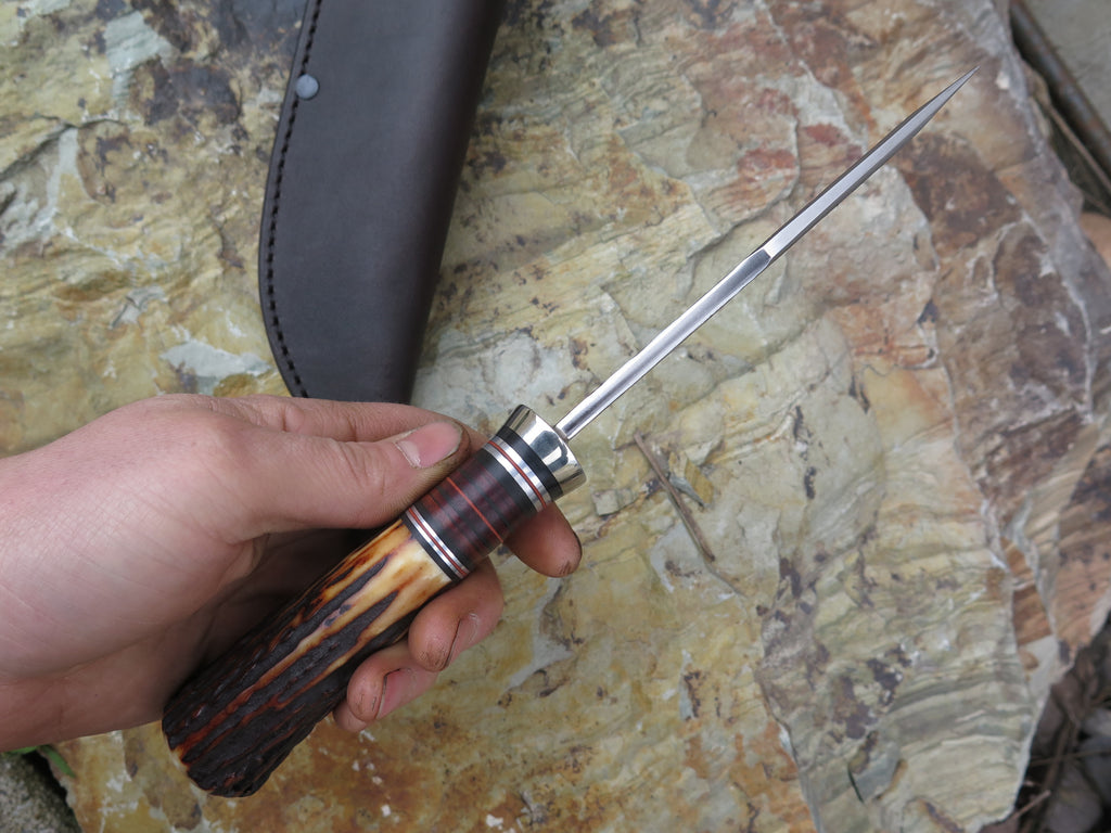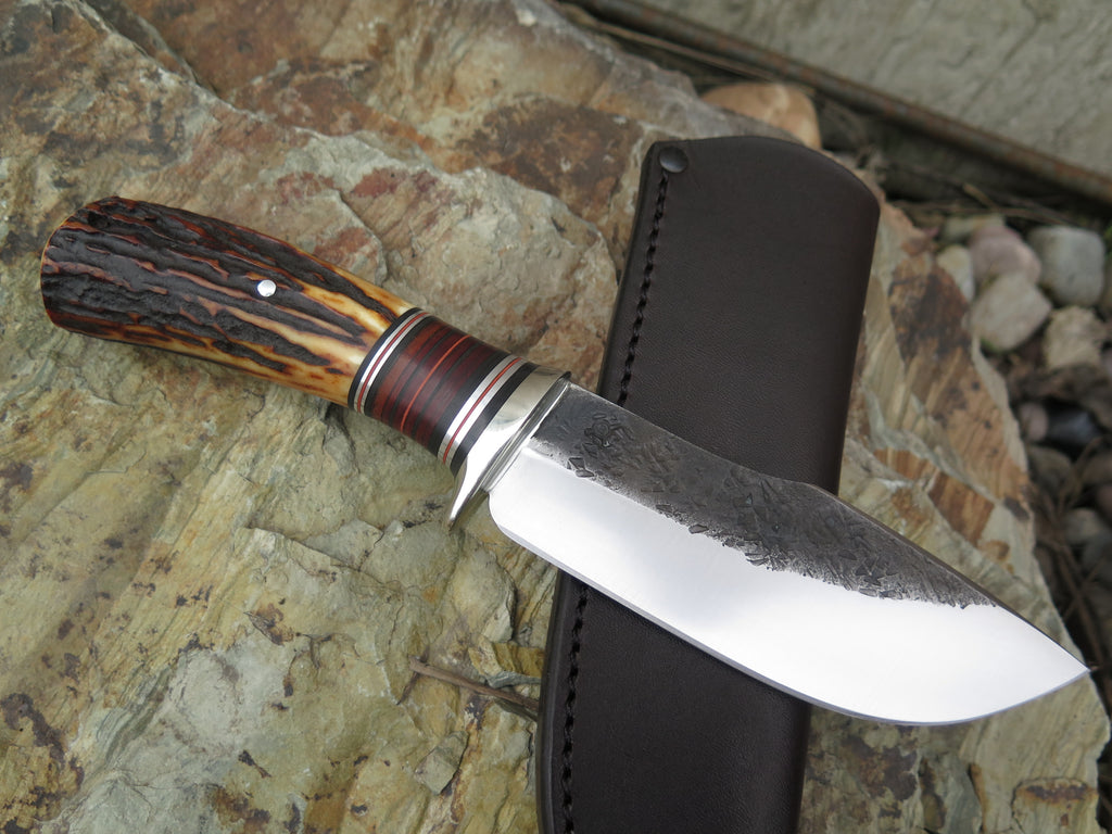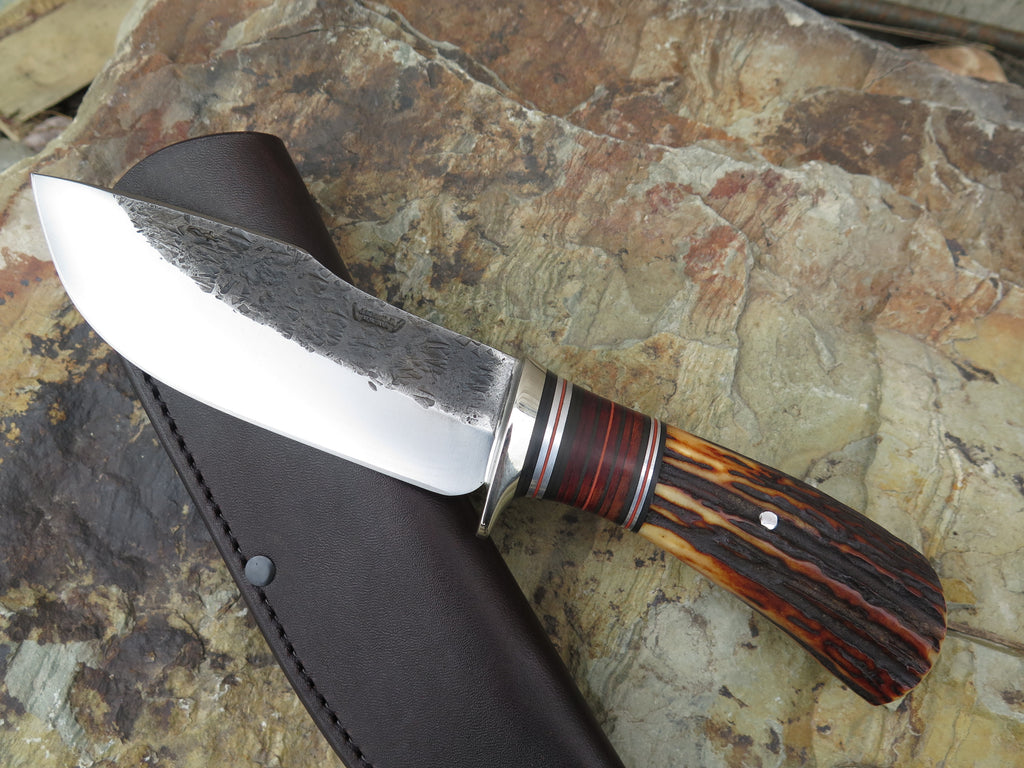 This incredible new one from Behring Made© is the Woodcraft, and we hand forged this fat boy from 3/16" thick high carbon 01 tool steel and it measures 5 1/2" from tip to guard with a razor sharp hollow grind and our hammermark finish. The nickel silver guard is soldered in place above black and maroon fiber, horsehide and aluminum spacers in addition to the grand slam handle made from premium sambar stag. Overall length measures 10" and it also comes in a Warlander Leather pouch sheath.