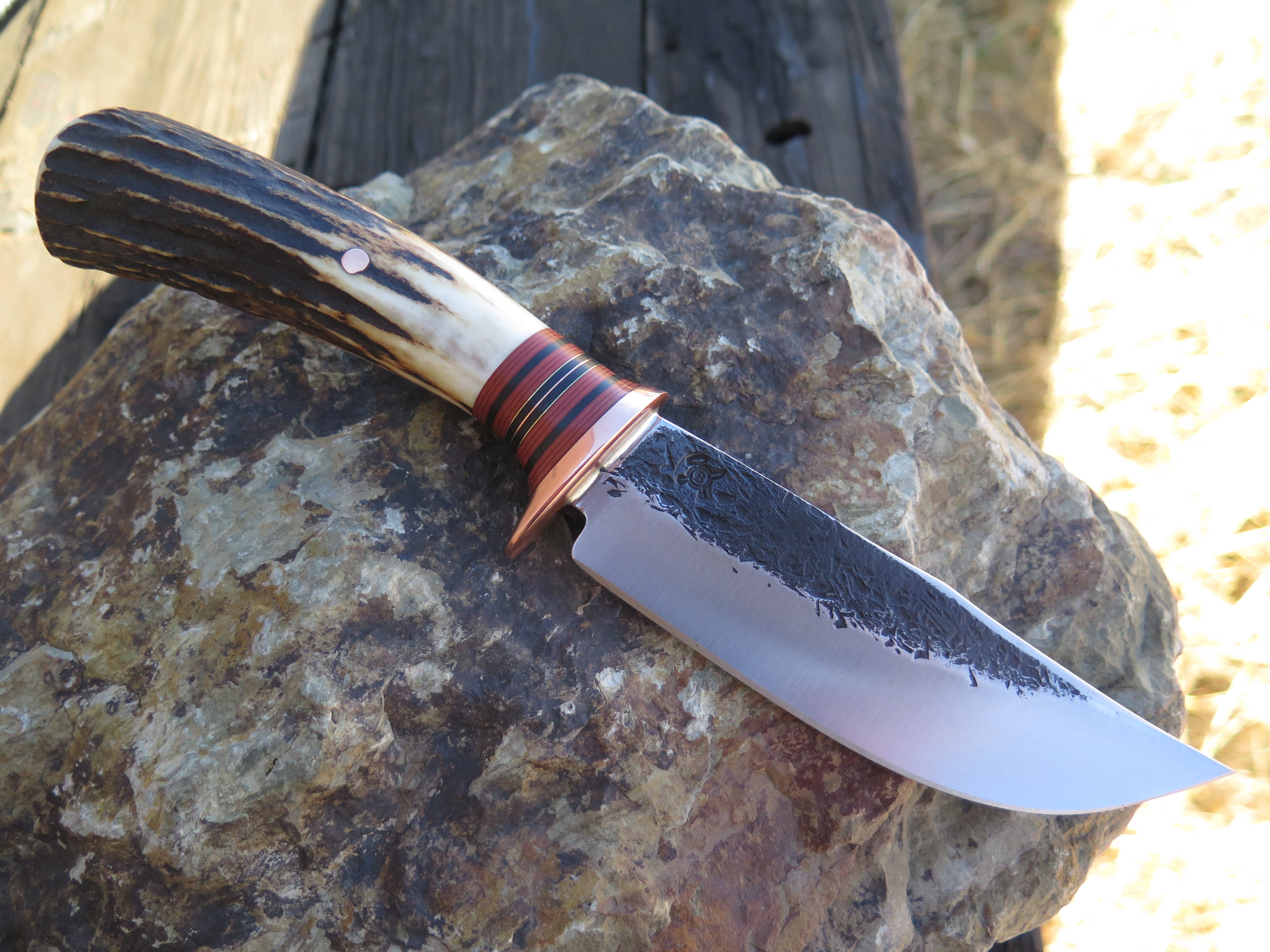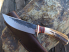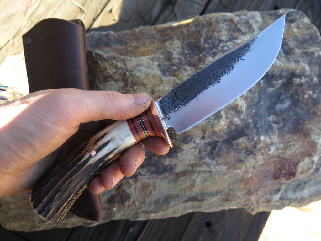 This beautiful new Hunter from Behring Made™ is hand forged from 3/16" thick high carbon 01 tool steel and it measures 5" from tip to guard with a razor sharp hollow grind and our hammermark finish. The copper guard is soldered in place above black and maroon fiber, copper and brass spacers as well as a hand selected premium sambar stag handle that's also pinned through the tang with copper. The overall length measures 9 3/8" and it comes in a classic Warlander Leather pouch.