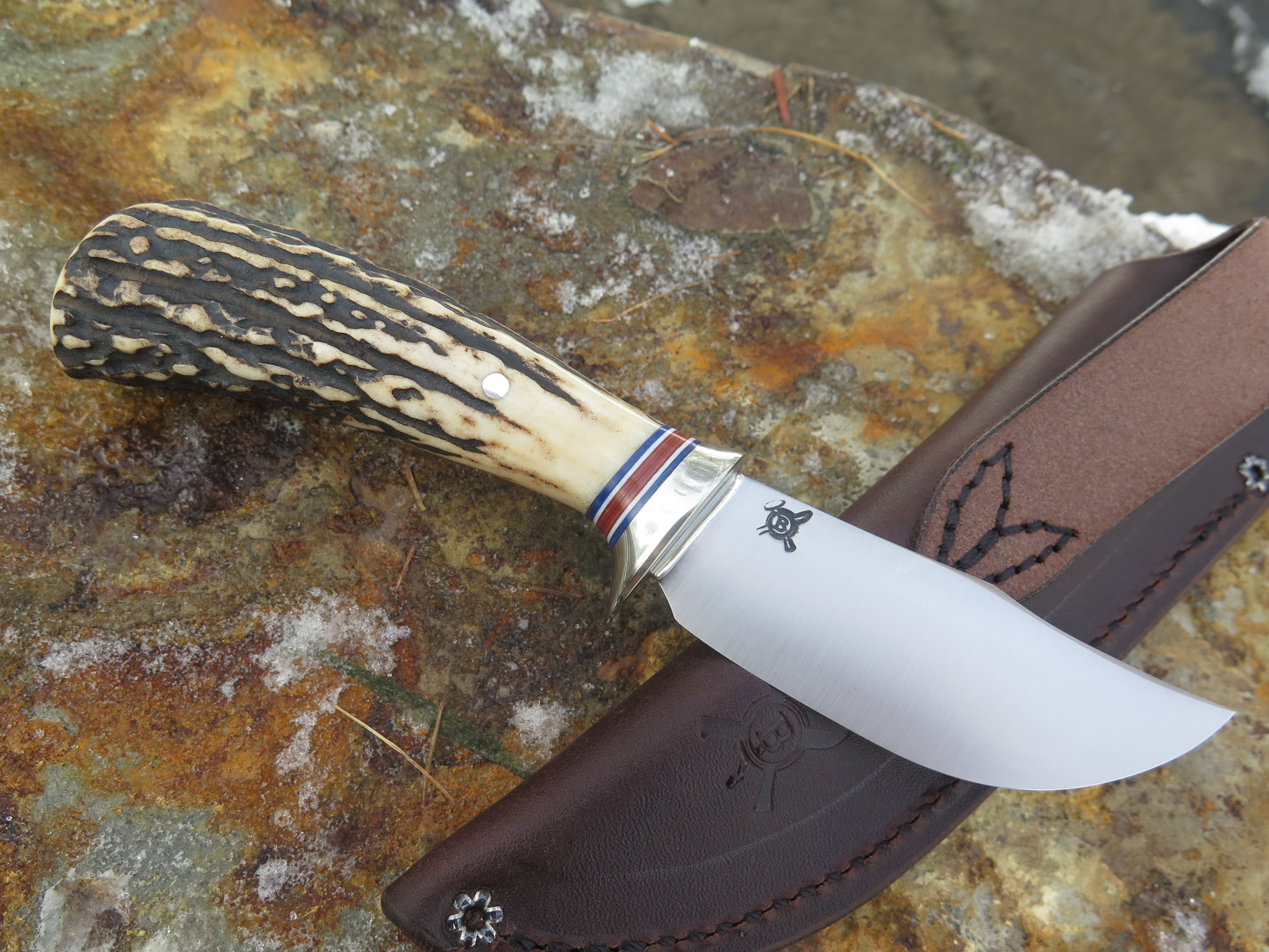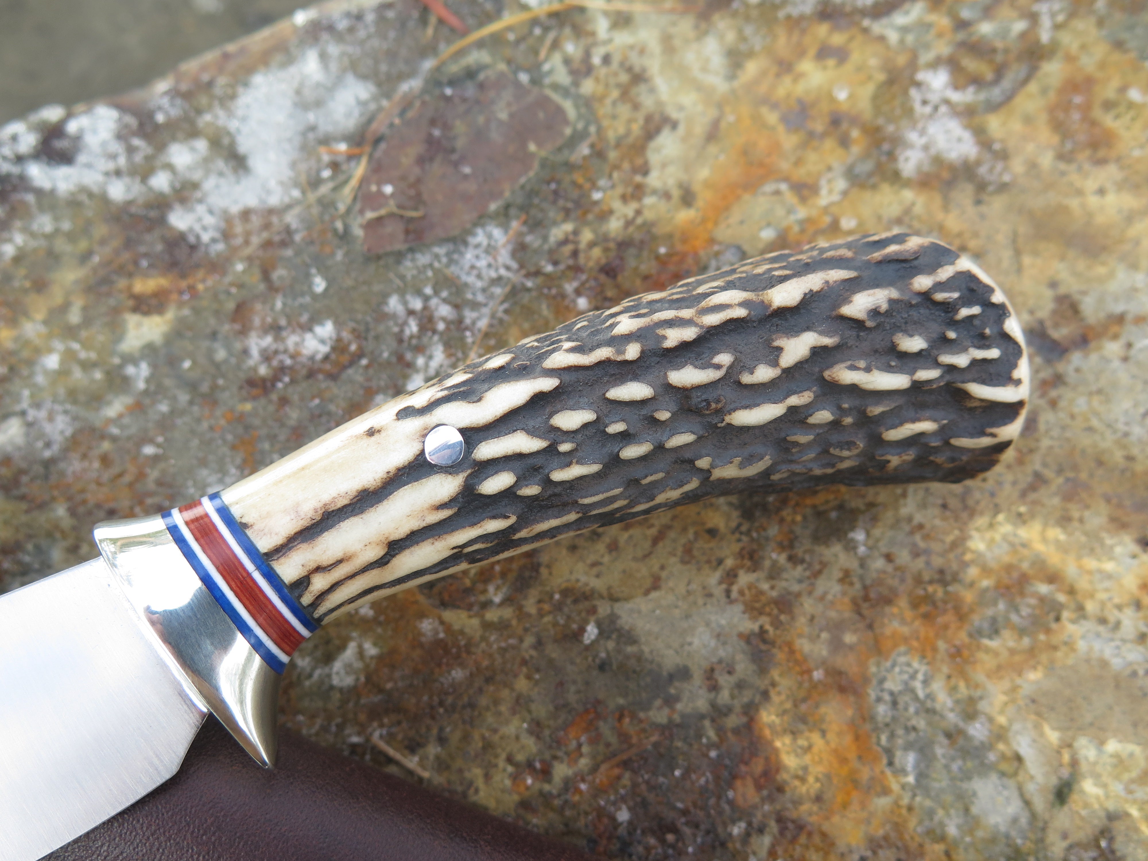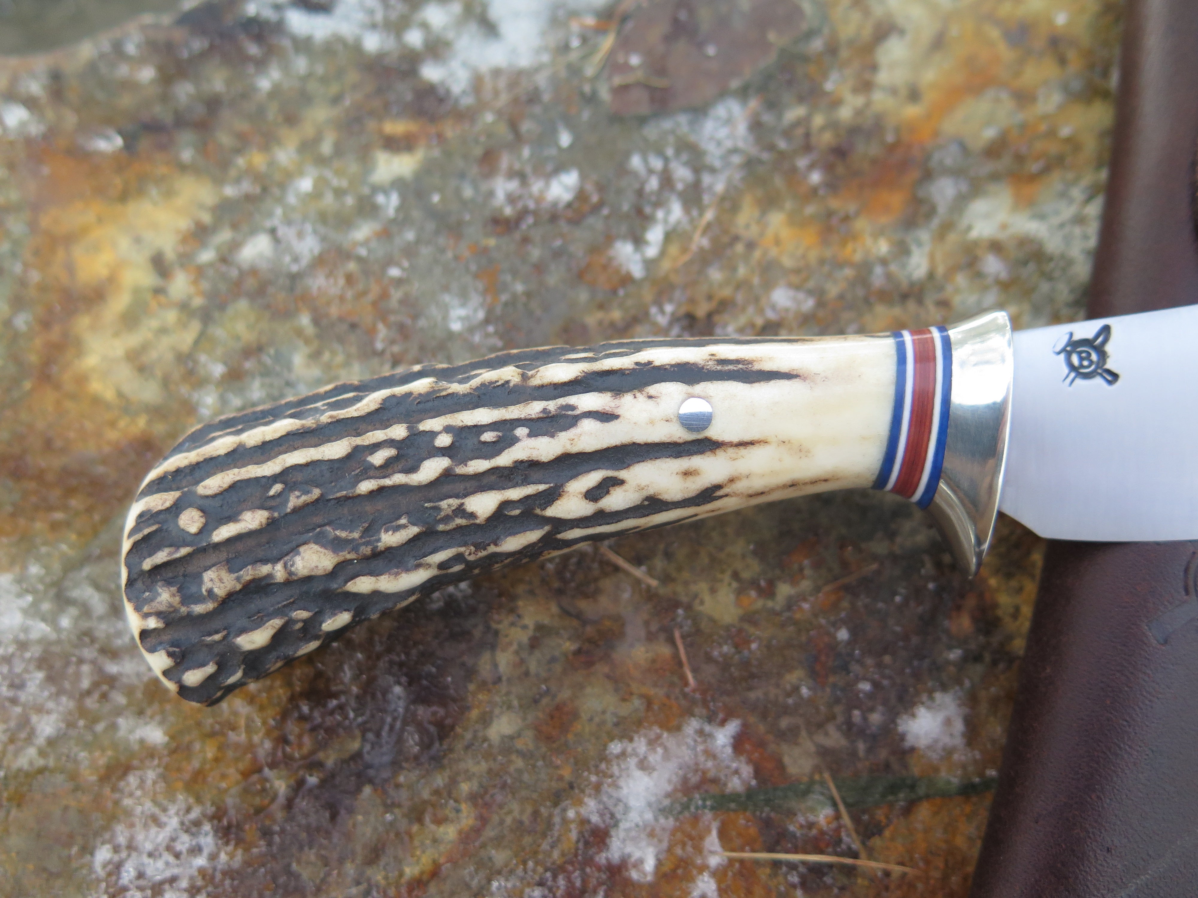 This delightful Hunter from Behring Made© is hand forged from 1/8" thick high carbon 01 tool steel and it measures 3 1/4" from tip to guard with a razor sharp convex grind. The nickel silver guard is soldered in place above red, white and blue fiber spacers as well as a premium "popcorn" texture sambar stag handle that's also pinned through the tang with aluminum. The overall length measures 7 1/8" and it comes guaranteed for life in a classic leather belt pouch sheath.