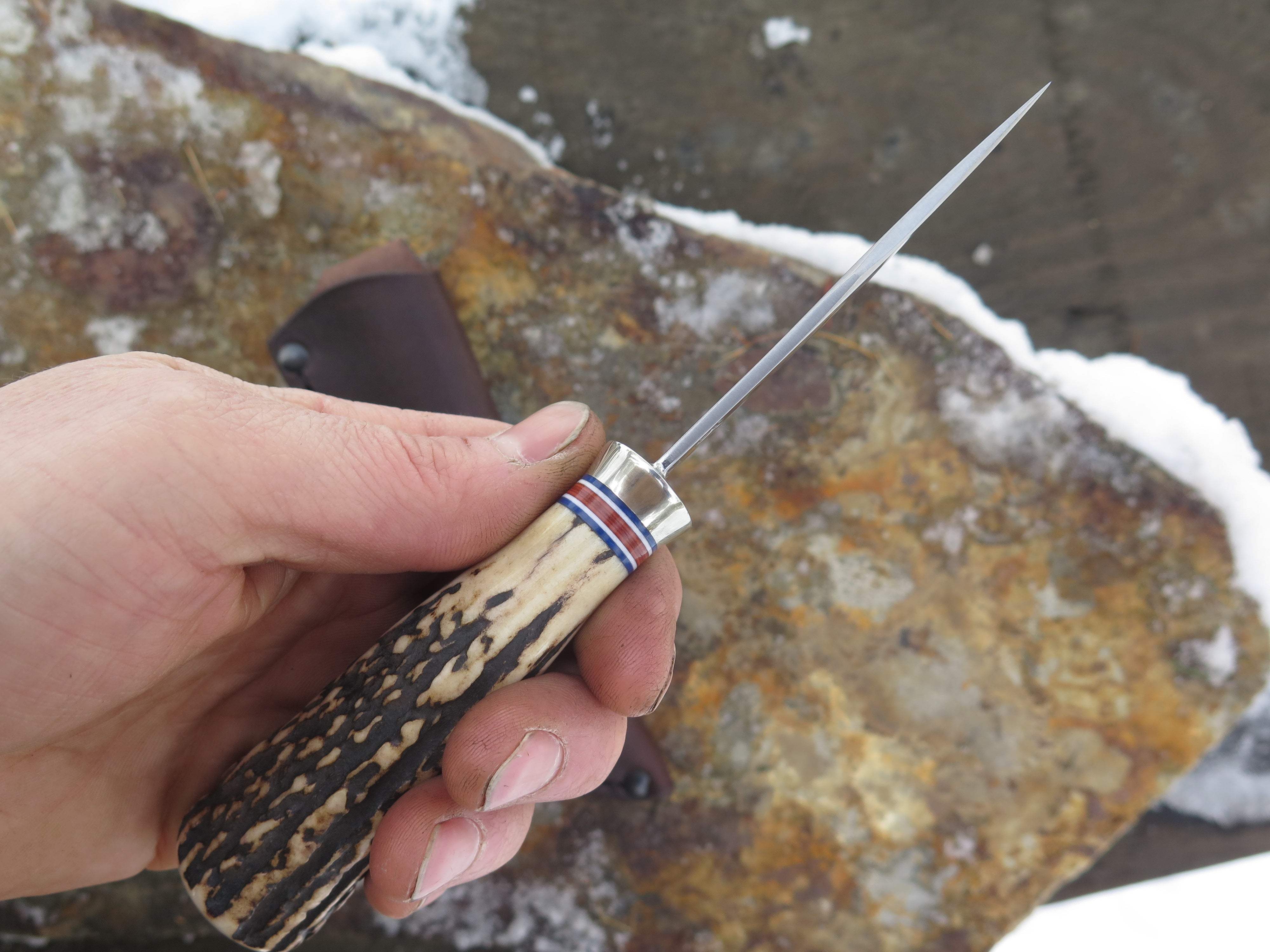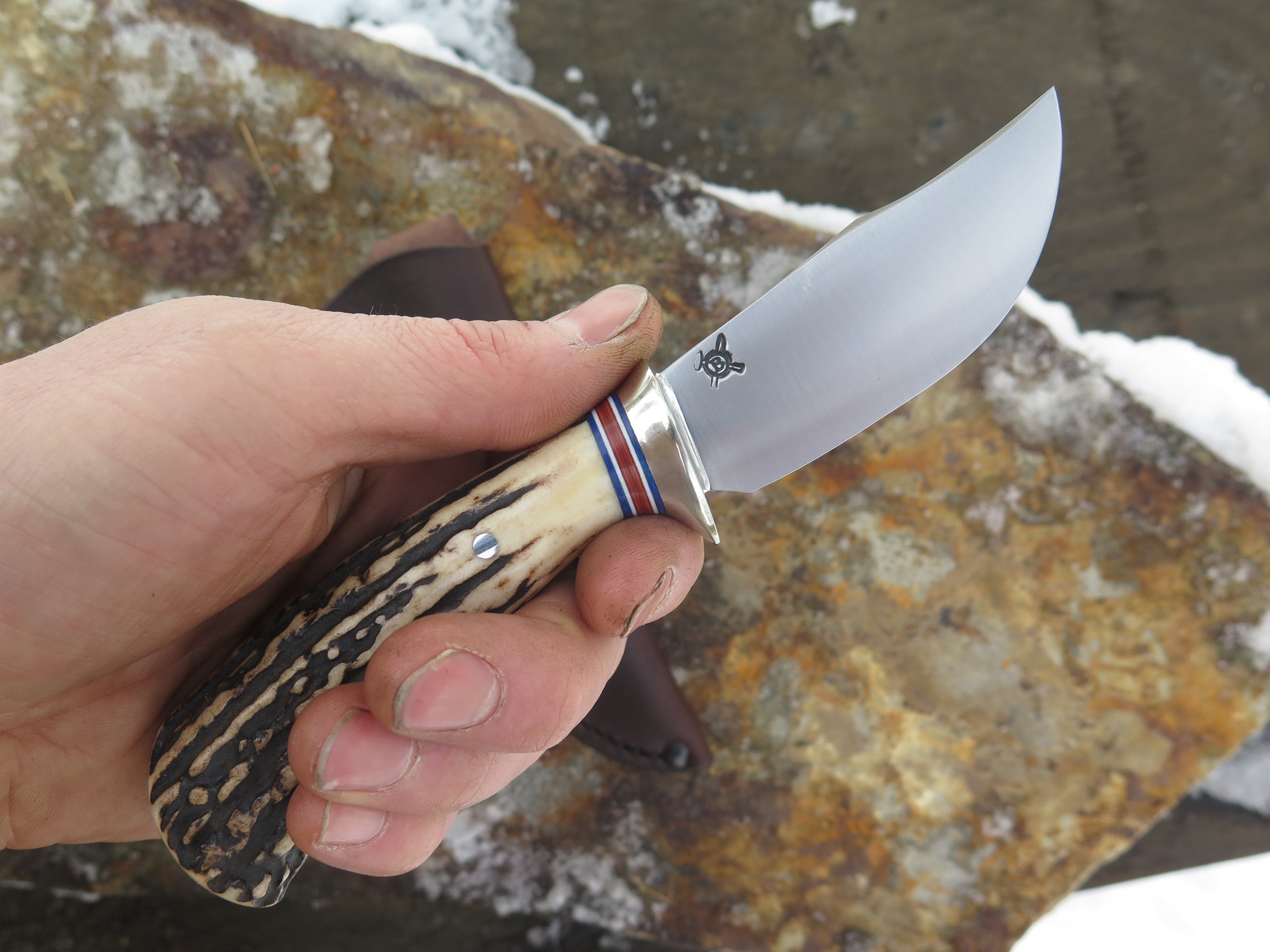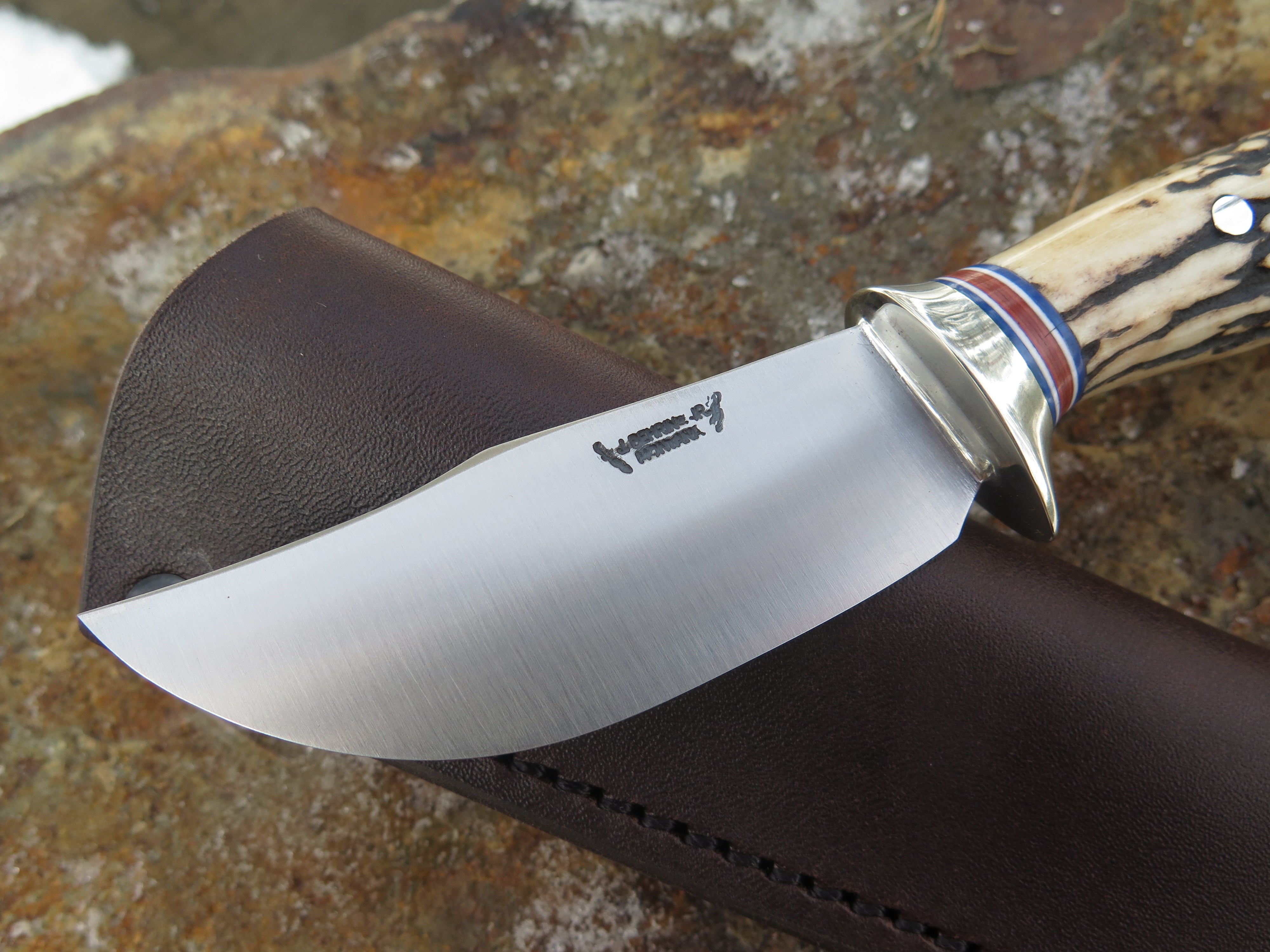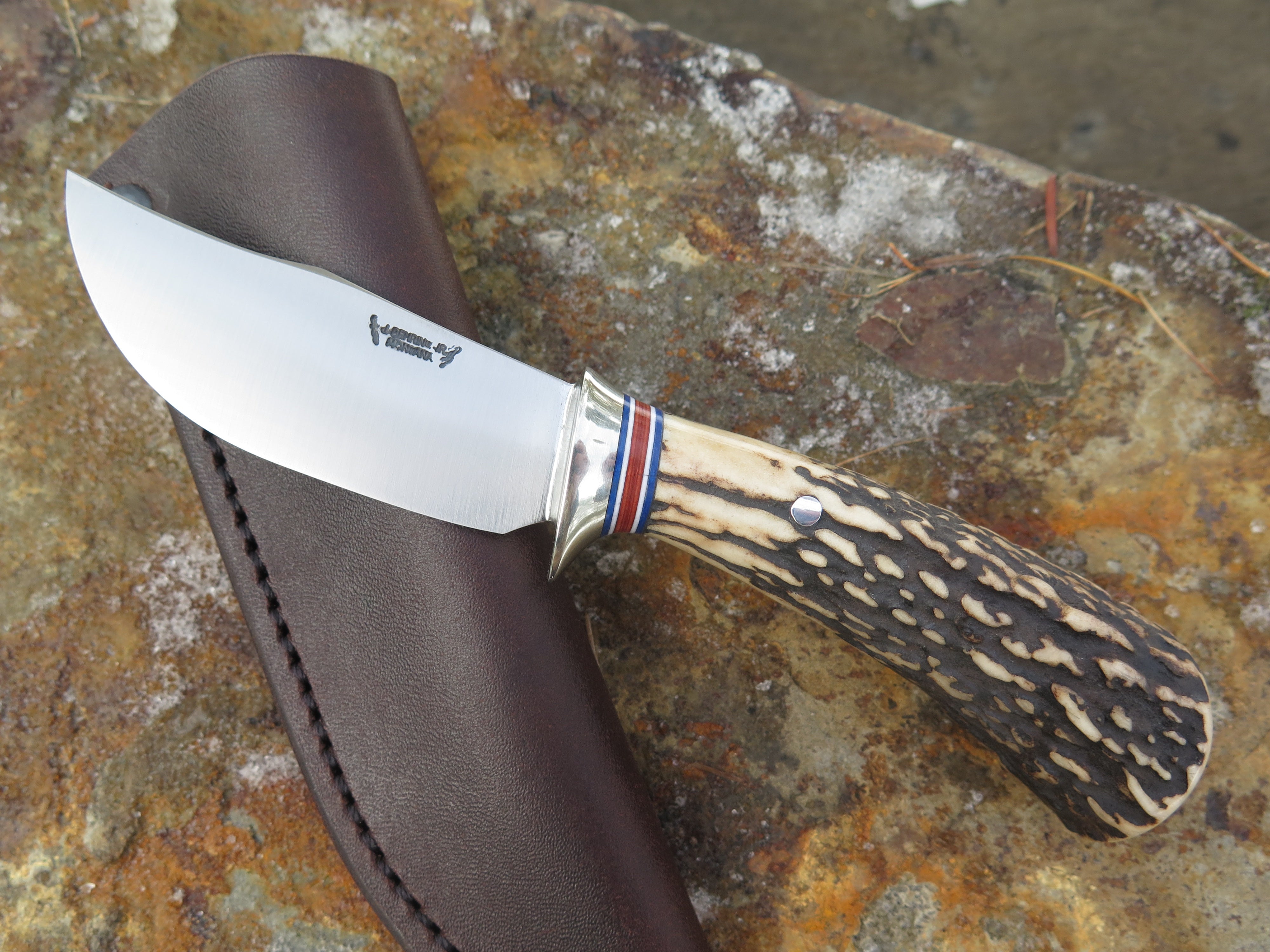 This delightful Hunter from Behring Made© is hand forged from 1/8" thick high carbon 01 tool steel and it measures 3 1/4" from tip to guard with a razor sharp convex grind. The nickel silver guard is soldered in place above red, white and blue fiber spacers as well as a premium "popcorn" texture sambar stag handle that's also pinned through the tang with aluminum. The overall length measures 7 1/8" and it comes guaranteed for life in a classic leather belt pouch sheath.
