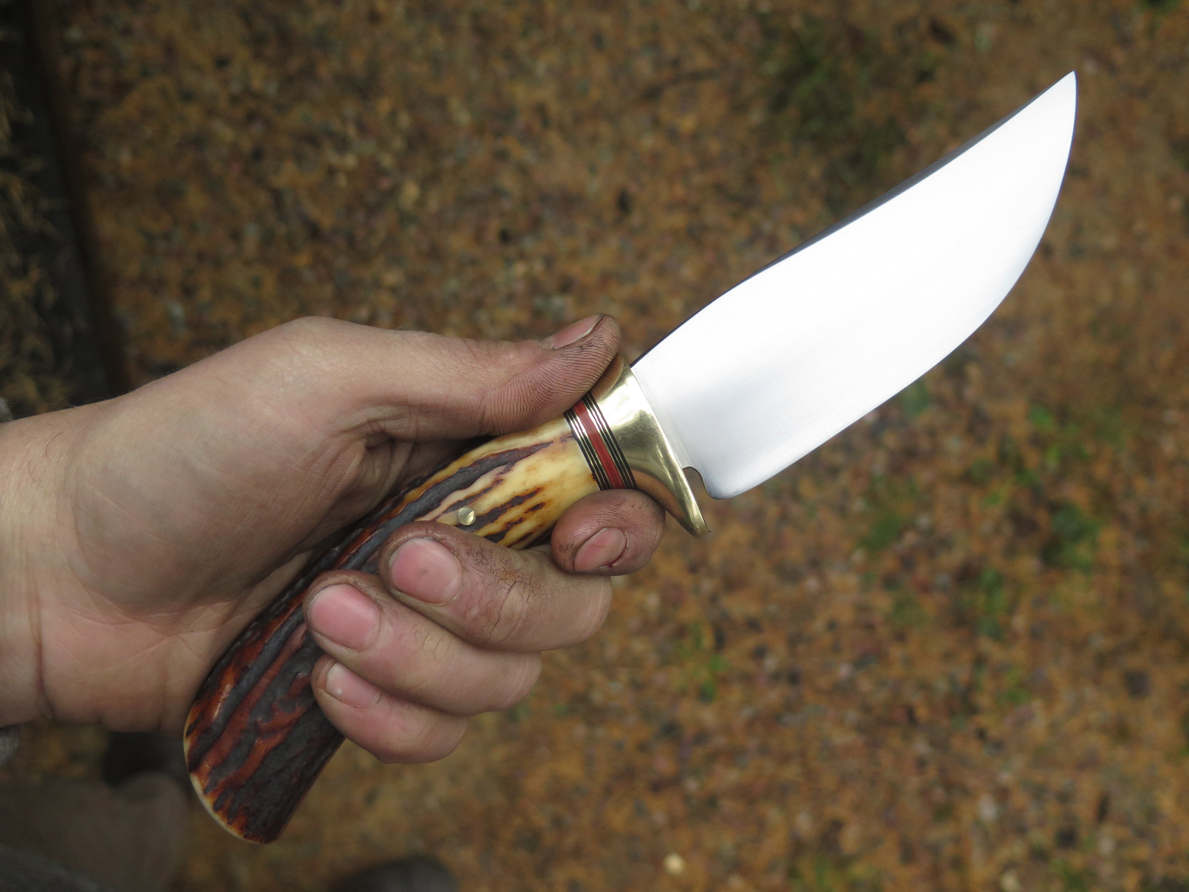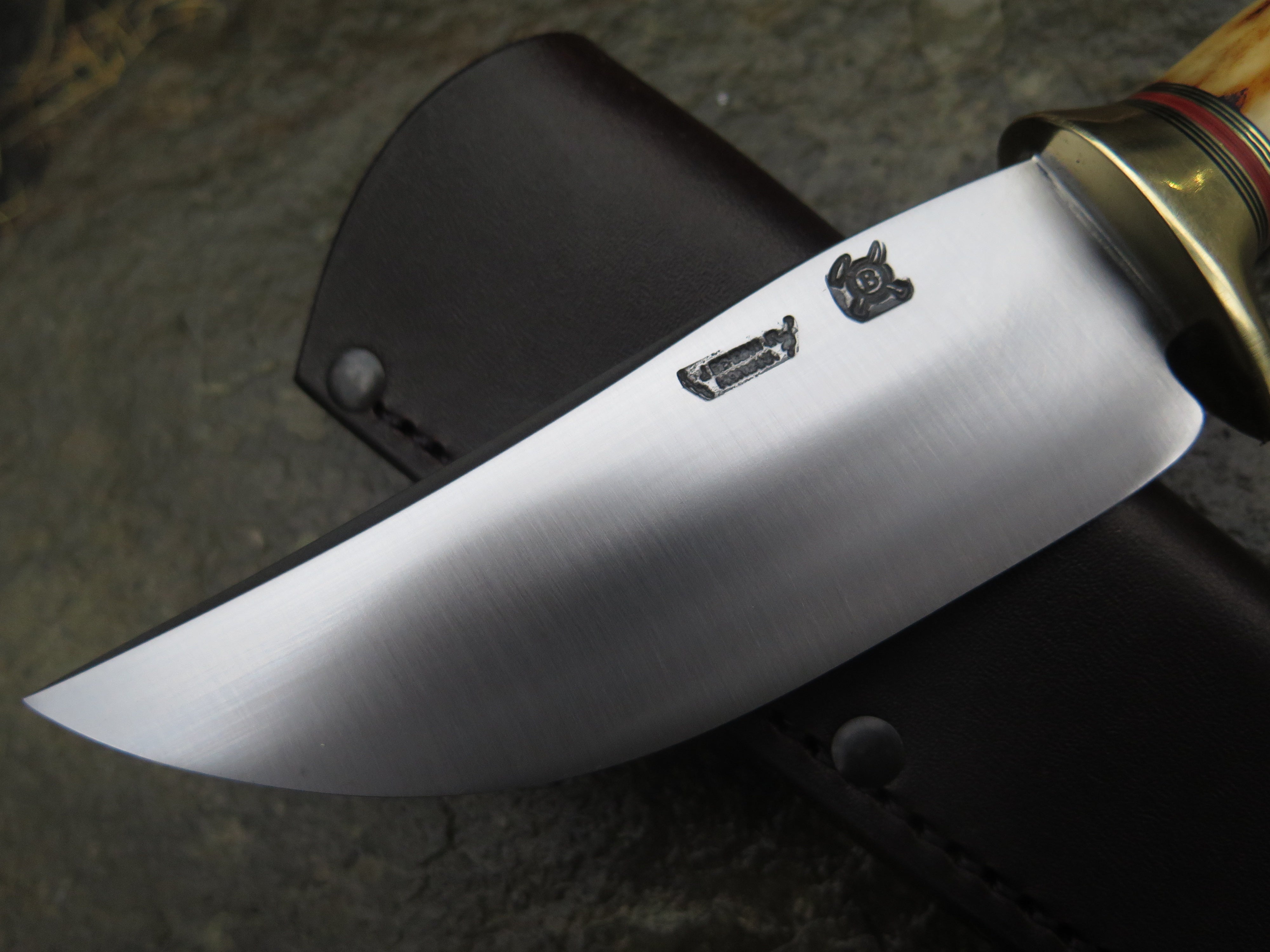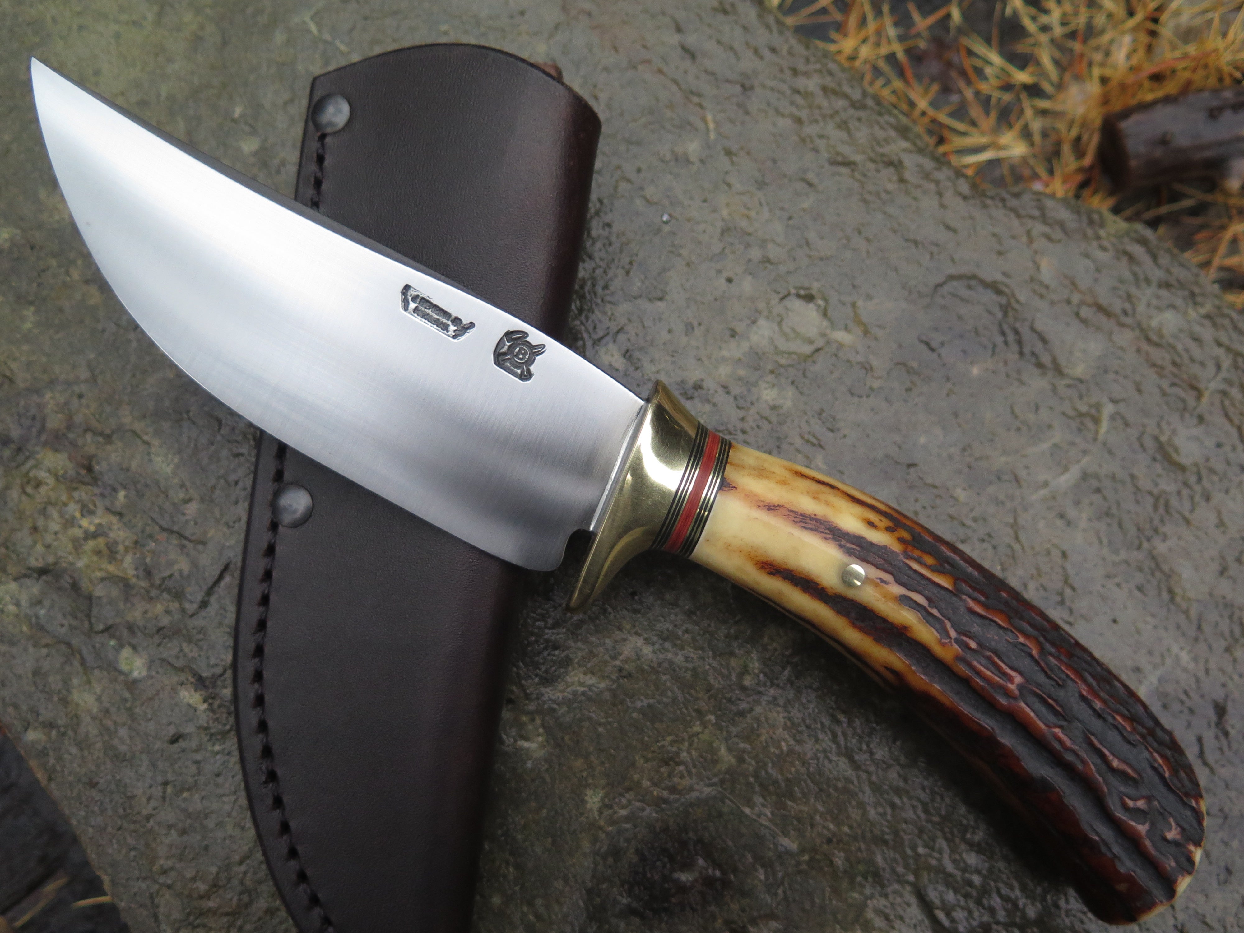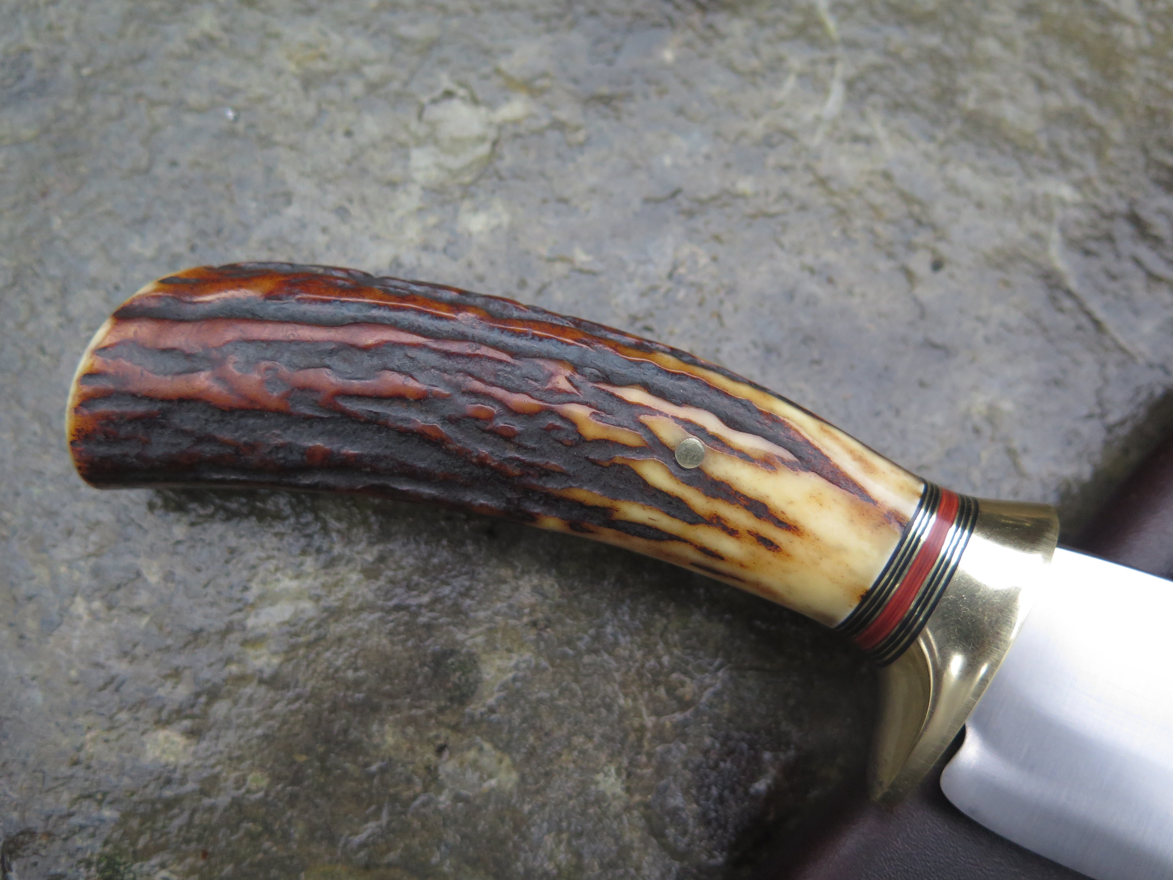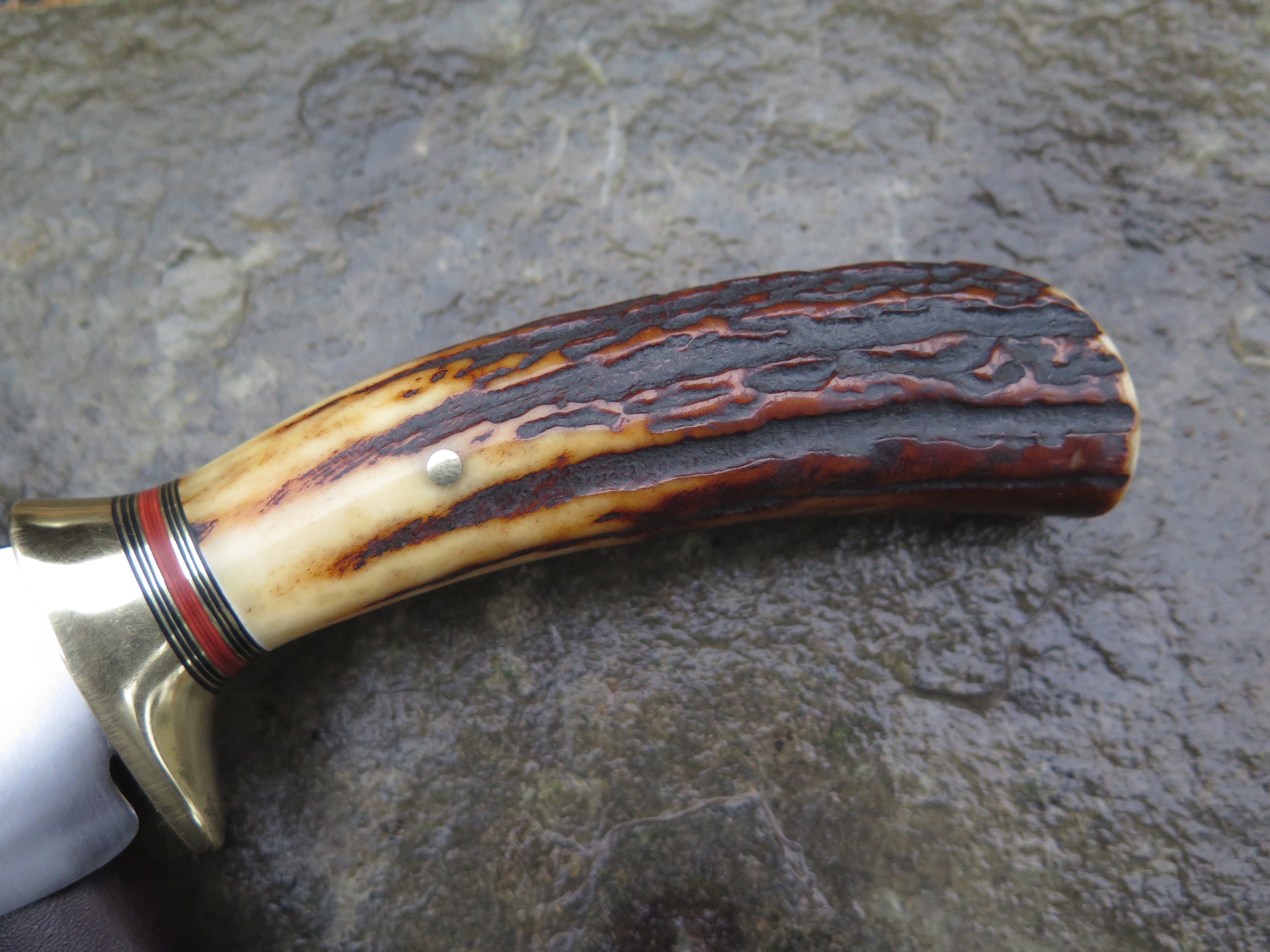 This outstanding new Hunter from Behring Made© is hand forged from 3/16" thick high carbon 01 tool steel and it measures 5" from tip to guard with a razor sharp convex grind. The brass guard is soldered in place above black and maroon fiber with brass spacers while the handle is premium sambar stag that James pinned through the tang with brass. The overall length measures 9 5/8" and it comes in a classic leather belt pouch sheath.