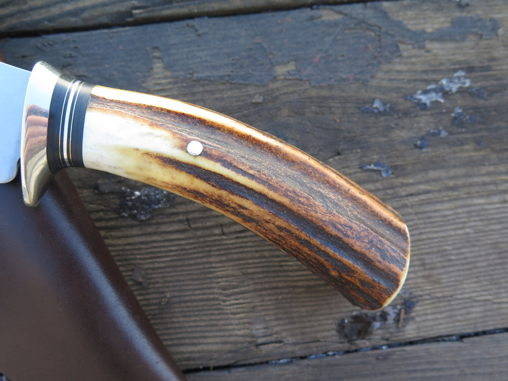 This beautiful new Behring Made™ Hunter is hand forged from 3/16" thick high carbon 01 tool steel and it measures 4 1/4" from tip to guard with a razor sharp convex grind. The nickel silver guard is soldered in place above black fiber, brass and aluminum spacers as well as a premium sambar stag handle that's pinned through the tang with aluminum for a rock solid construction that we guarantee for life. The overall length measures 9" and it comes in a Warlander Leather pouch.