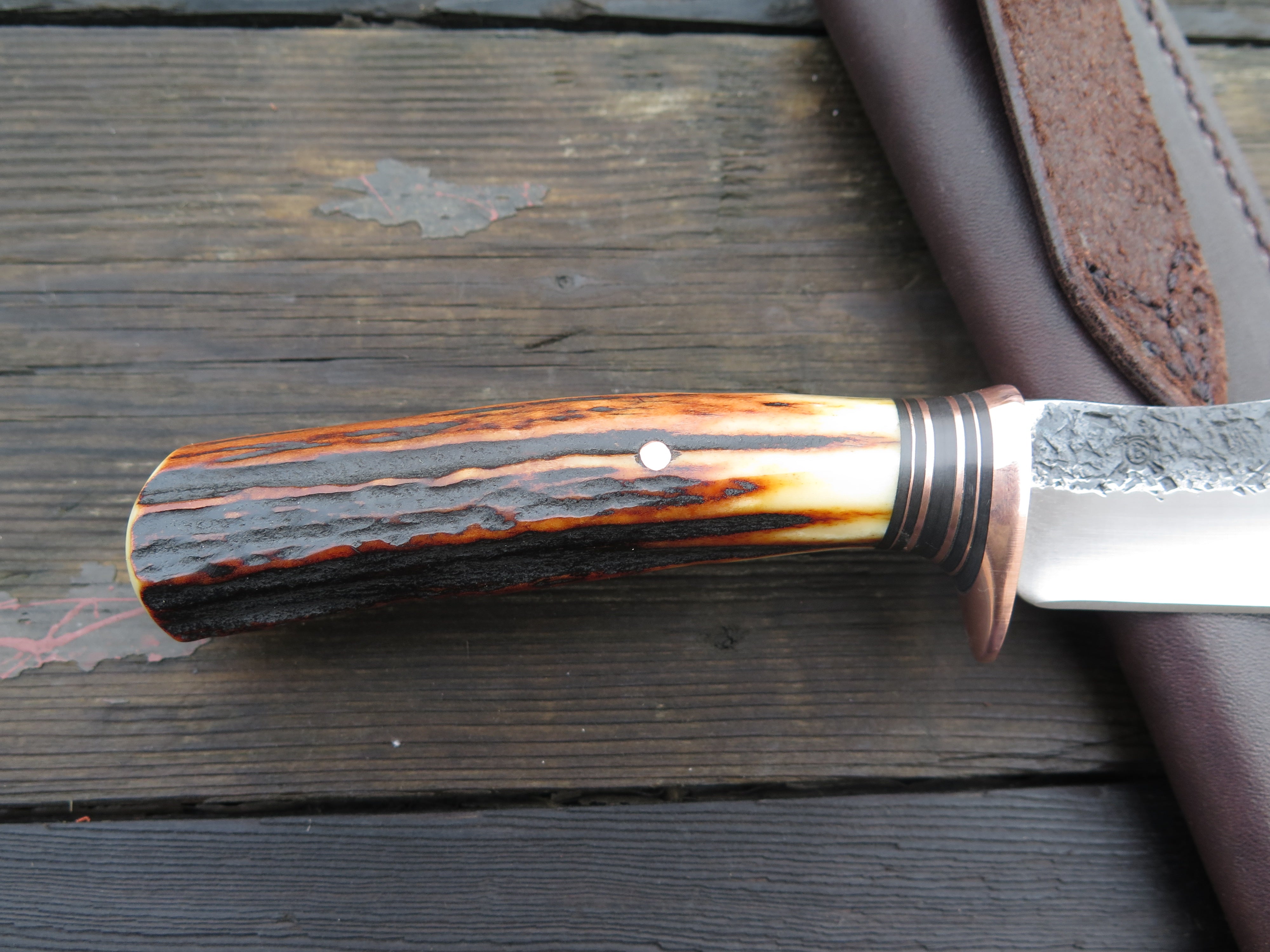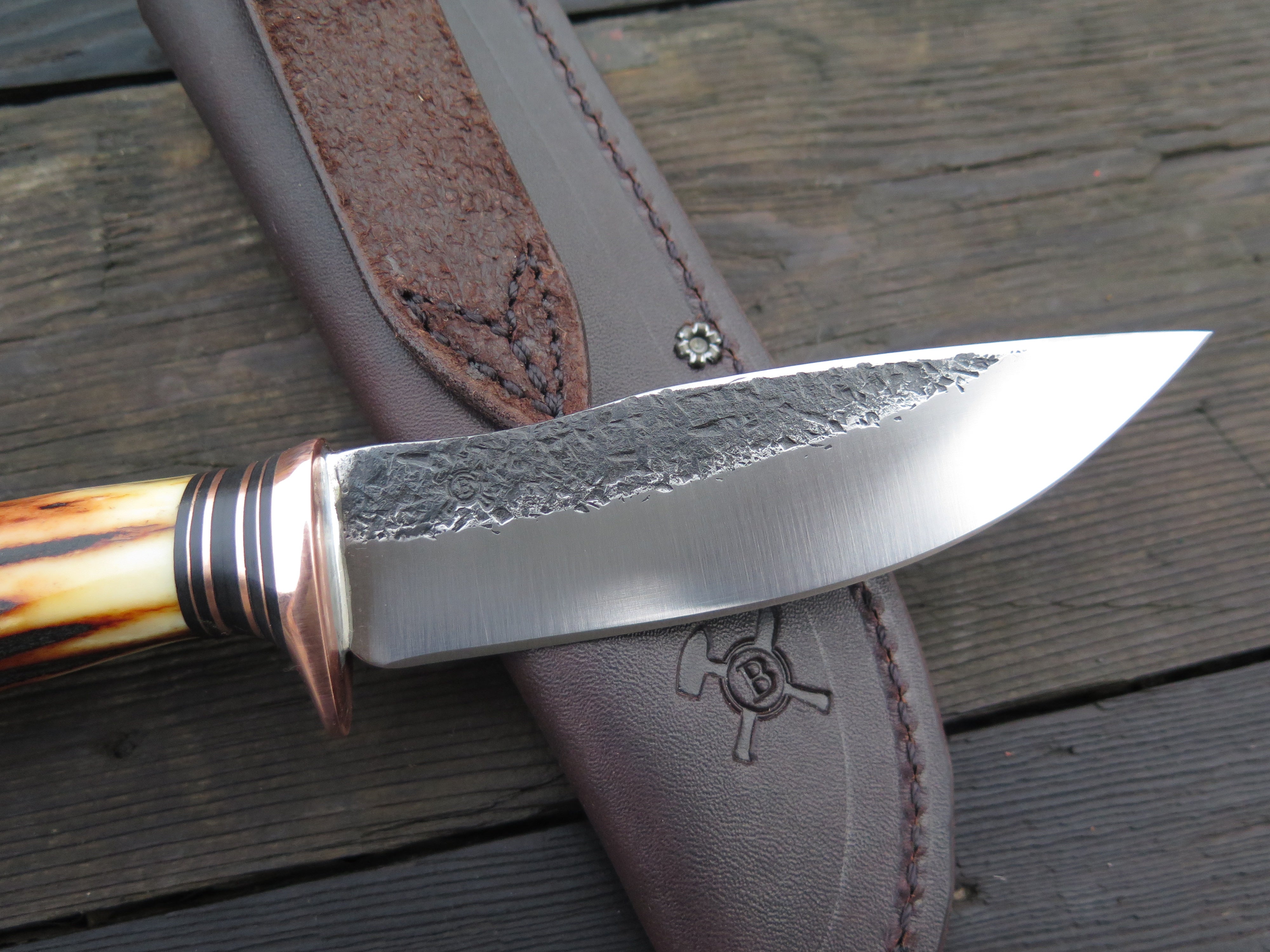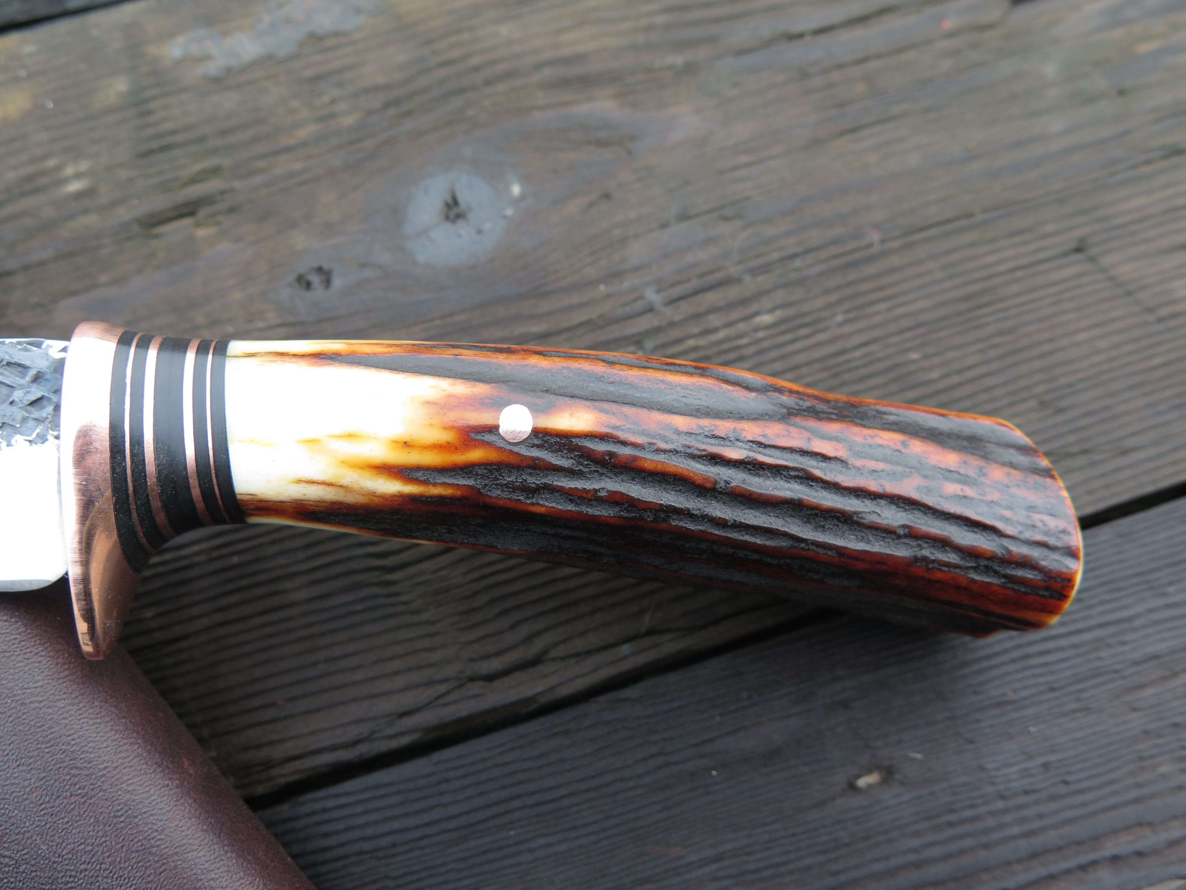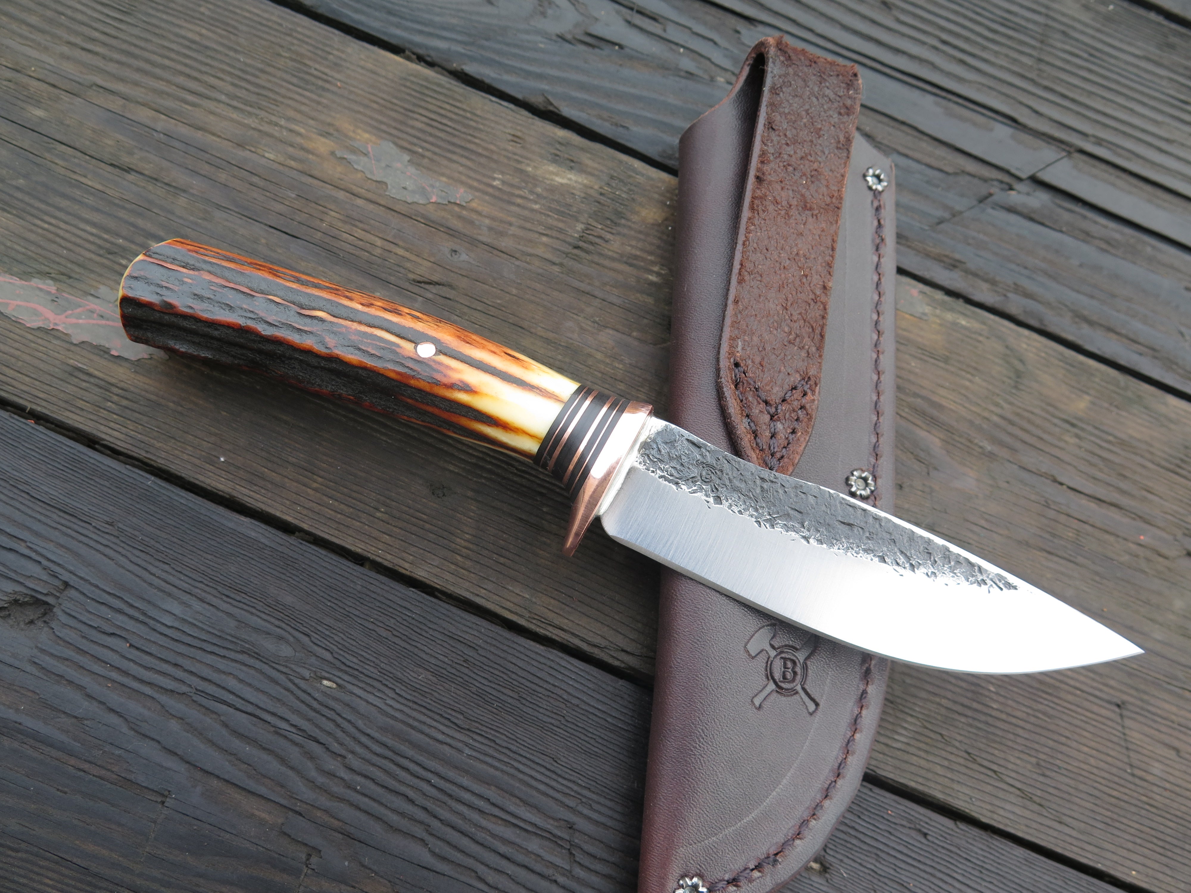 This new modified Drop Point from Behring Made© is hand forged from 3/16" thick high carbon 01 tool steel and it measures 4 1/2" from tip to guard with a razor sharp hollow grind and our hammermark finish. The copper guard is soldered in place above black fiber and copper spacers as well as a premium sambar stag handle that's pinned through the tang with copper. The overall length measures just over 9" and it comes in a classic pouch sheath.