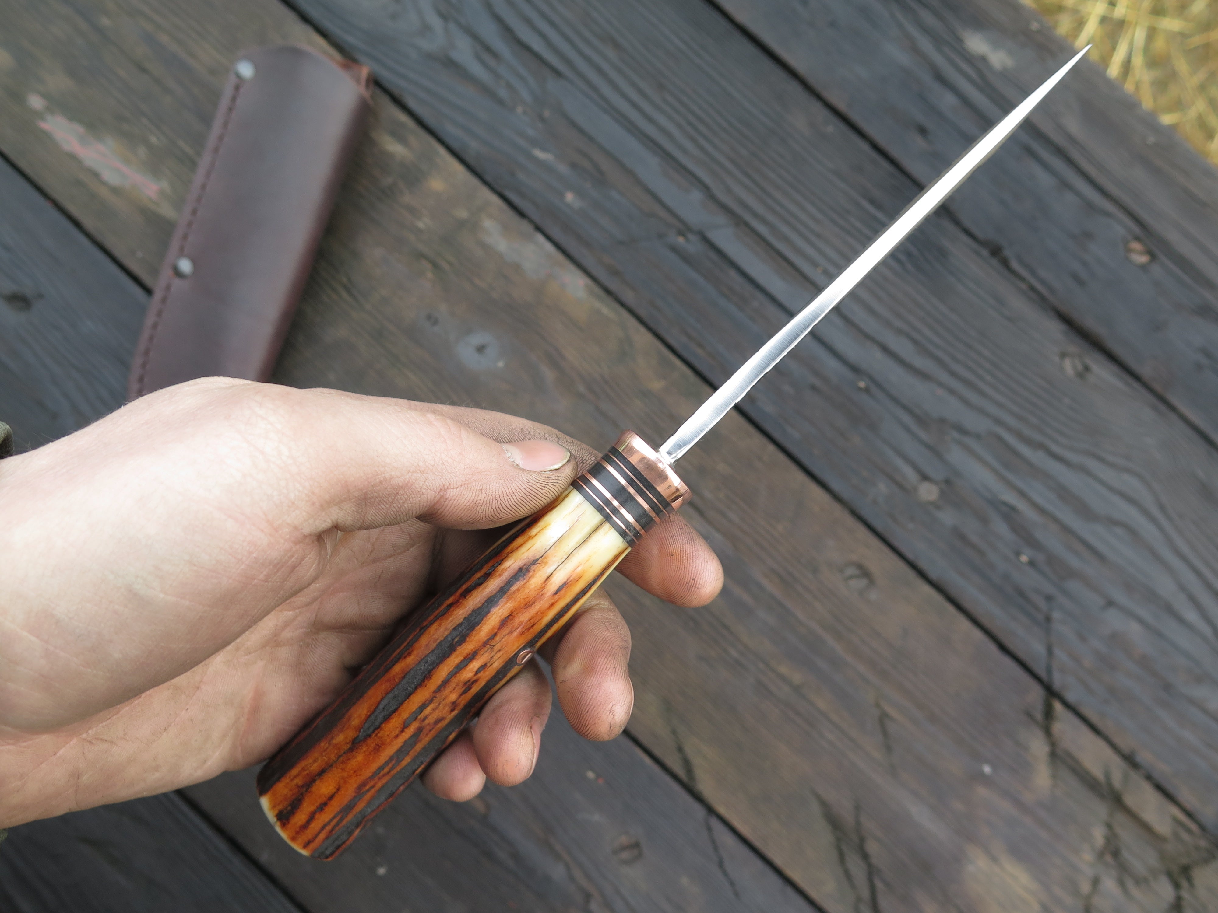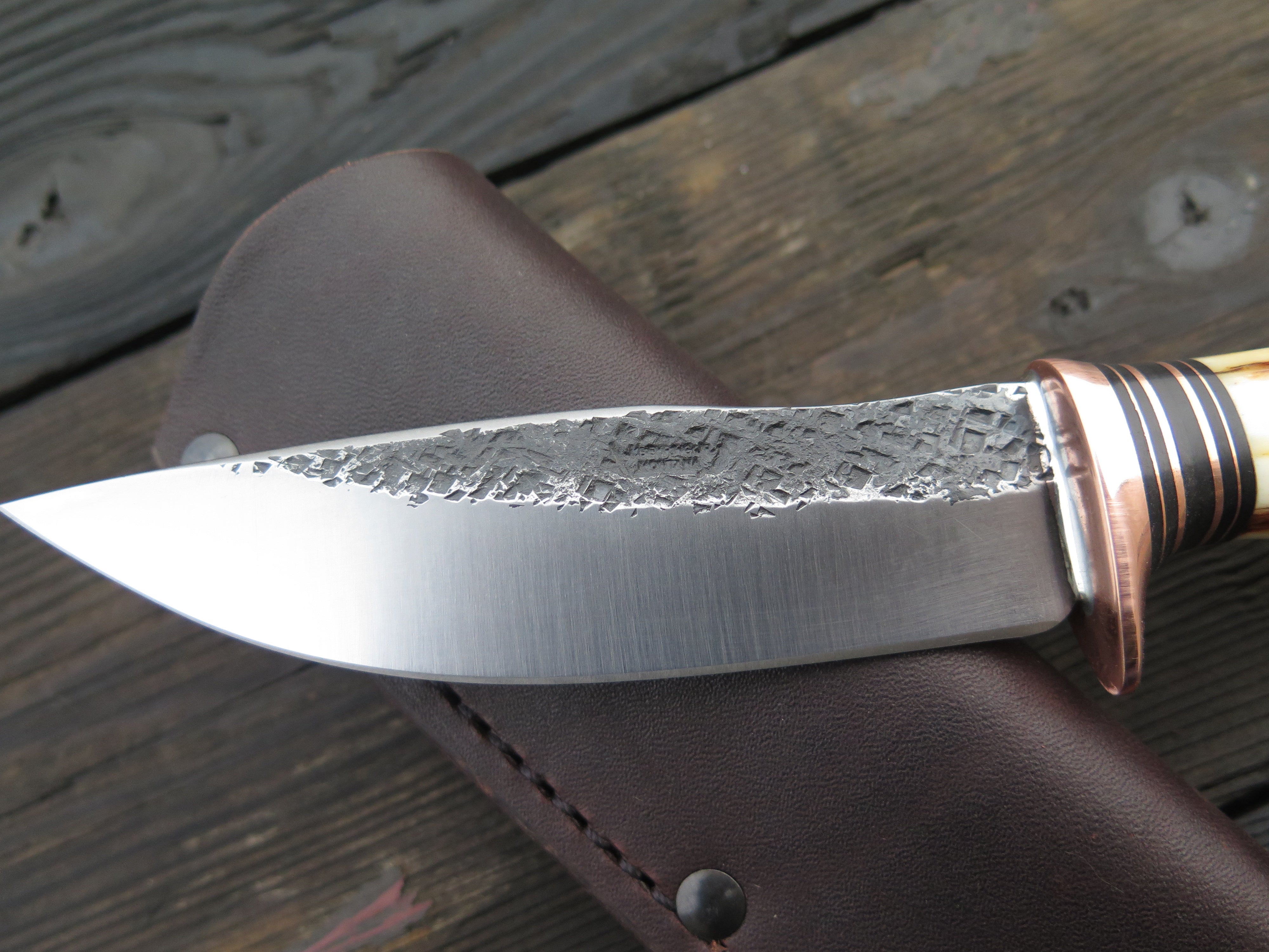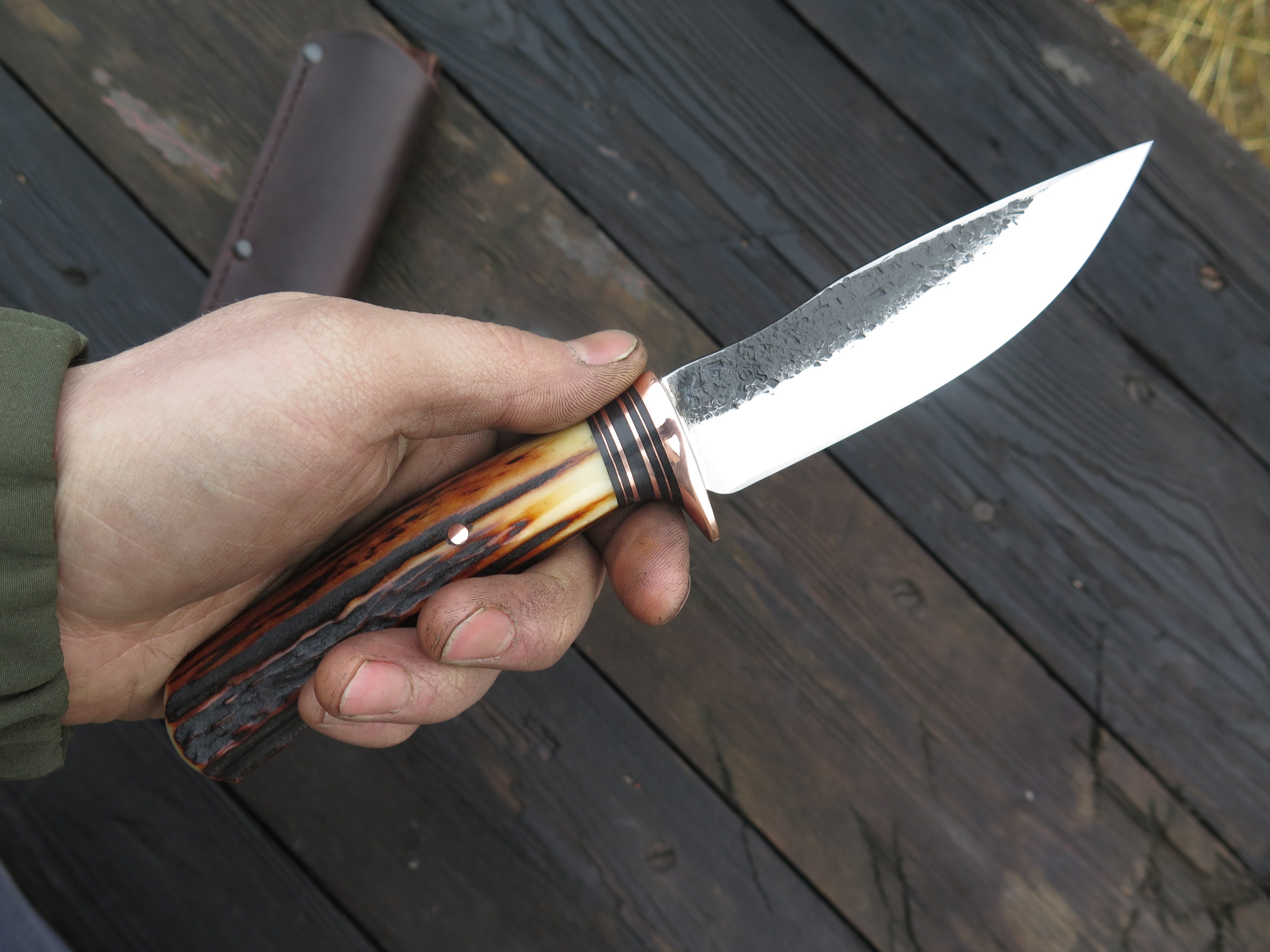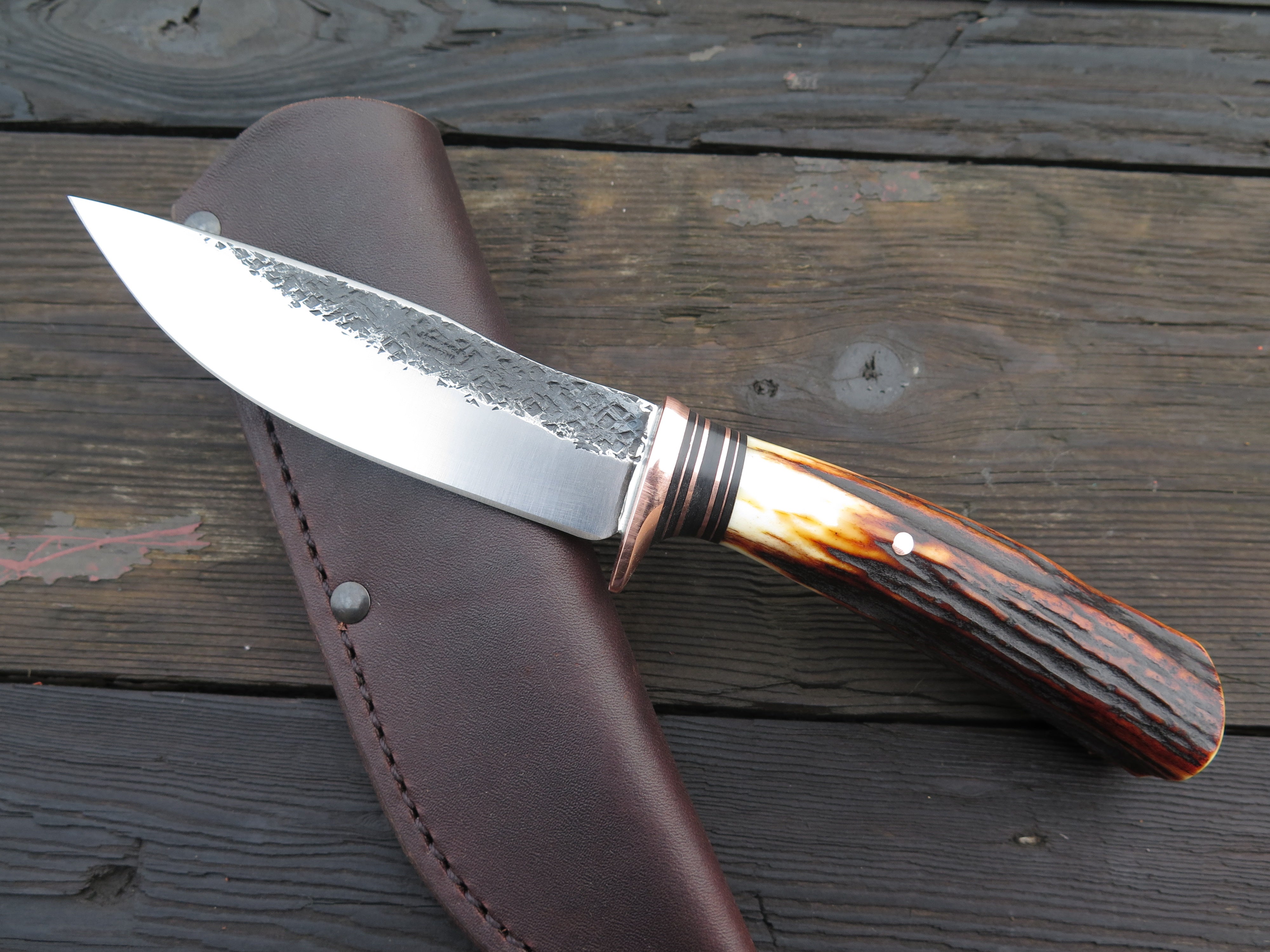 This new modified Drop Point from Behring Made© is hand forged from 3/16" thick high carbon 01 tool steel and it measures 4 1/2" from tip to guard with a razor sharp hollow grind and our hammermark finish. The copper guard is soldered in place above black fiber and copper spacers as well as a premium sambar stag handle that's pinned through the tang with copper. The overall length measures just over 9" and it comes in a classic pouch sheath.