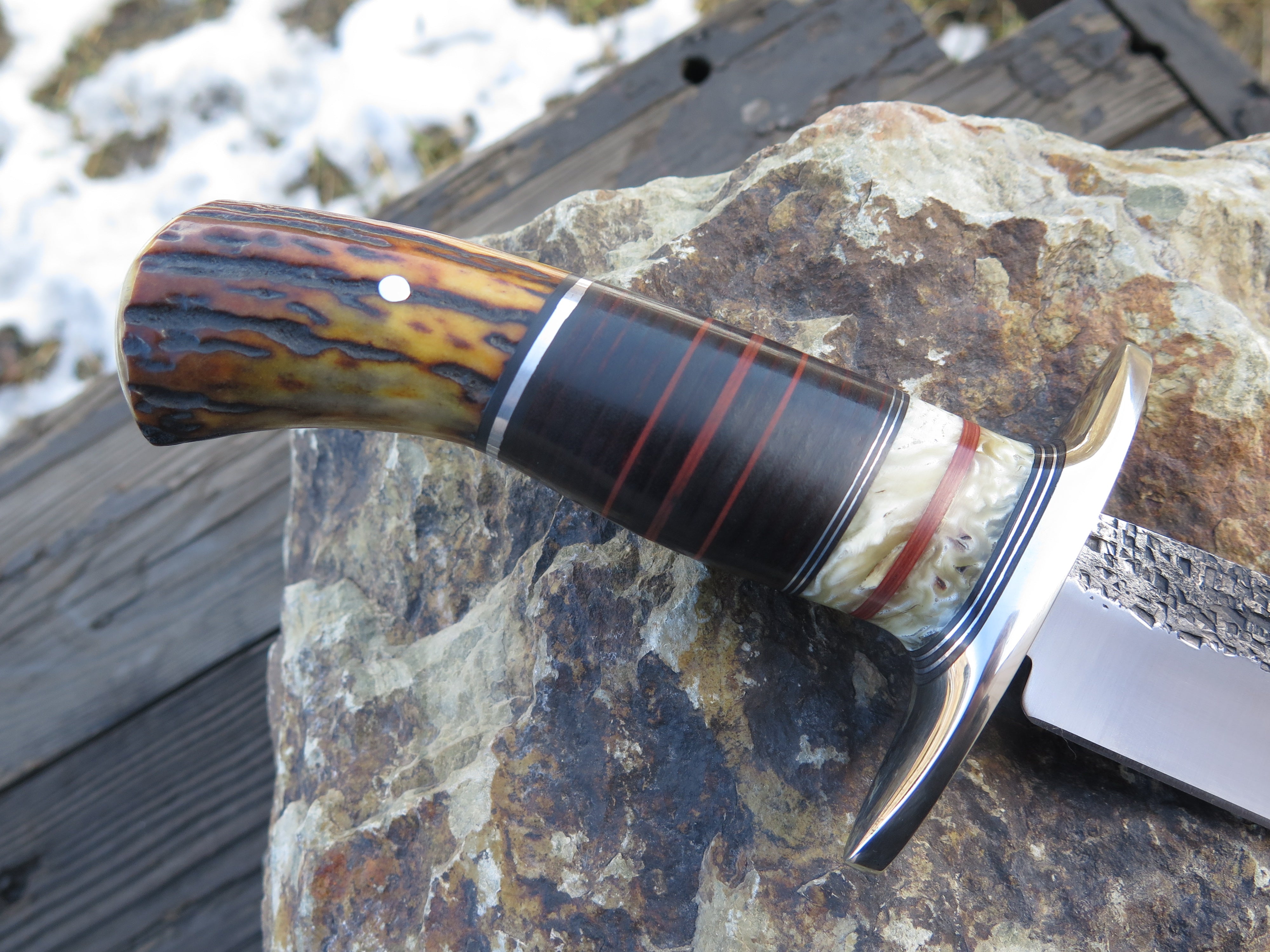 This incredible new Fighter from Behring Made© is hand forged from 13/64" thick 5160 spring steel and it measures 7 1/2" from tip to guard with a razor sharp hollow grind and our hammermark finish. The tall nickel silver guard is soldered in place above black and maroon fiber, two musk ox boss, horsehide and aluminum spacers with a premium sambar stag butt that's pinned through the tang with aluminum. The overall length measures 12 1/8" and it comes in a custom Warlander Leather sheath.