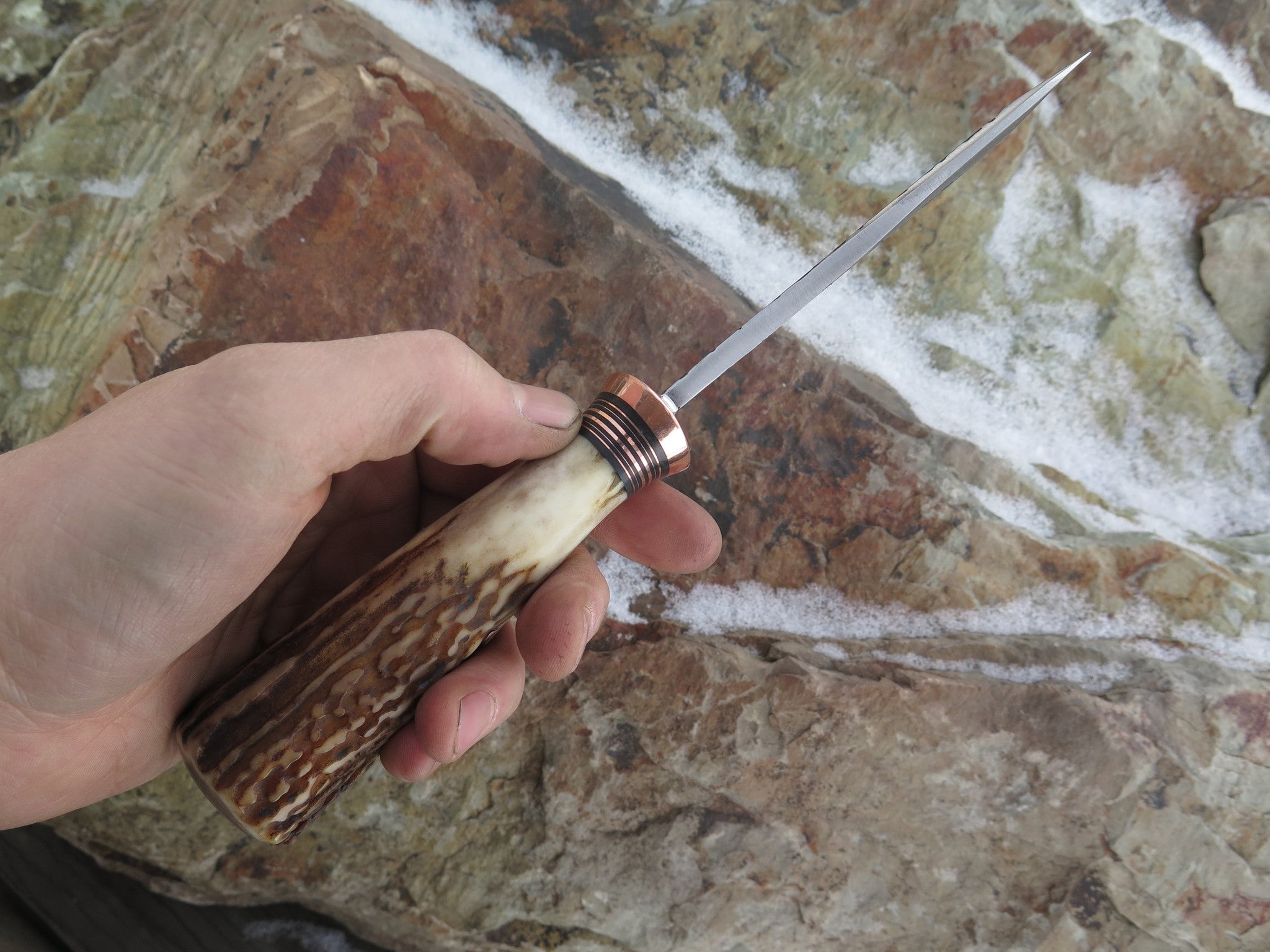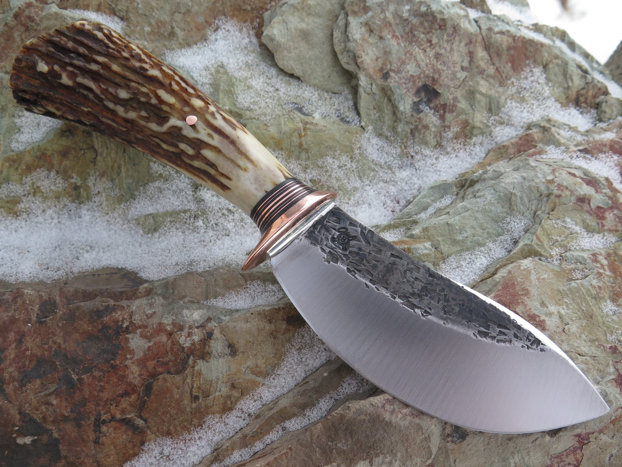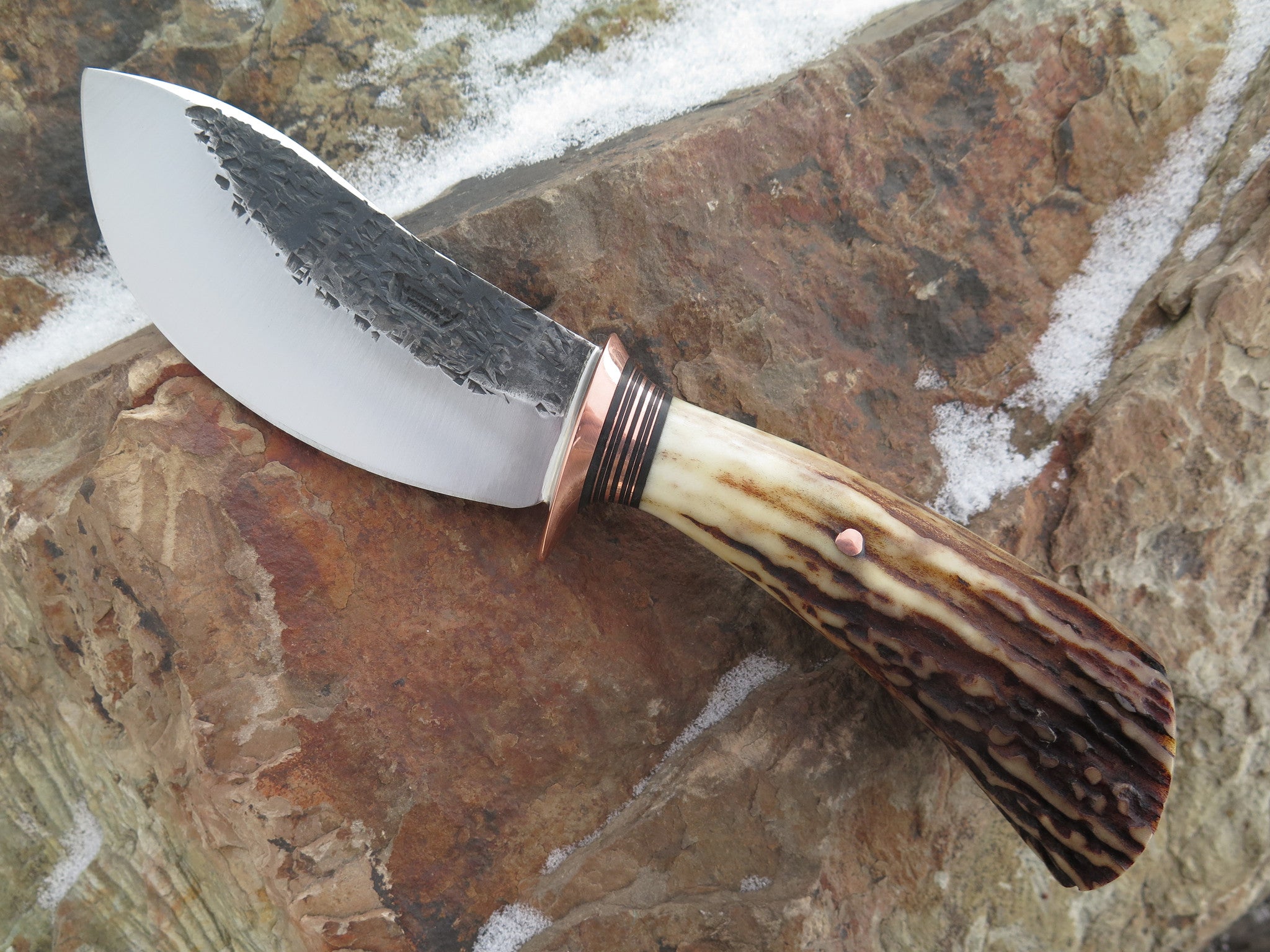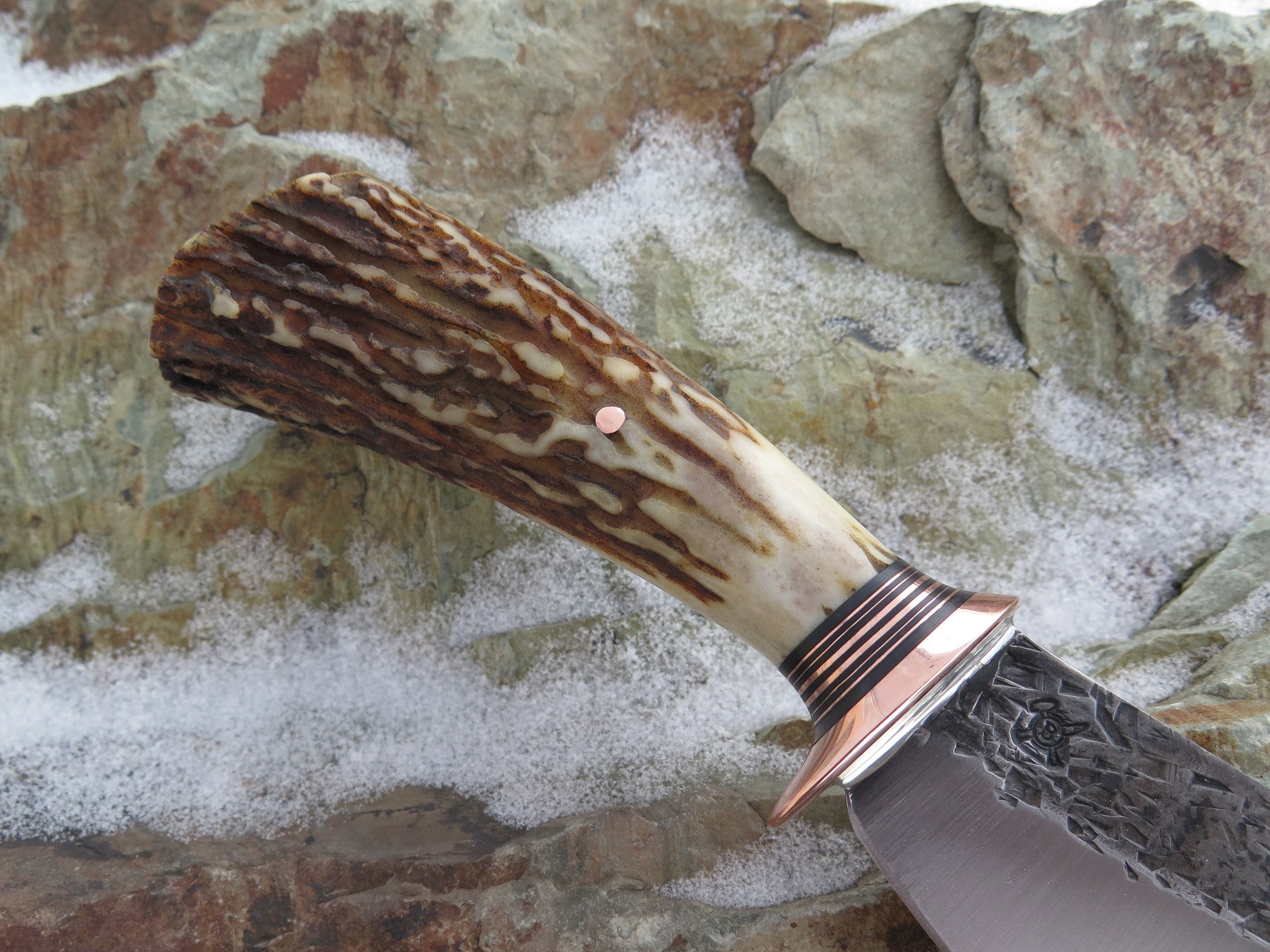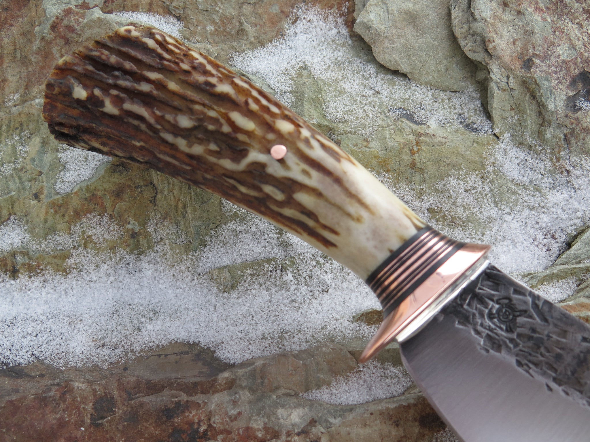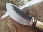 This incredible new Behring Made Nessmuk is hand forged from 3/16" thick high carbon tool steel and it measures 4 1/2" from tip to guard with a razor sharp hollow grind and a hammermark finish. The copper guard is soldered in place above black fiber and copper spacers that are a wonderful accent to to the premium sambar stag handle that is pinned with copper. The overall length measures 9" and it will come in a pouch sheath from Warlander Leather.